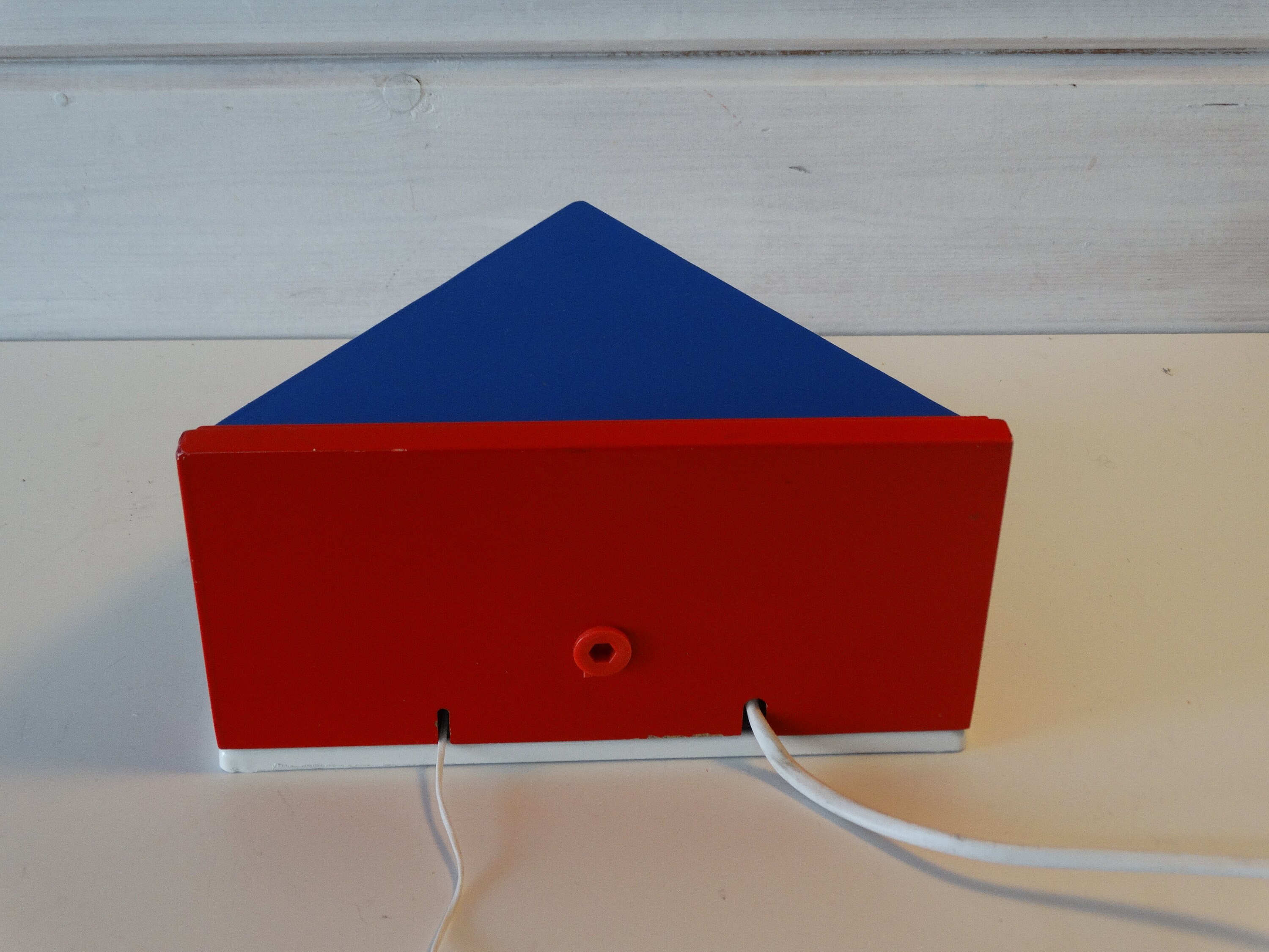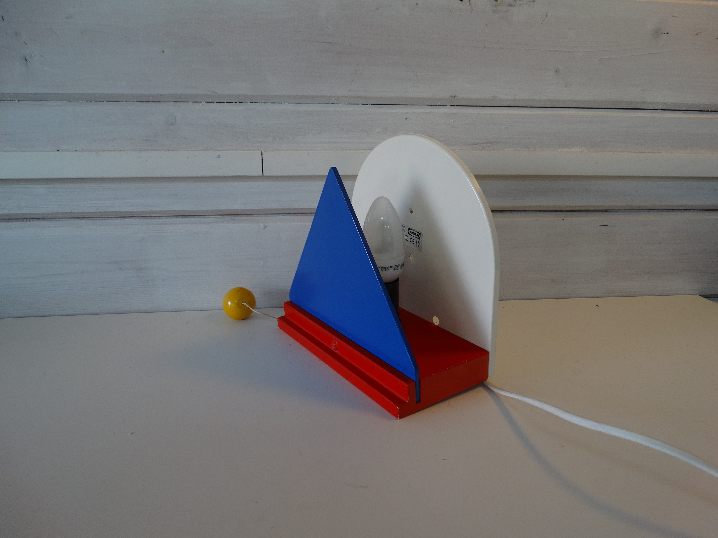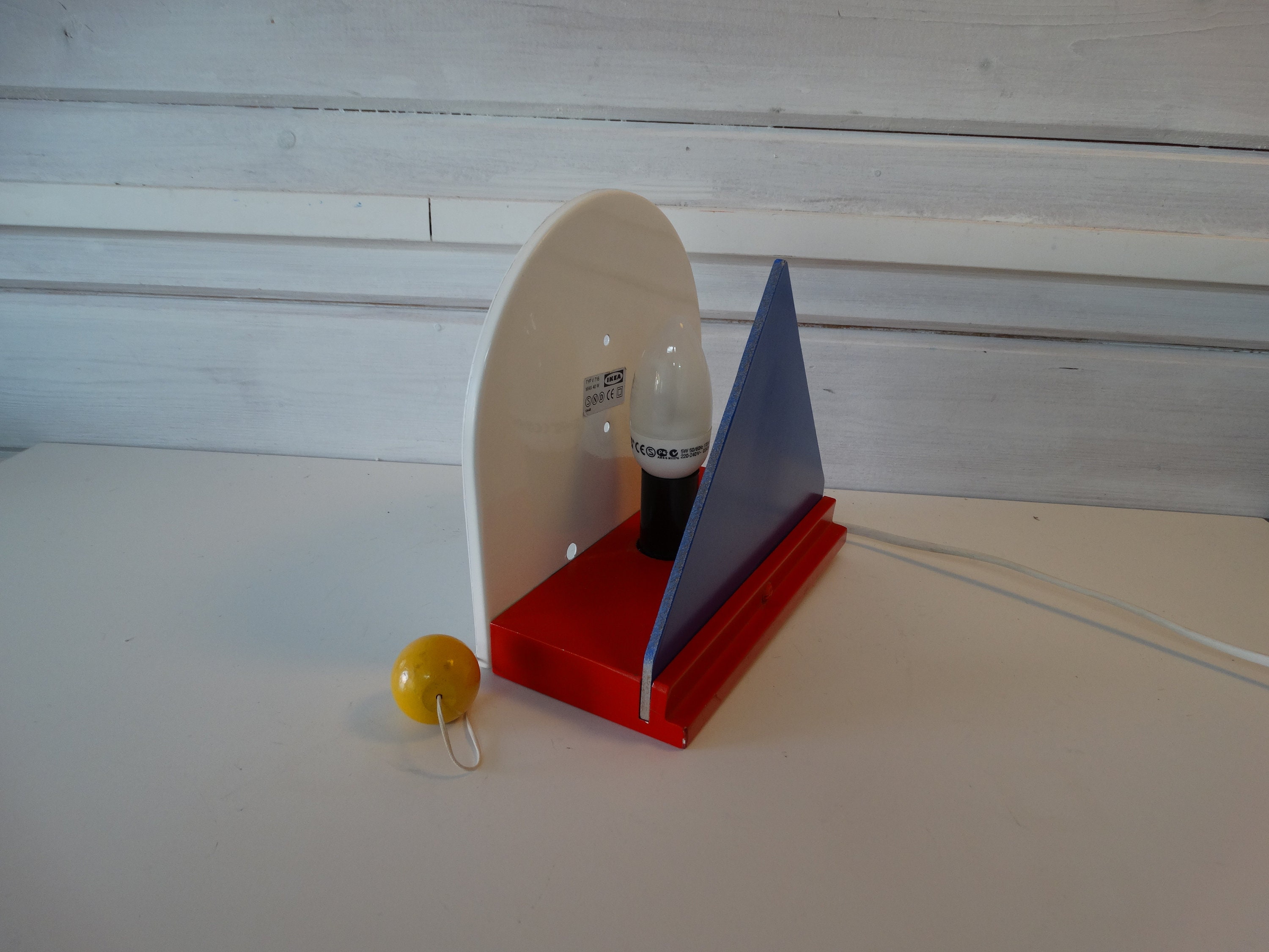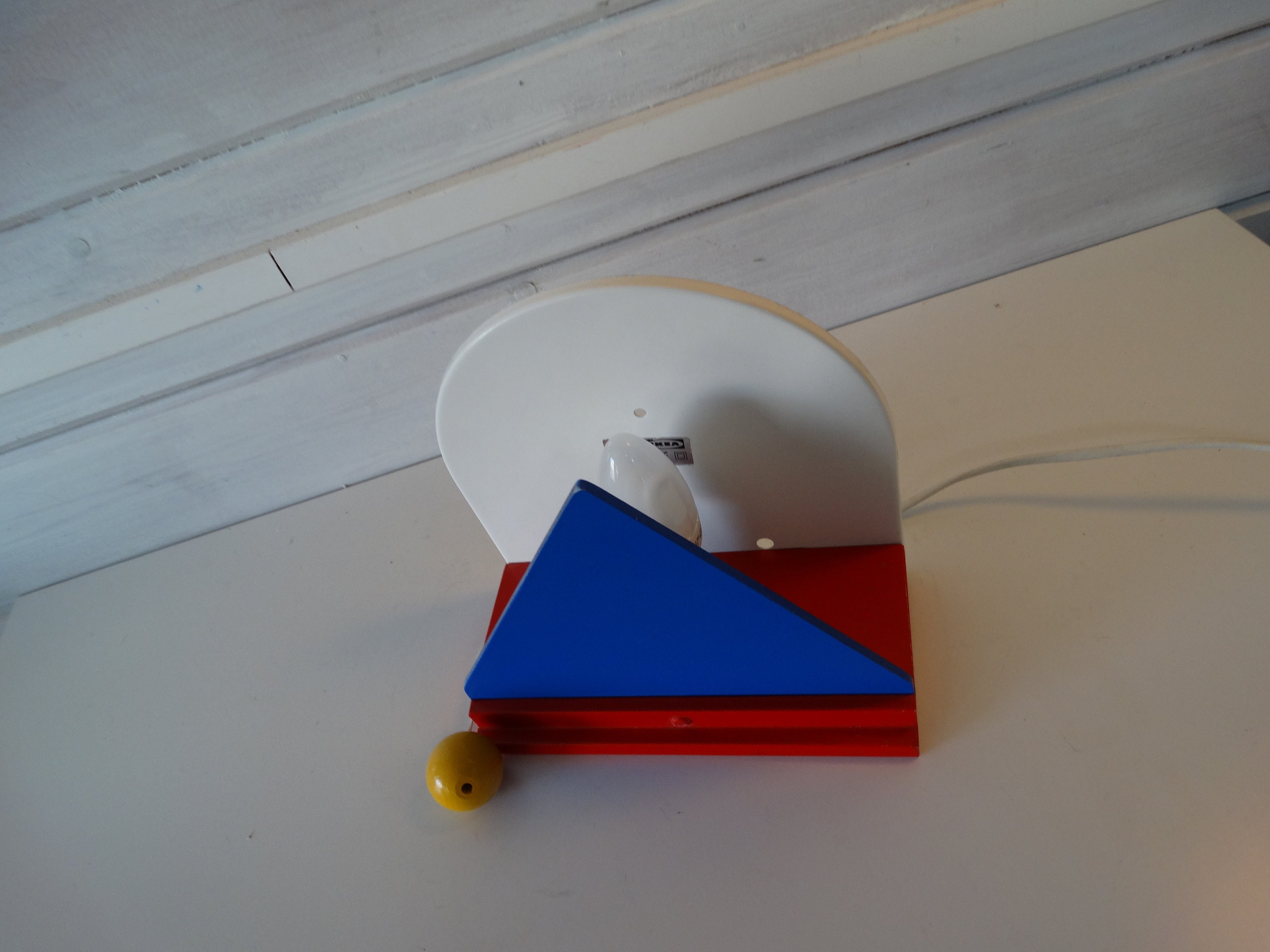 This Ikea wall lamp from the Stoja series has a beautiful stylish design inspired by the Memphis style. The round white part is made of metal. The blue triangle and red holder are made of wood. The lamp has an E14 small fitting with drawstring switch. The wooden round button is the on/off switch of the lamp. Due to the primary colors, the light stands out because of the striking design. The lamp still has the original Ikea brand label.