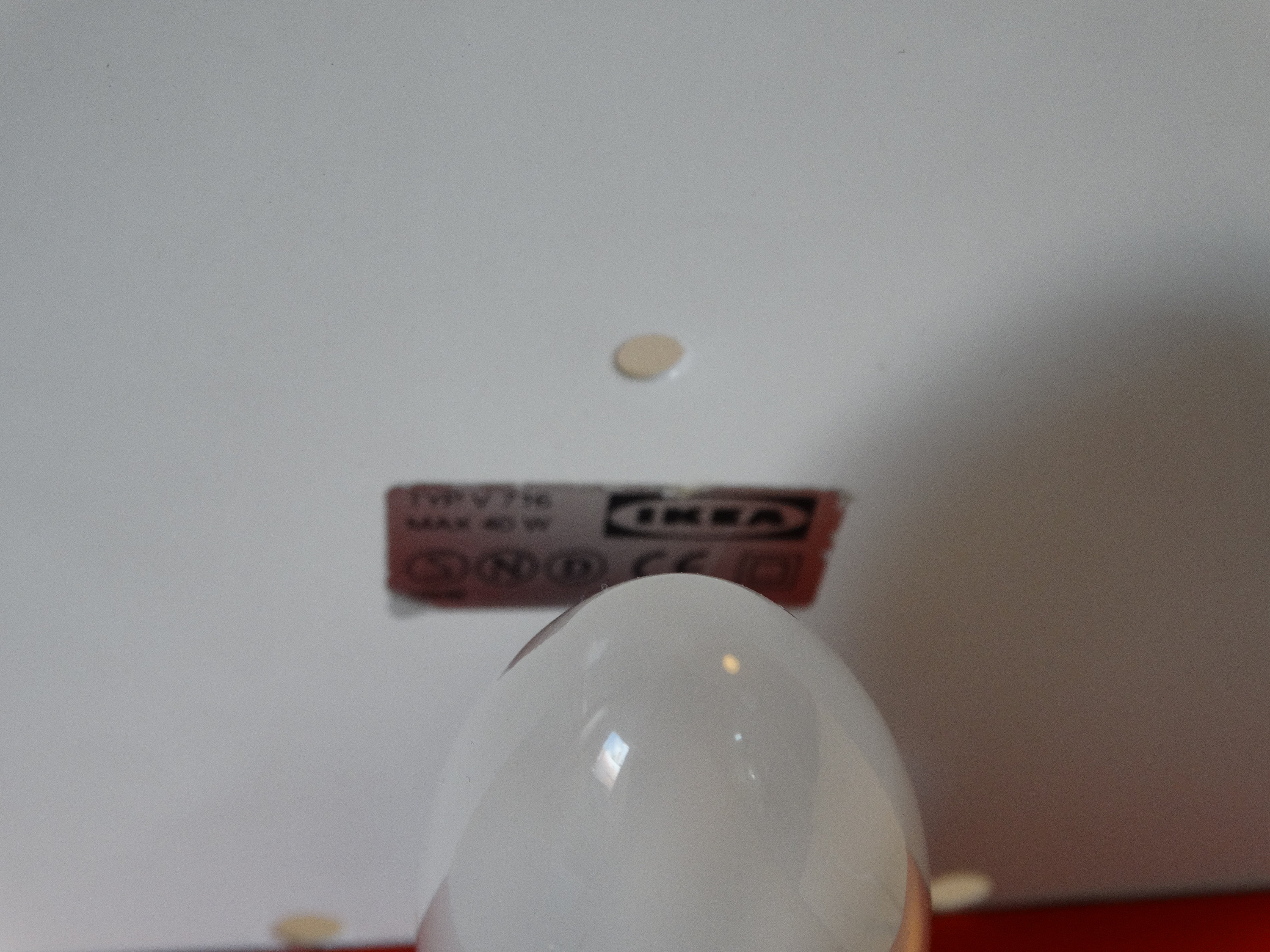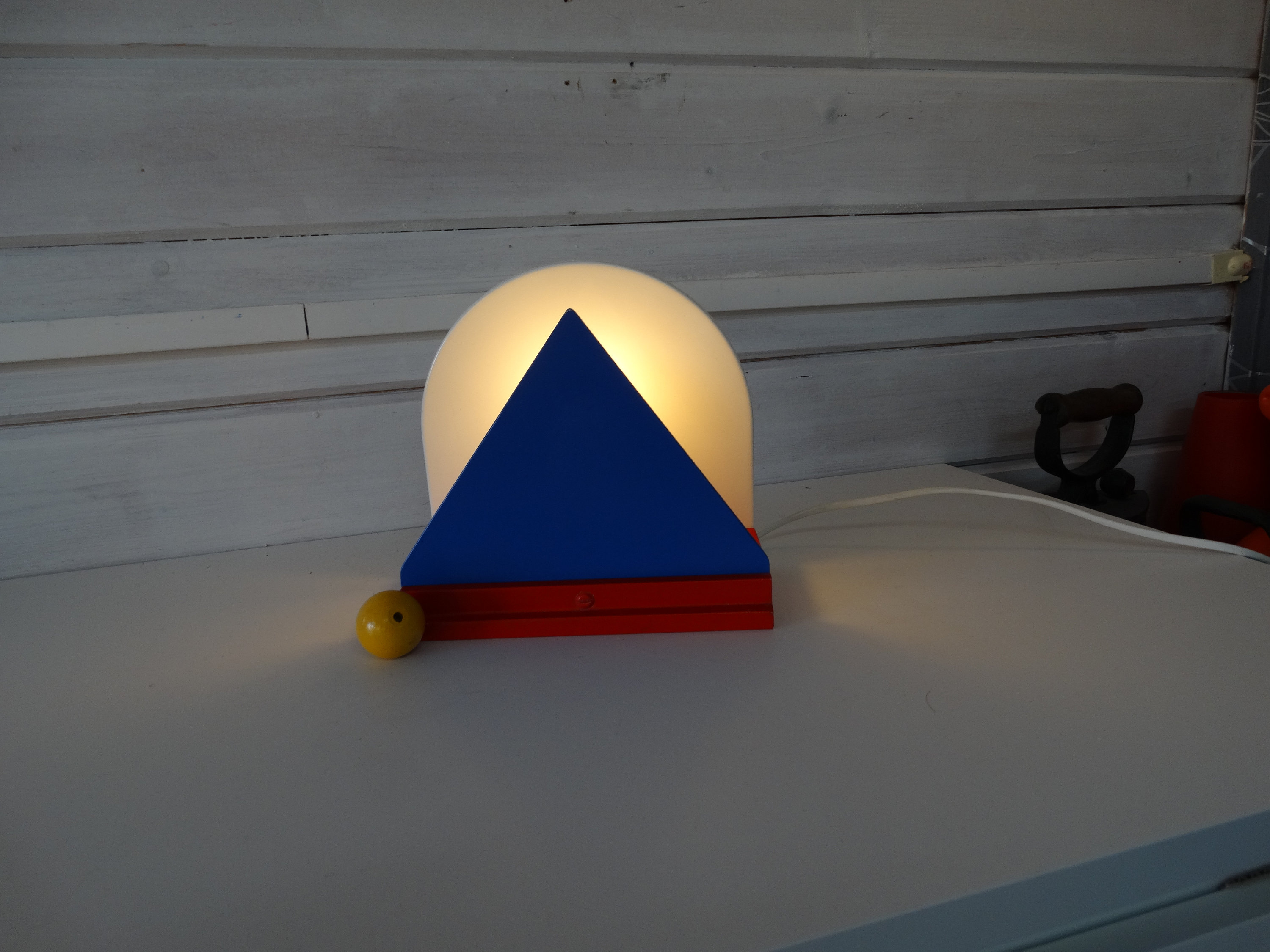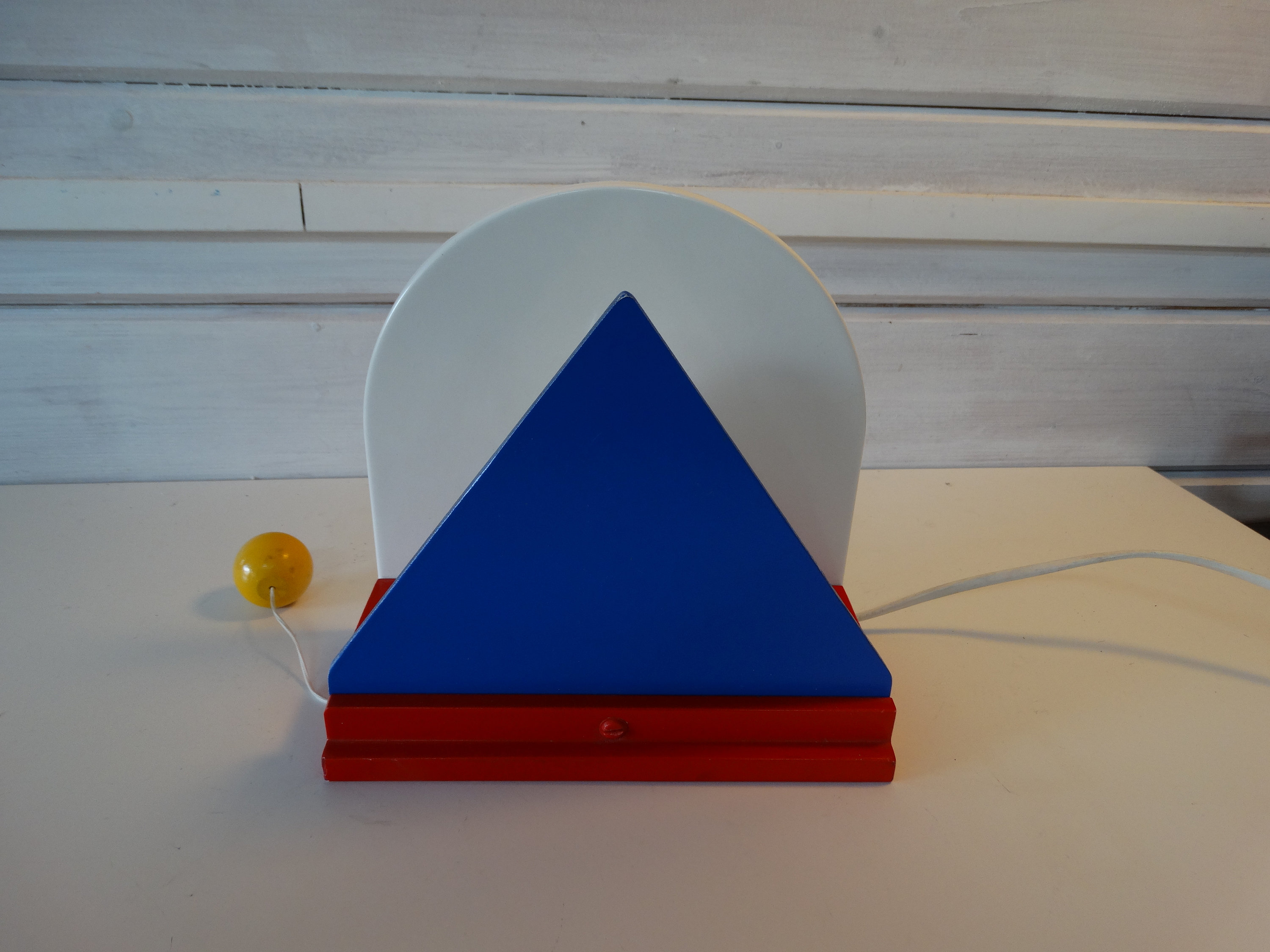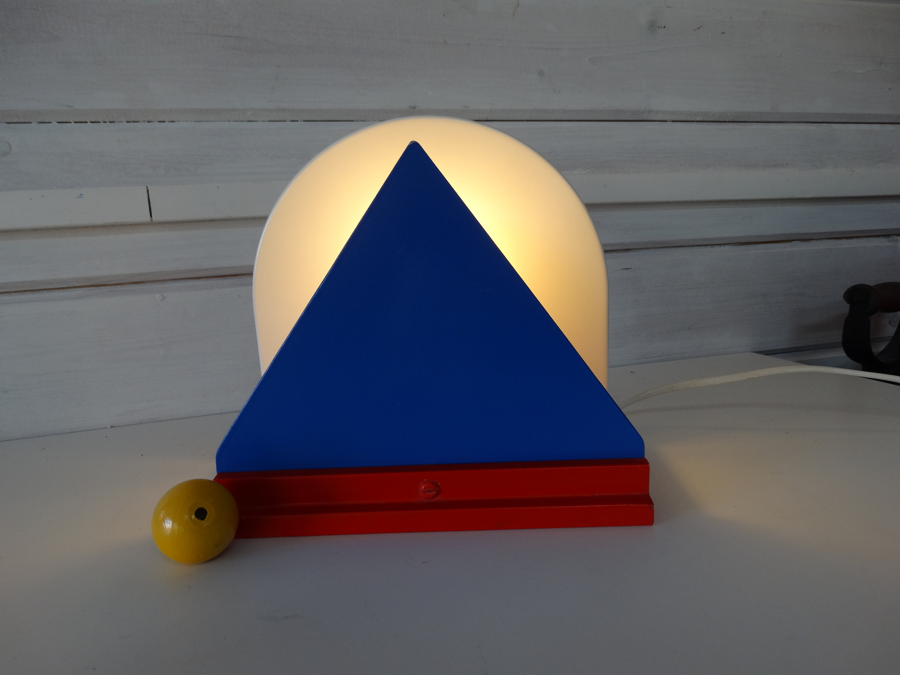 This Ikea wall lamp from the Stoja series has a beautiful stylish design inspired by the Memphis style. The round white part is made of metal. The blue triangle and red holder are made of wood. The lamp has an E14 small fitting with drawstring switch. The wooden round button is the on/off switch of the lamp. Due to the primary colors, the light stands out because of the striking design. The lamp still has the original Ikea brand label.