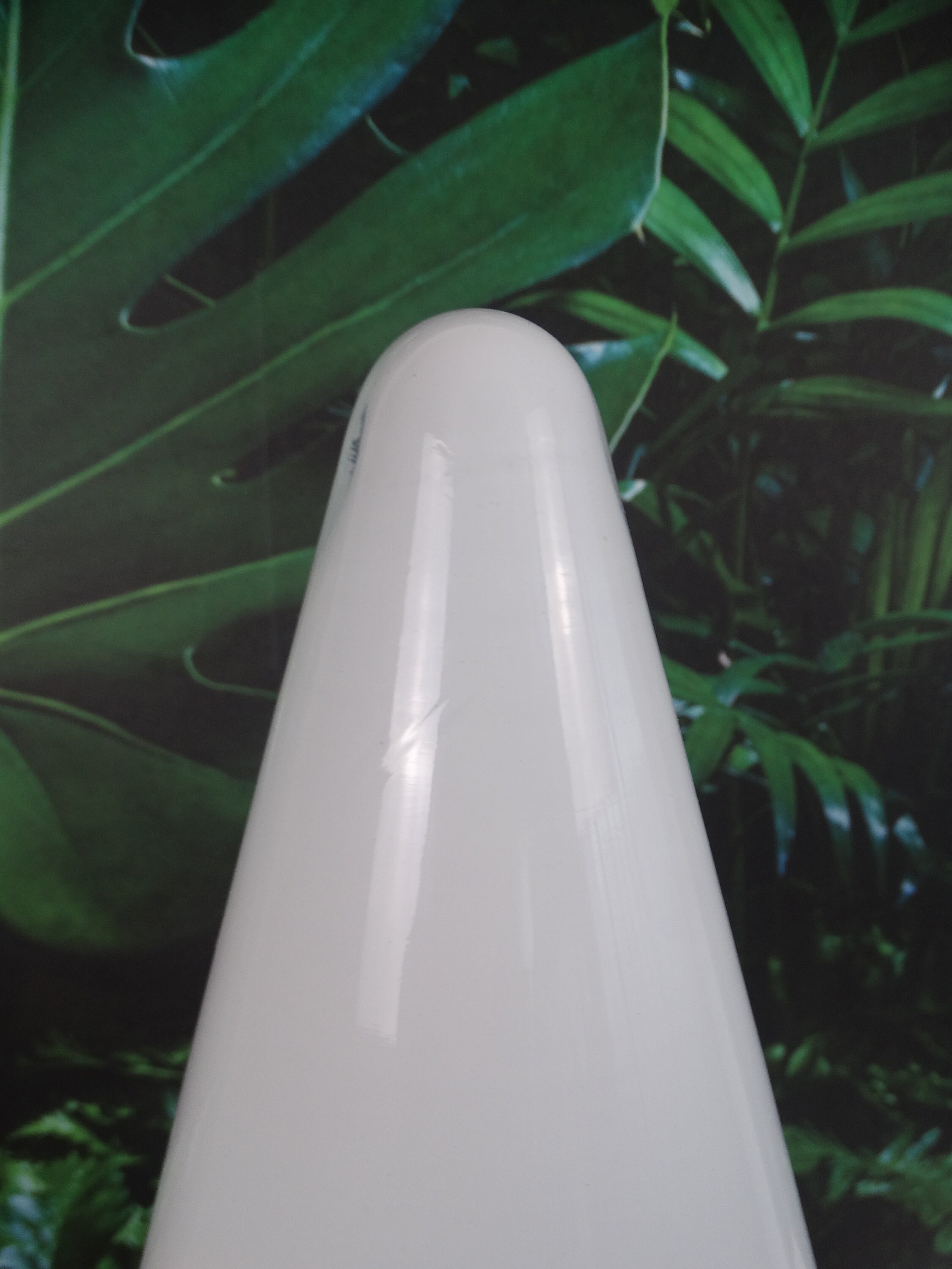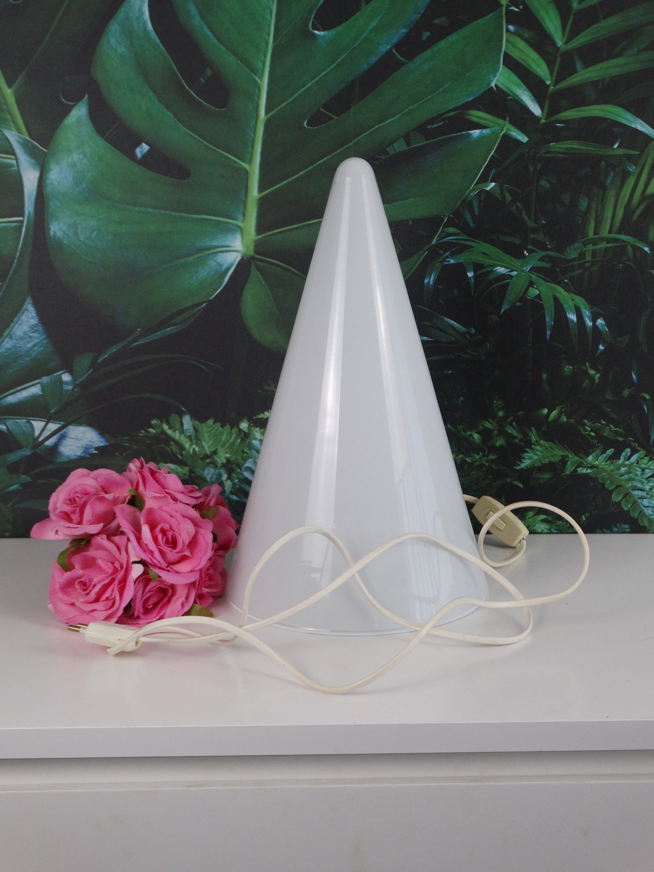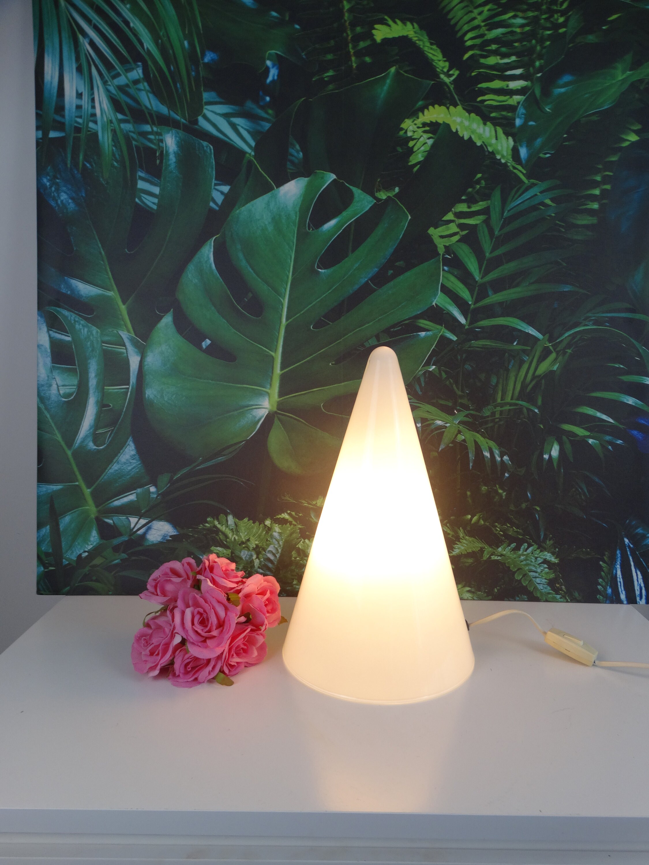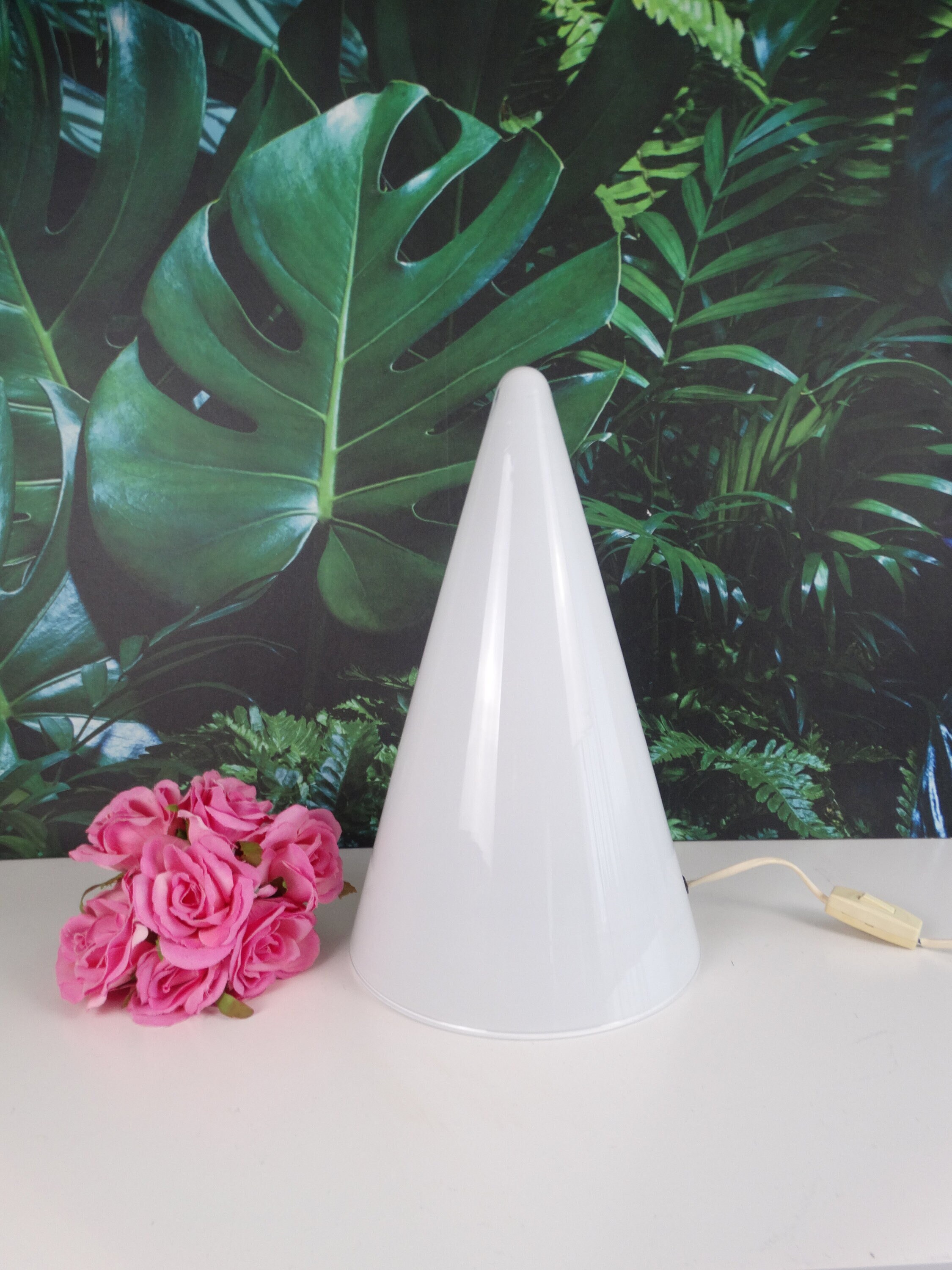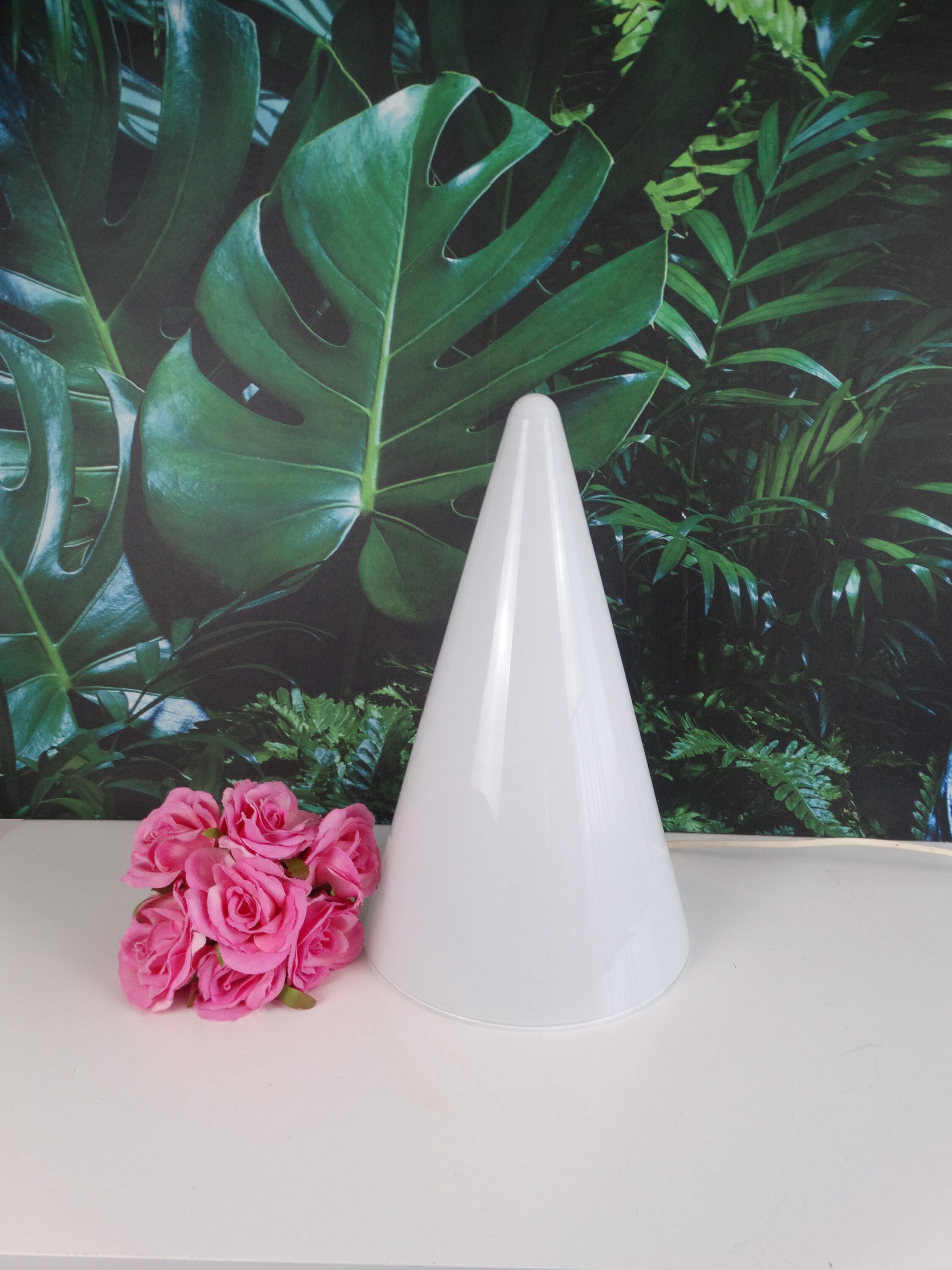Beautiful conical lamp, made entirely of opal glass. The glass of the lamp is made in France, it is mouth-blown clear glass with a white coating on the inside of the glass and with a transparent tip. This is a medium-sized example from the series