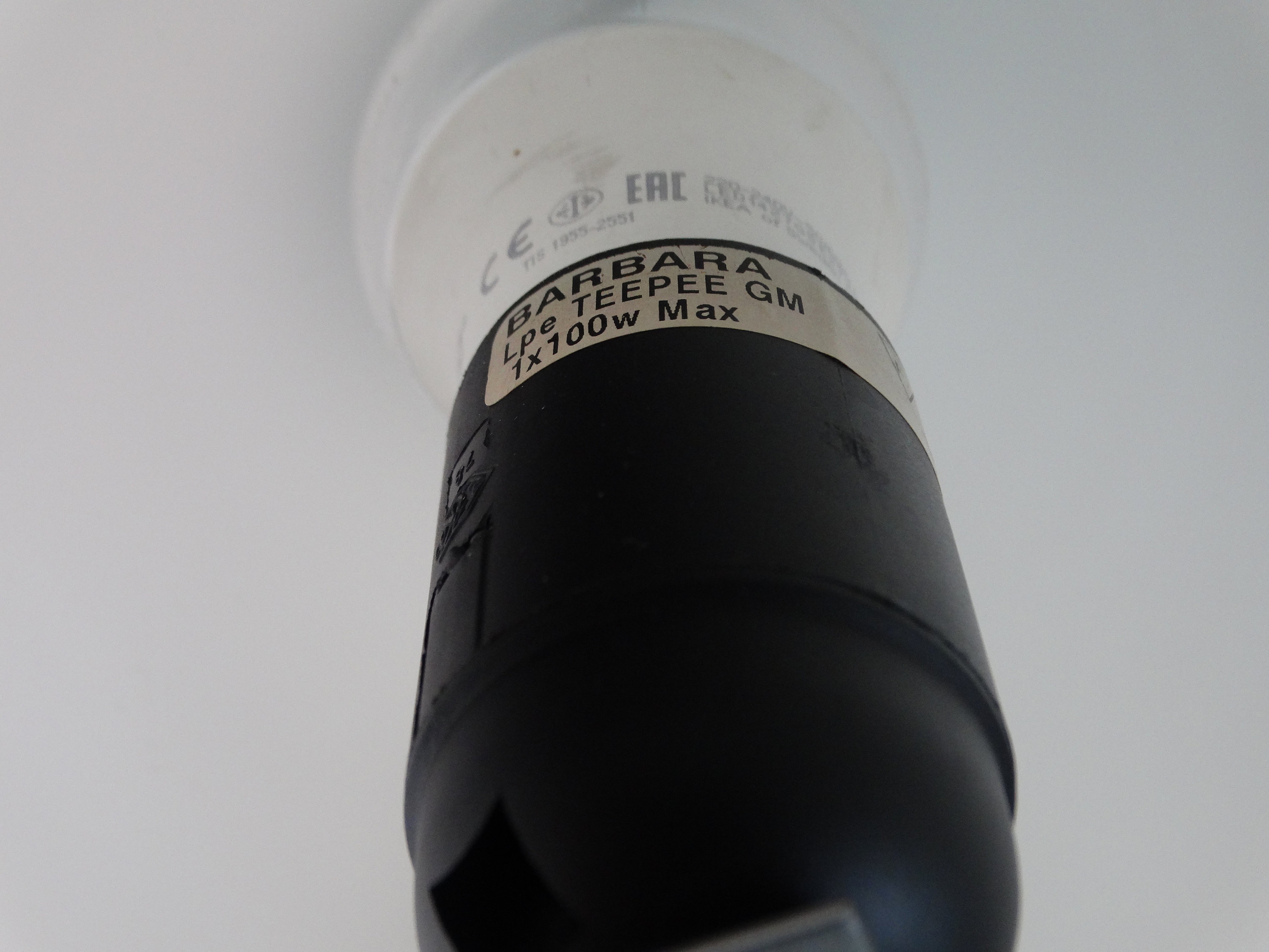 This lamp was designed and manufactured by the French lighting manufacturer "Societe Centrale d'Eclairage France" (SCE) with the model name Teepee. The name is a reference to the Tipi, the cone-shaped tent of the Indians.