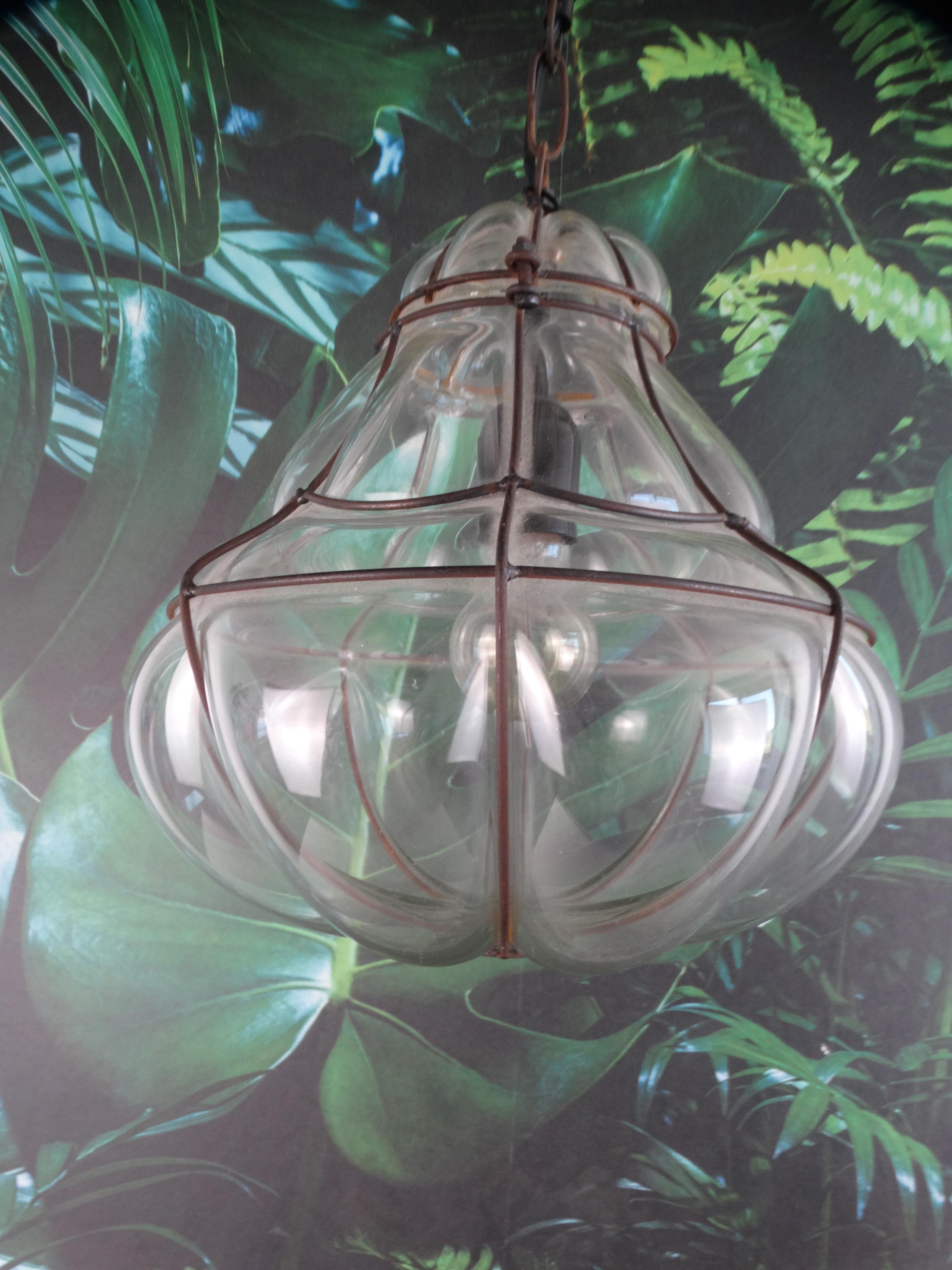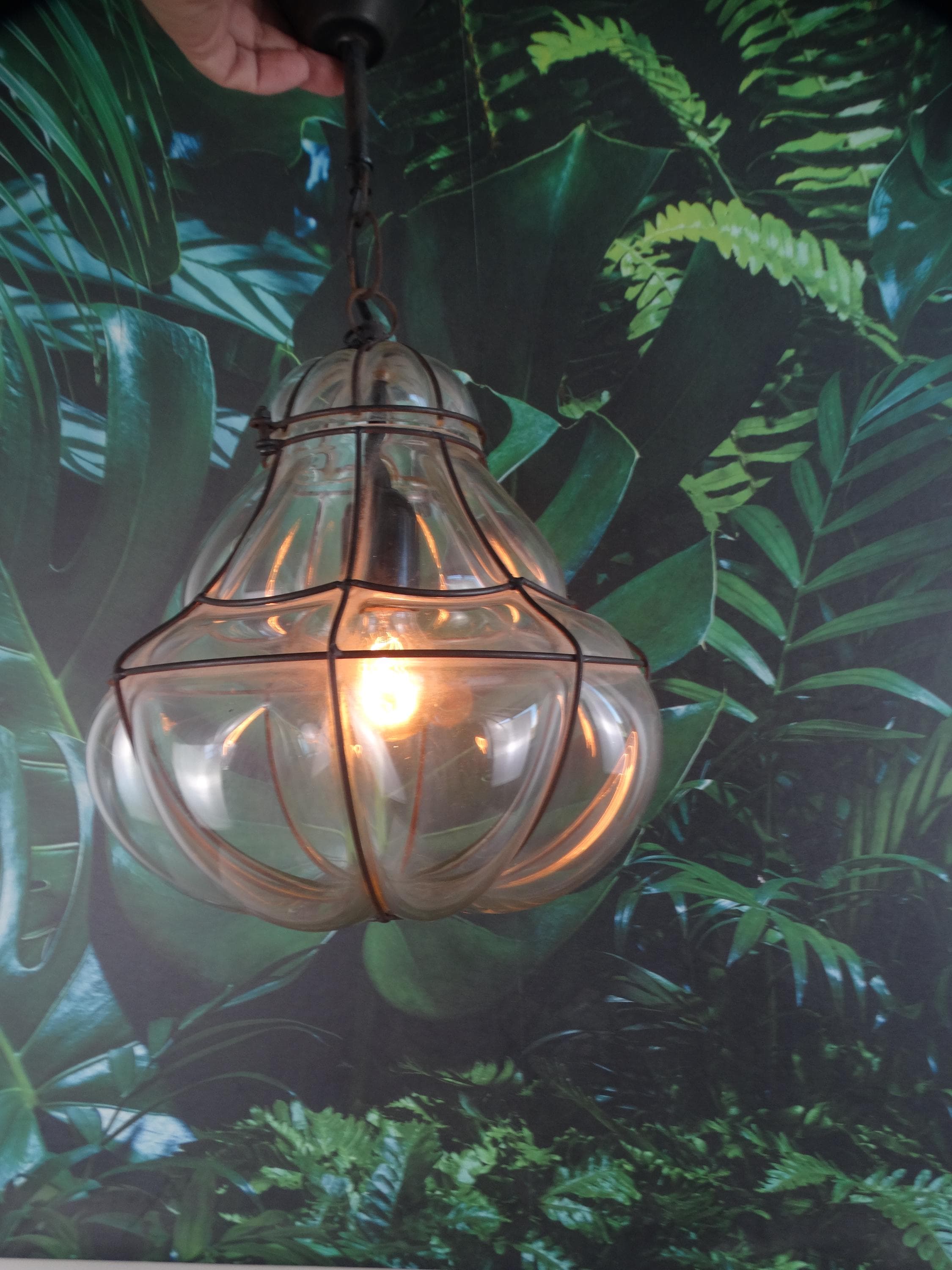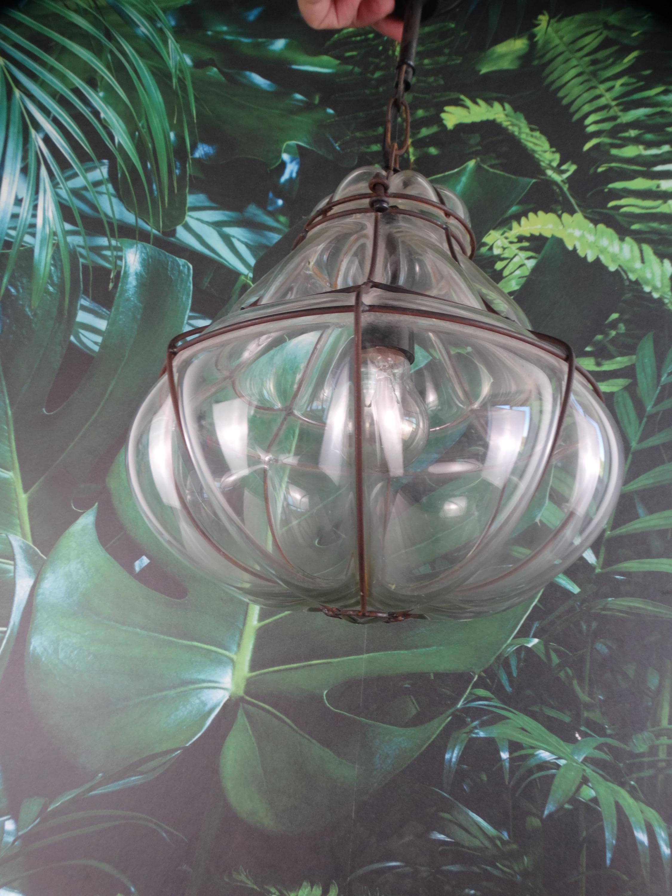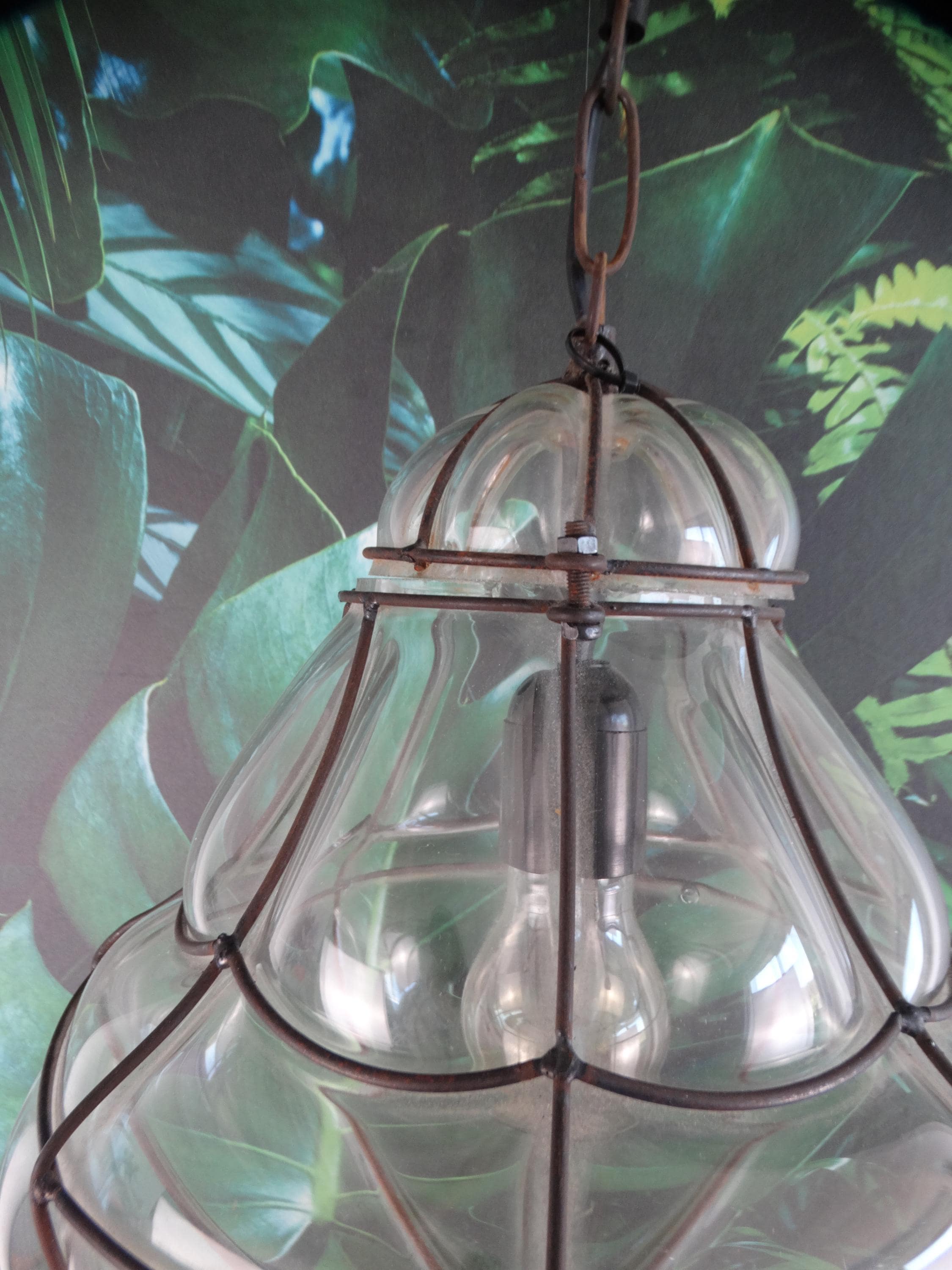 Vintage chandelier, a light glass pendant lamp, handmade and blown in a wrought iron cage.