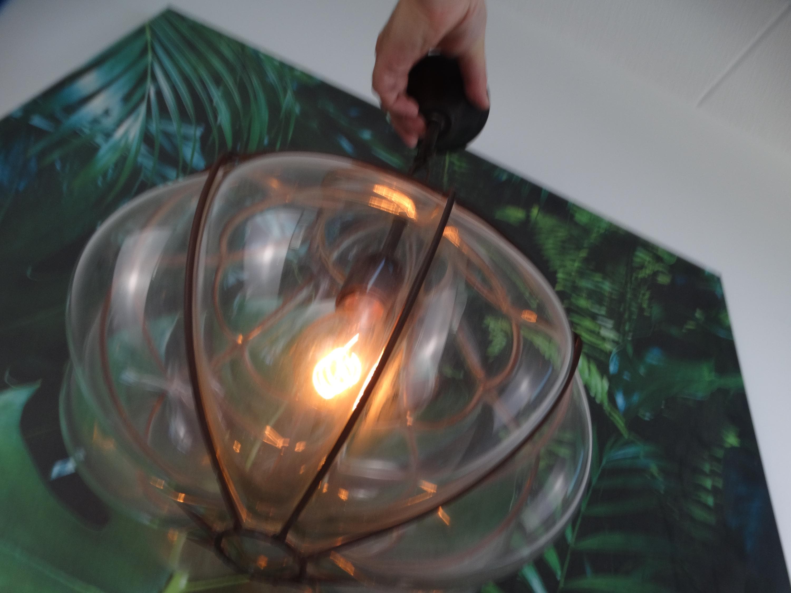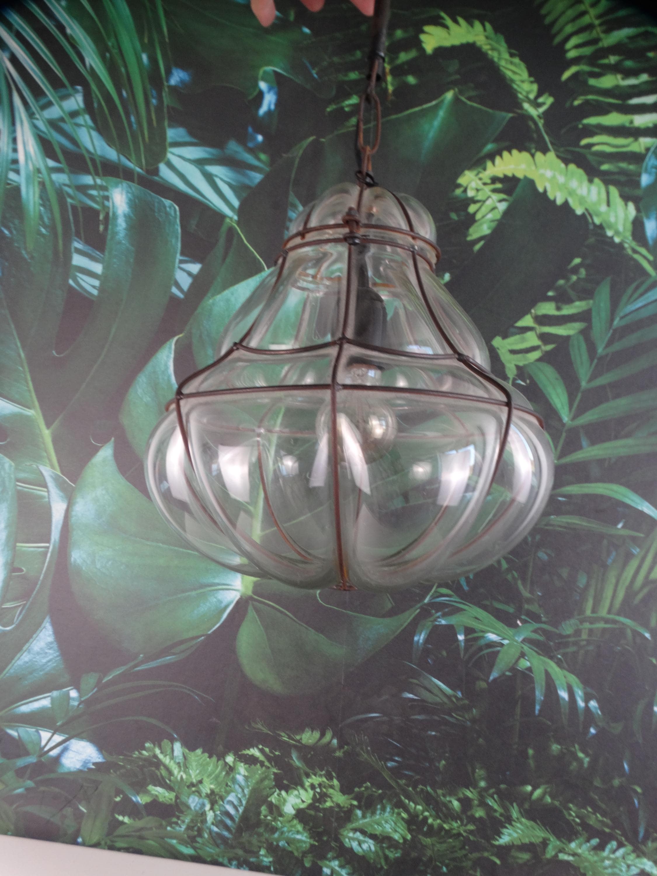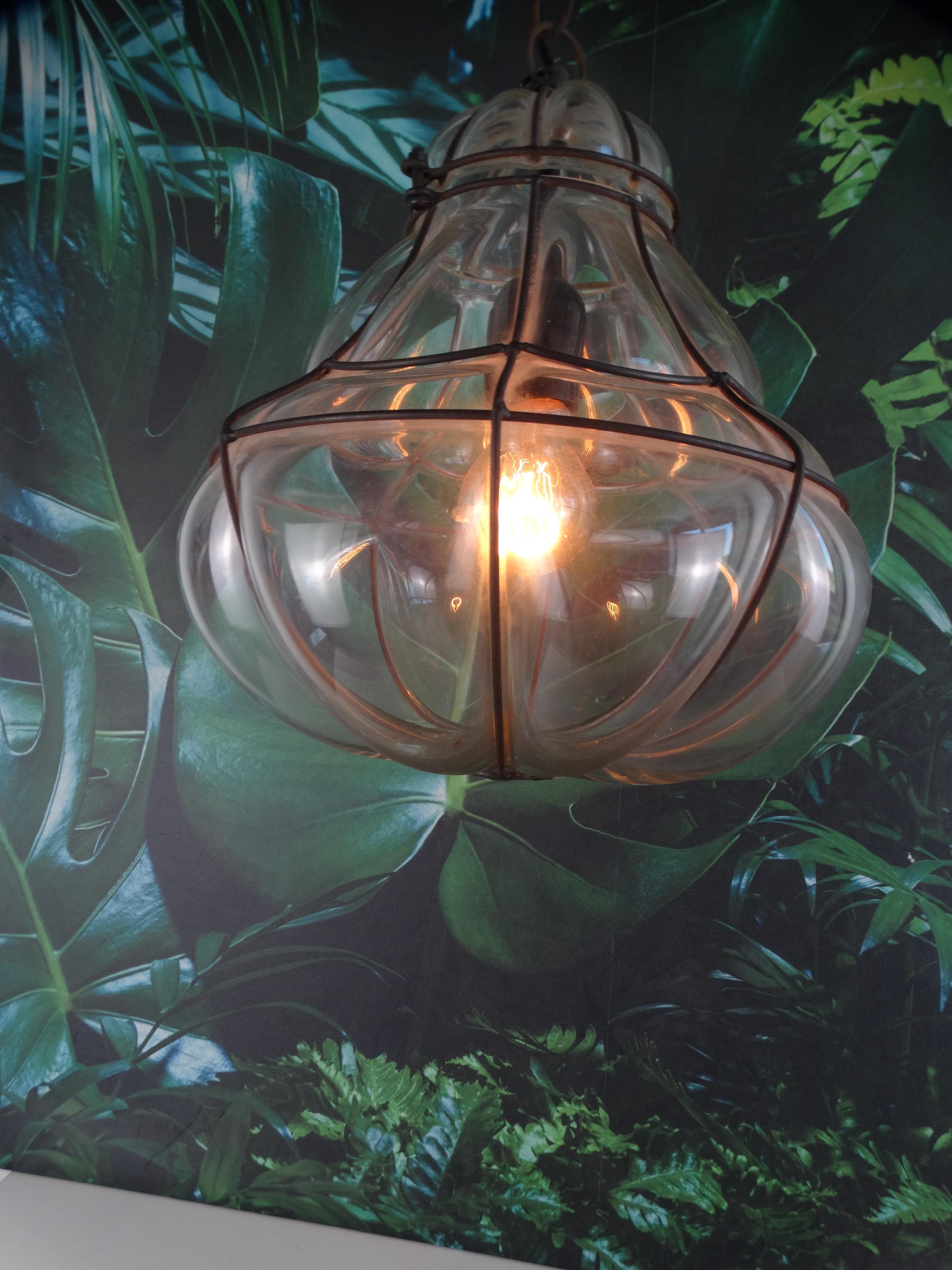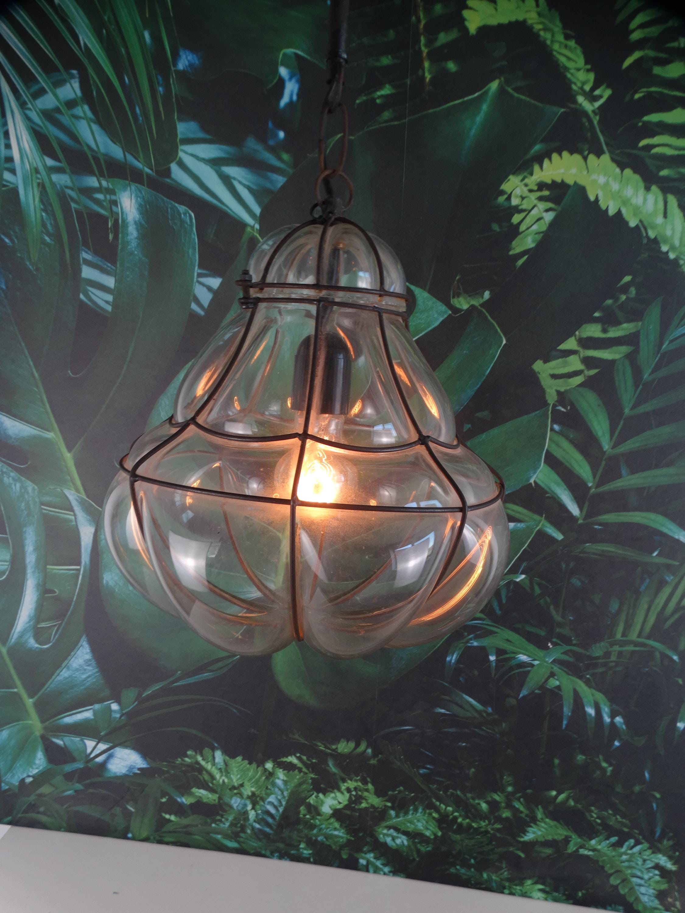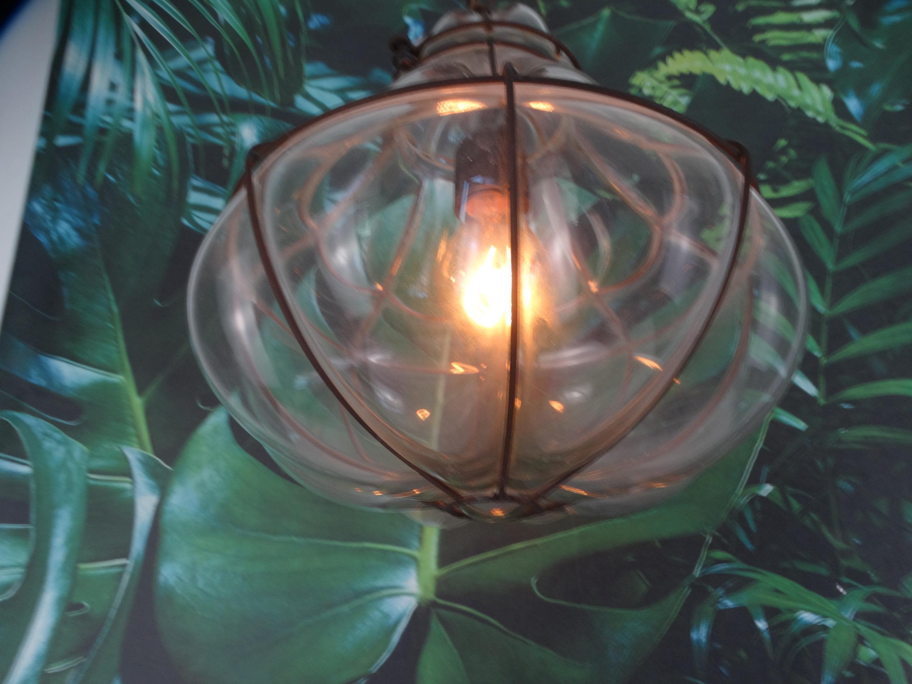 Vintage chandelier, a light glass pendant lamp, handmade and blown in a wrought iron cage.
