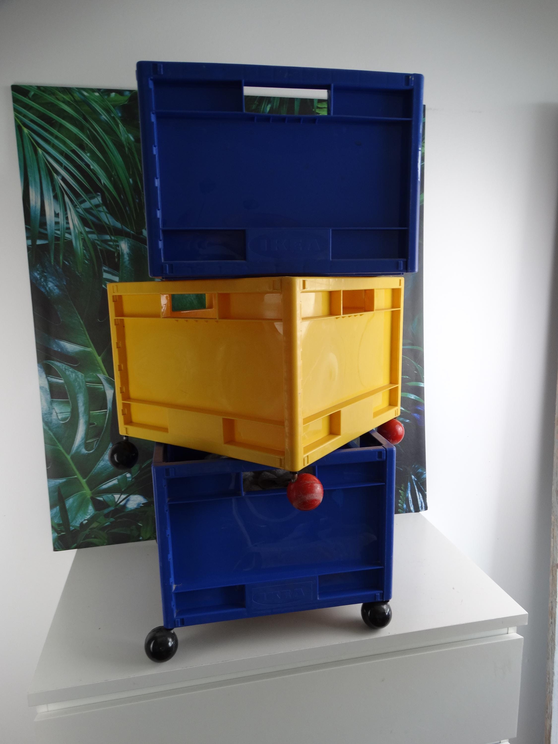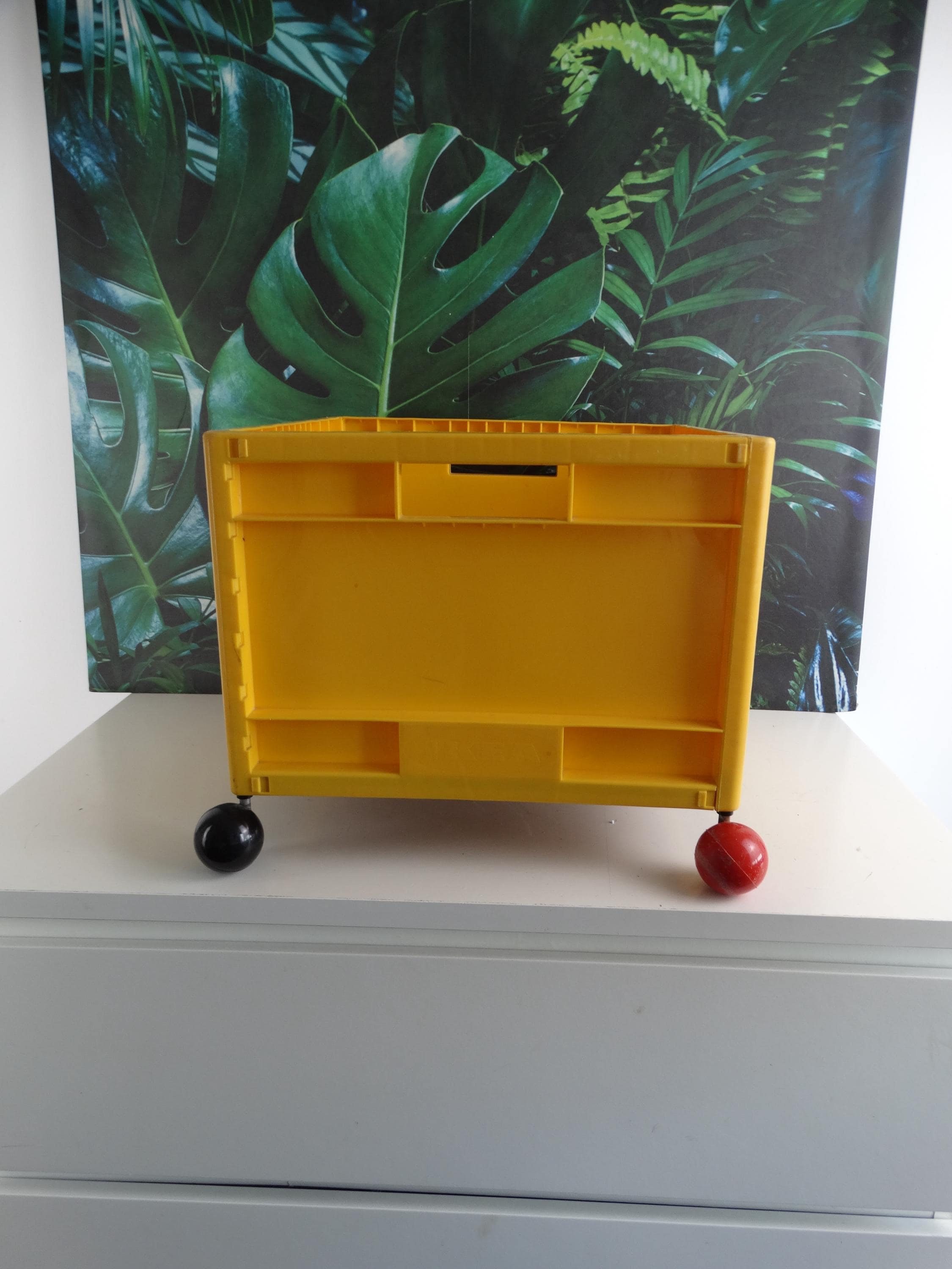 The storage crate is in good vintage condition, but with signs of wear (scratches).