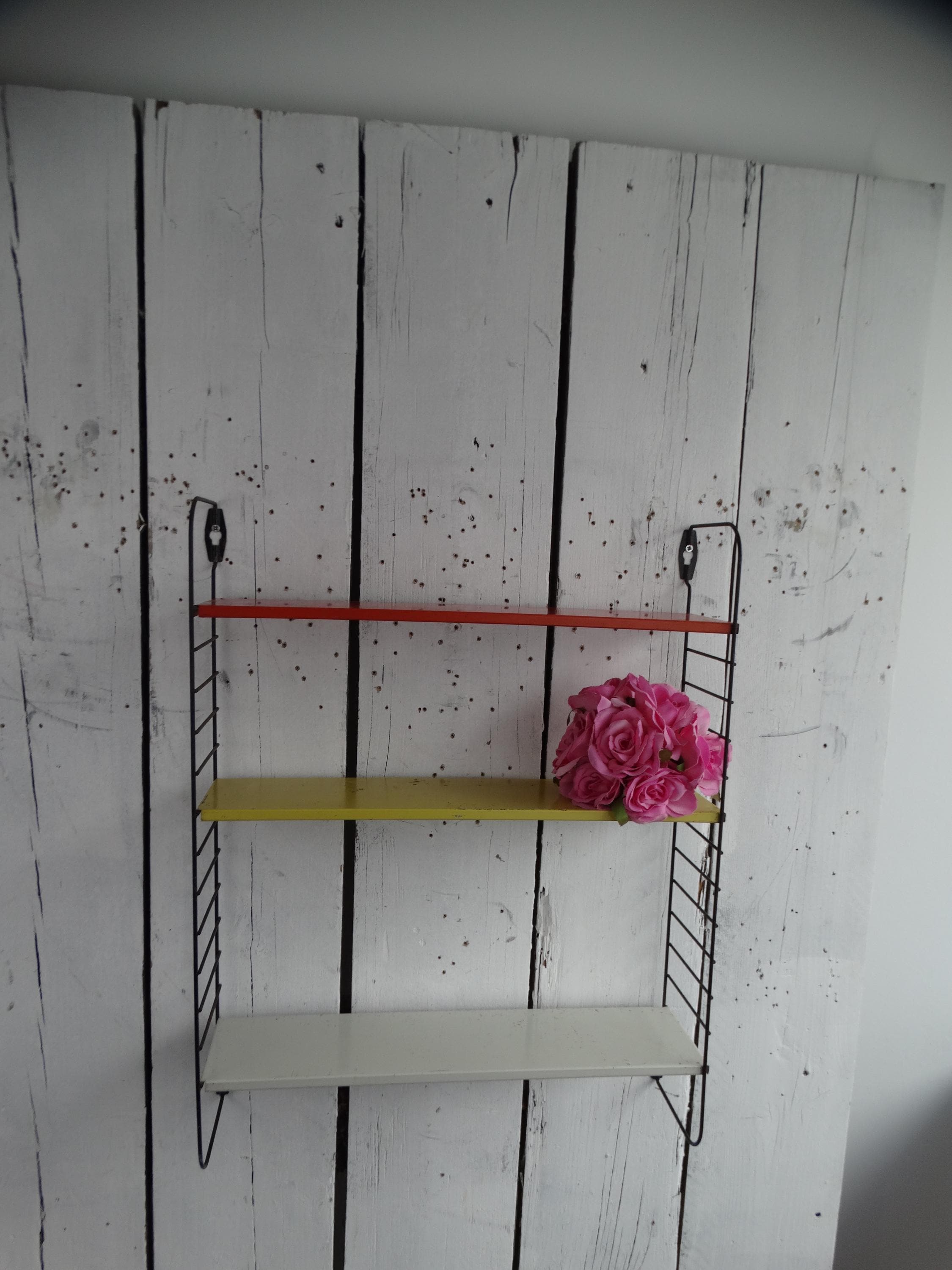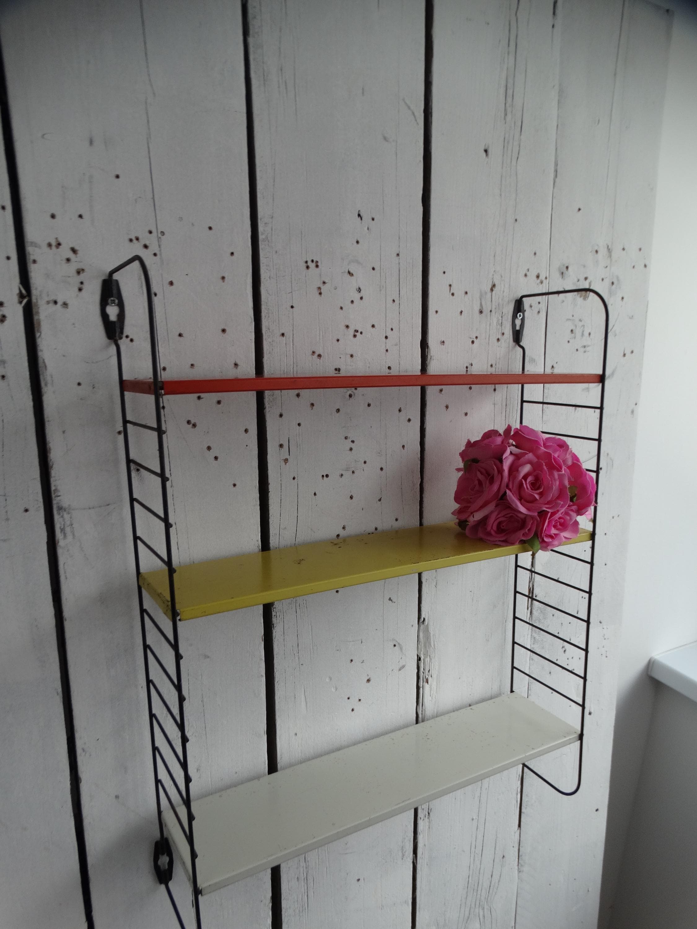 Vintage Tomado wall shelf unit with three colorful metal shelves: orange, yellow, and gray, and two black metal side panels. It also has an adjustable bookend for each shelf.