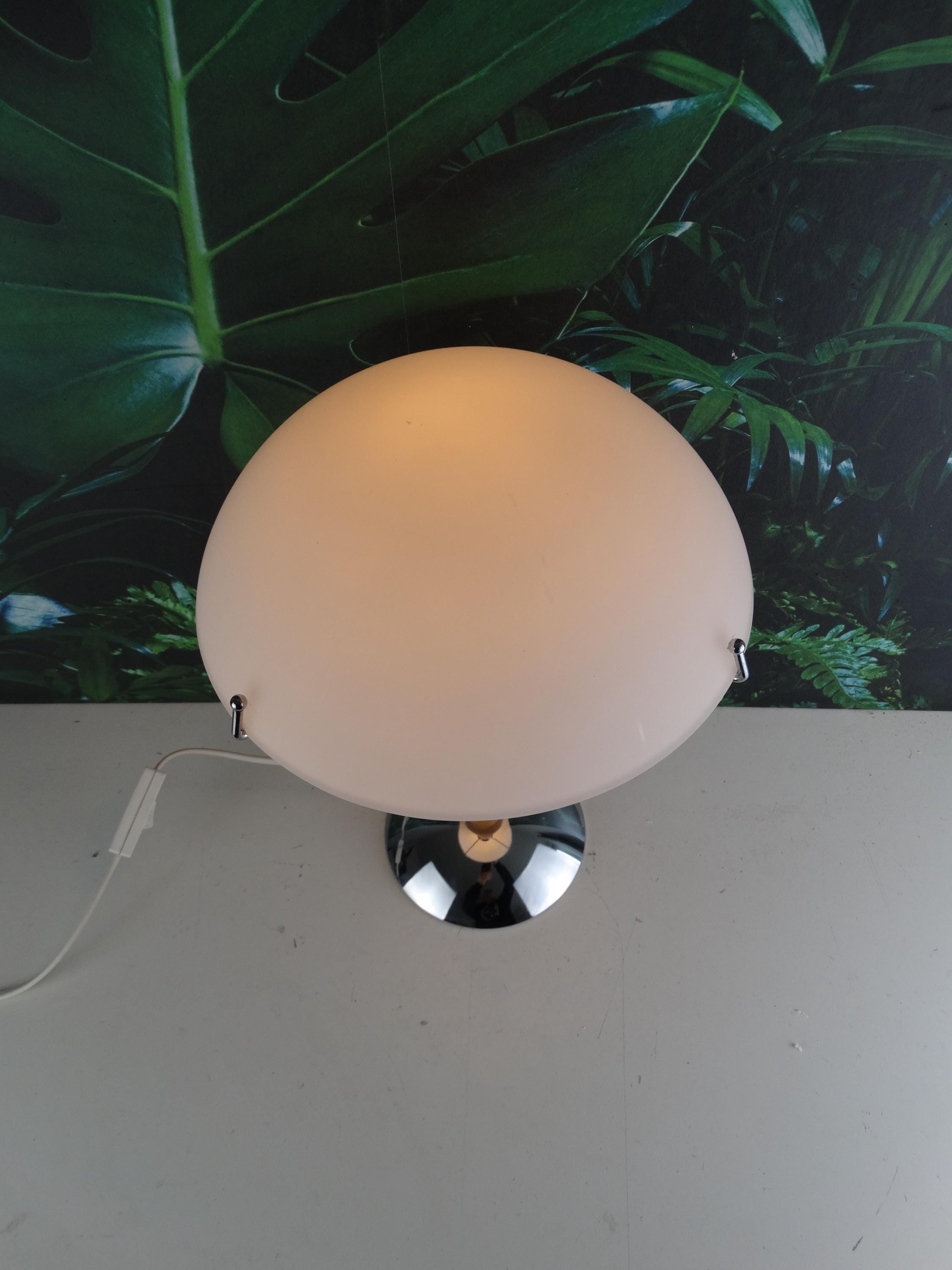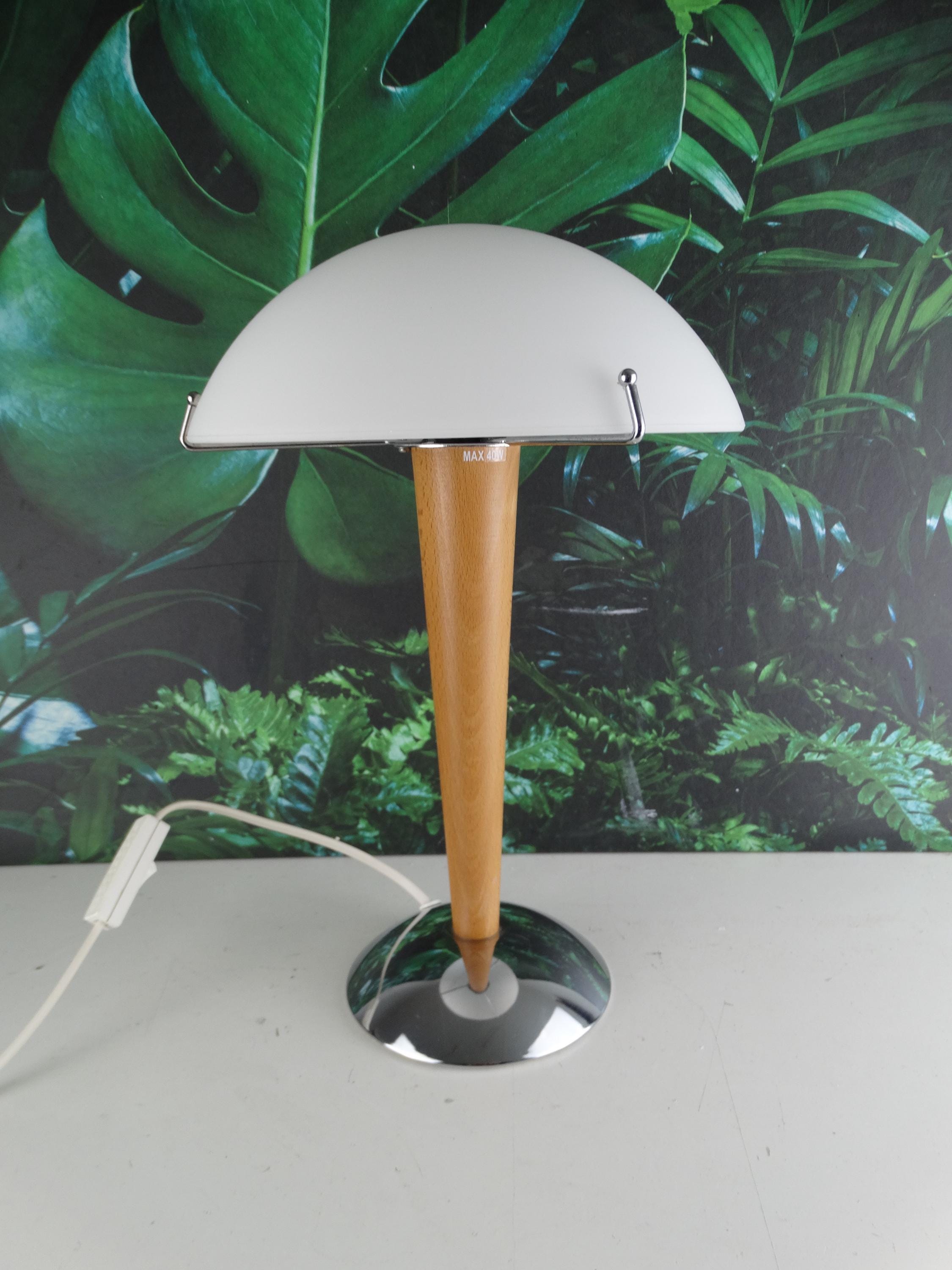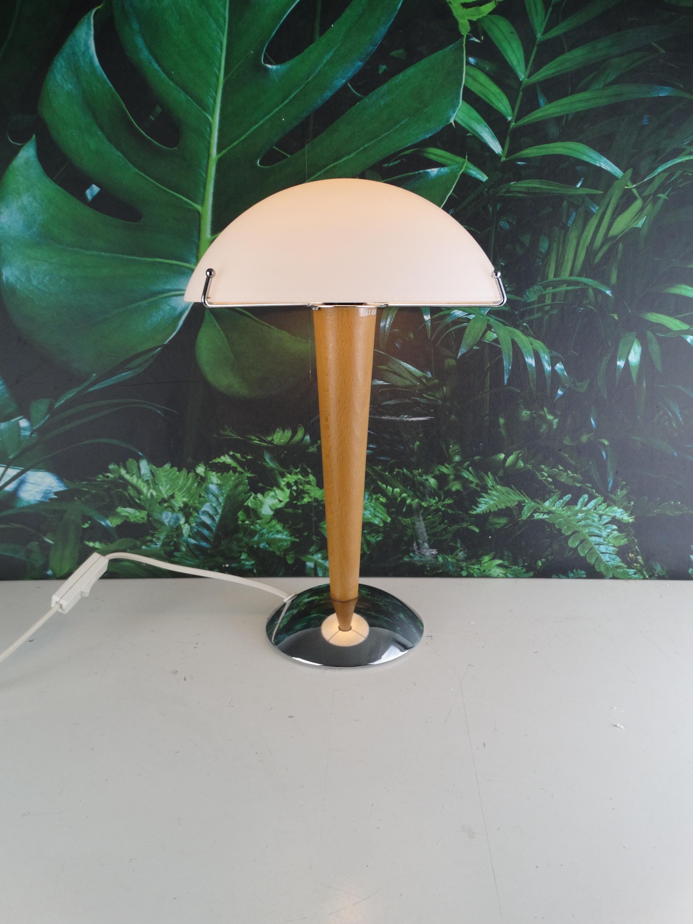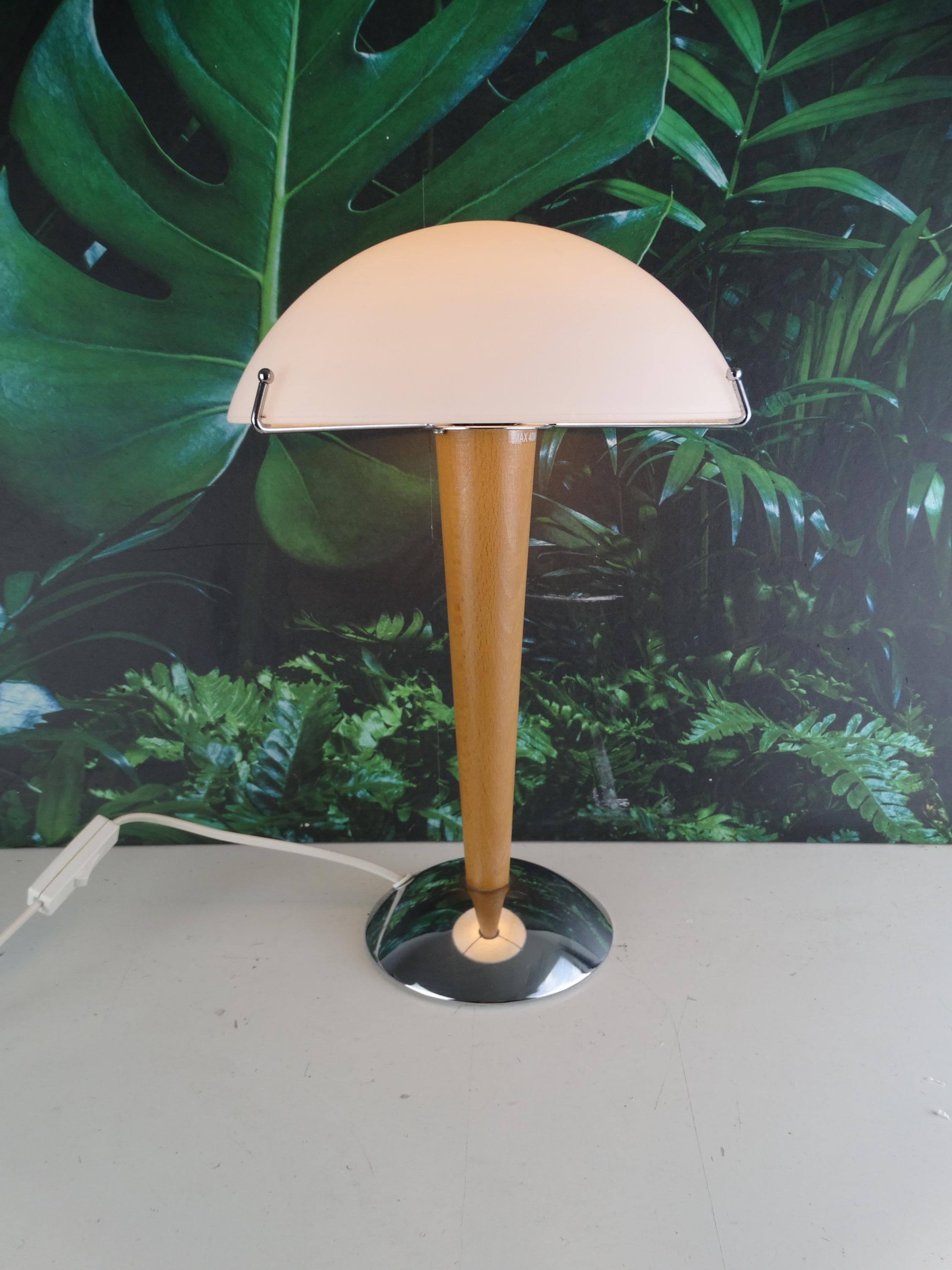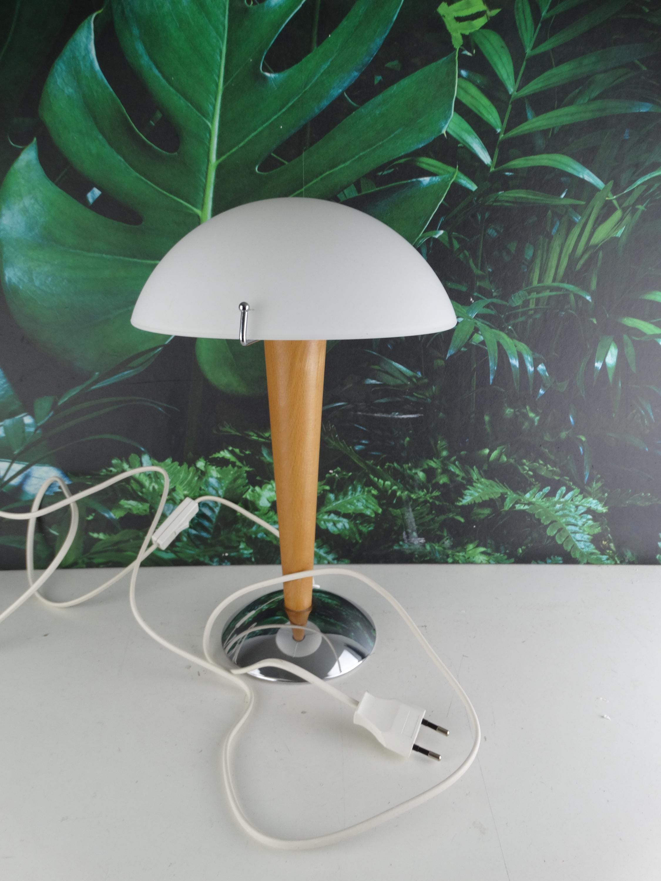 This lamp is made in the mushroom model, the beech wood stem and the chrome base match the frosted glass shade perfectly.