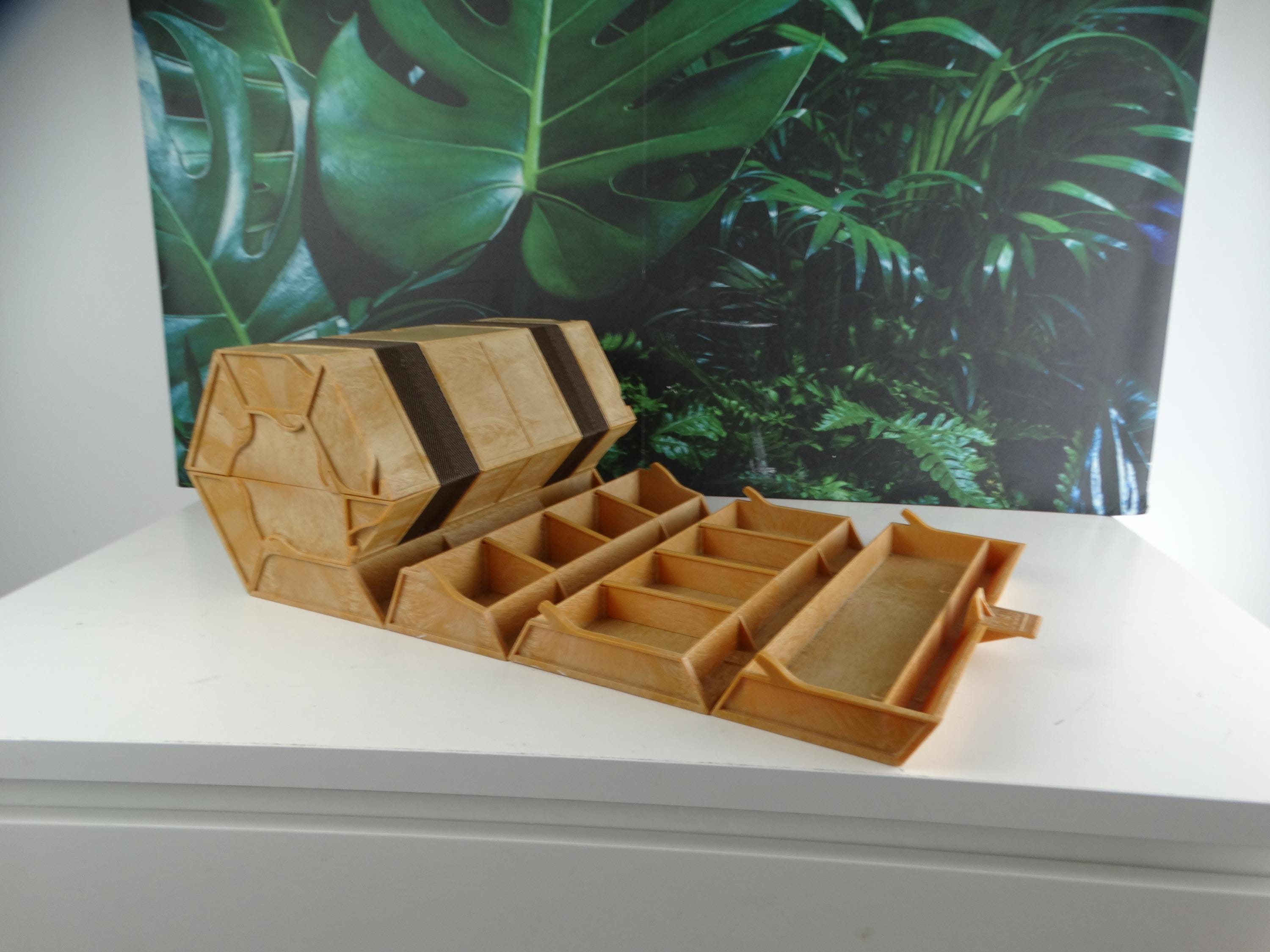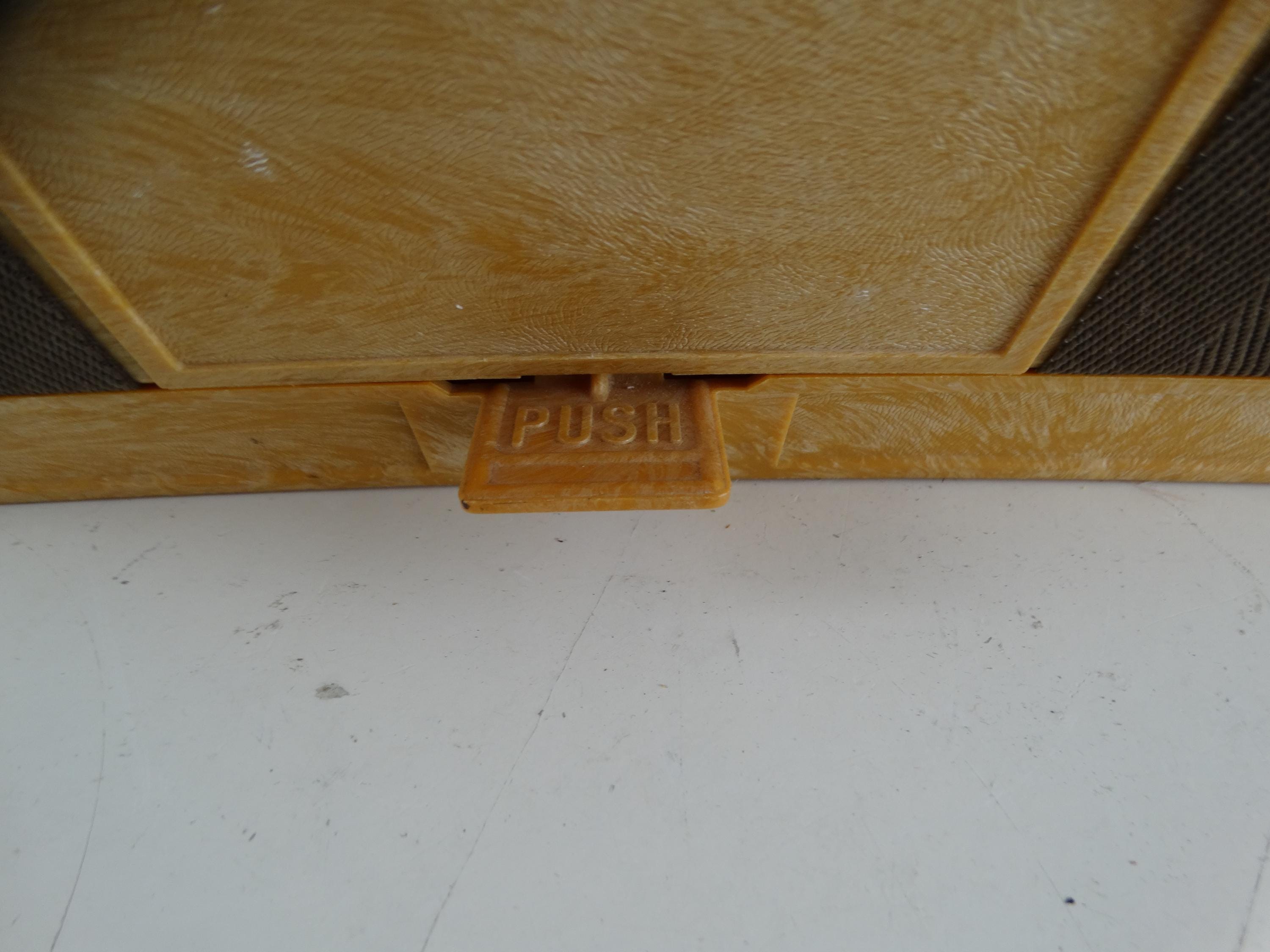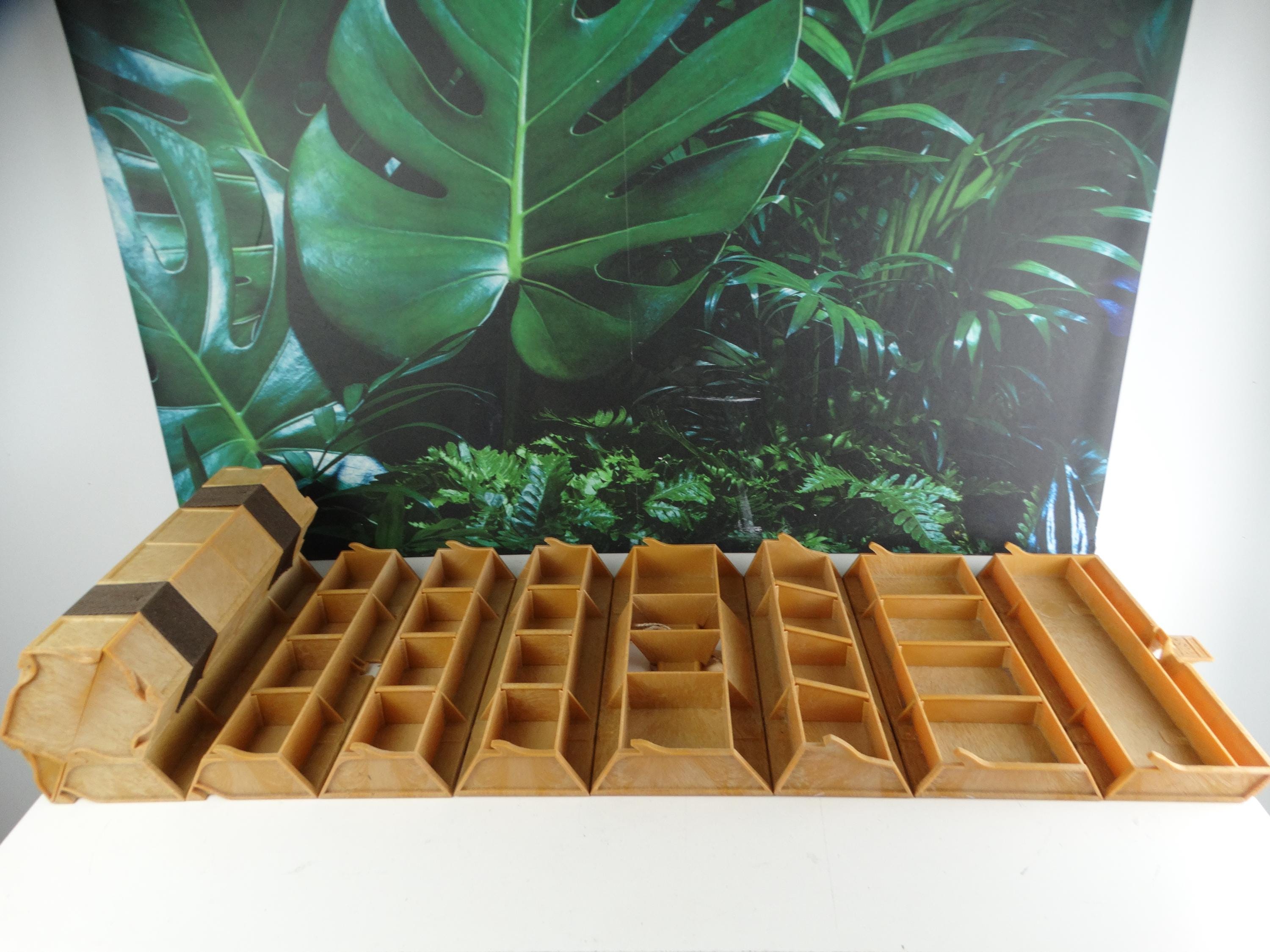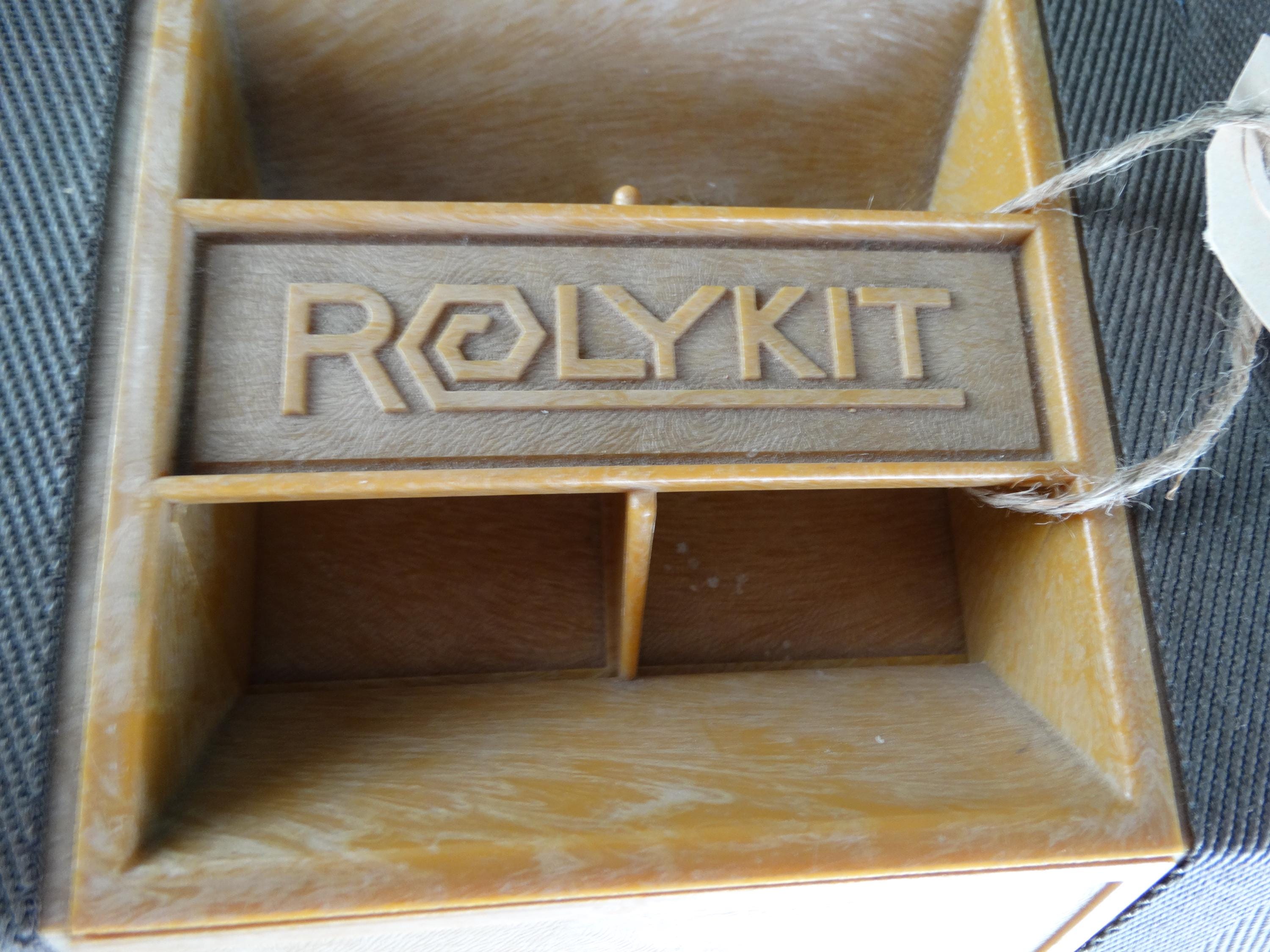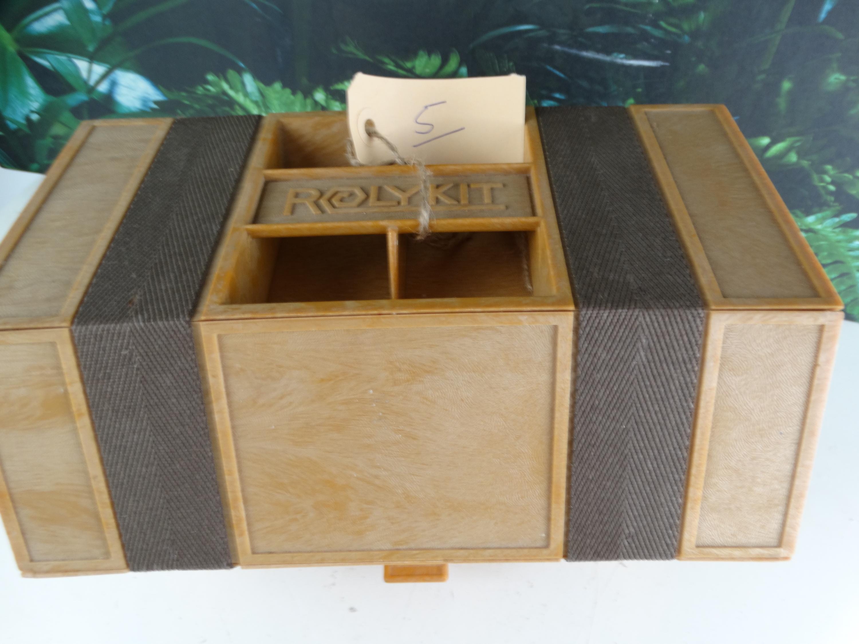 Here we have a great Rolykit Roll-up Storage Box from the 1980's. It rolls out into this long strip of compartments. It's a brown color. Other than that it's in good condition and has a handle for easy carrying. This piece would help keep all your goodies organized! In great condition!