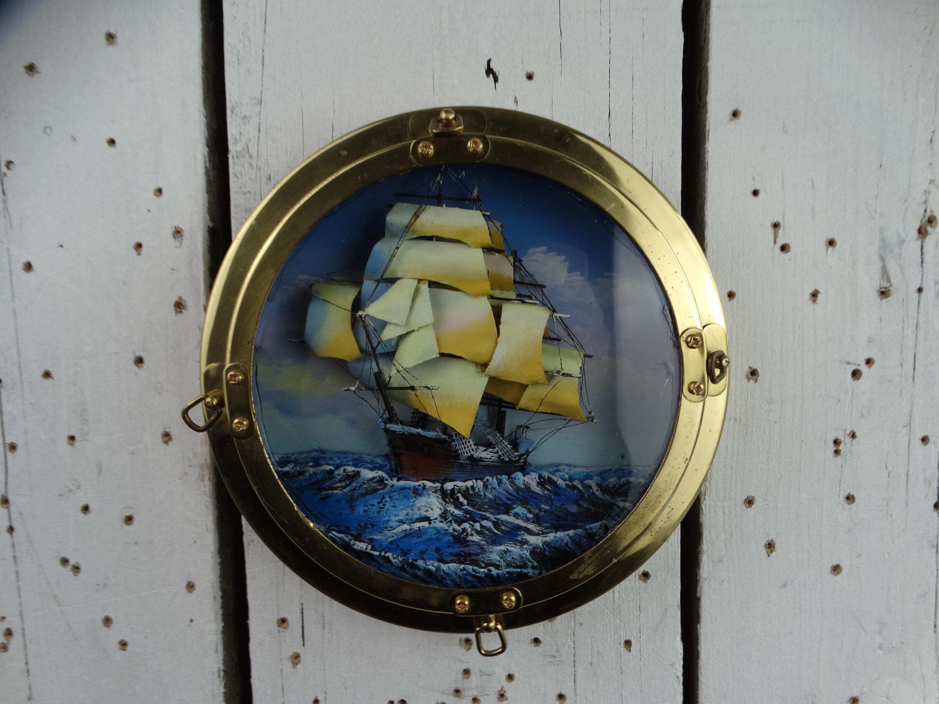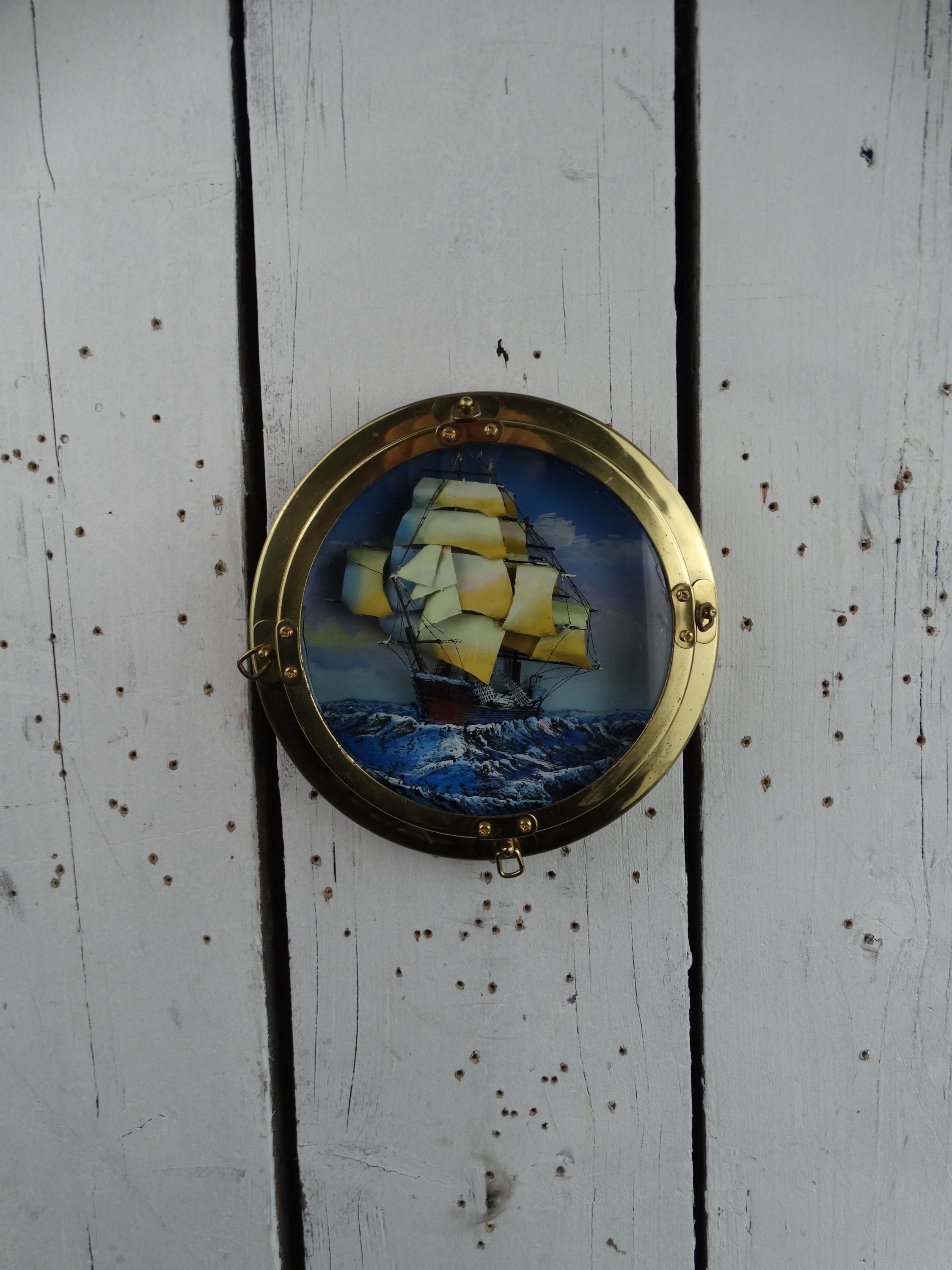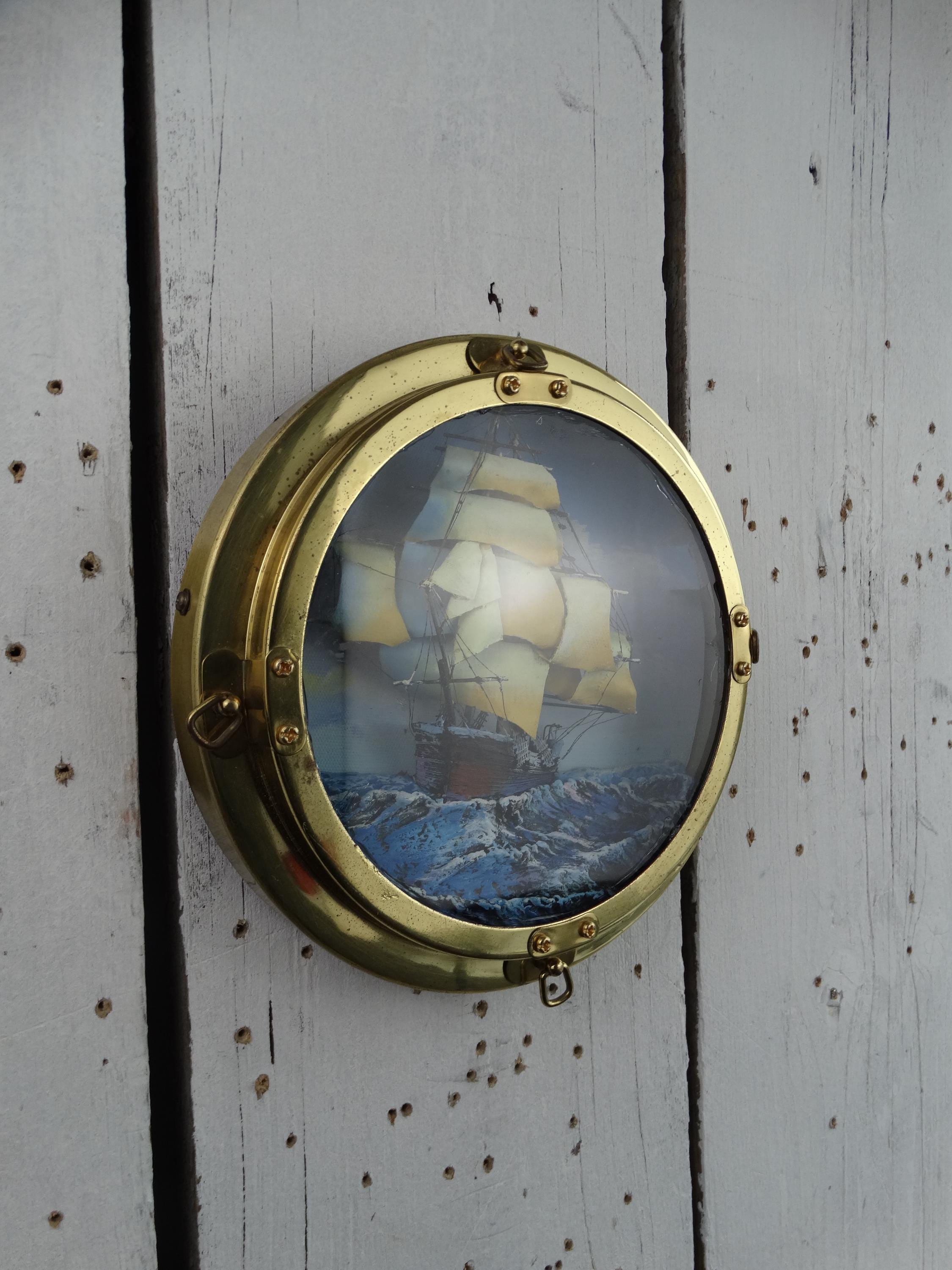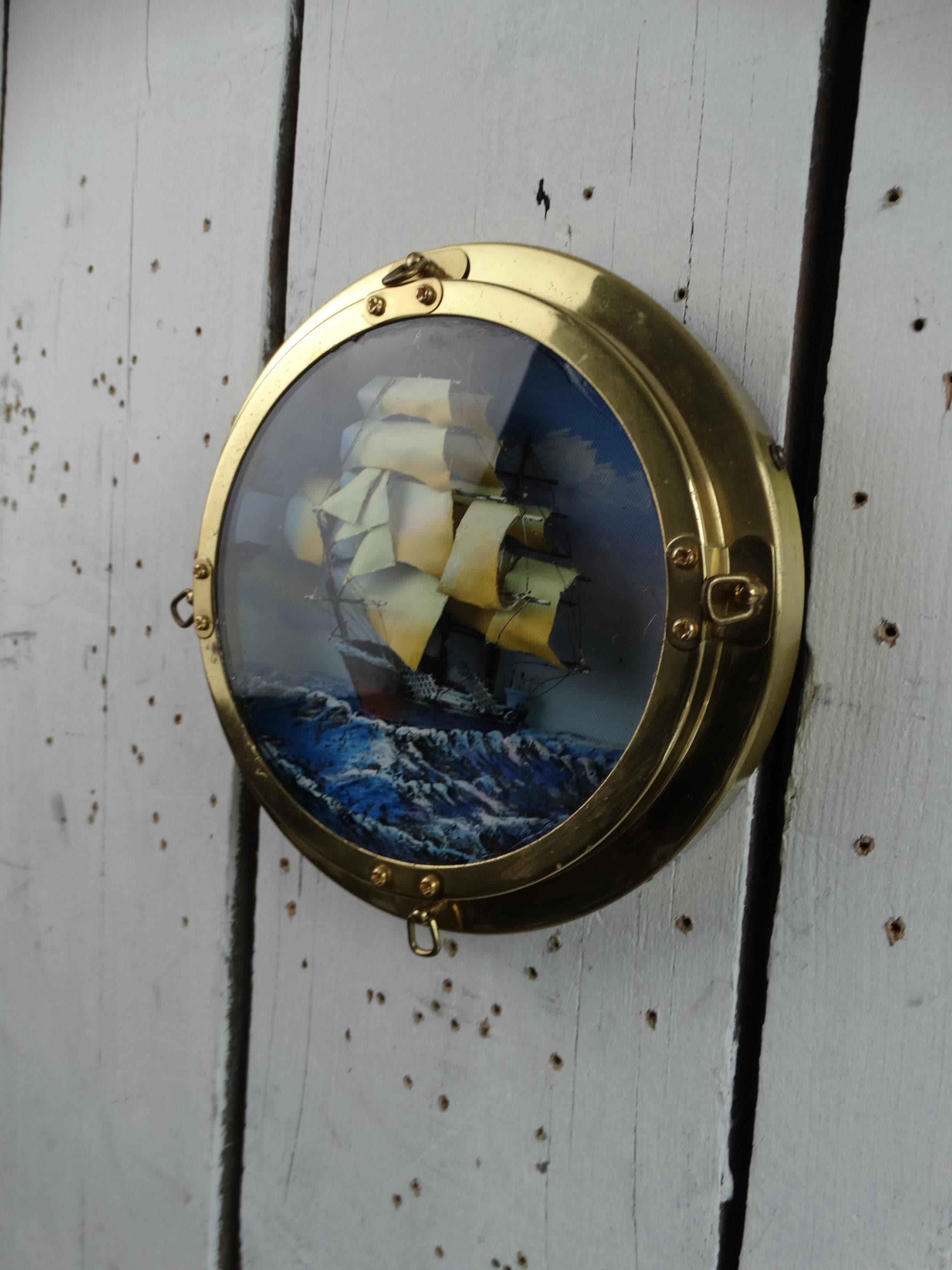 Diorama of a sailing ship. This sailing ship is placed in a porthole behind glass.
