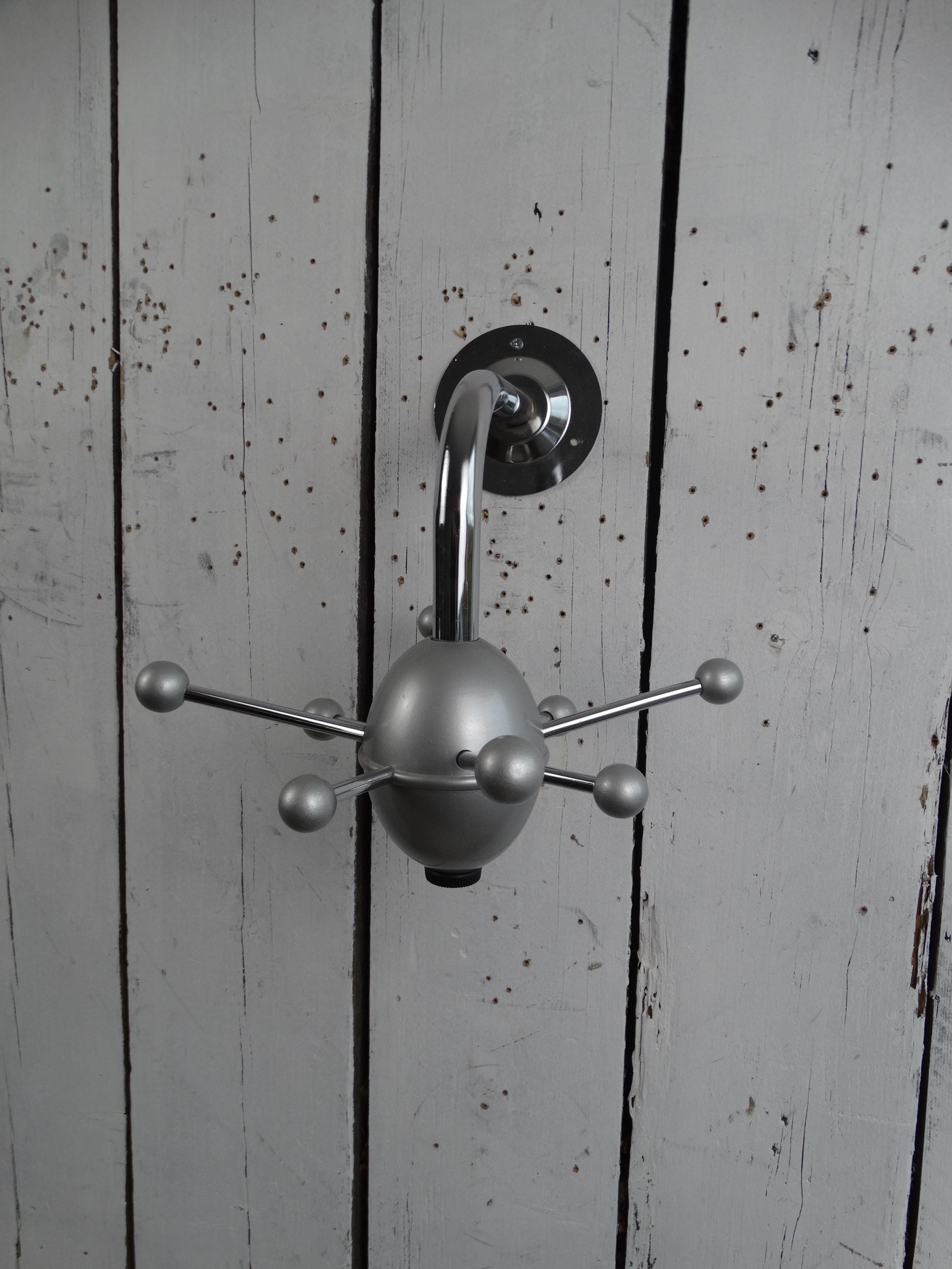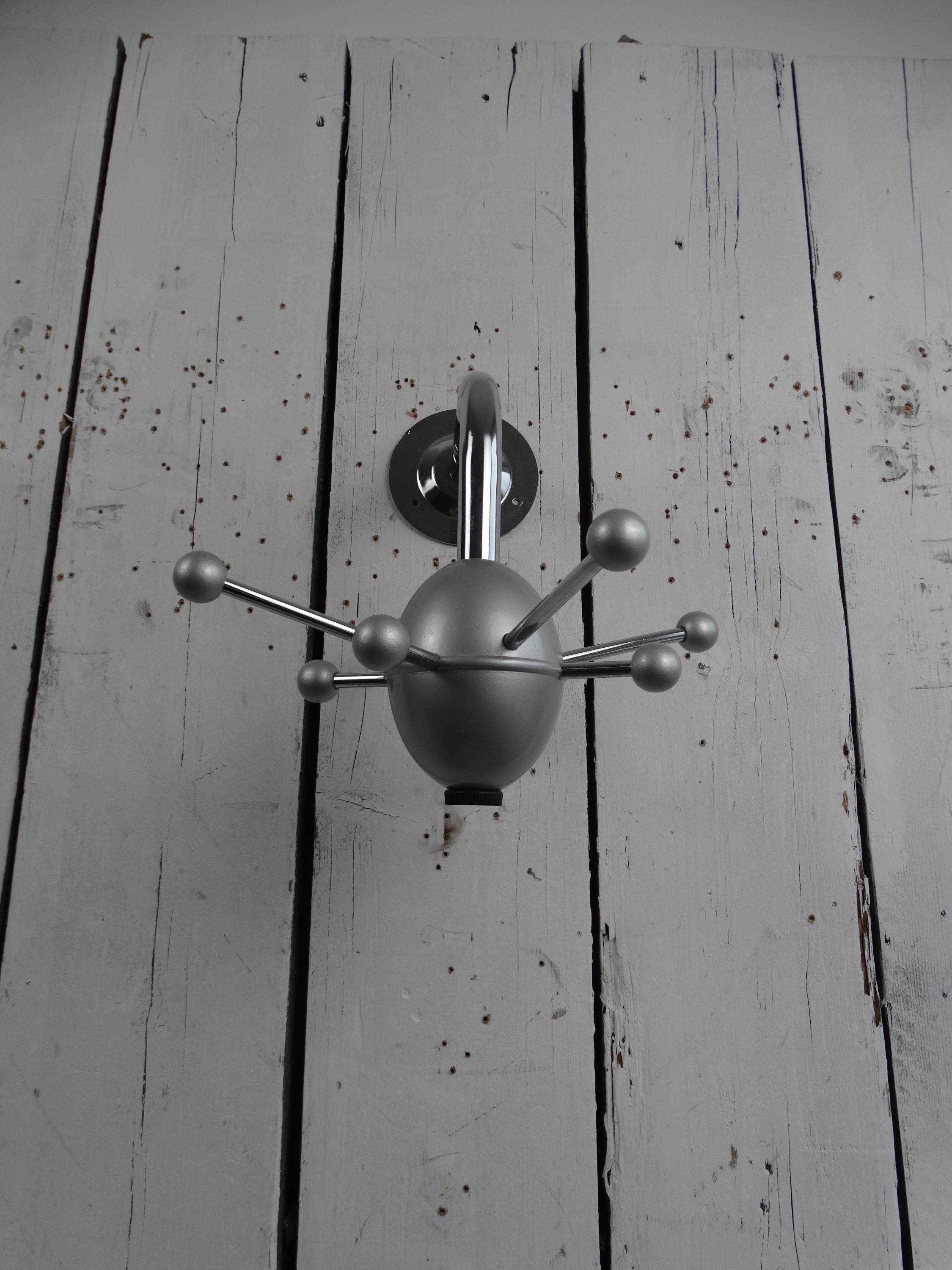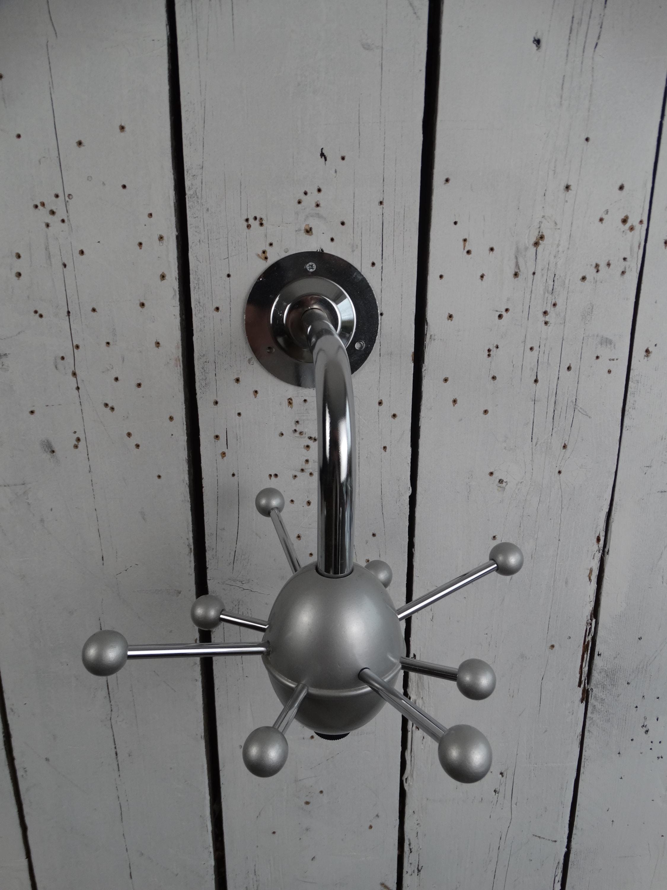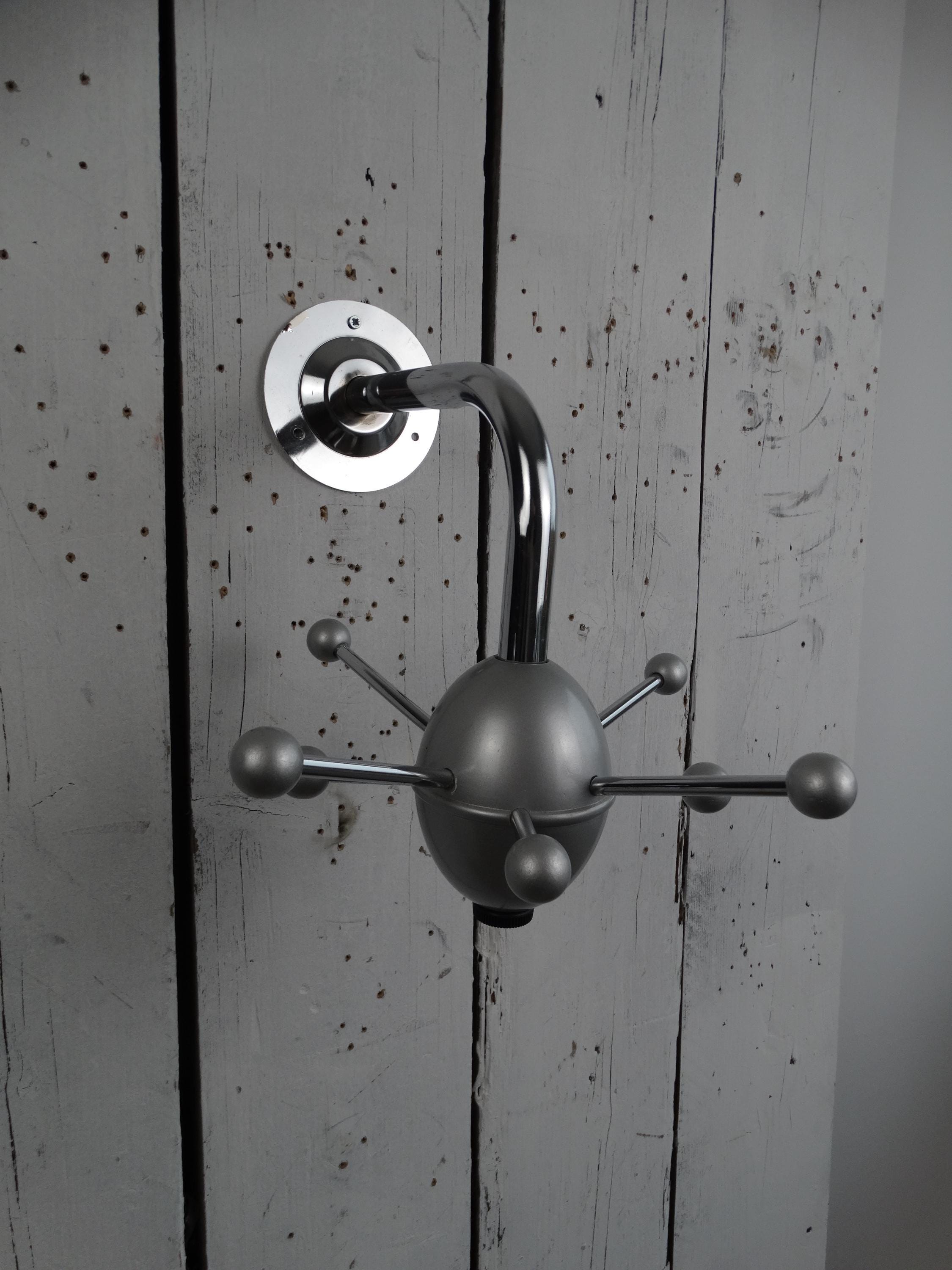 The coat hanger extends from t made from metal tubes with a large rotating sphere at the end, with colored sputnik-like racks.