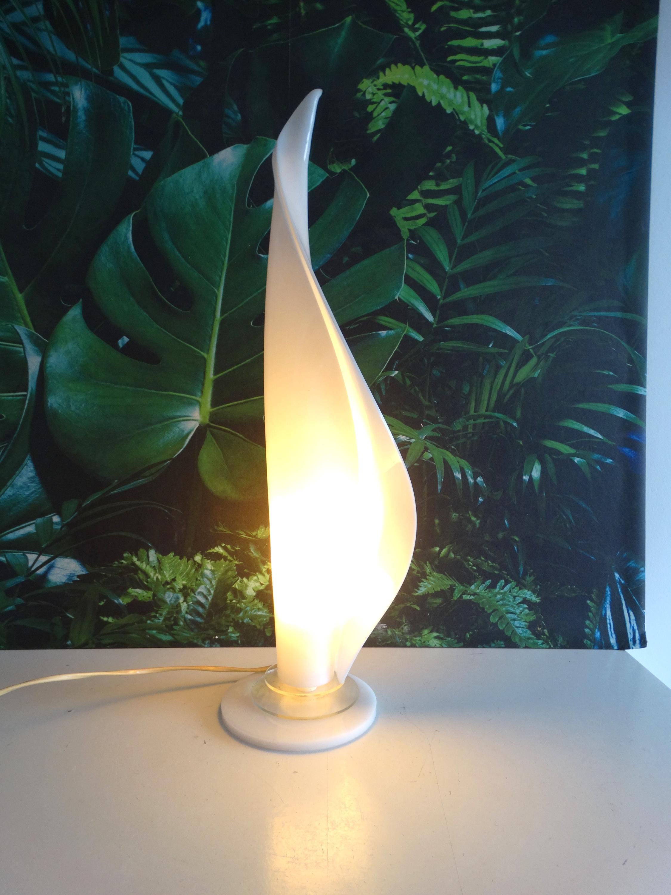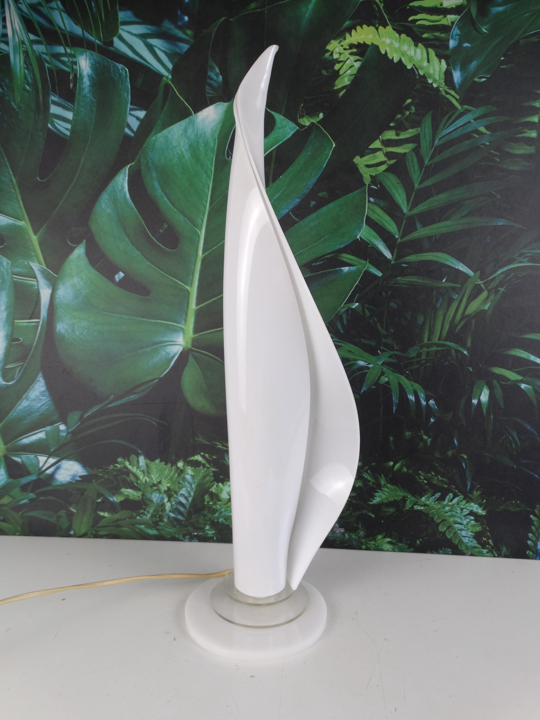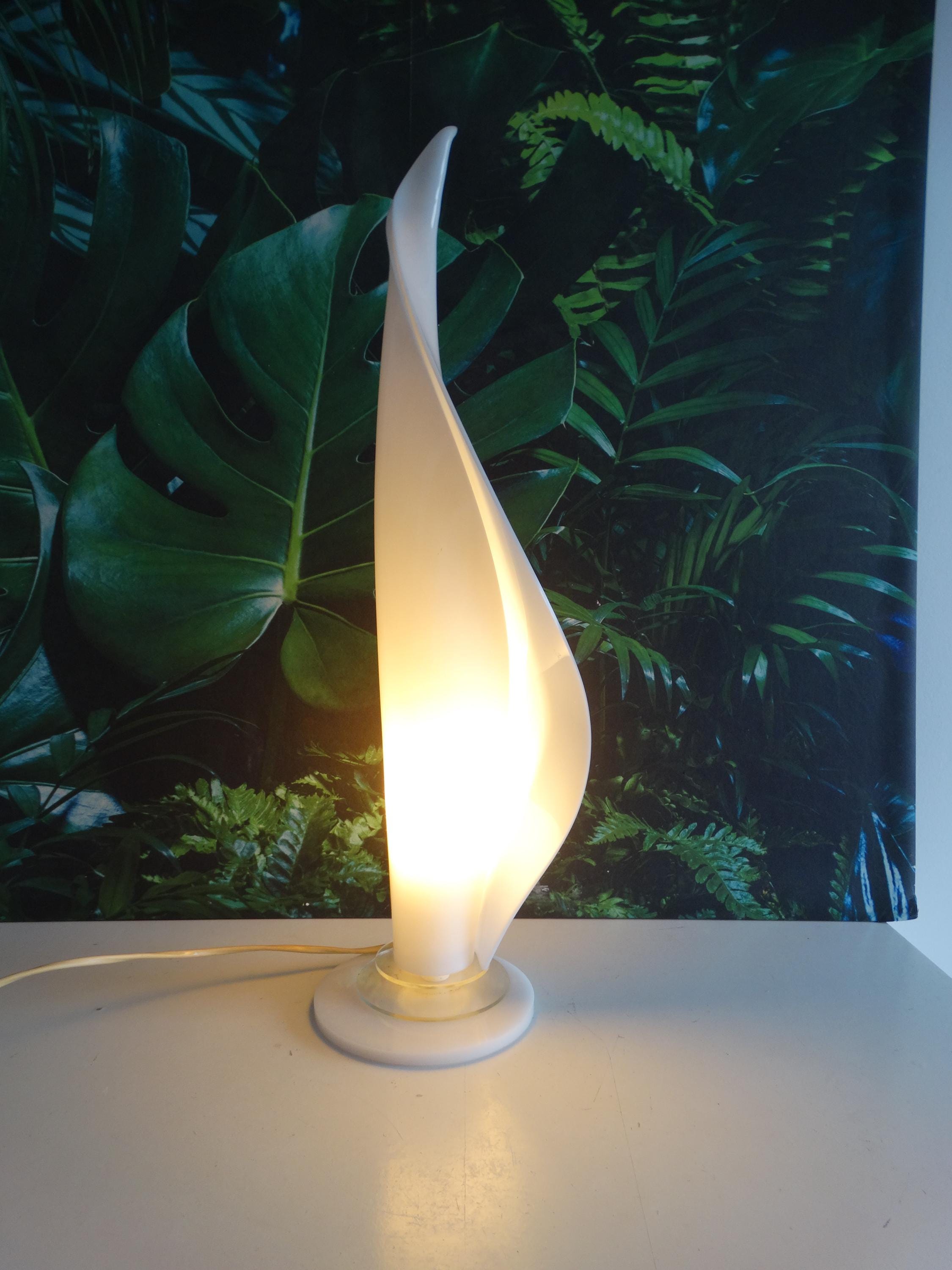 This modern table lamp, designed by Wout Wessemius, features a unique flame design. Crafted from high-quality plexiglass, it has a sleek and contemporary look. It radiates a warm glow, perfect for adding a touch of elegance to any room. Its striking shape makes it a statement piece in any interior.