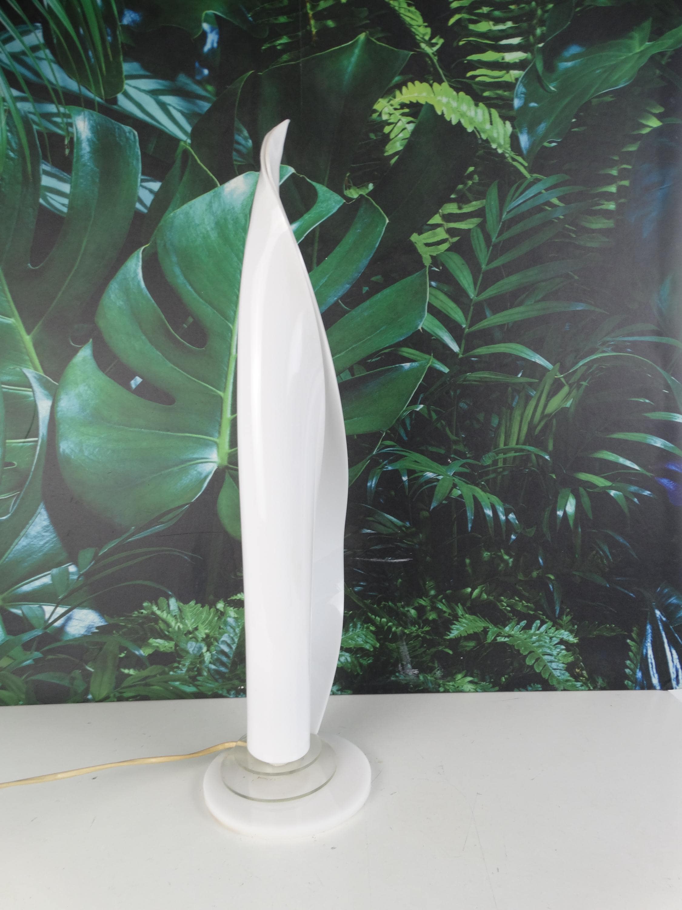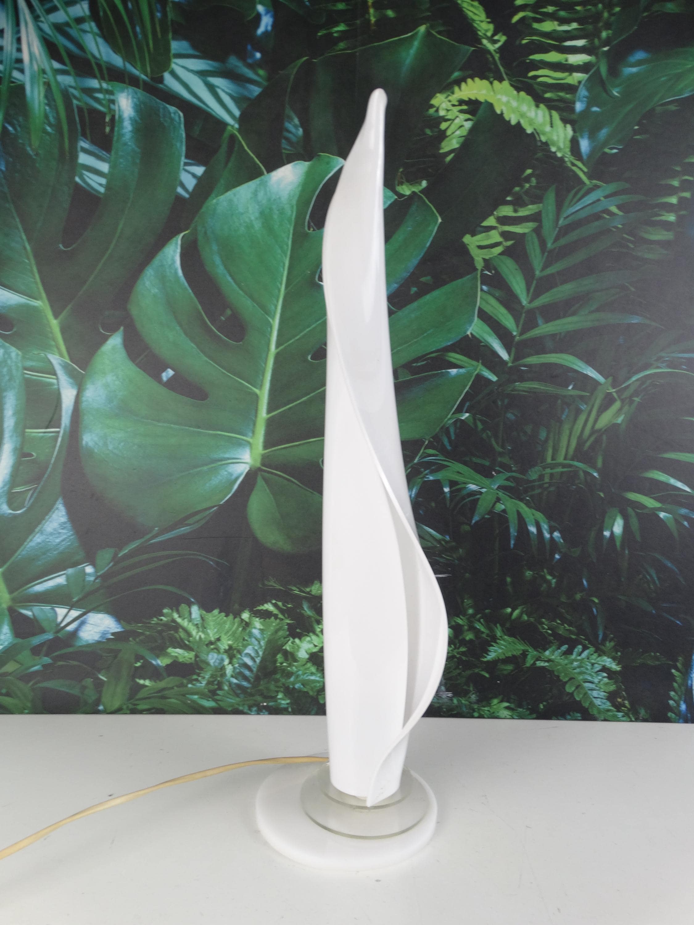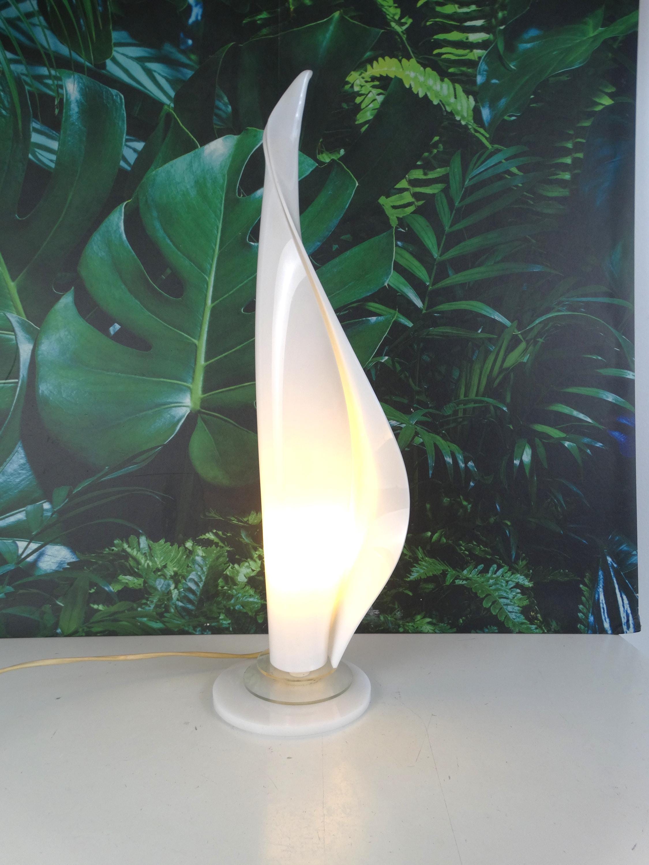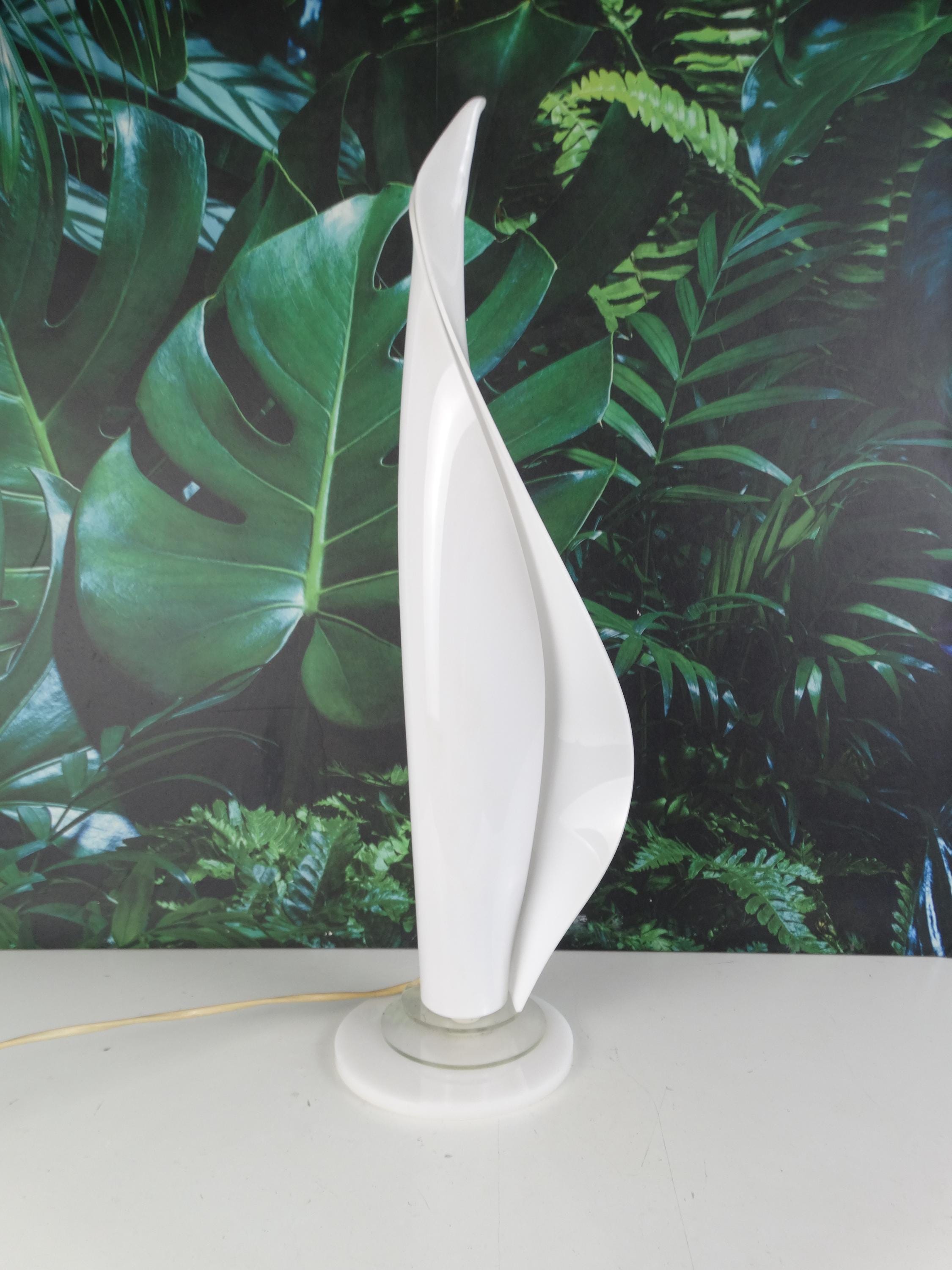 This modern table lamp, designed by Wout Wessemius, features a unique flame design. Crafted from high-quality plexiglass, it has a sleek and contemporary look. It radiates a warm glow, perfect for adding a touch of elegance to any room. Its striking shape makes it a statement piece in any interior.