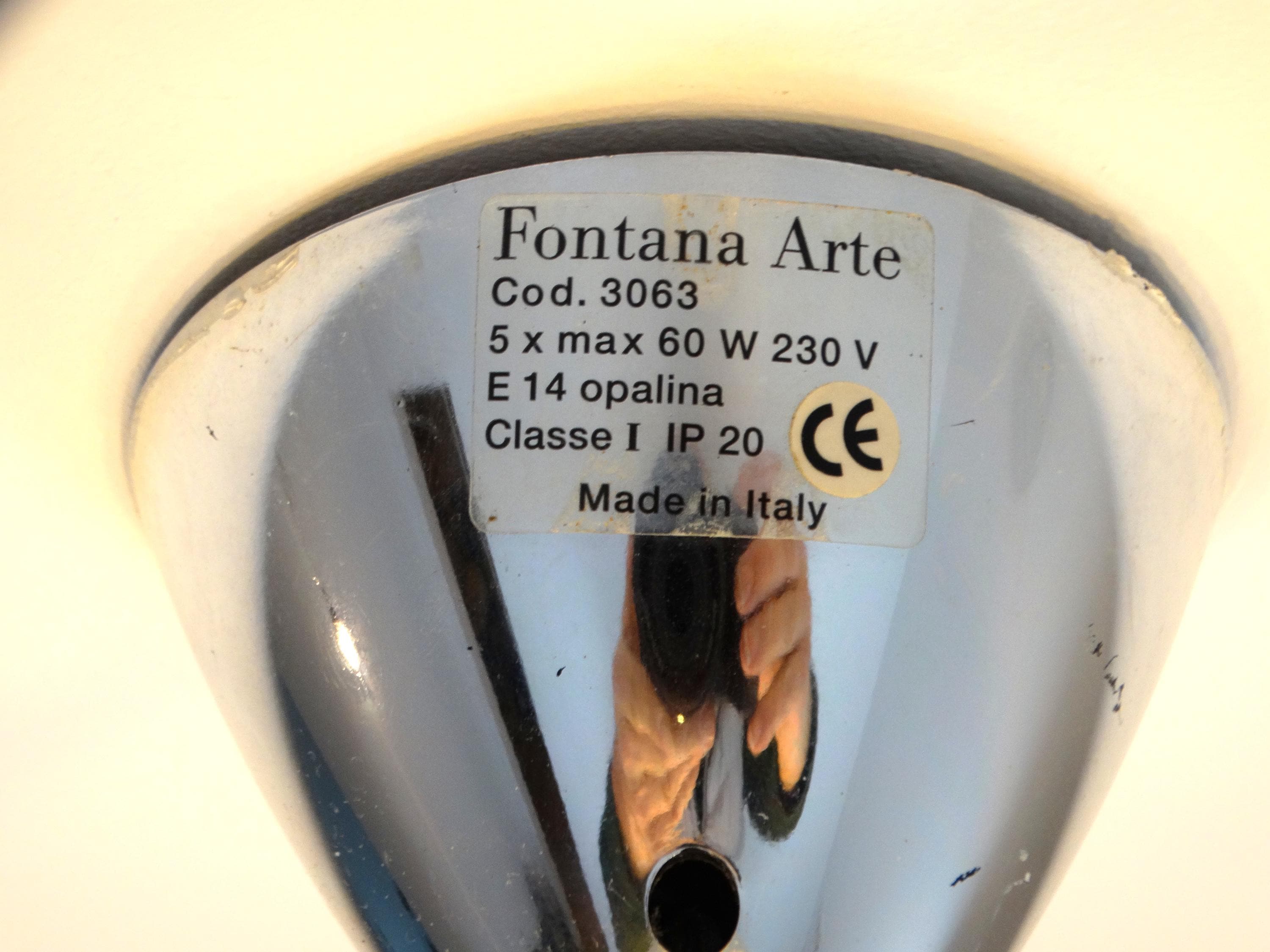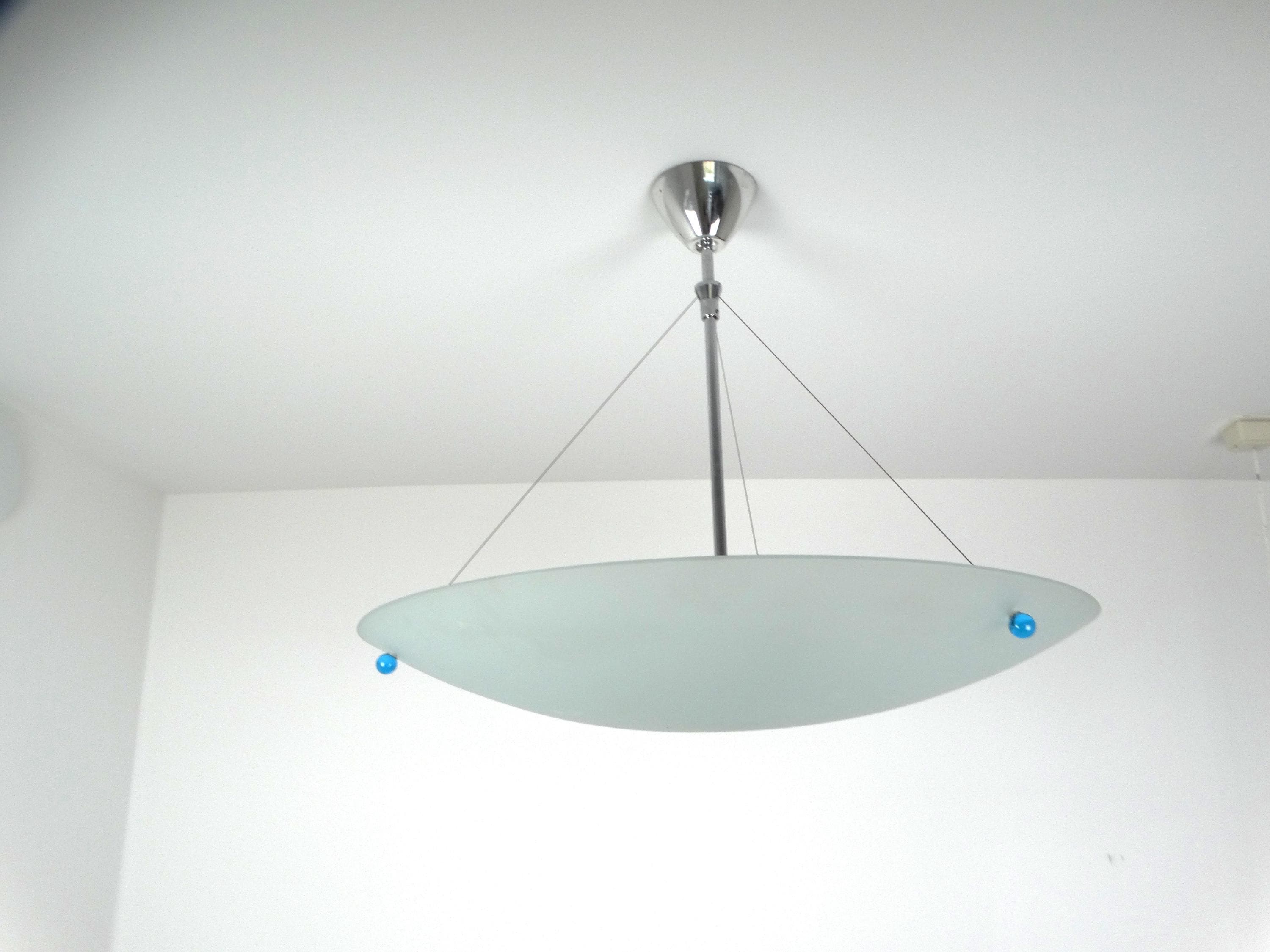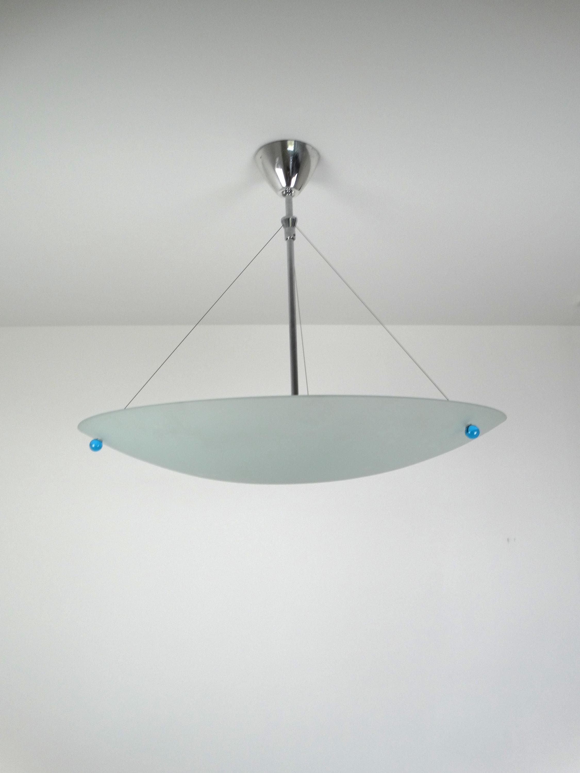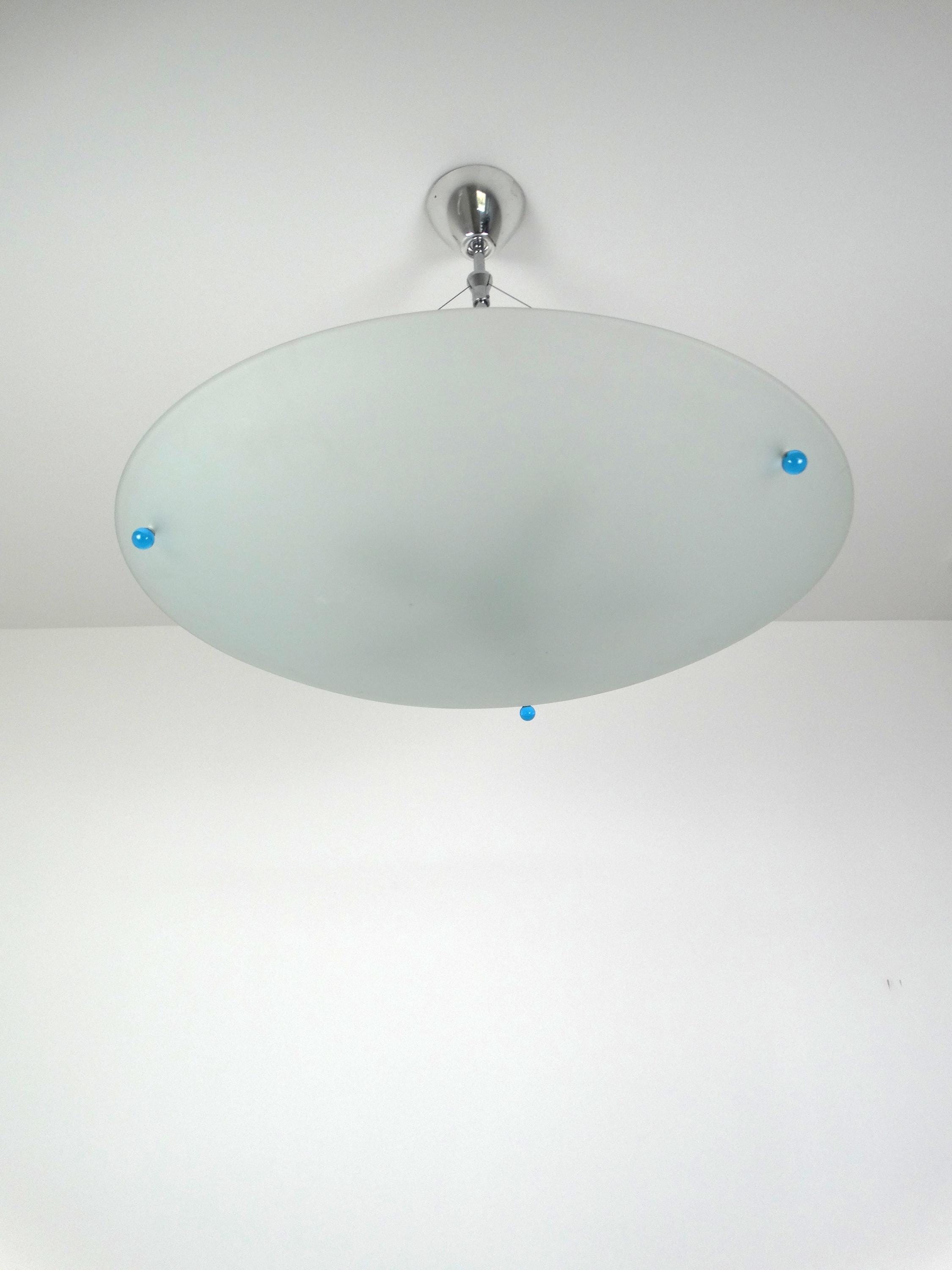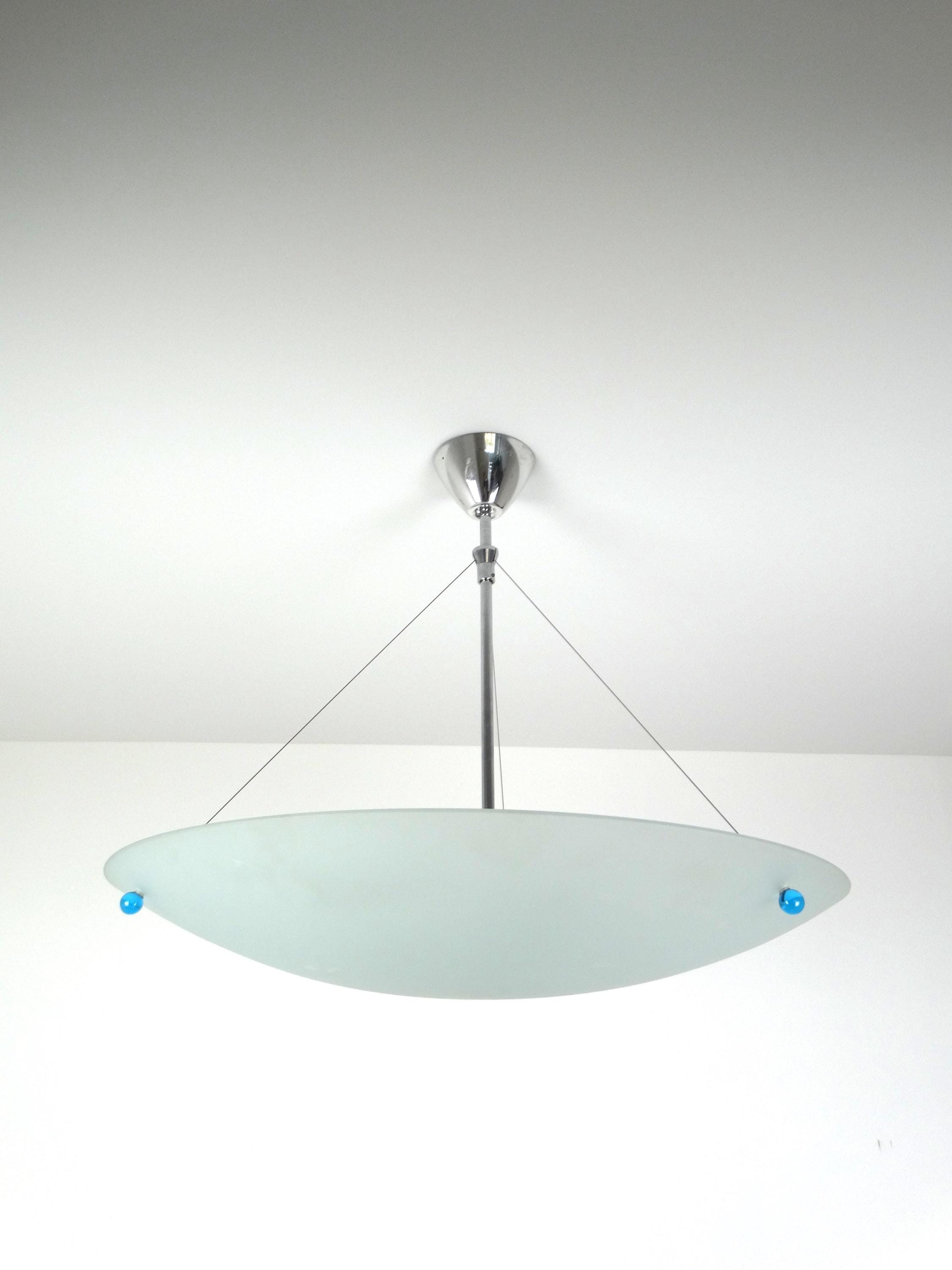 Vintage Italian pendant lamp with a large frosted glass shade suspended by three blue glass balls on a nickel frame / Made in Italy by Fontana Arte, circa 1970