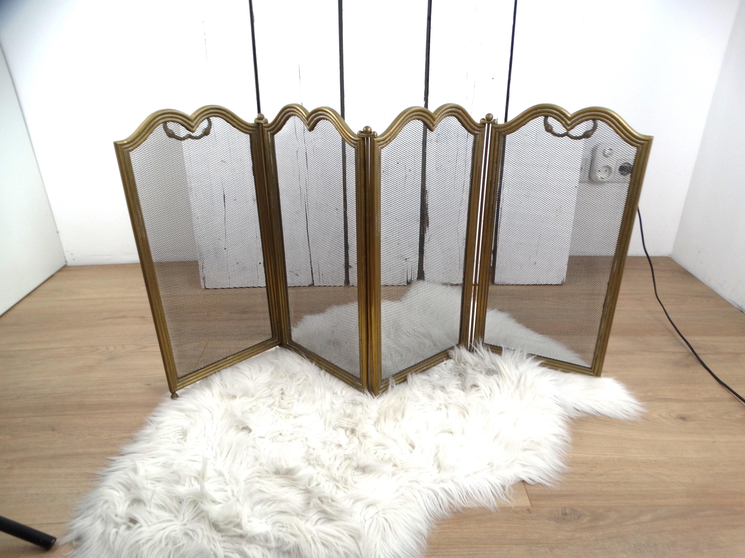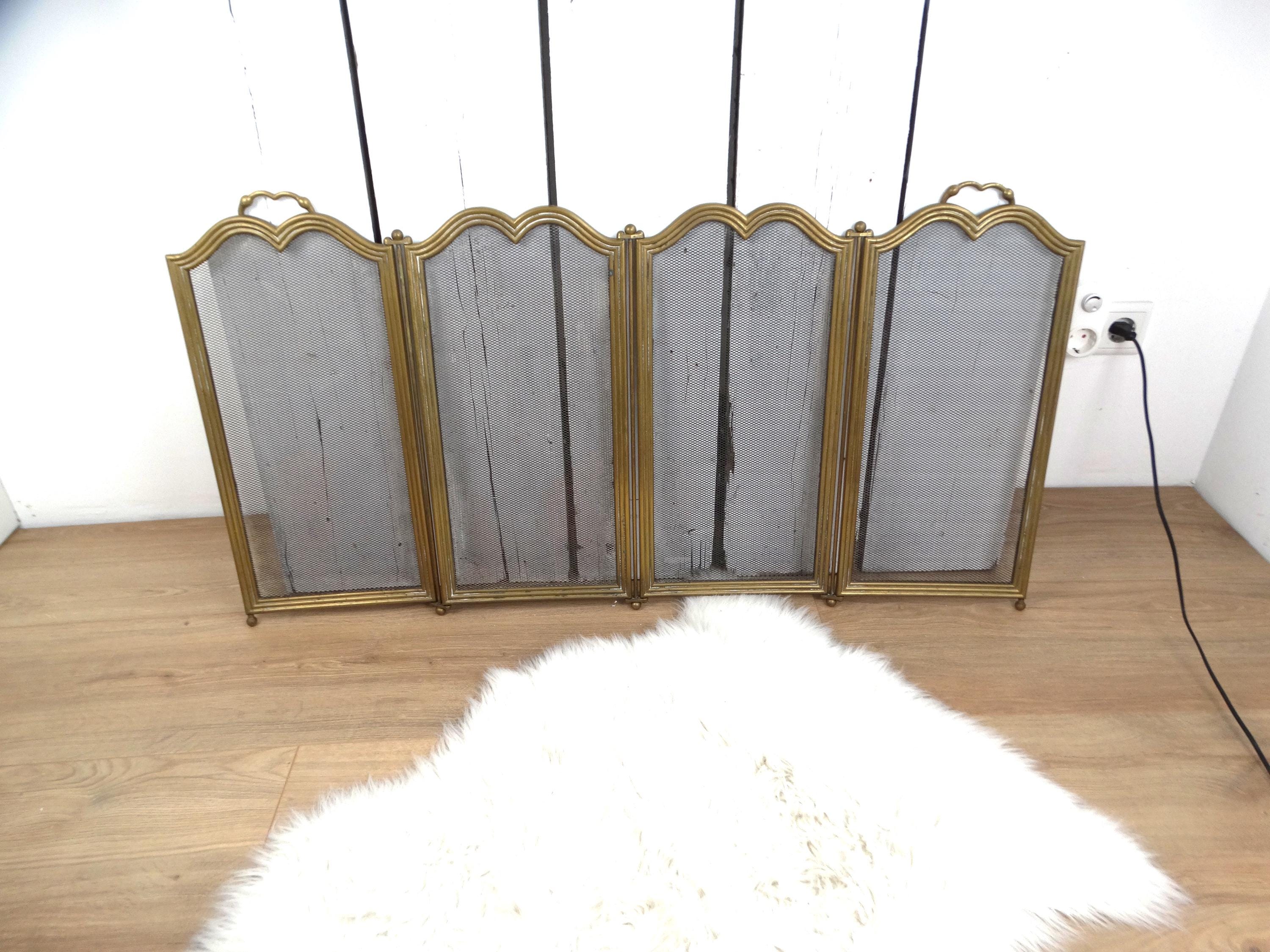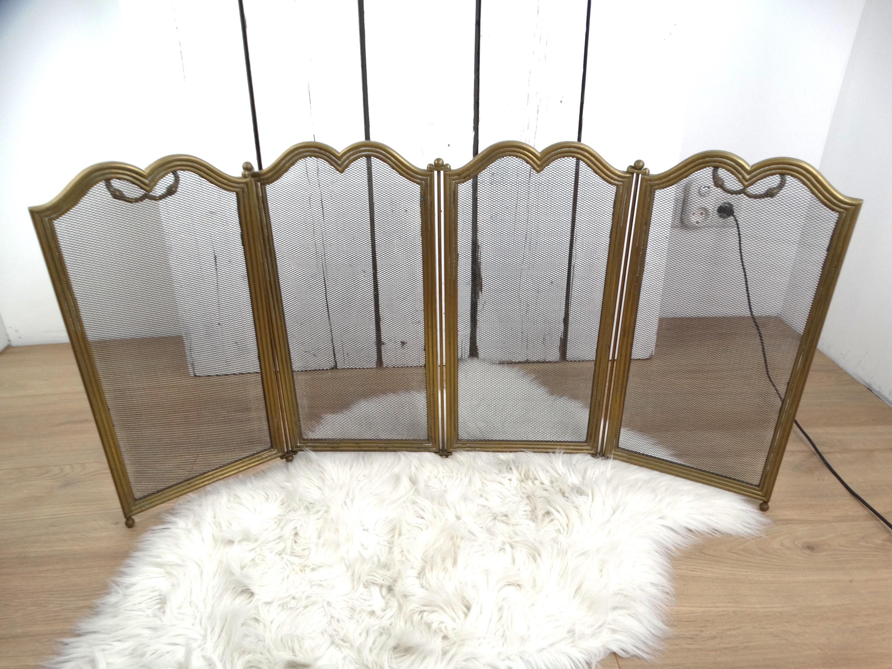 A very elegant antique copper fire screen. This intricately designed four-part screen is made of brass and metal. Made around 1930.