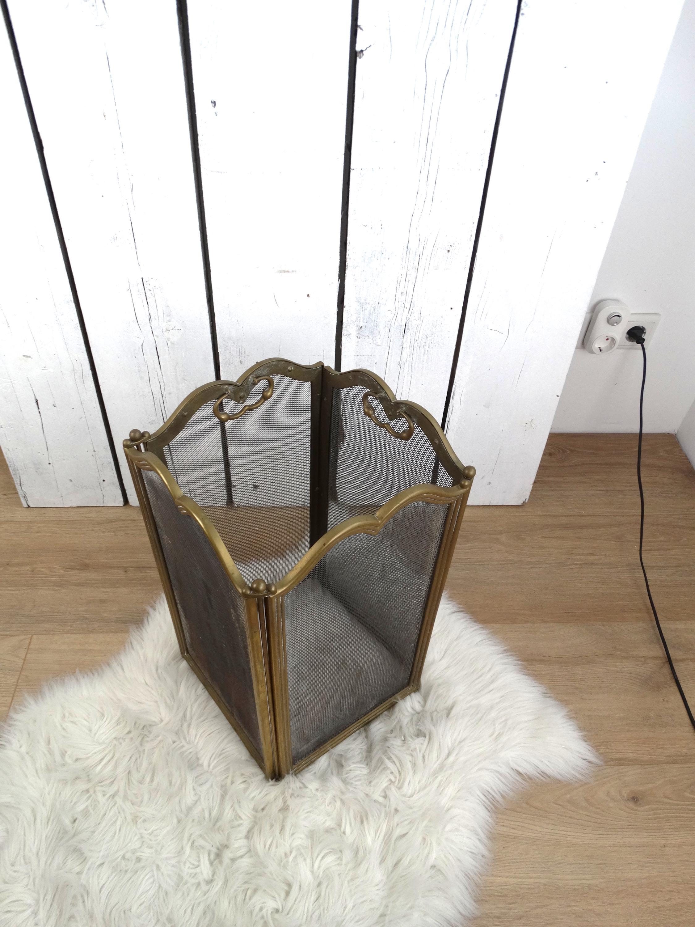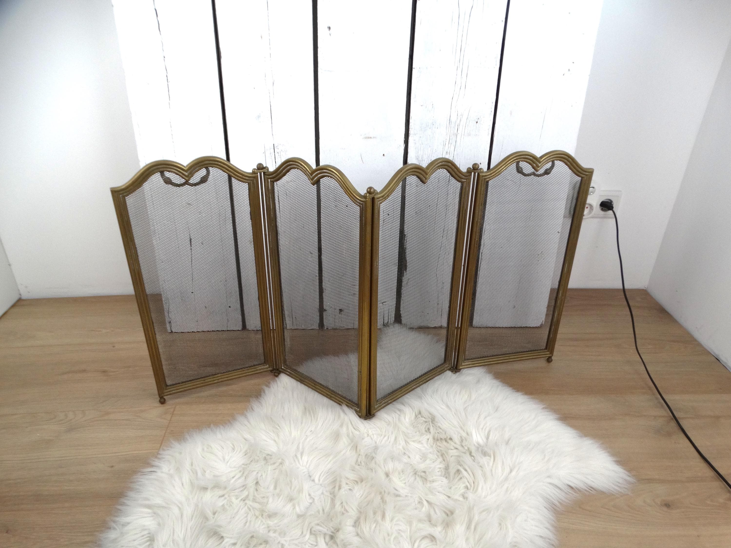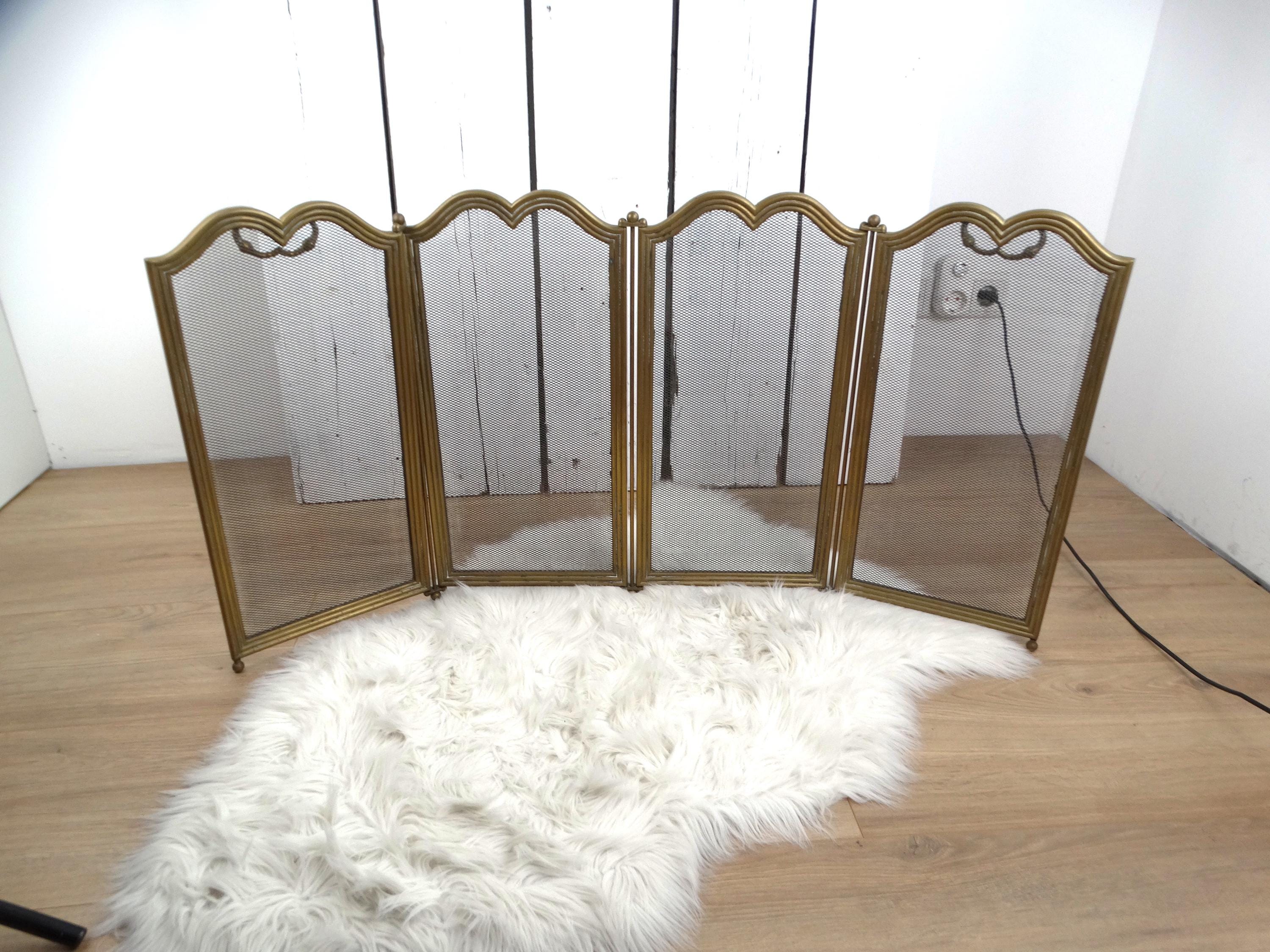 A very elegant antique copper fire screen. This intricately designed four-part screen is made of brass and metal. Made around 1930.