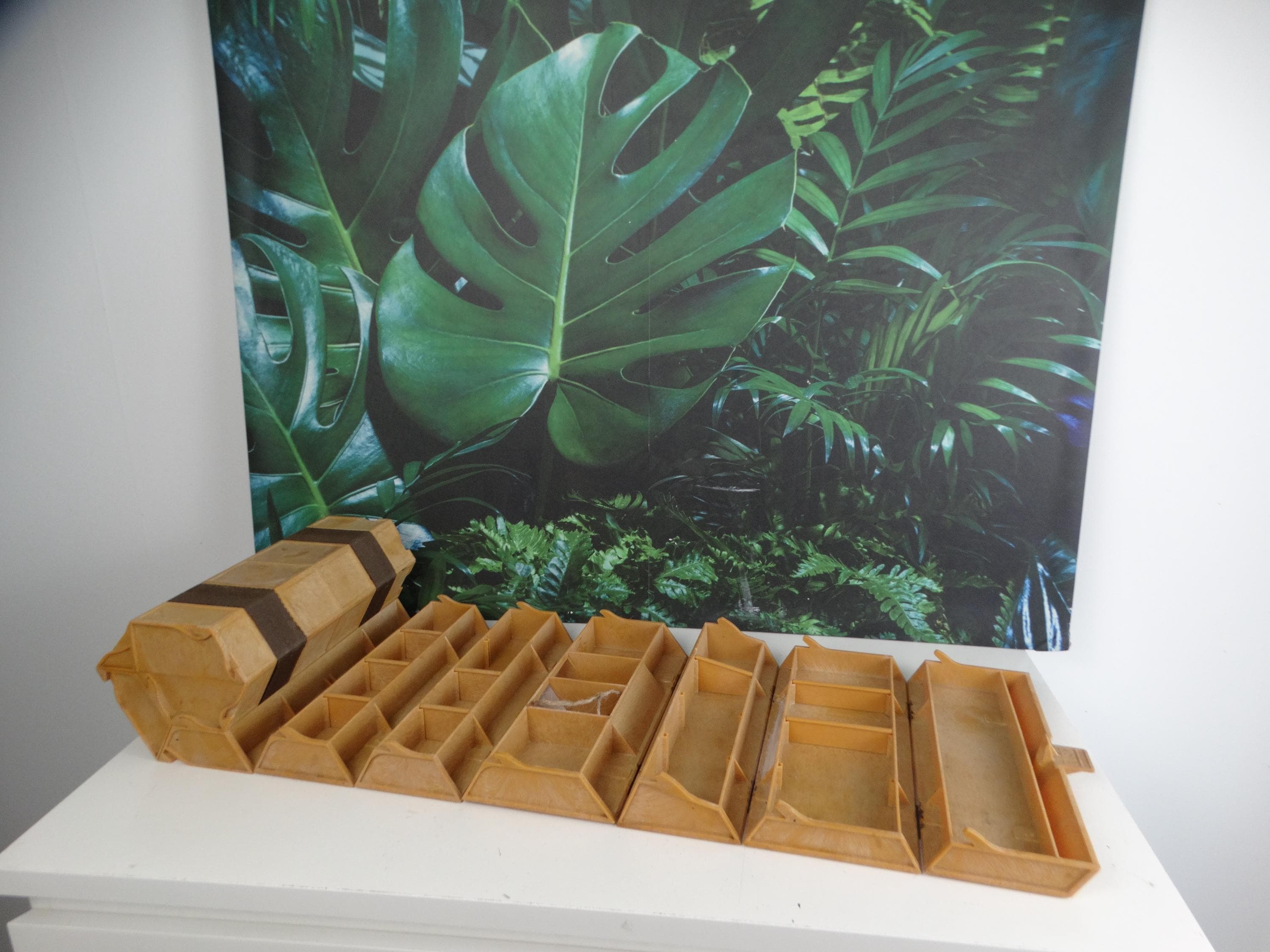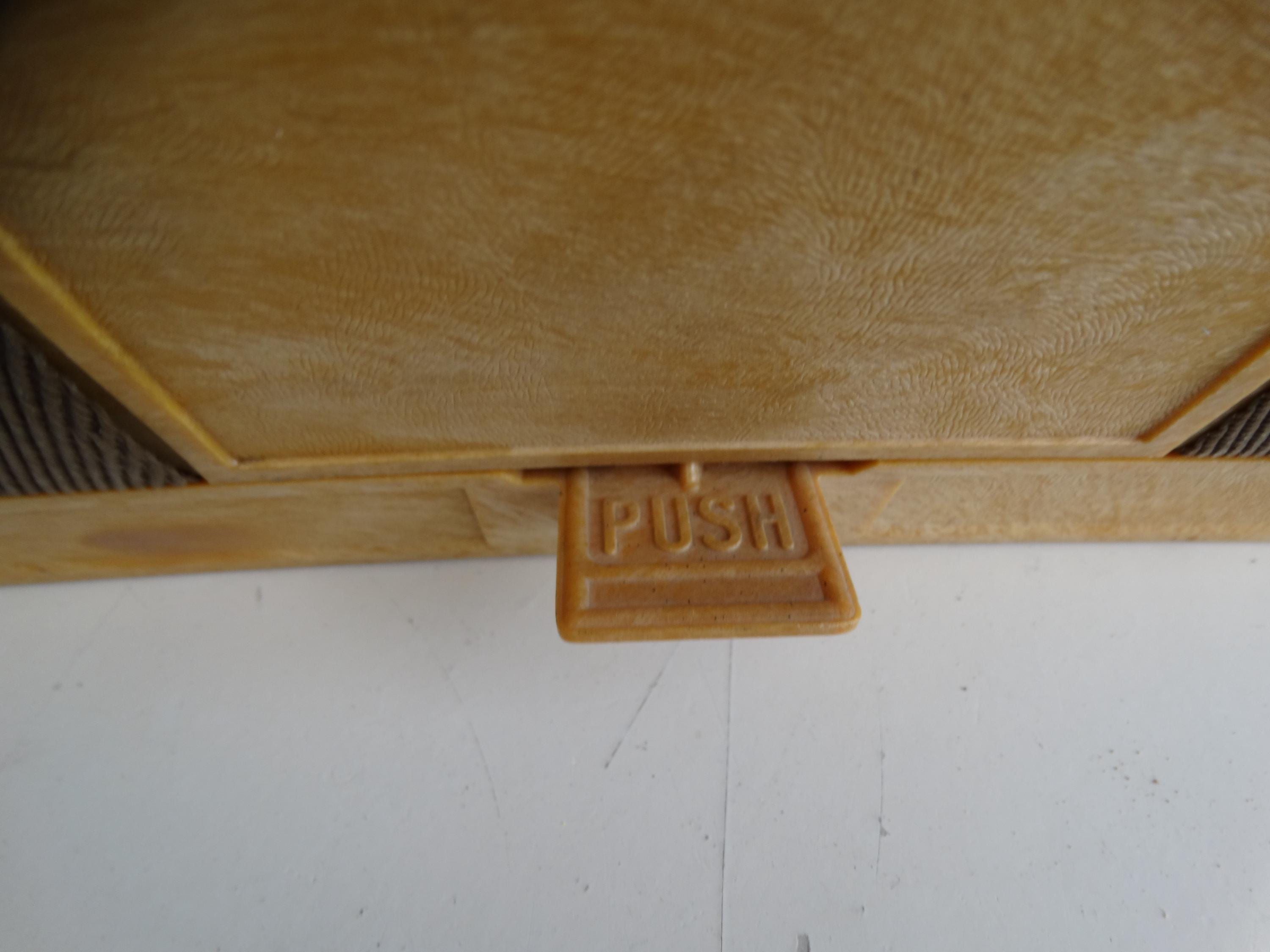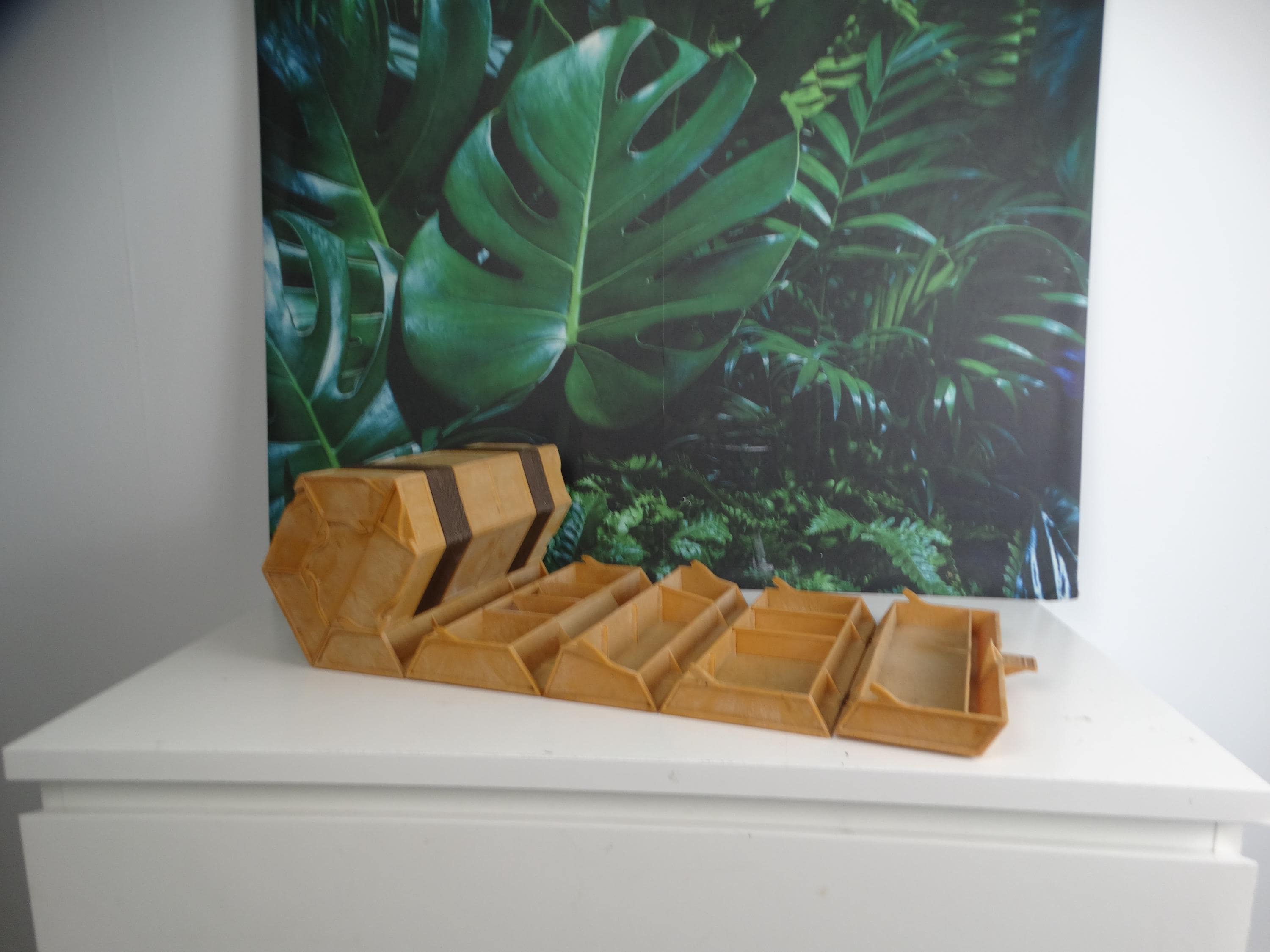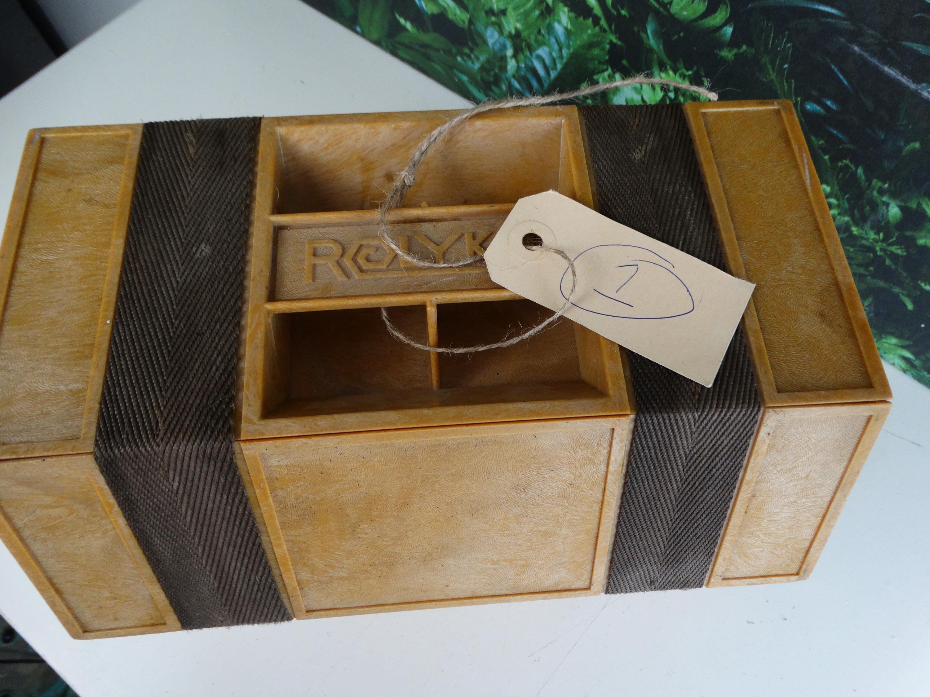 Here's a great Rolykit Roll-up Storage Box from the 1980s. It rolls out into this long strip of compartments. It's brown. Other than that, it's in good condition and has a handle for easy carrying. This piece would help keep all your goodies organized! In excellent condition!