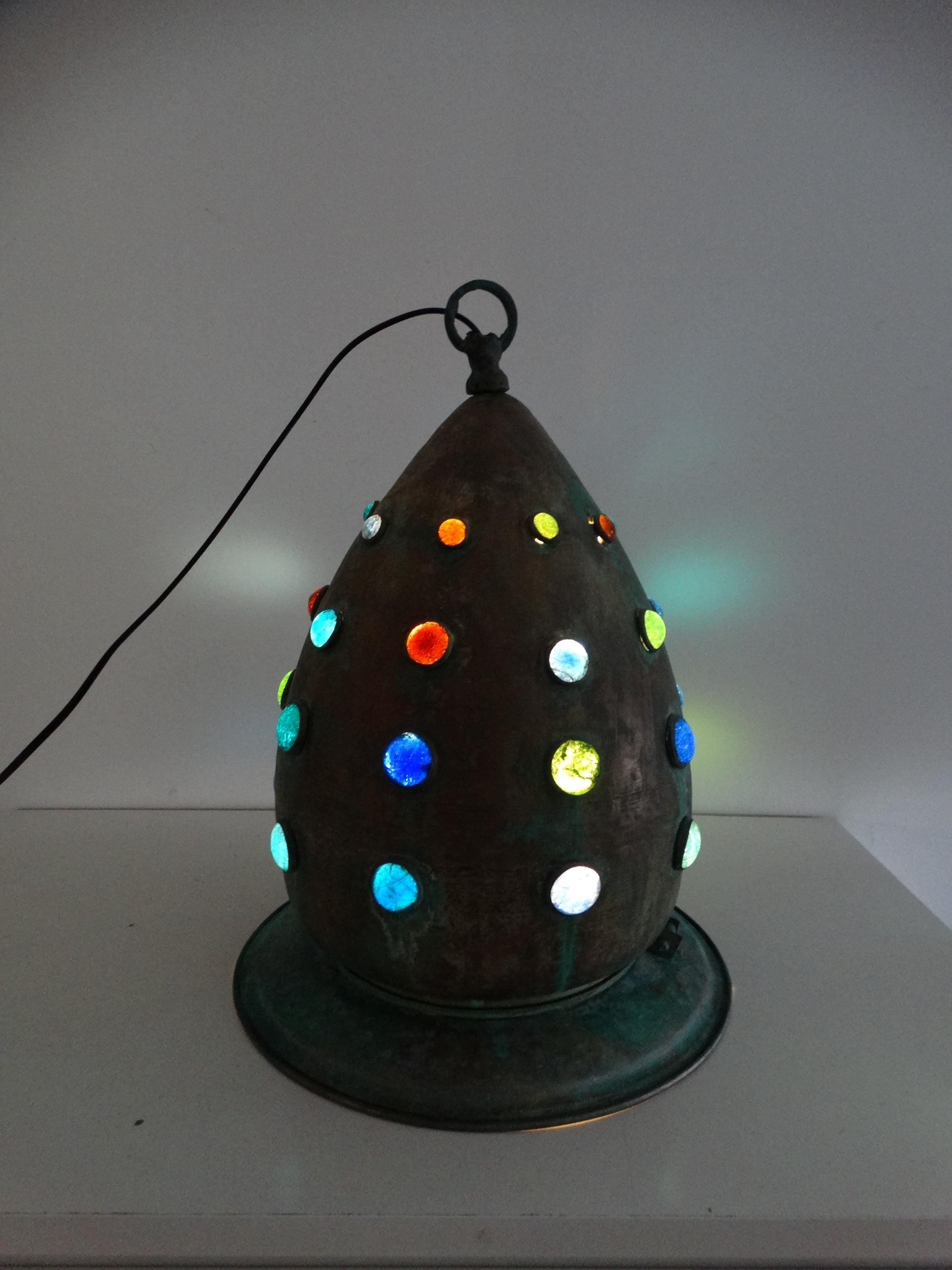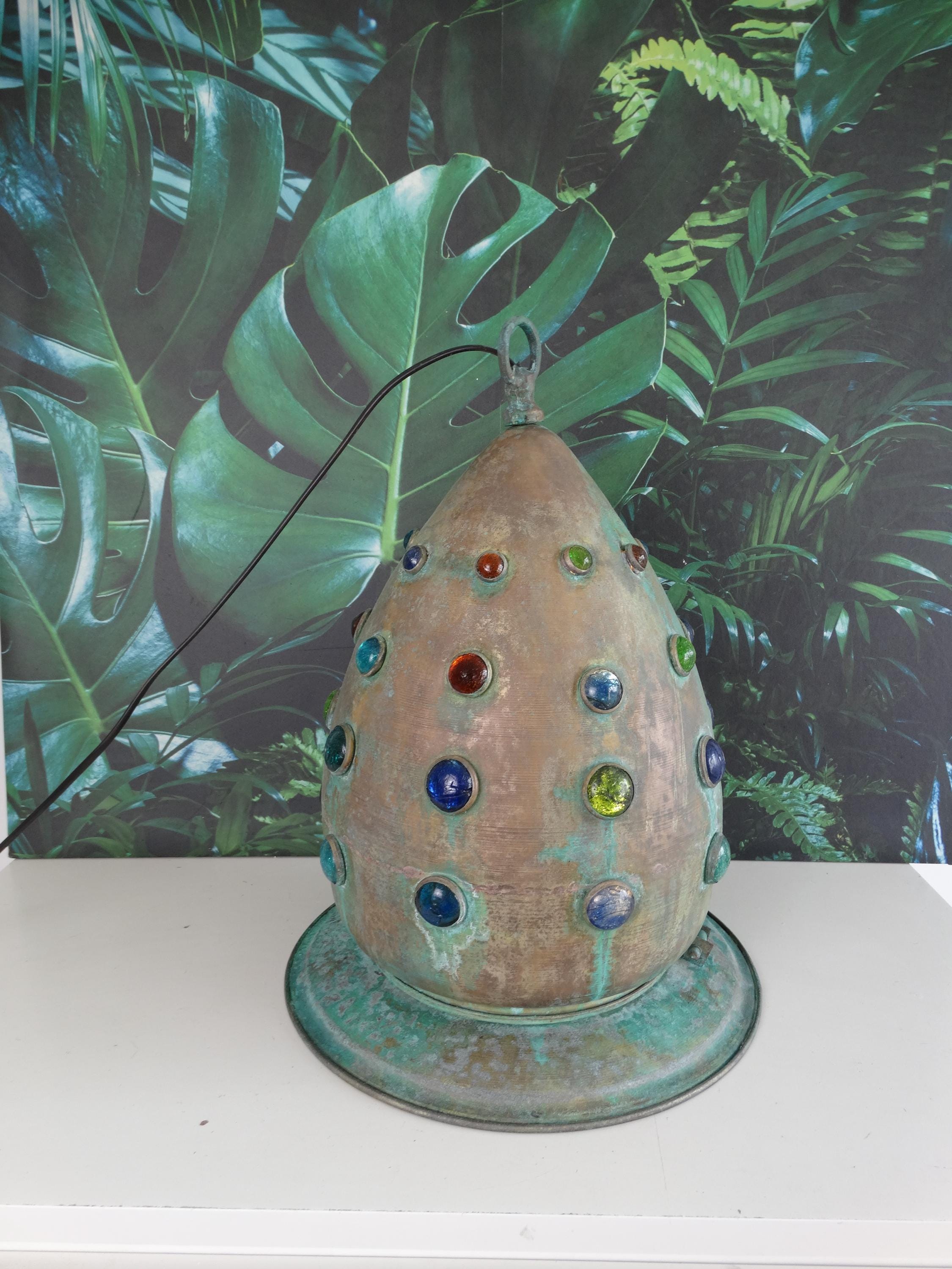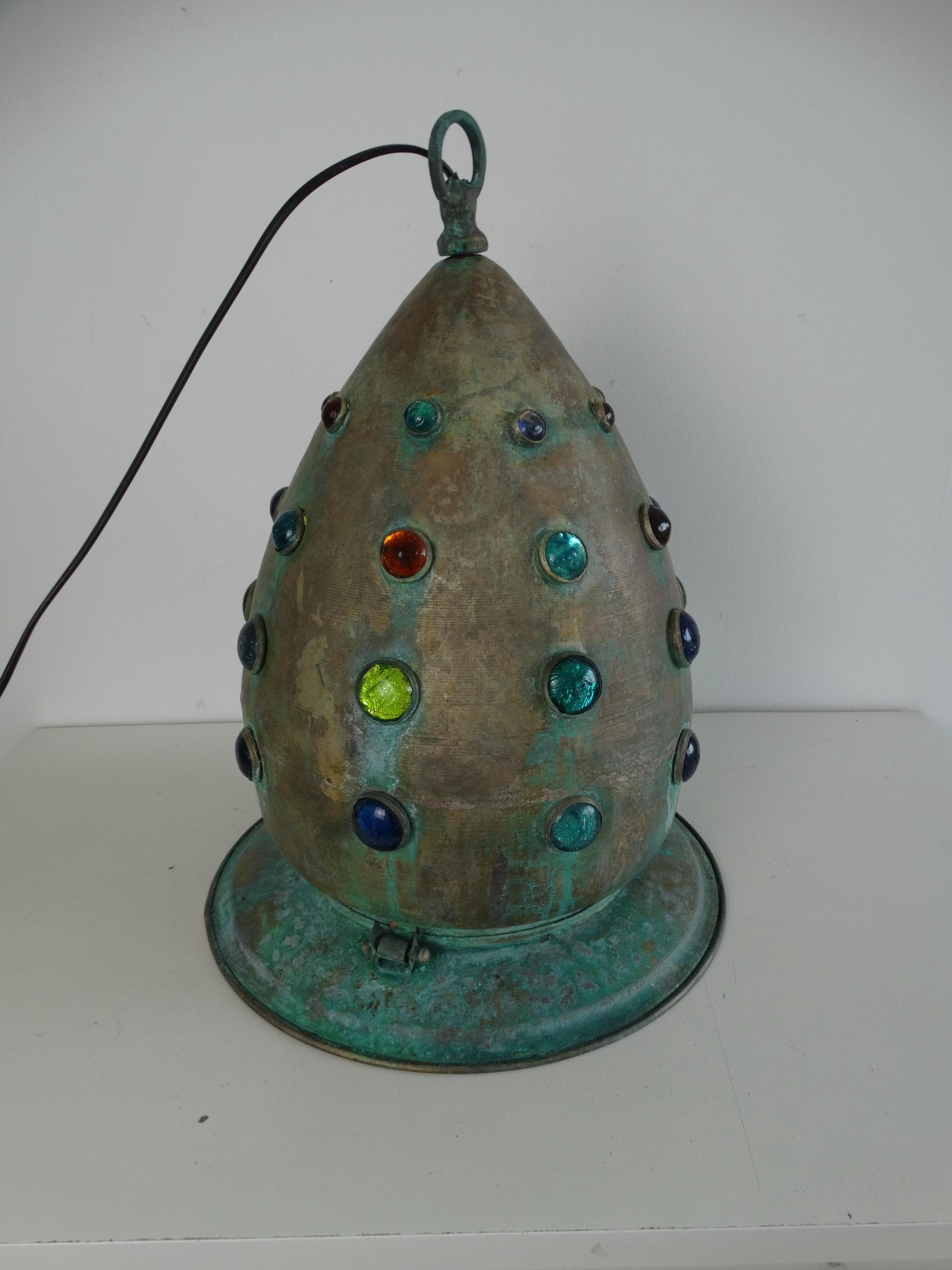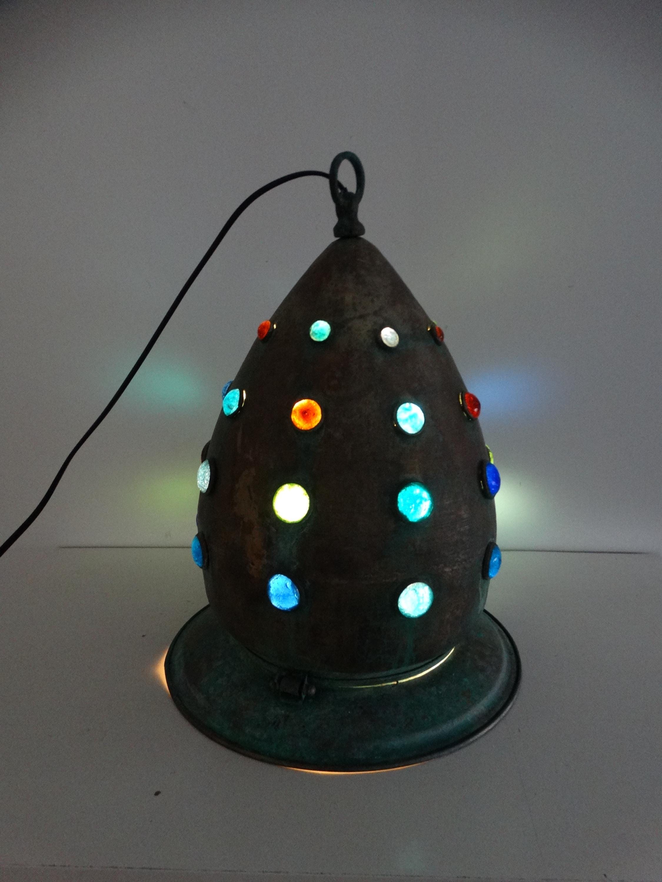 Mid-century lamp with various colored glass eyes in the copper shade.