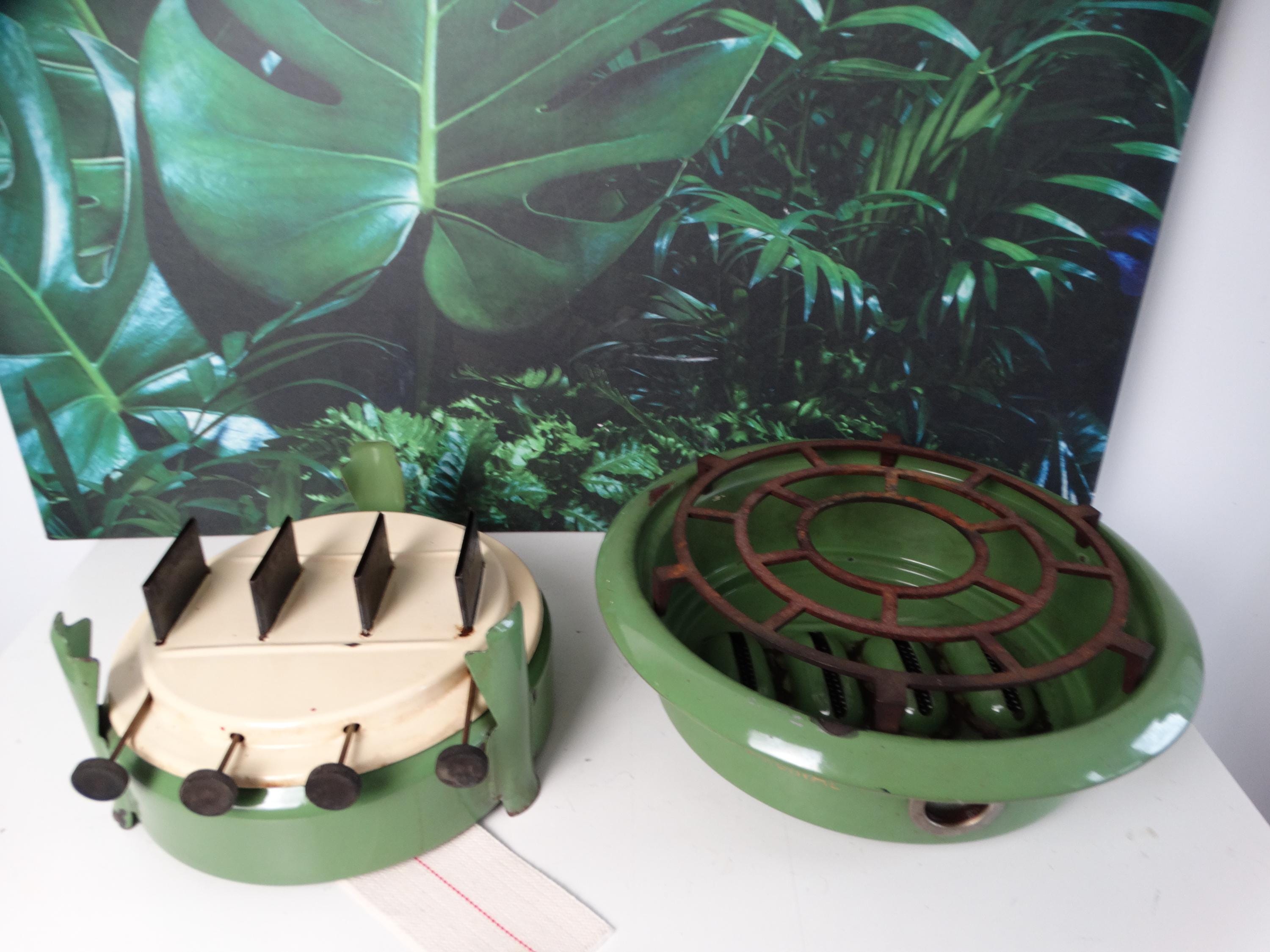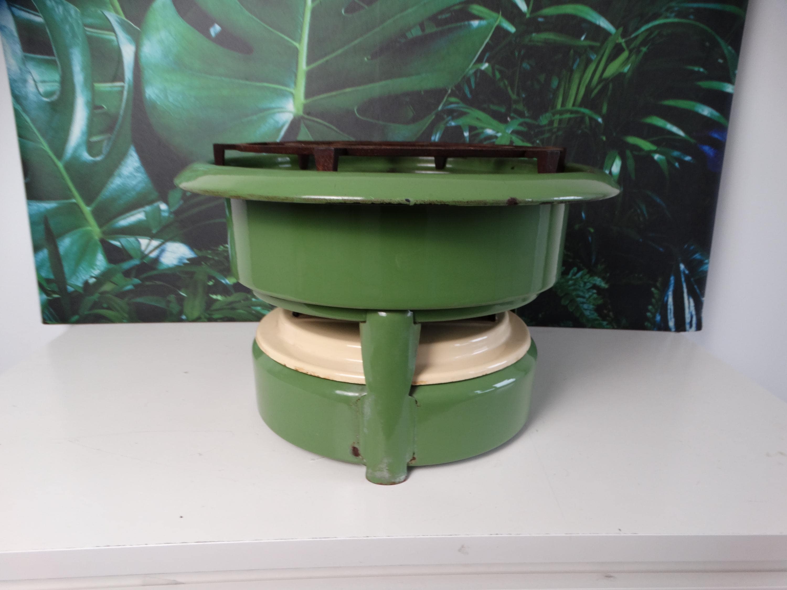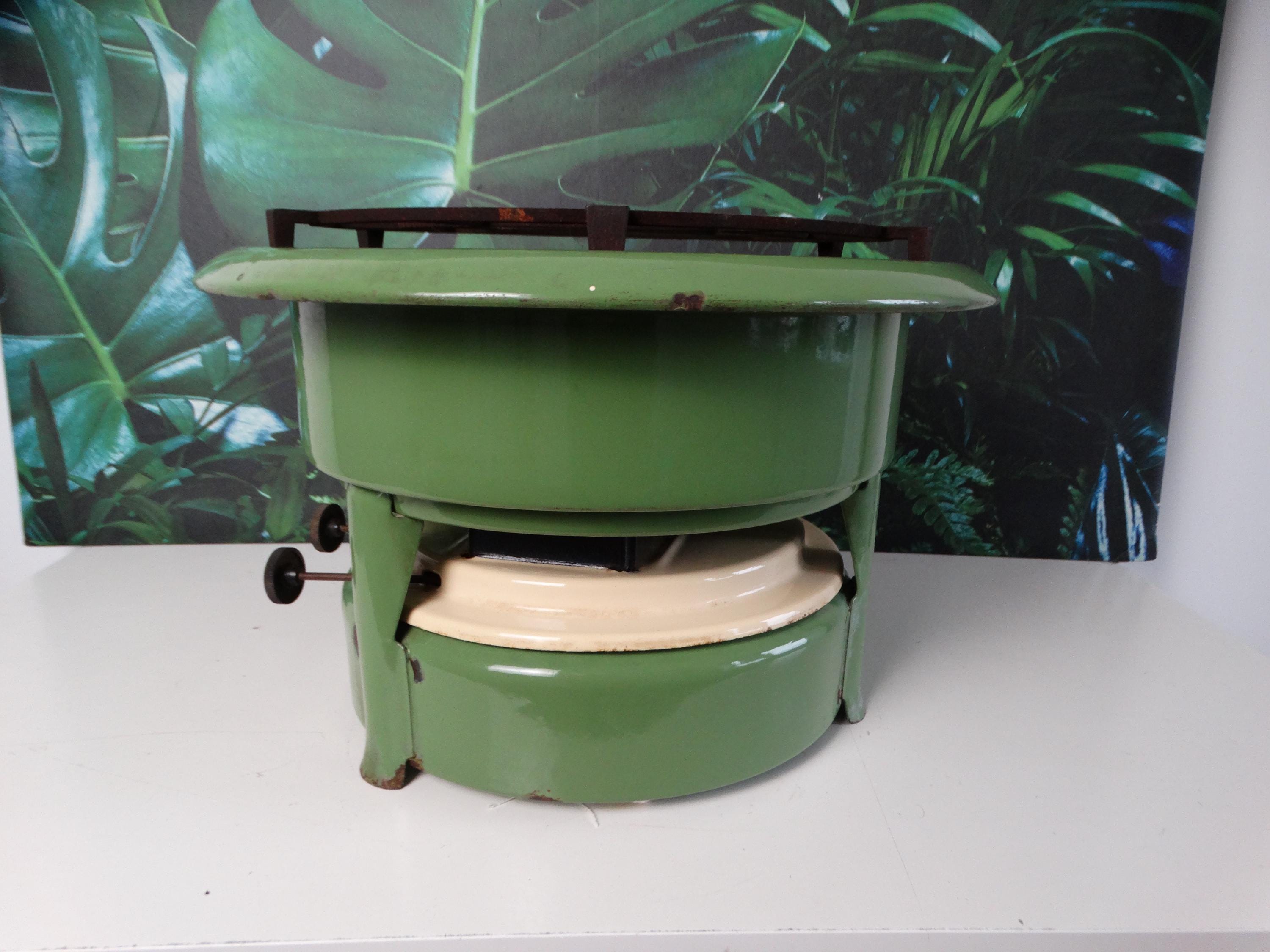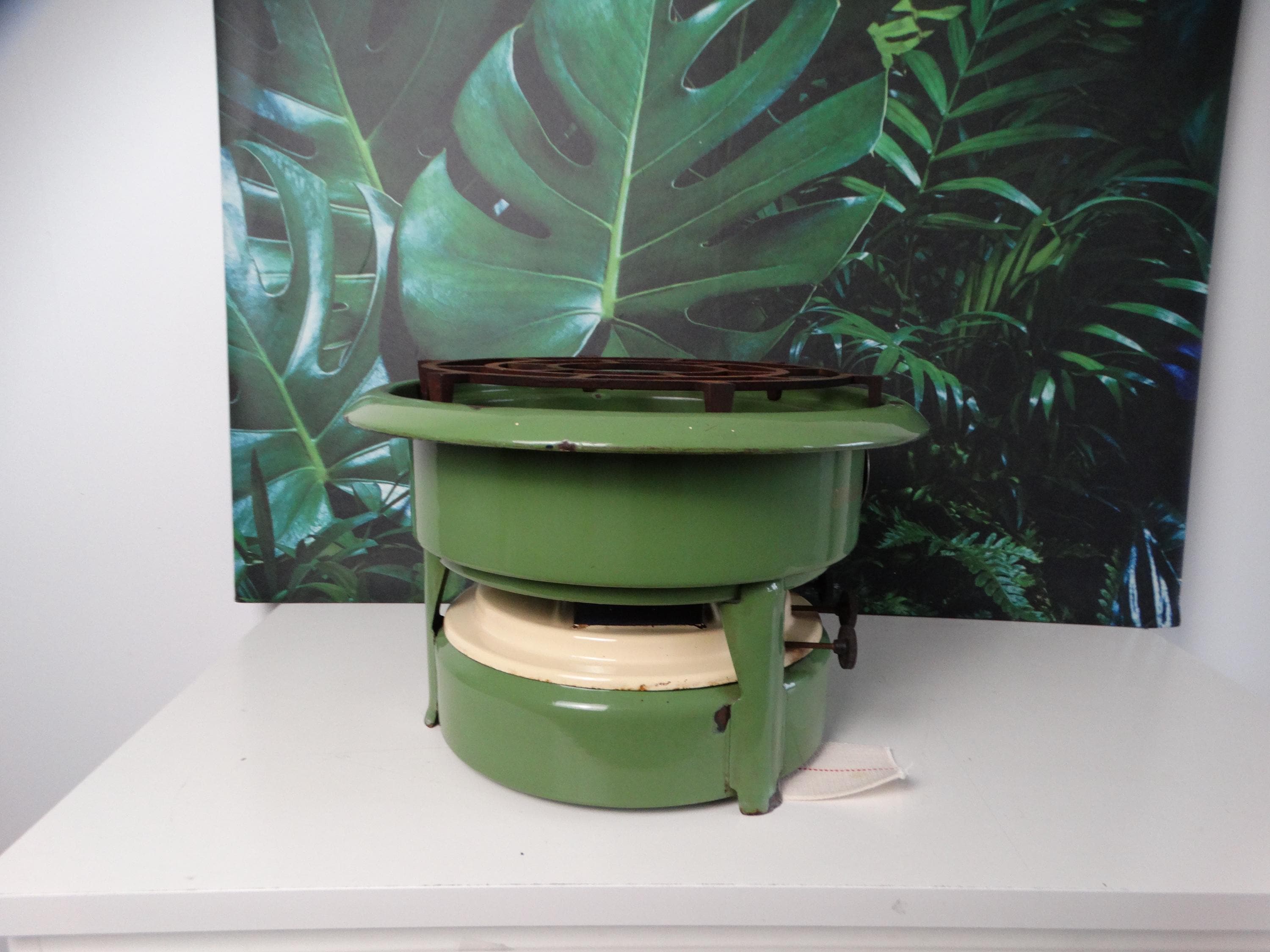 The reservoir is covered by a wick holder with a slot in which the wick can be moved up and down using a rotating mechanism. A cup with a stand is placed on top of the wick holder, on which the coffee pot or teapot can be placed.