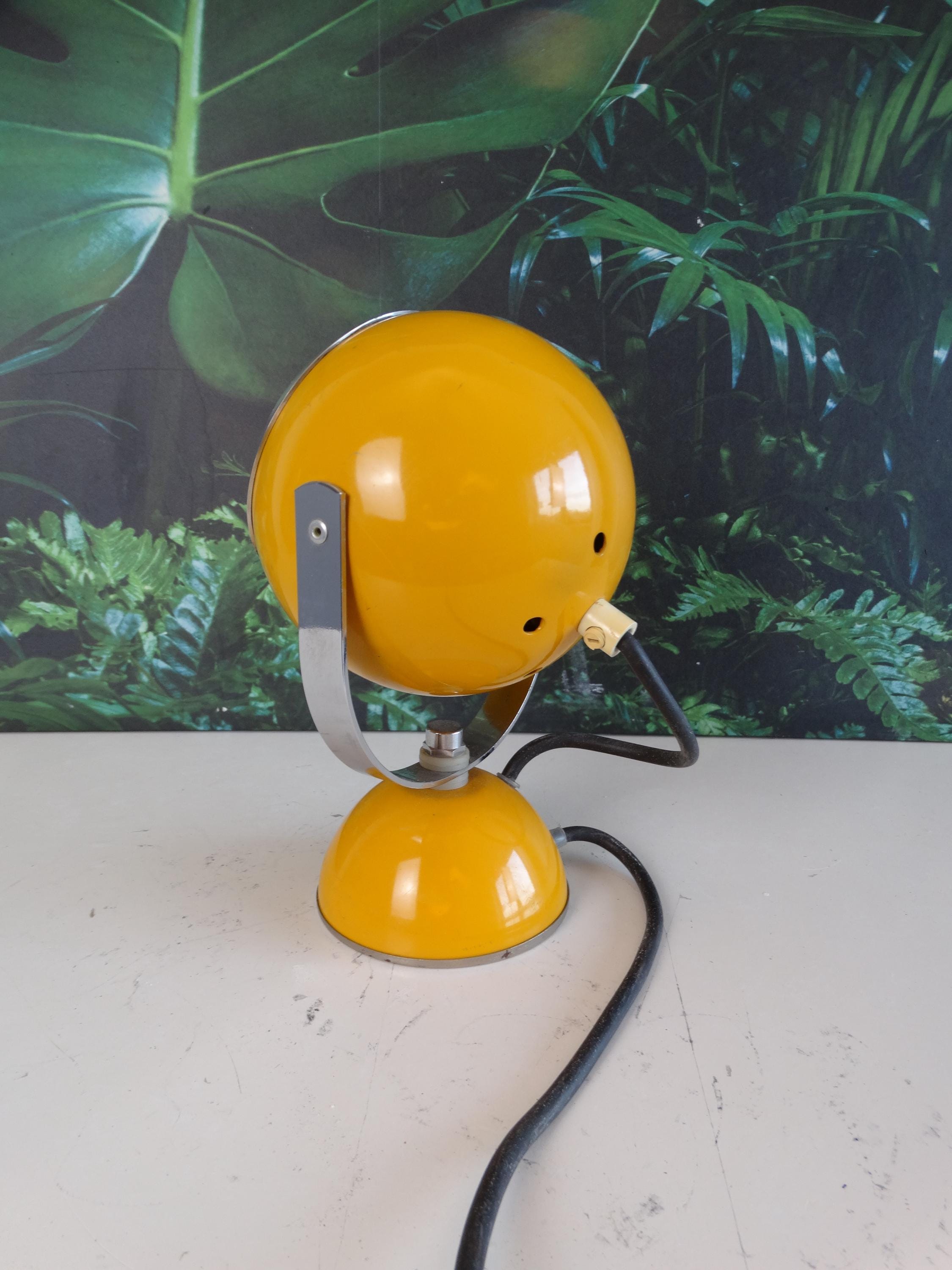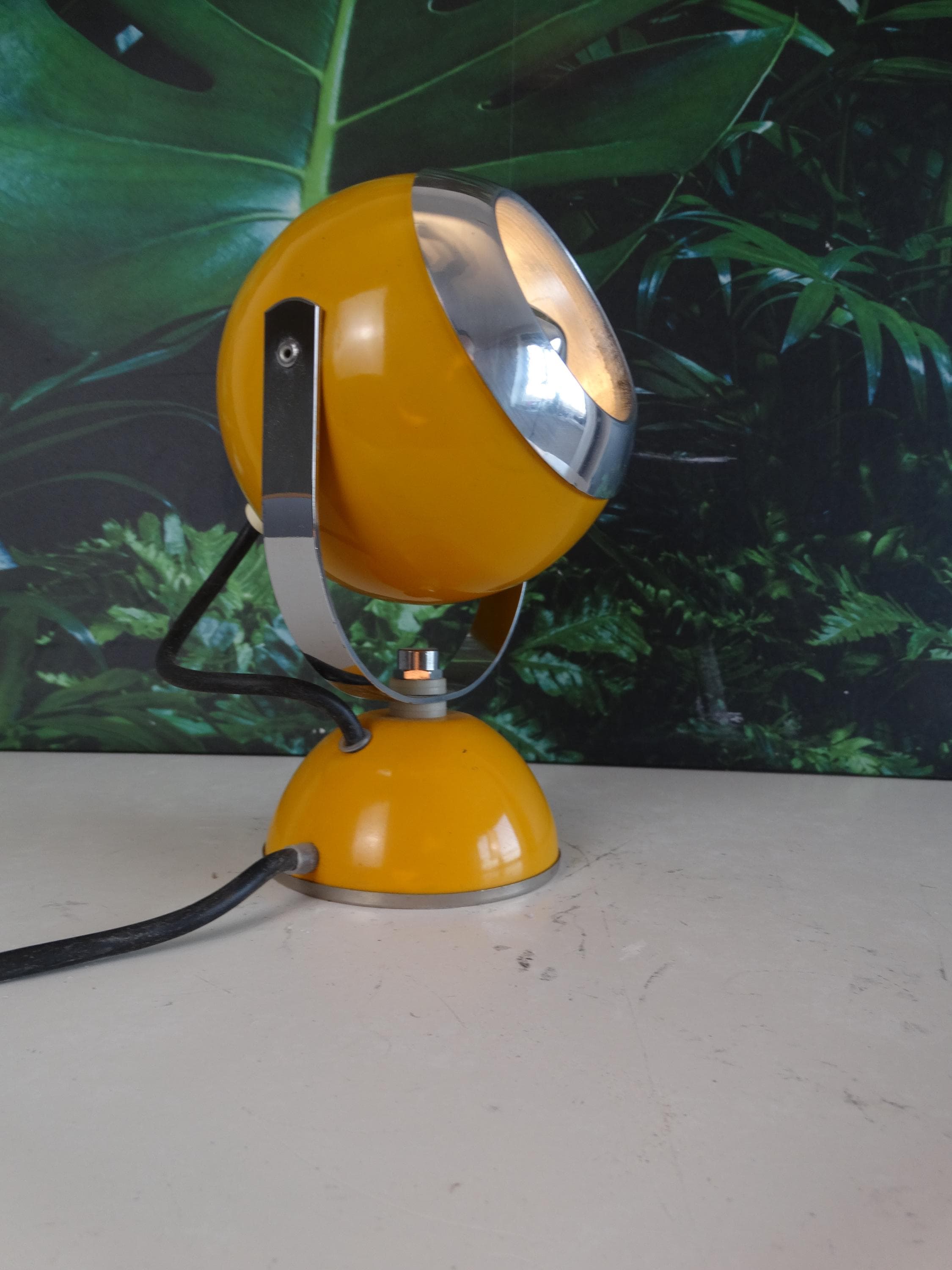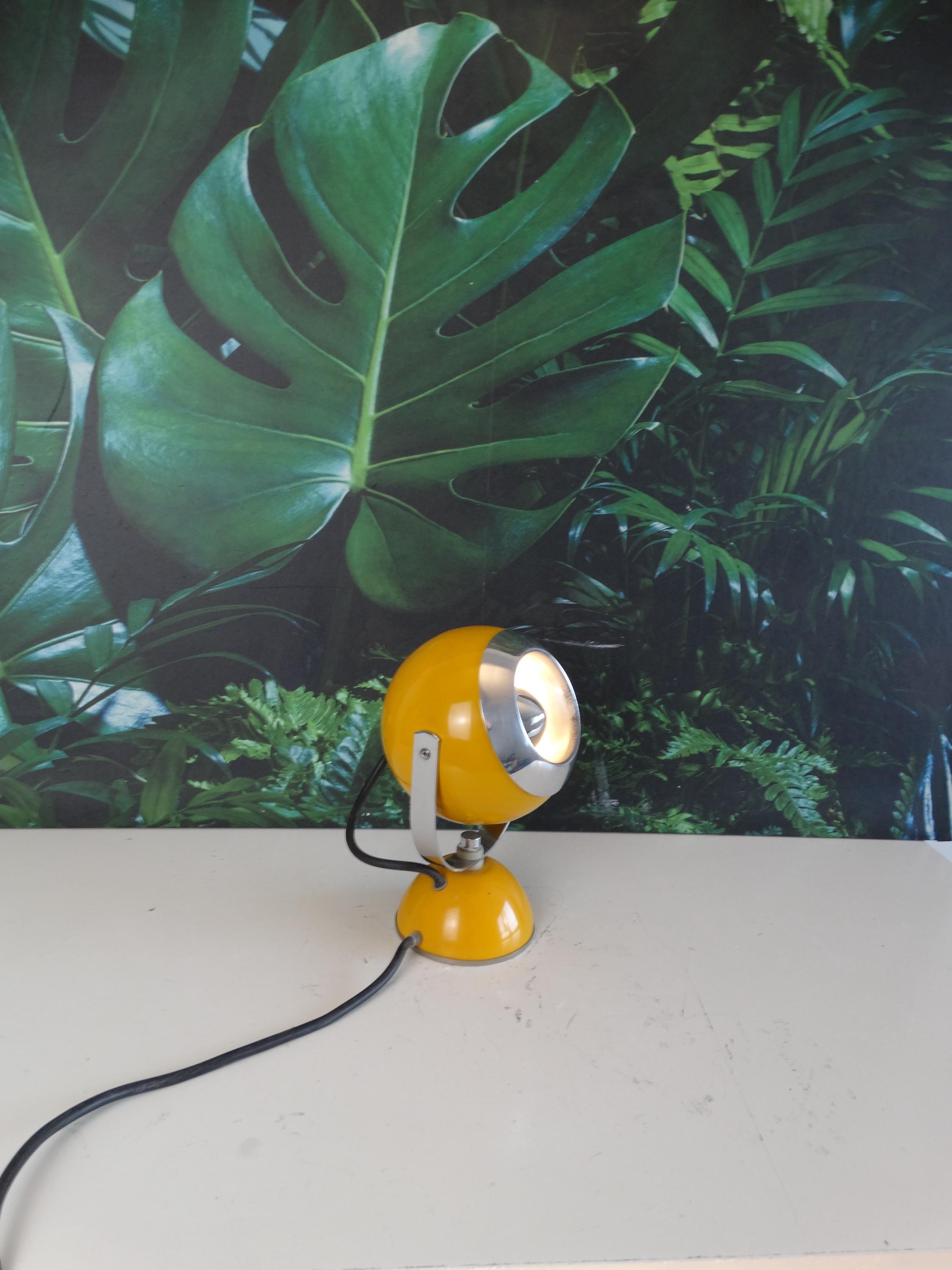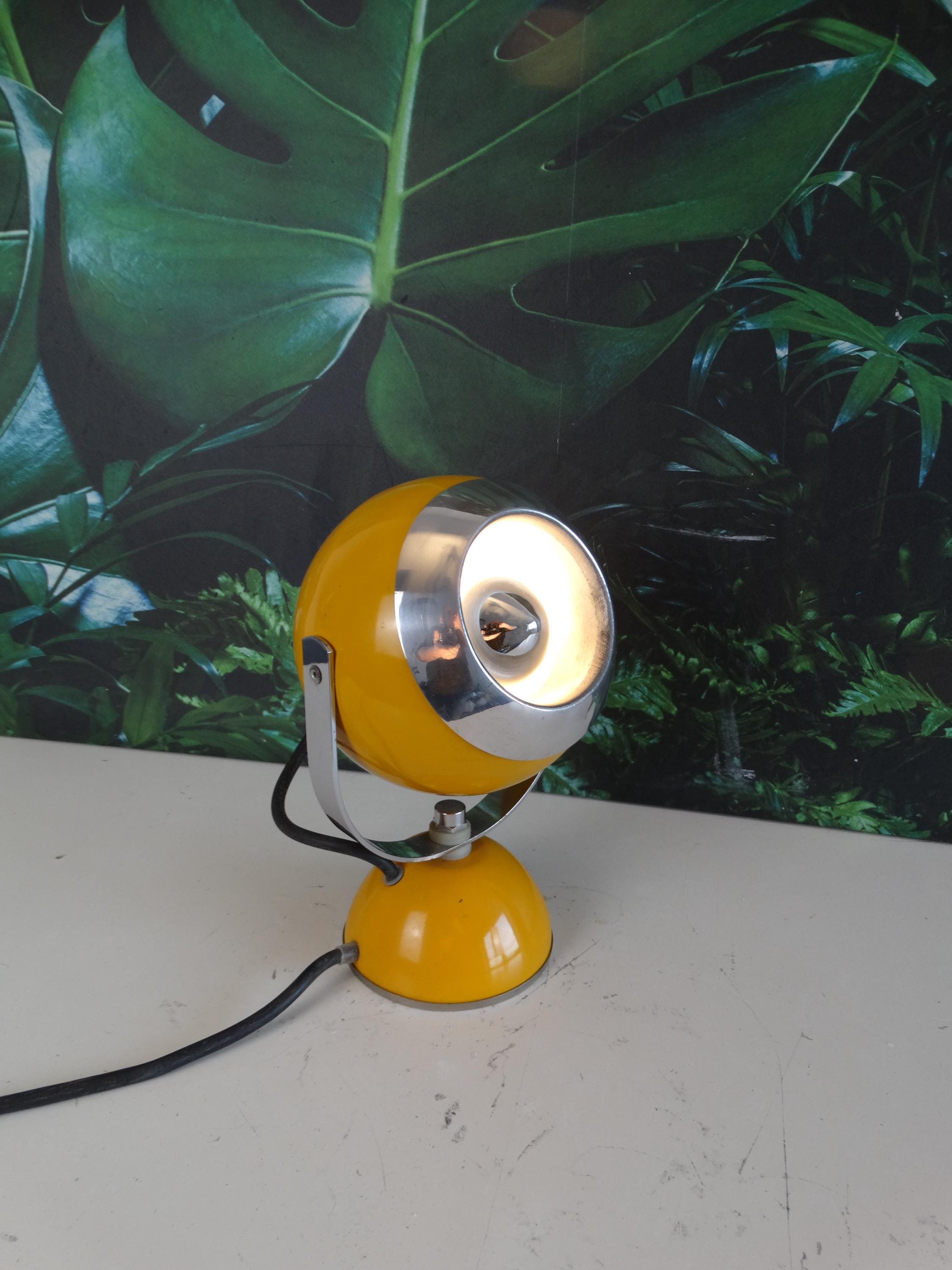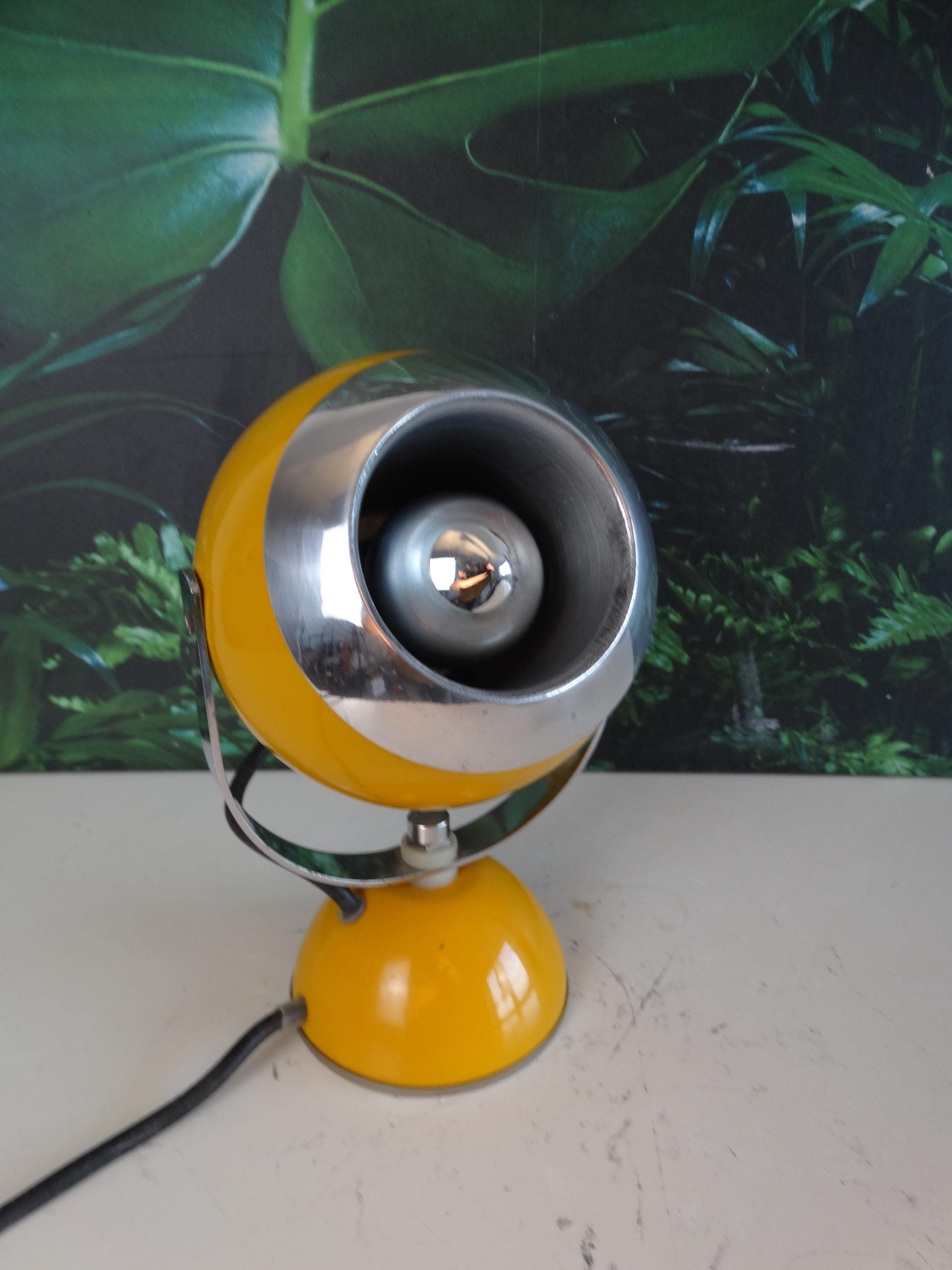 This fantastic eye-catching spotlight is from the 1970s. It's made of metal, painted yellow, and has chrome accents.