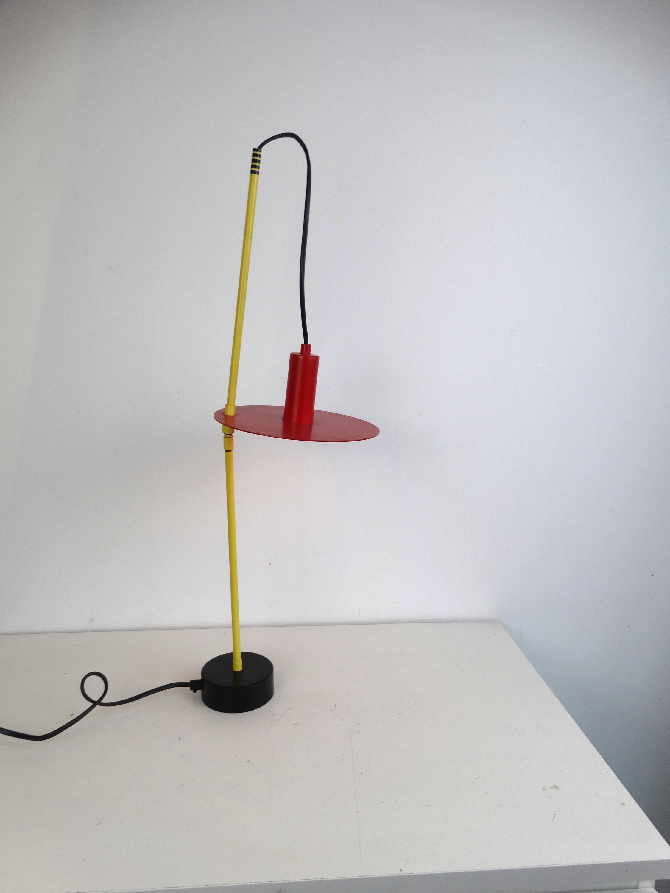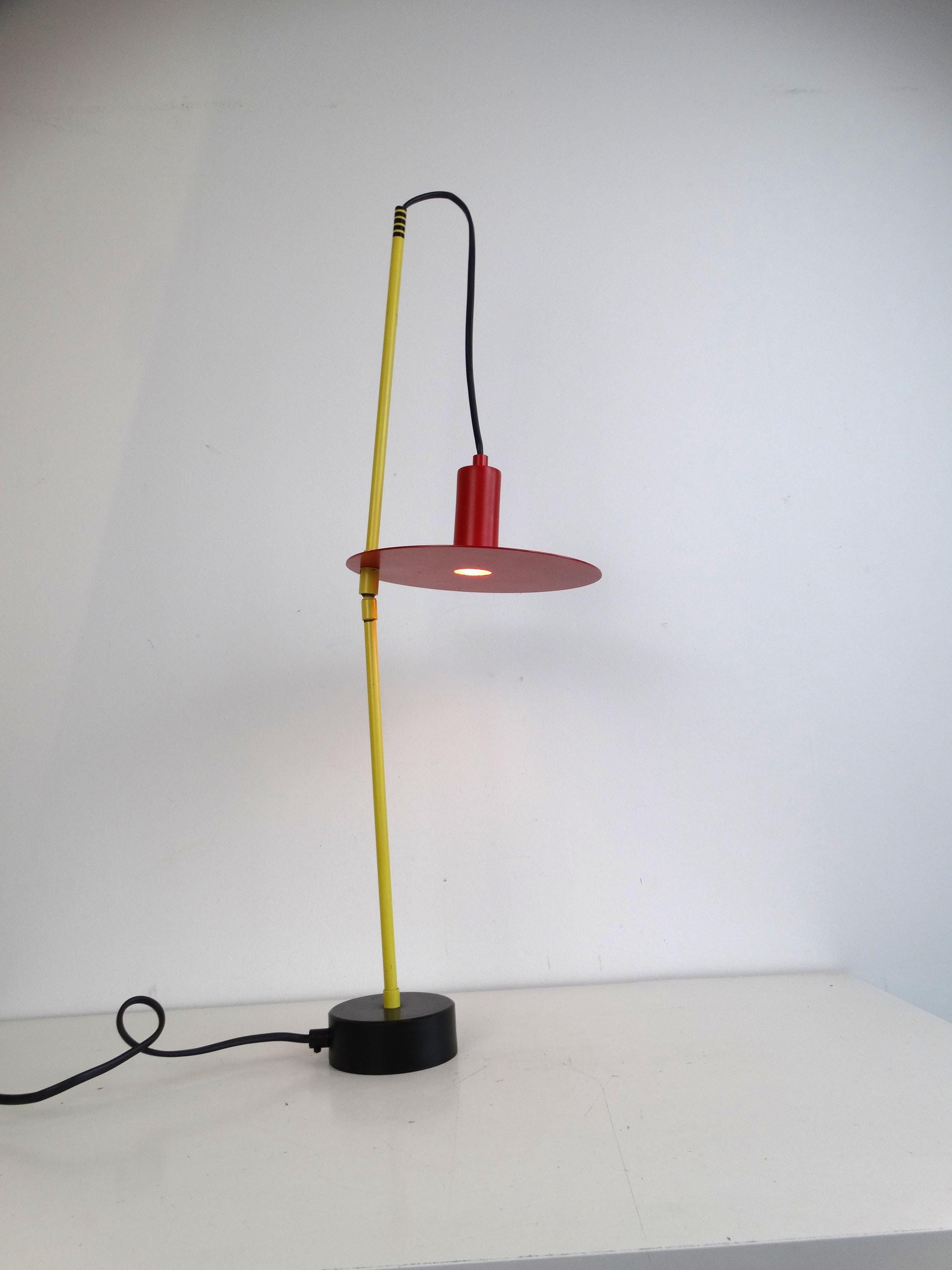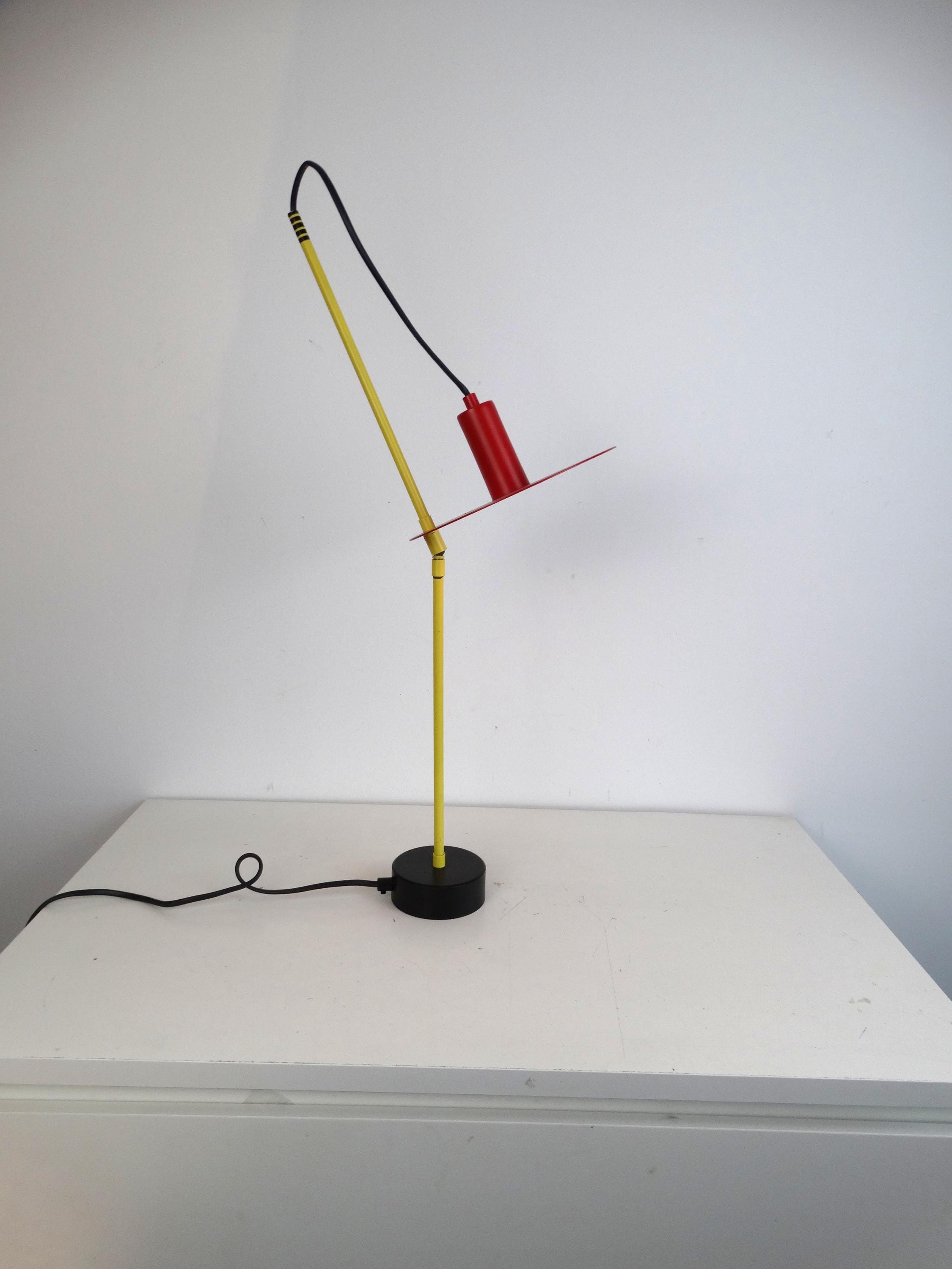 This beautiful lamp is rare. Made in the 1980s, it comes in yellow, red, and black. It has a toggle mechanism so you can adjust it.
