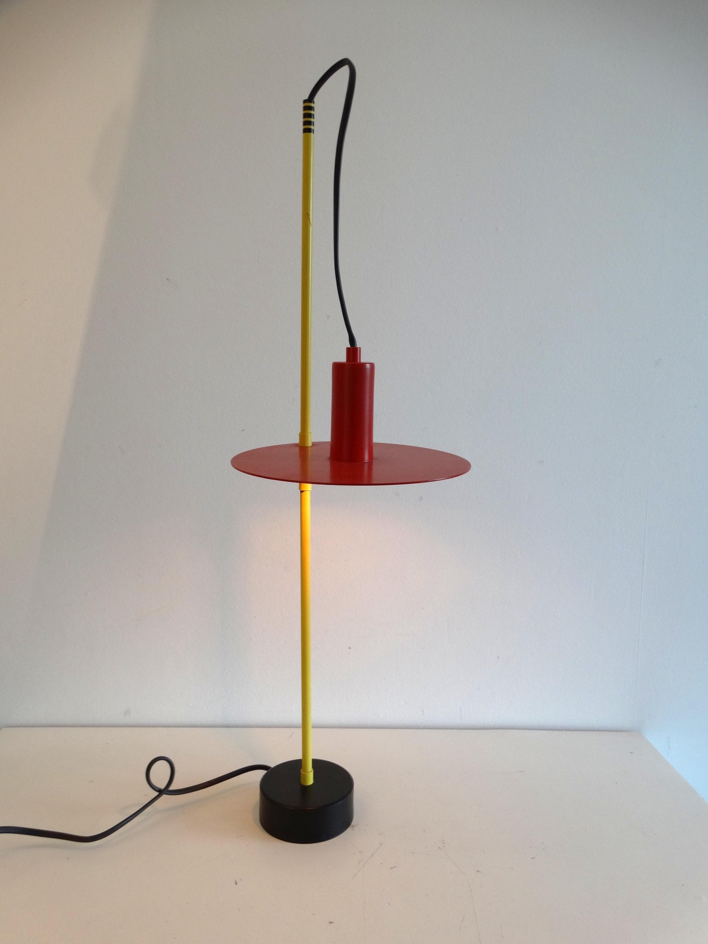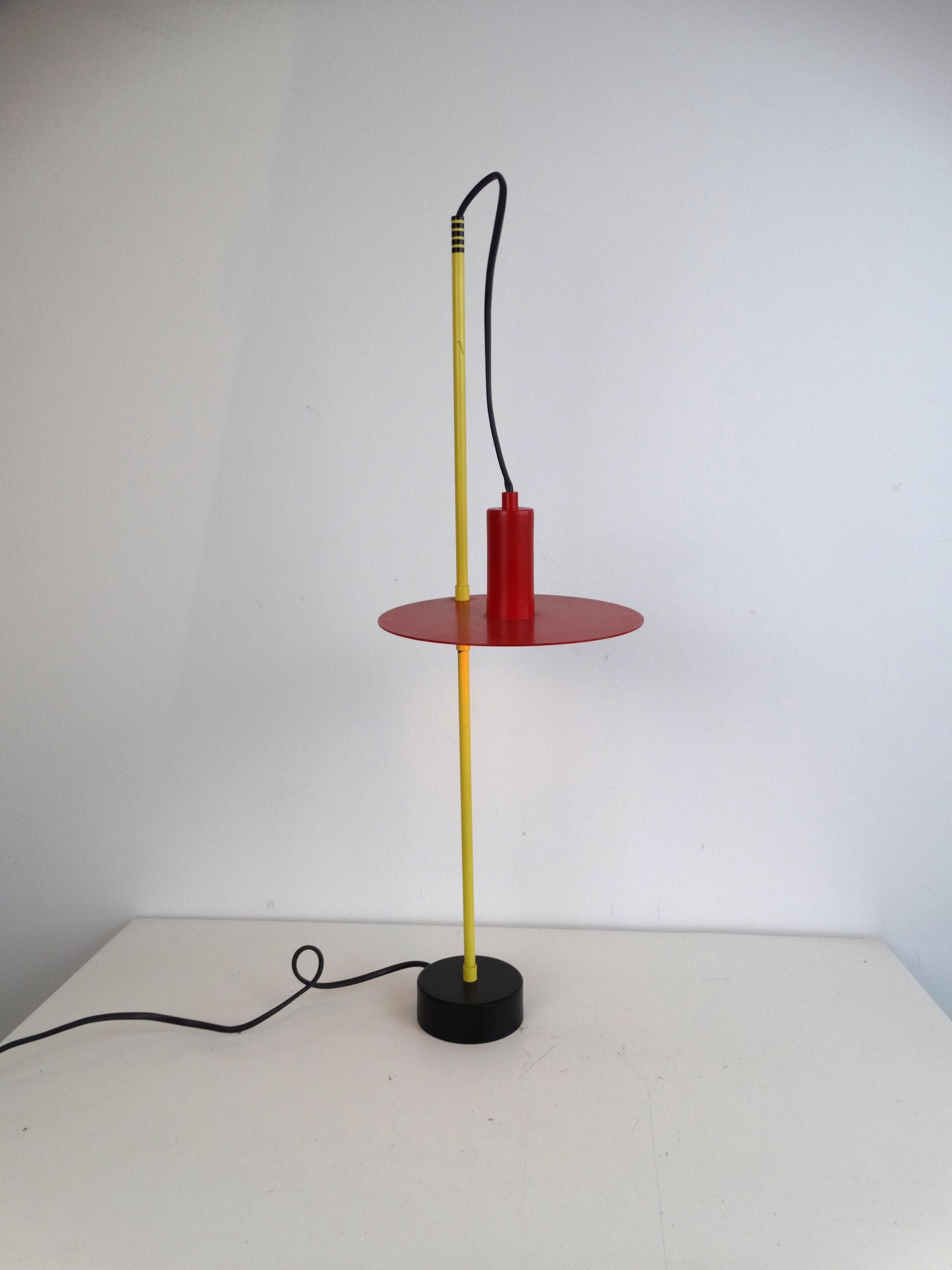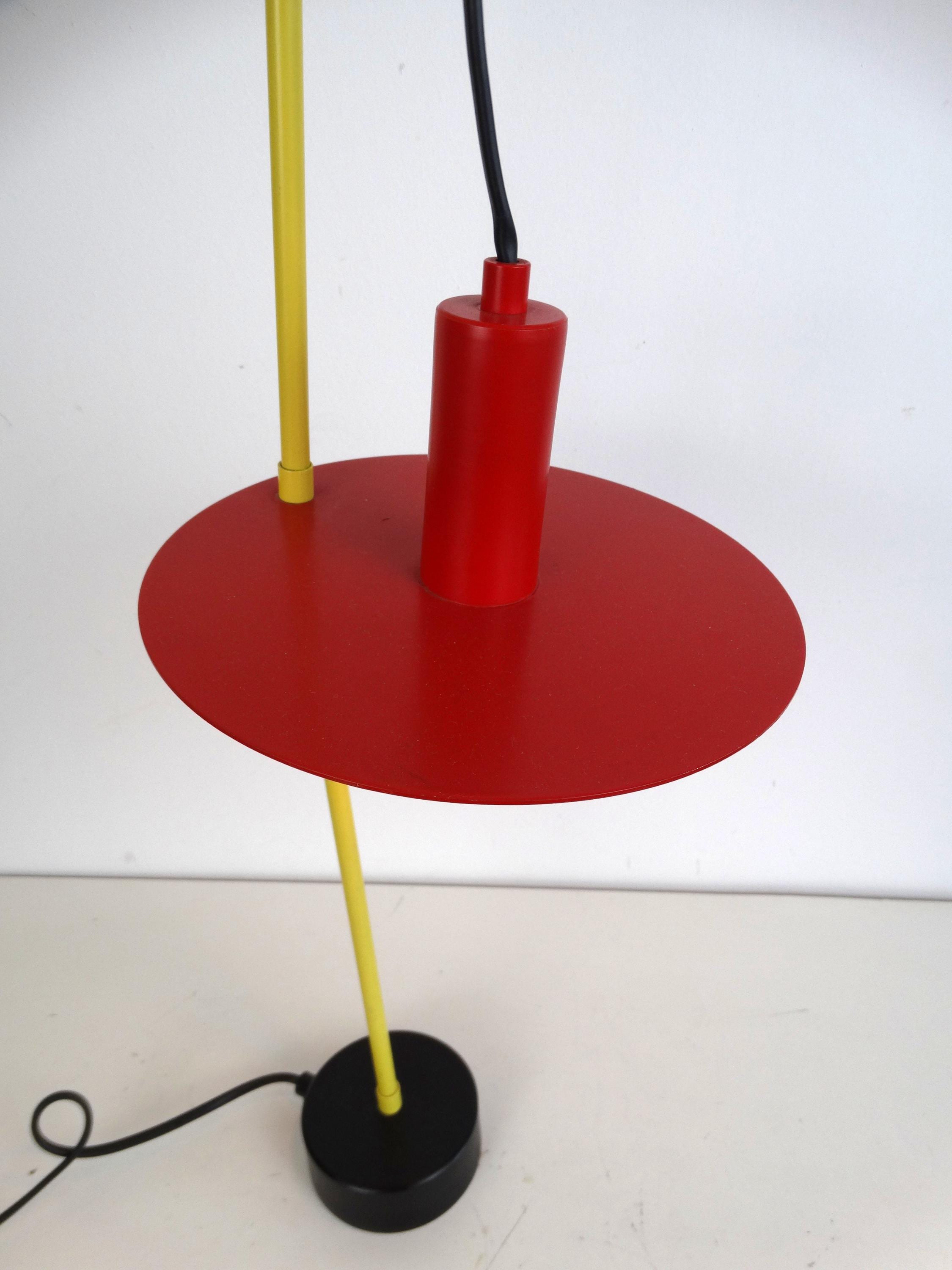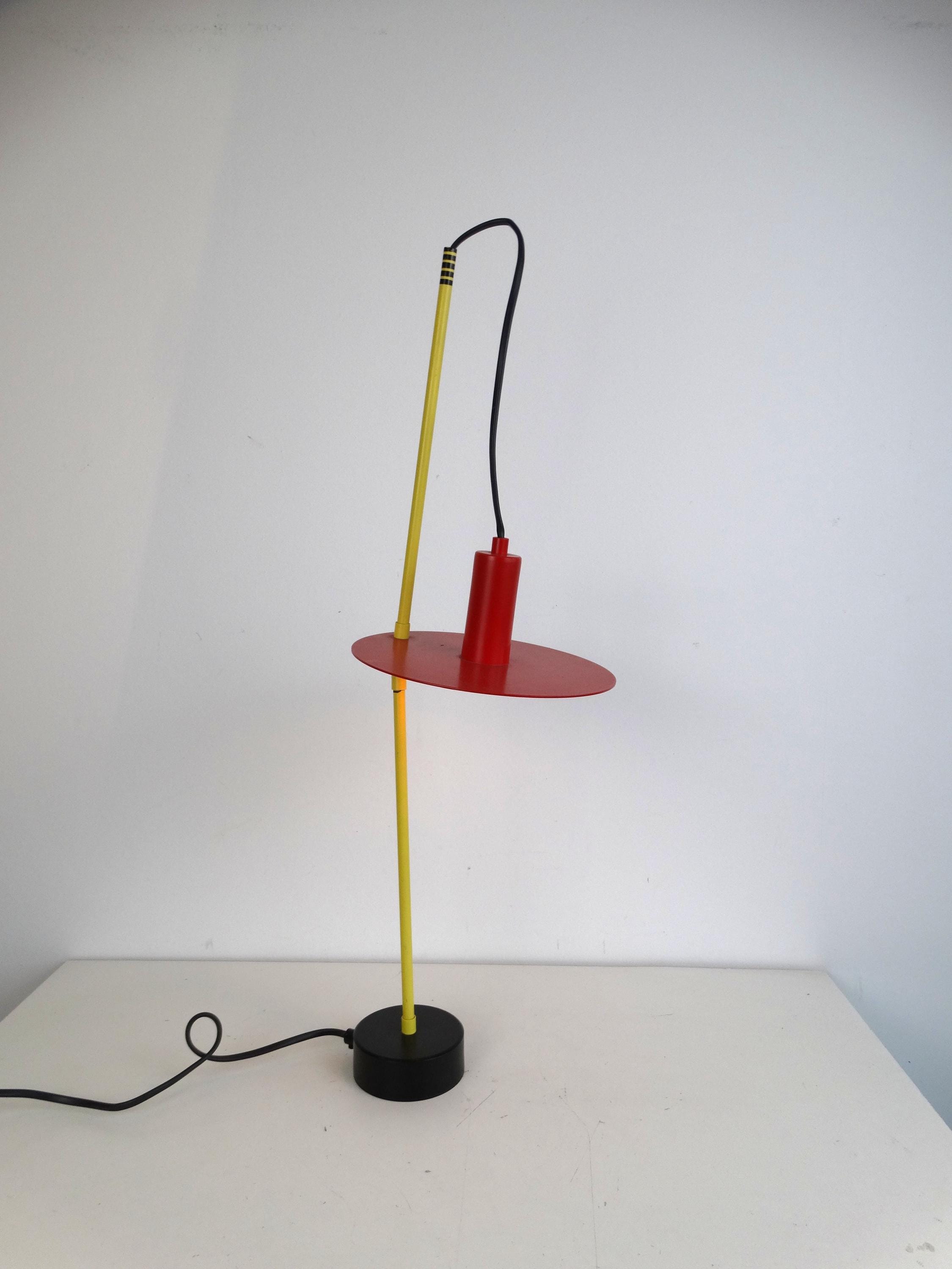 This beautiful lamp is rare. Made in the 1980s, it comes in yellow, red, and black. It has a toggle mechanism so you can adjust it.