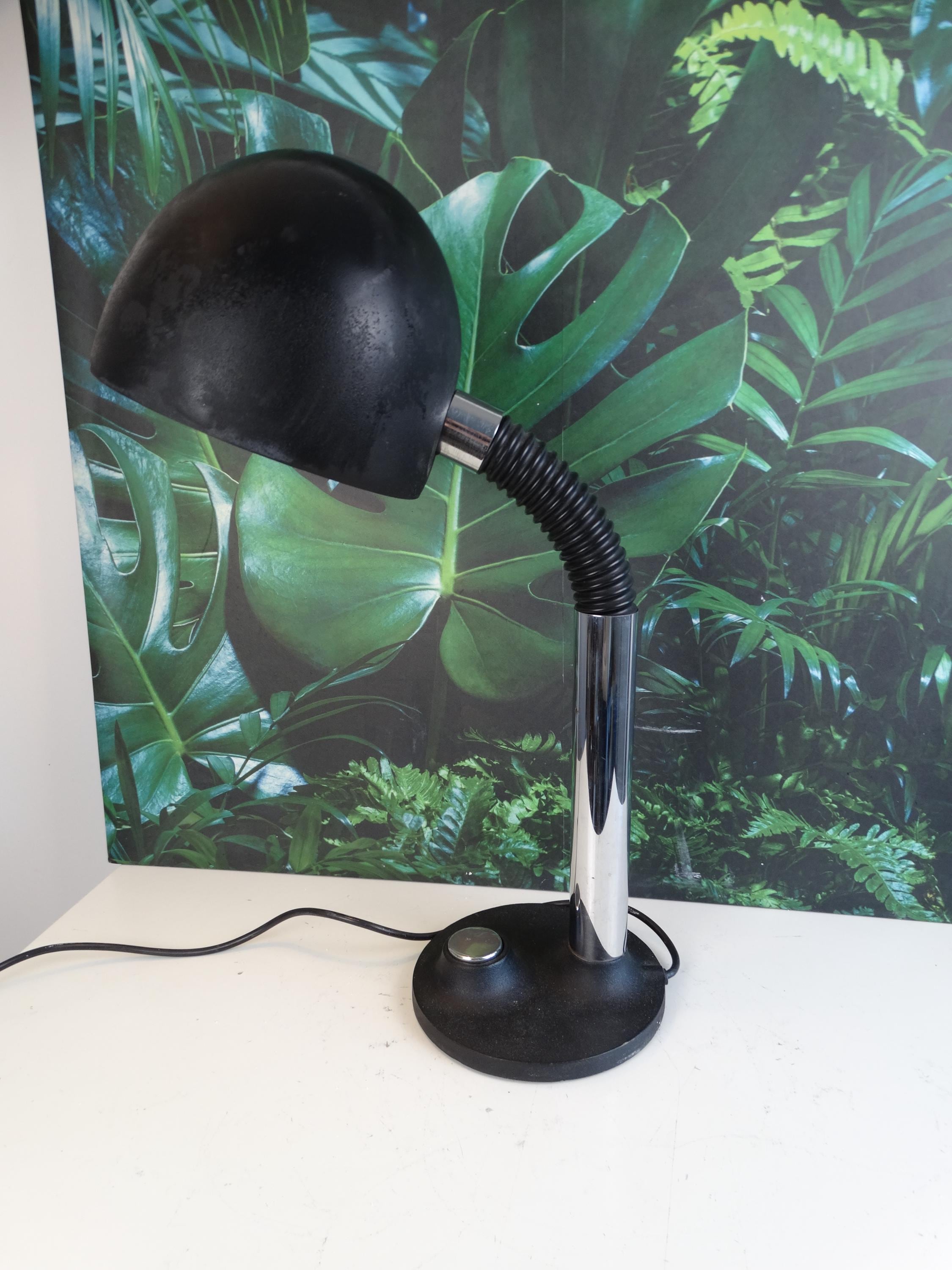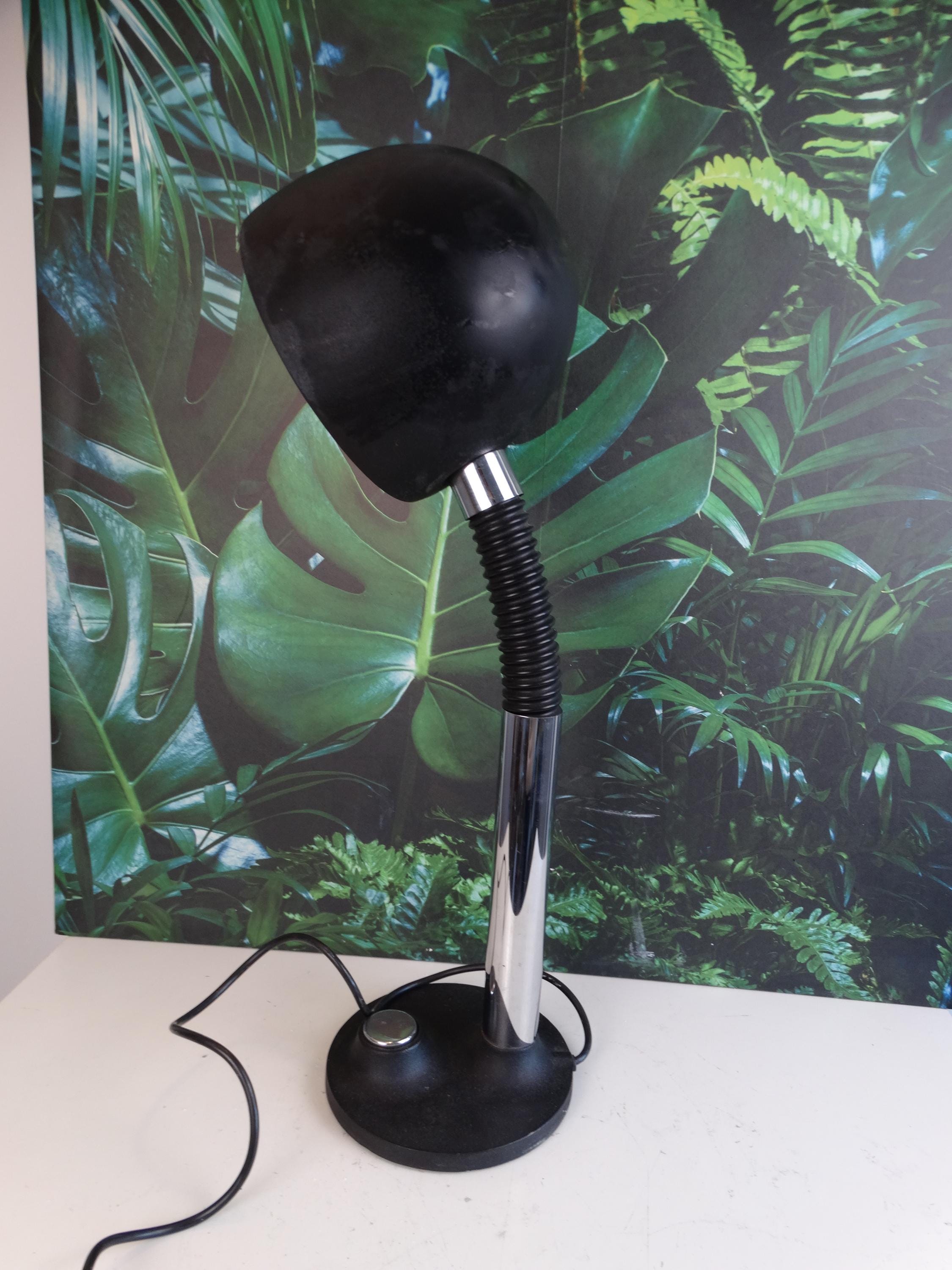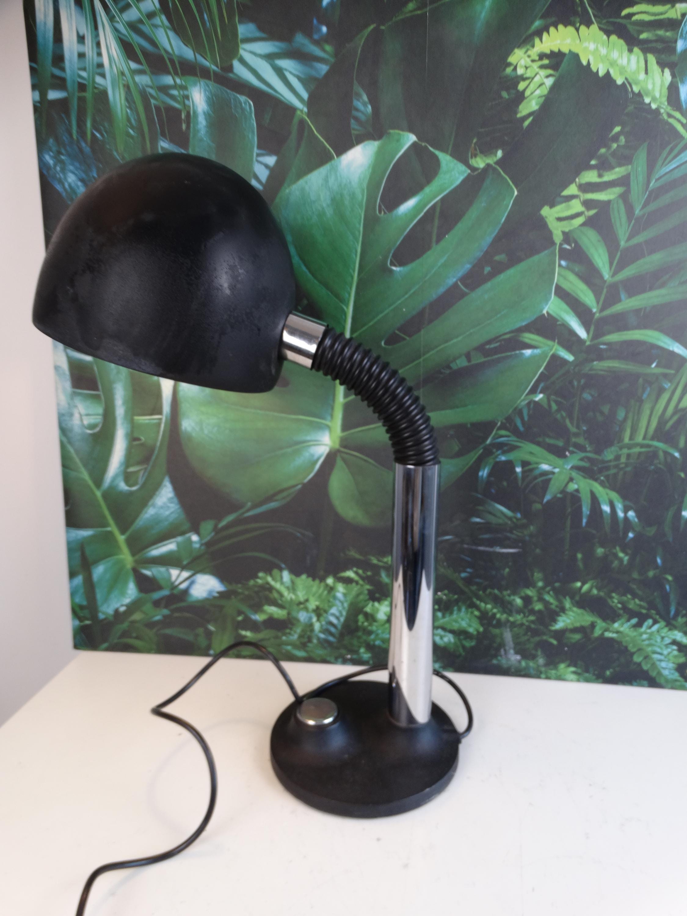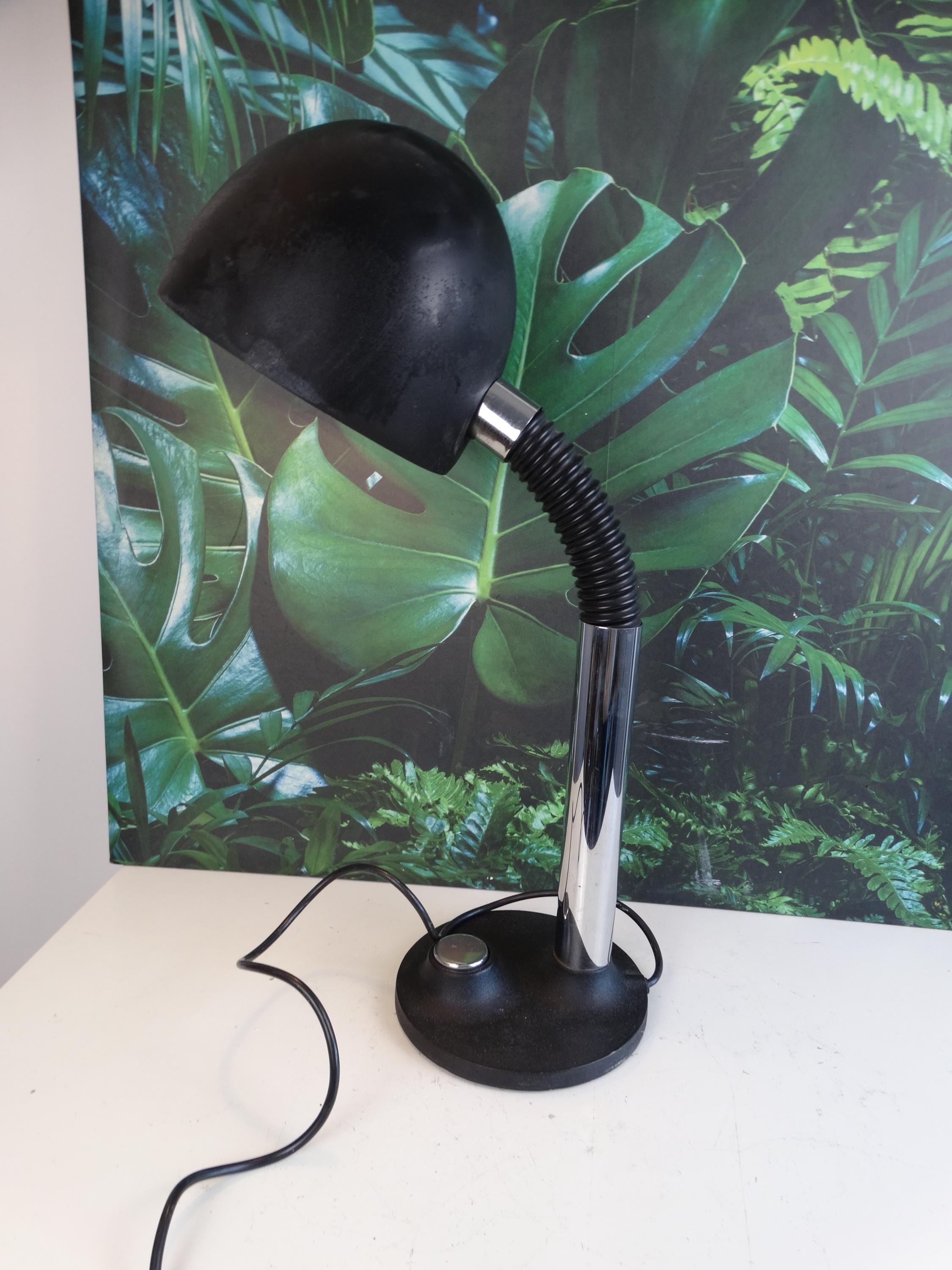 This desk lamp is made of metal and chrome-plated metal, with a black gooseneck!