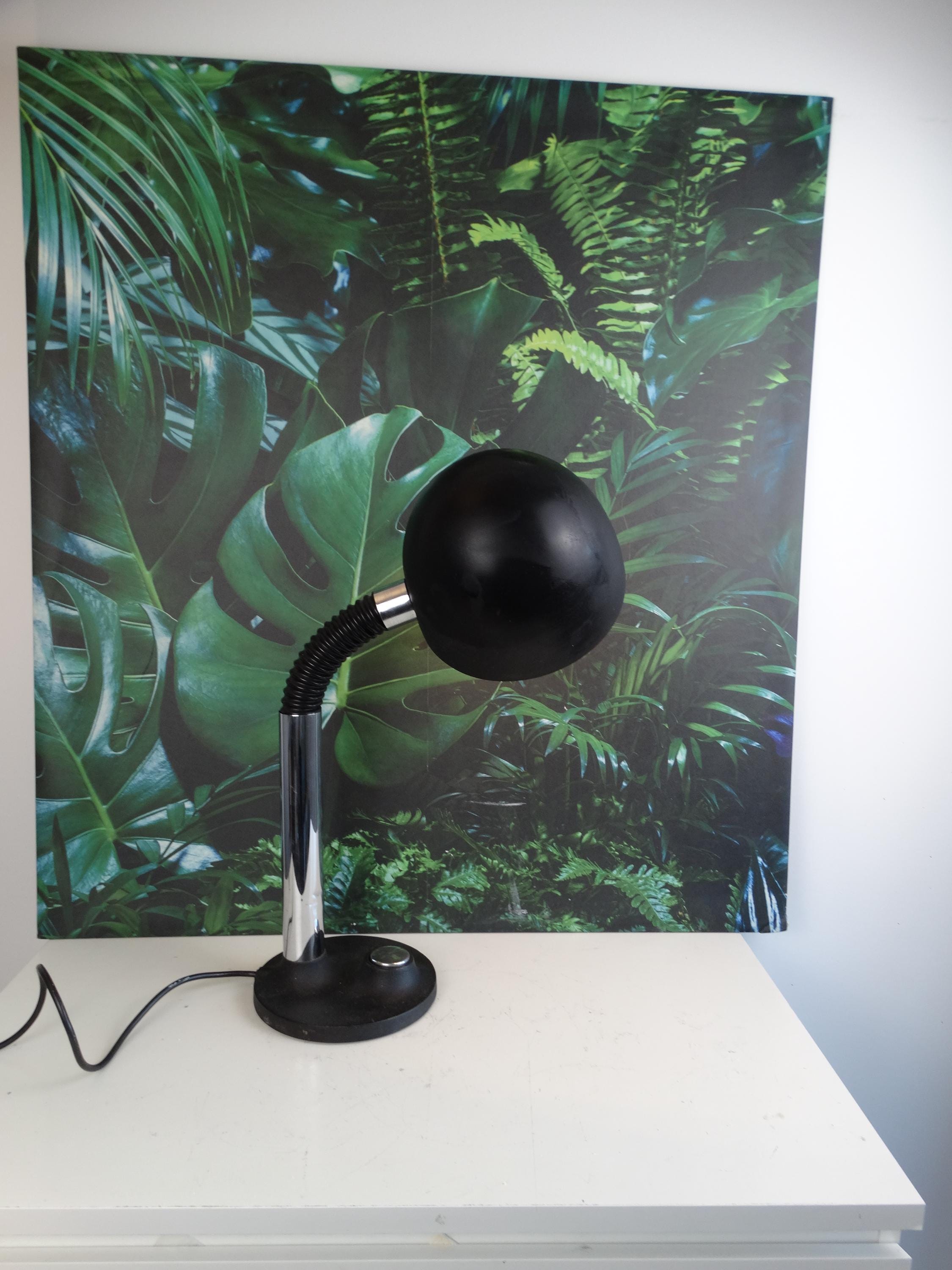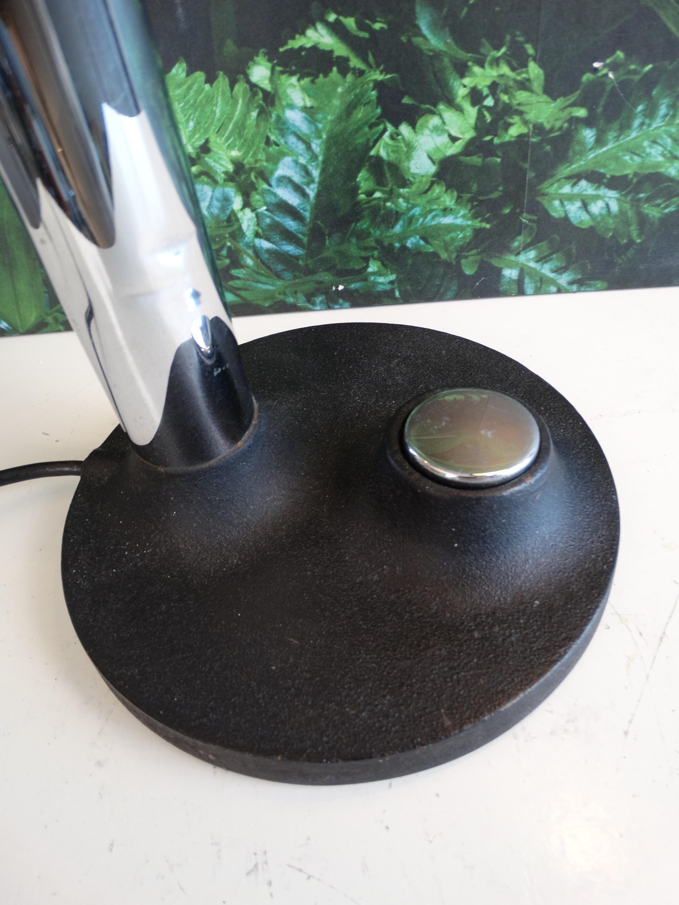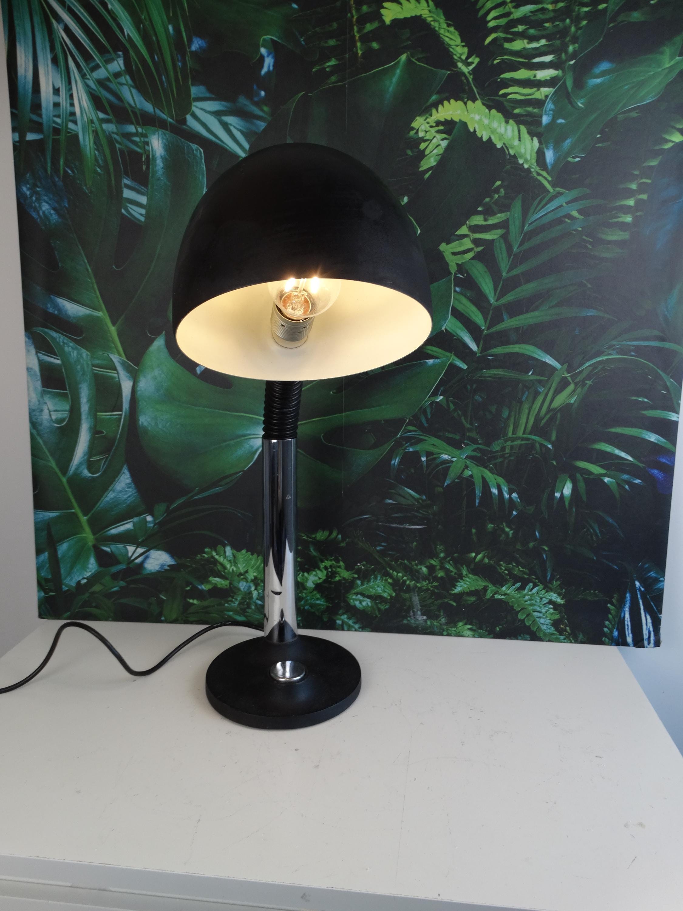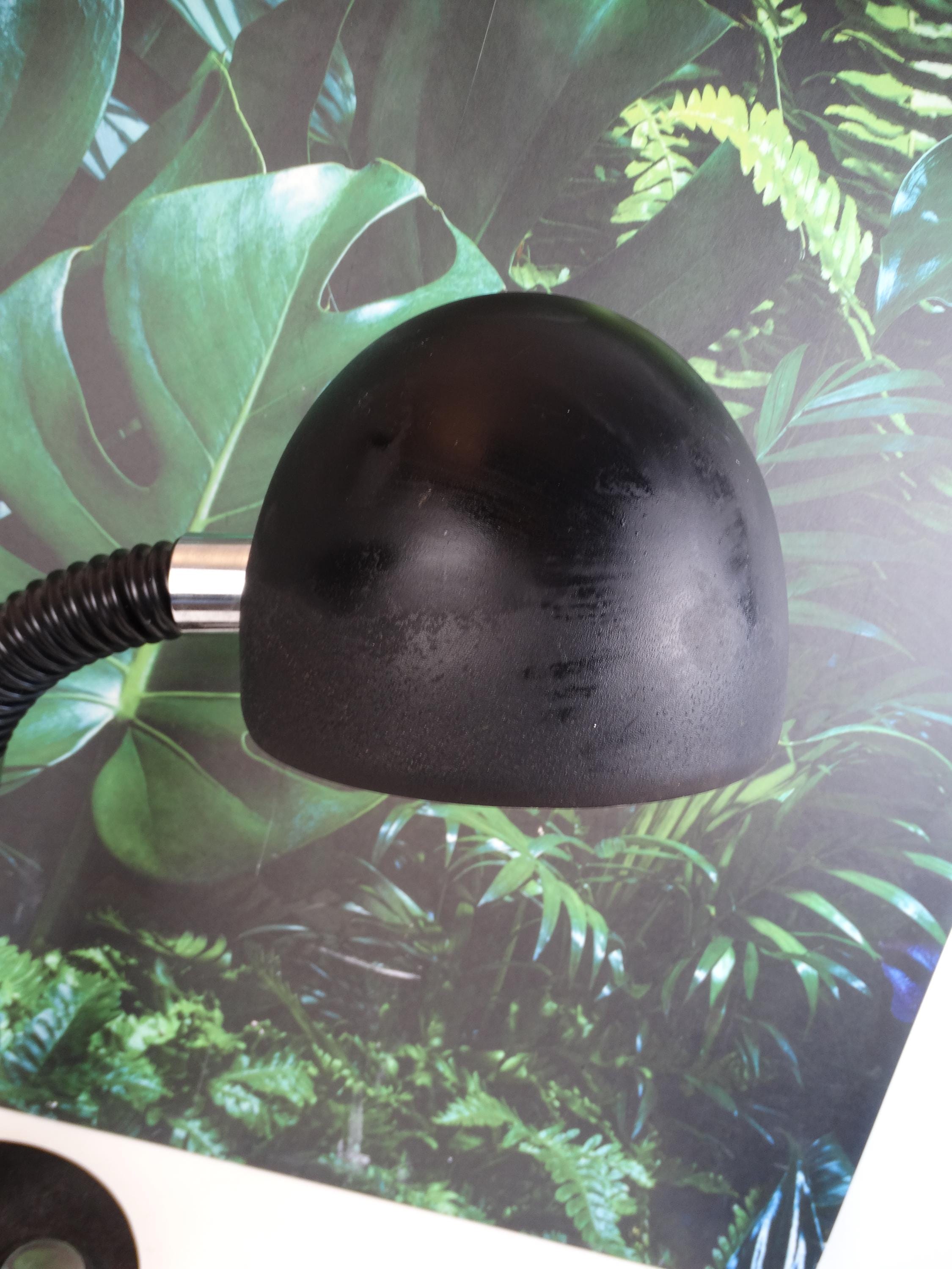 This desk lamp is made of metal and chrome-plated metal, with a black gooseneck!