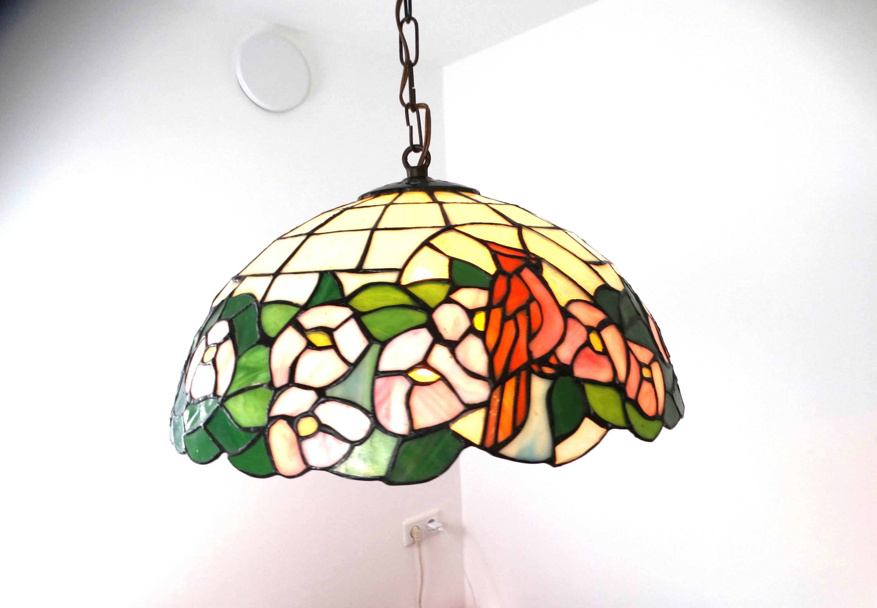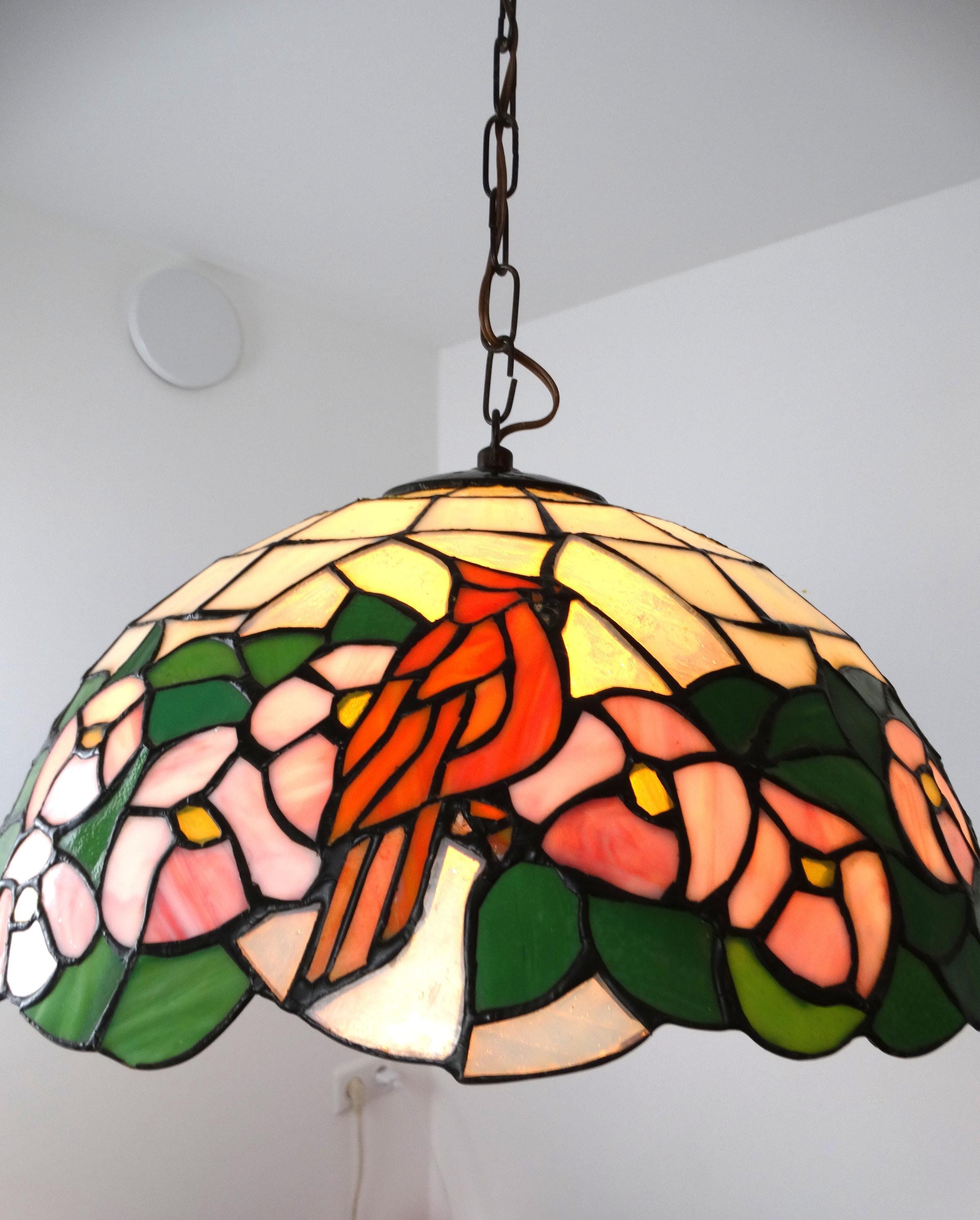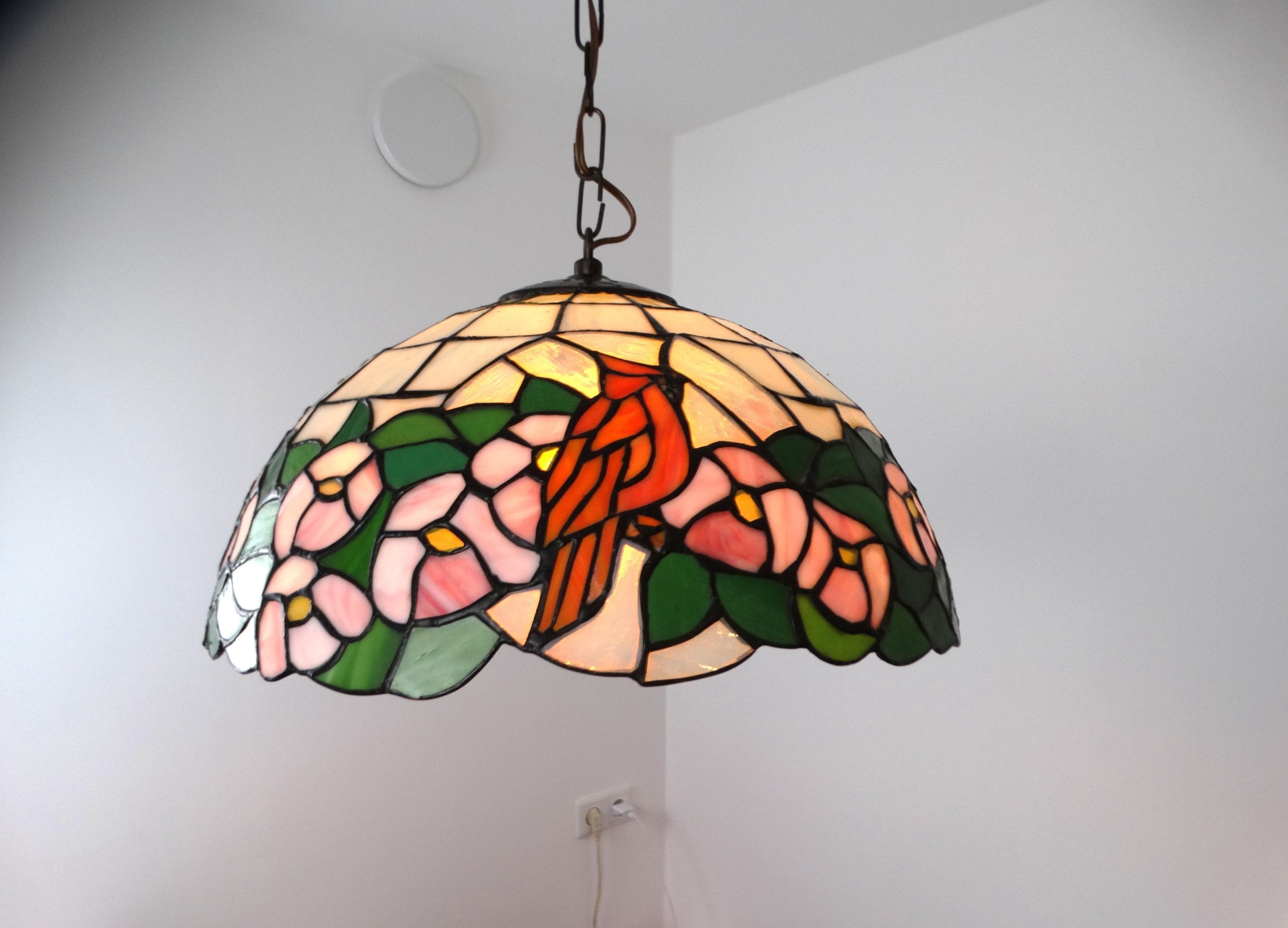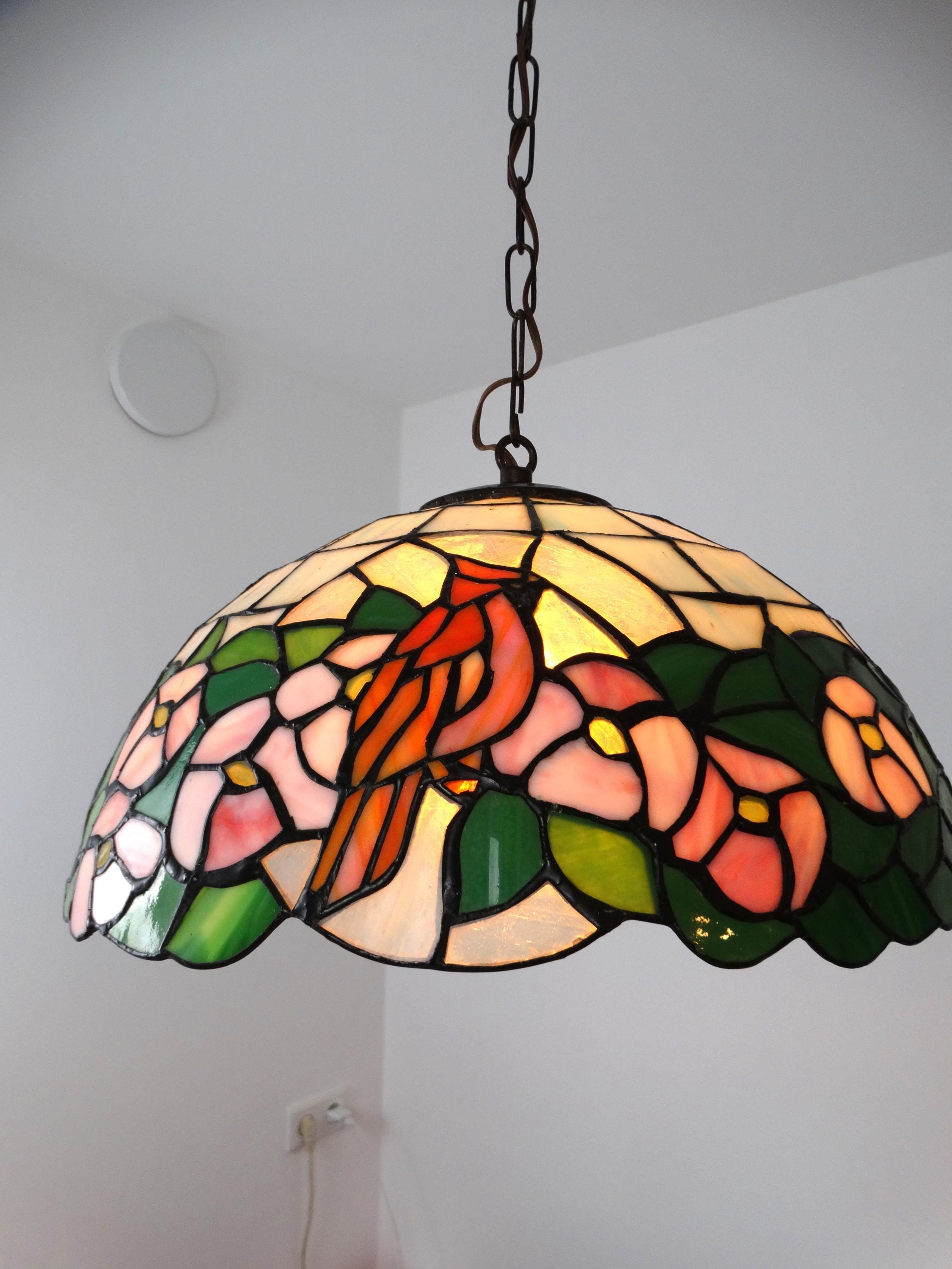 Vintage Tiffany-style lamp. This beautiful pendant lamp features three birds on the shades and is richly decorated with flowers. This pendant lamp is truly a sight to behold.