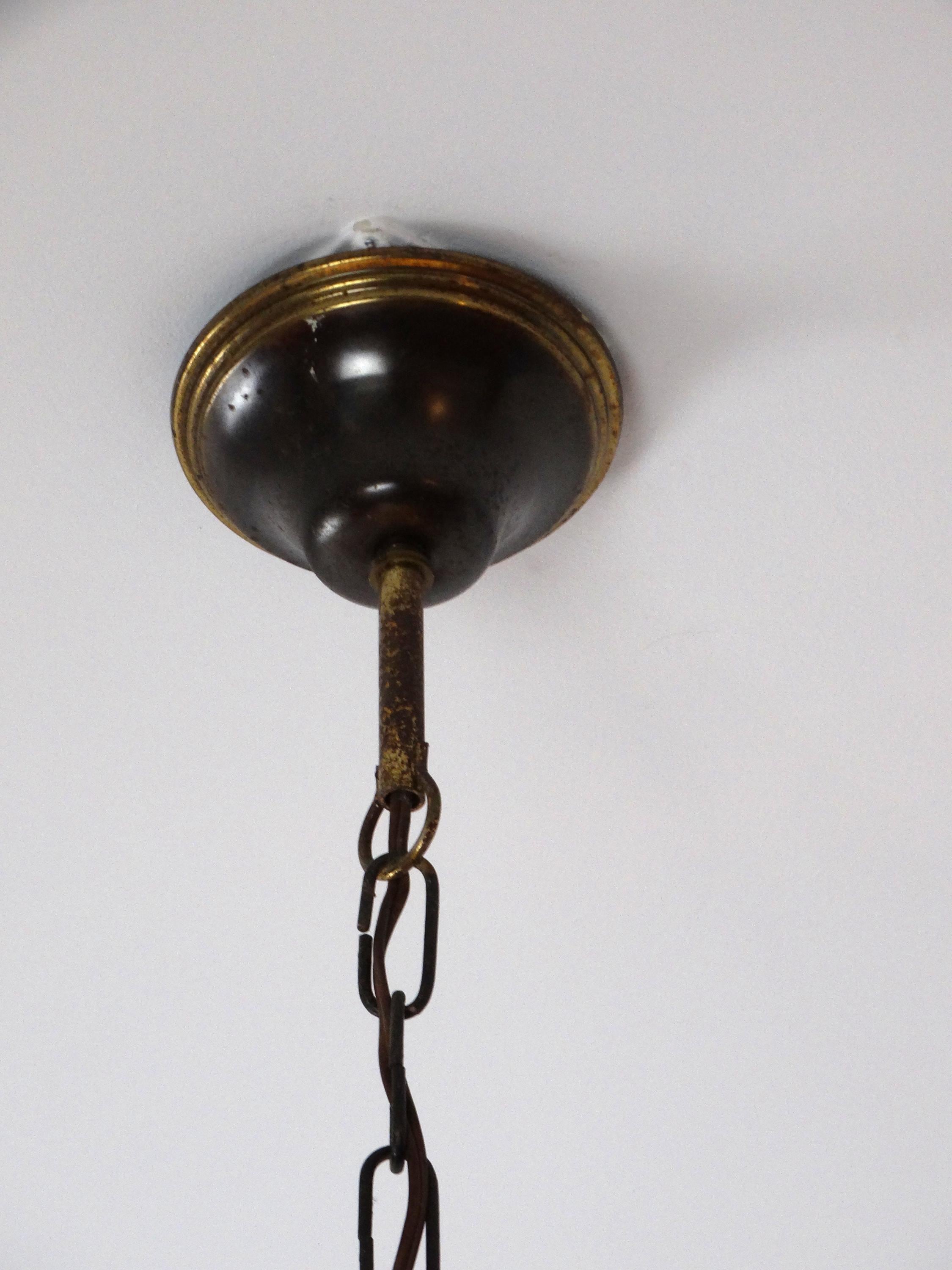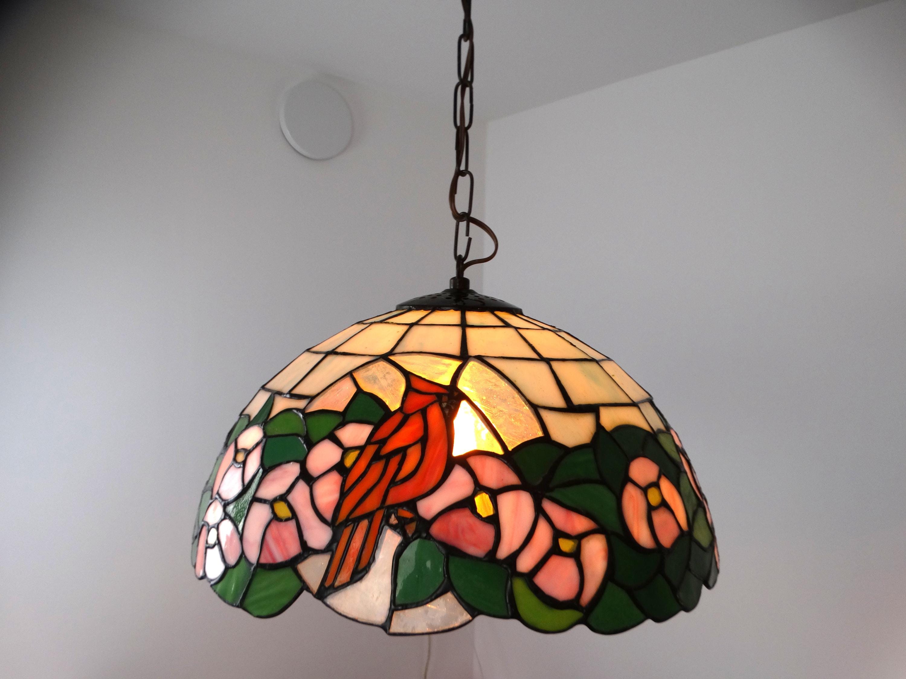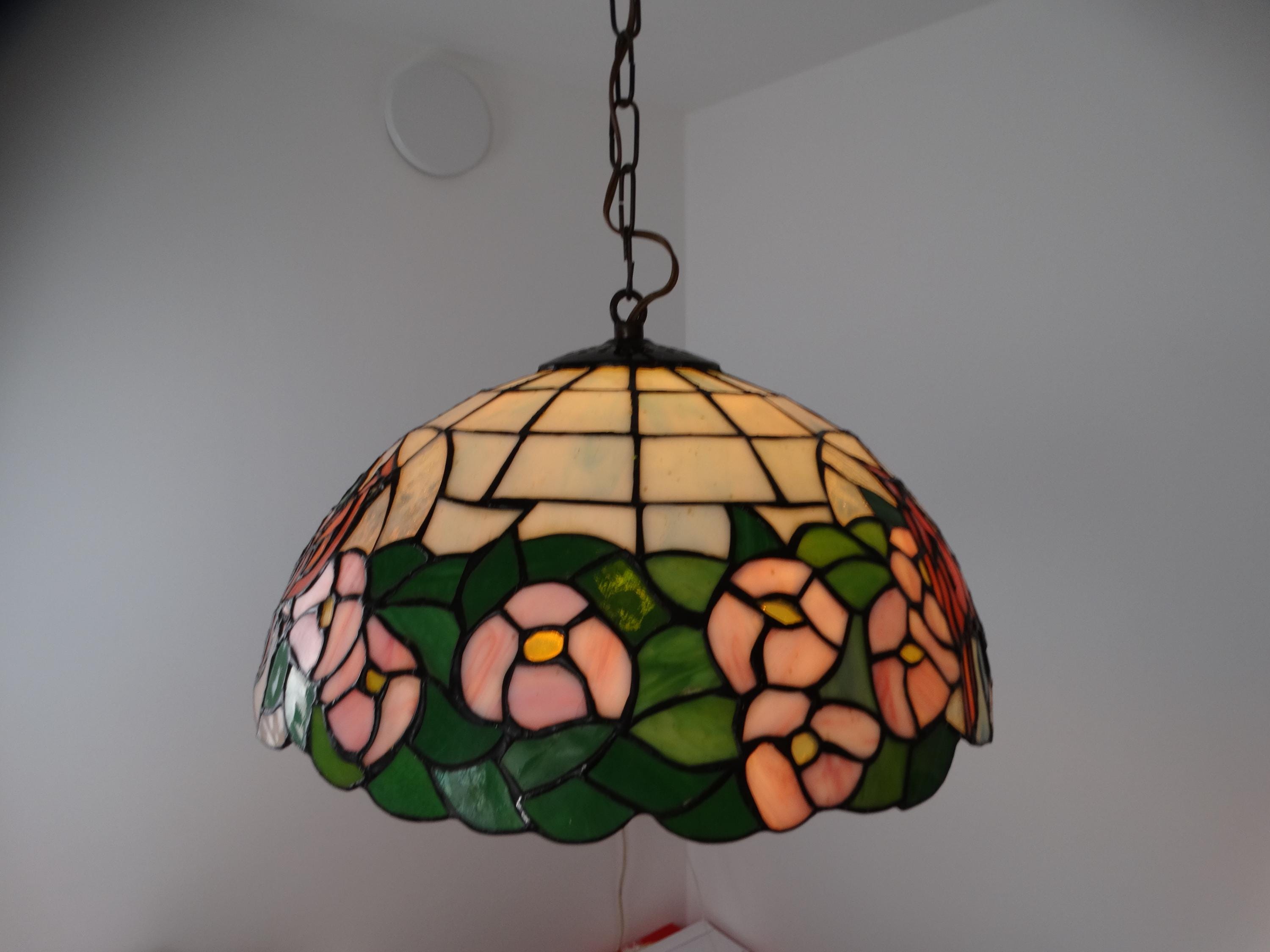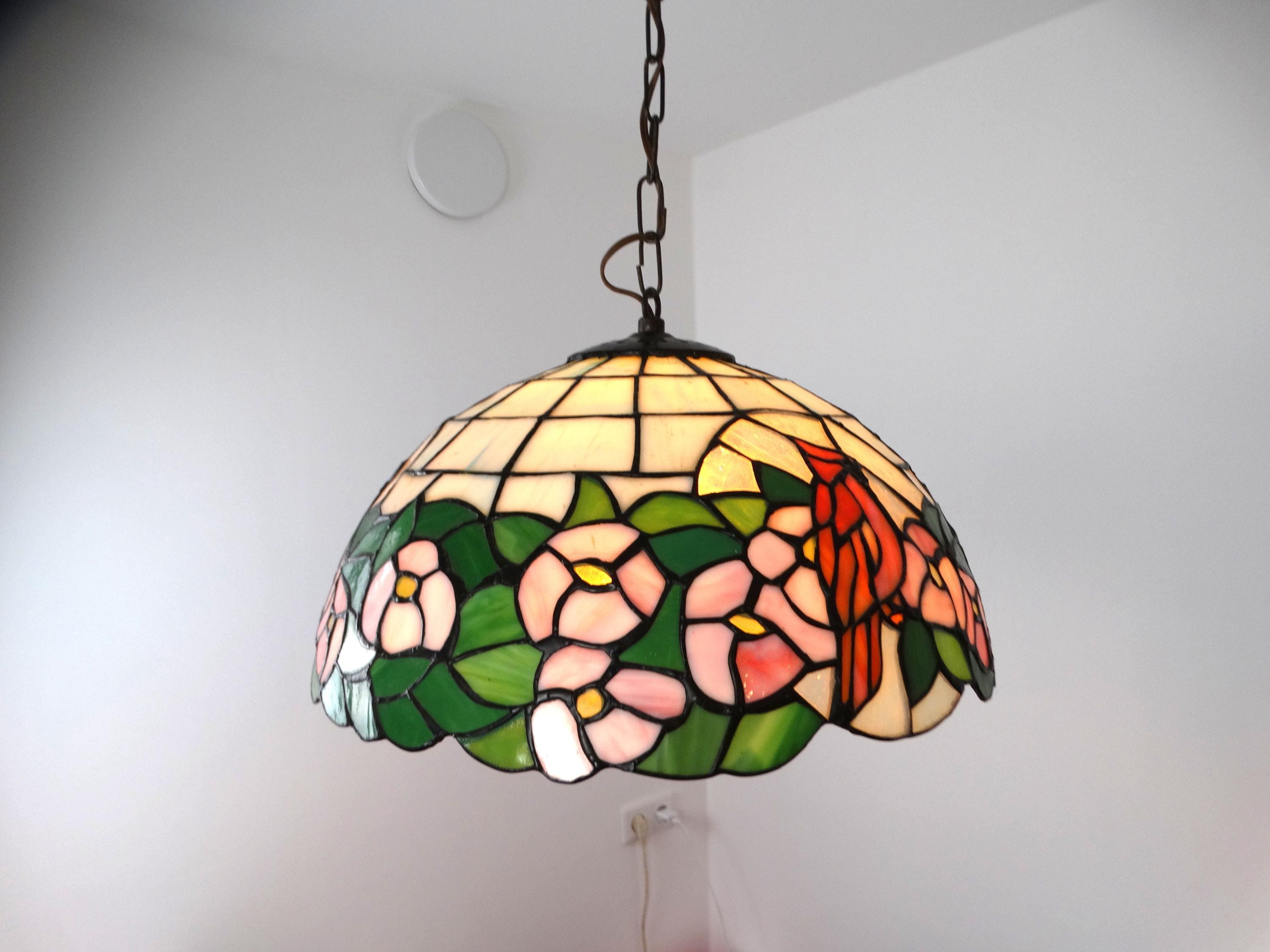 Vintage Tiffany-style lamp. This beautiful pendant lamp features three birds on the shades and is richly decorated with flowers. This pendant lamp is truly a sight to behold.