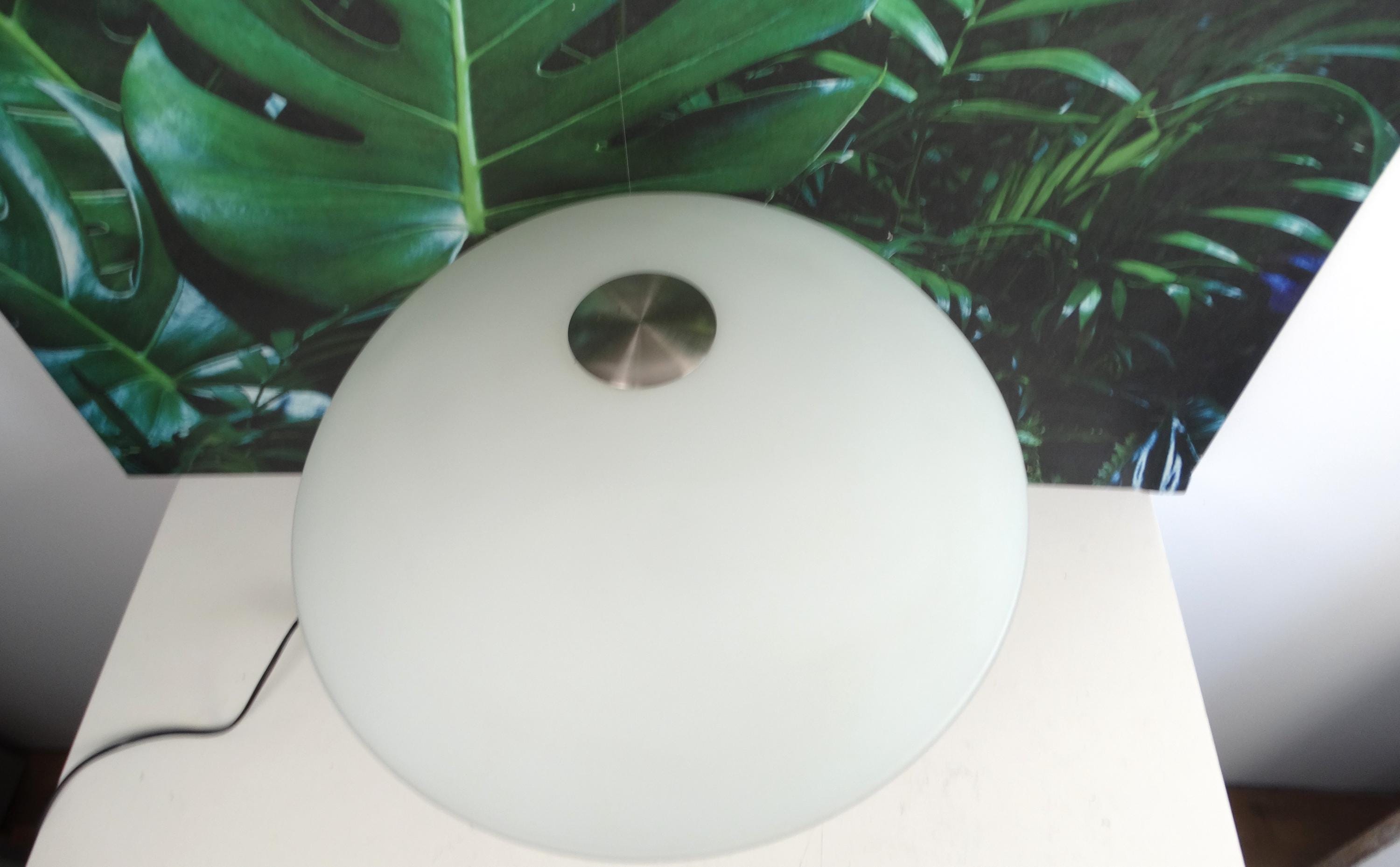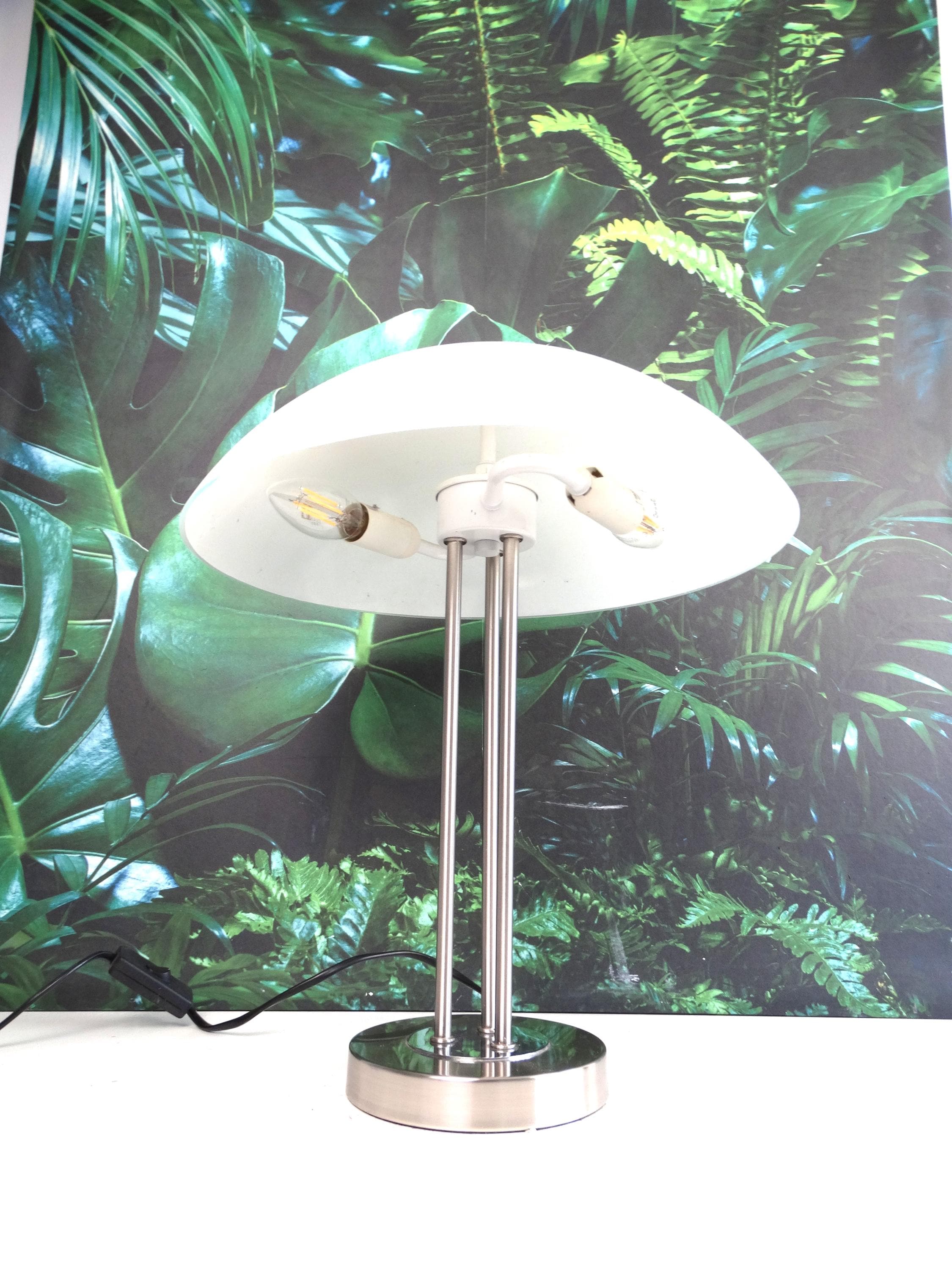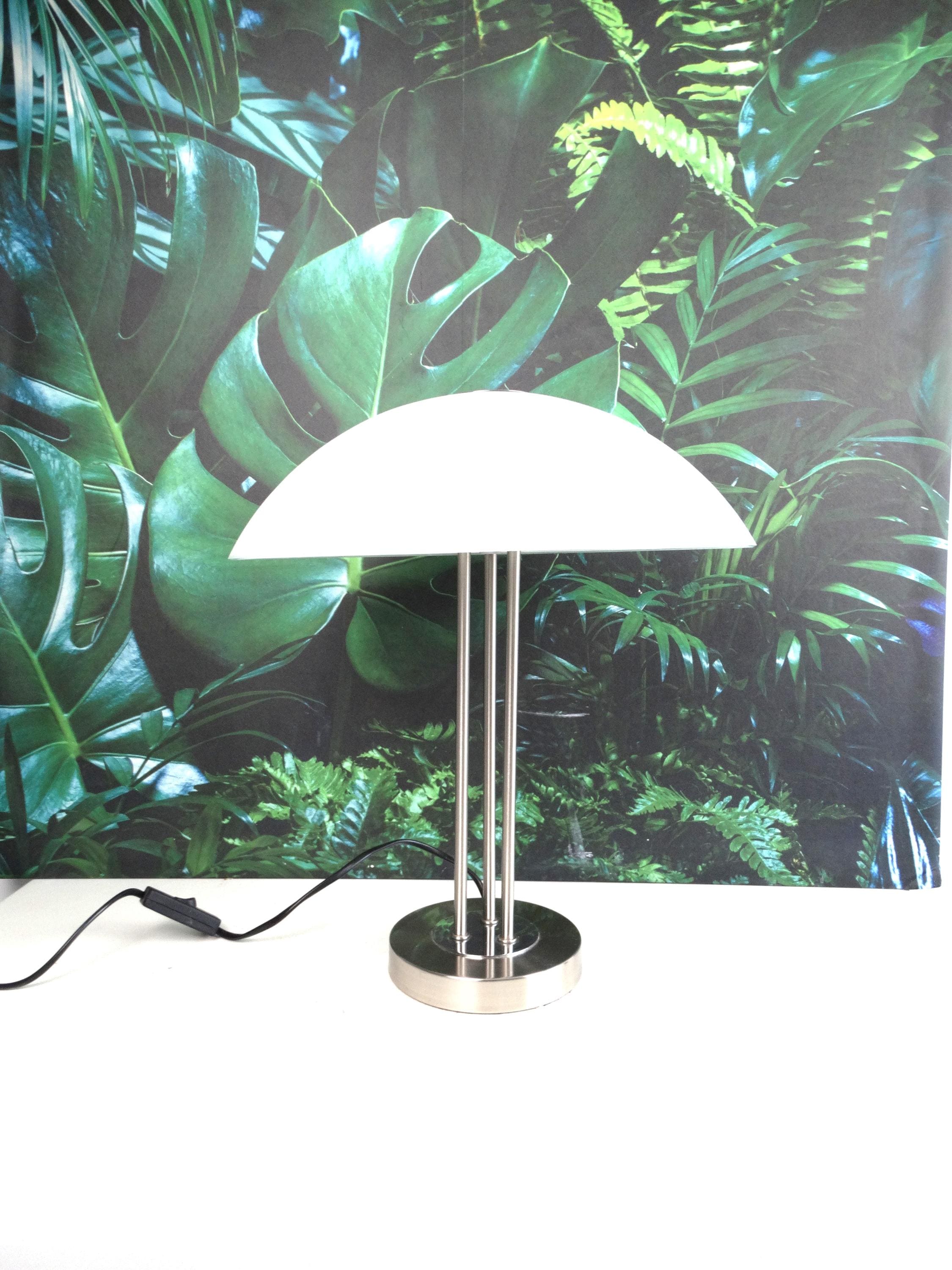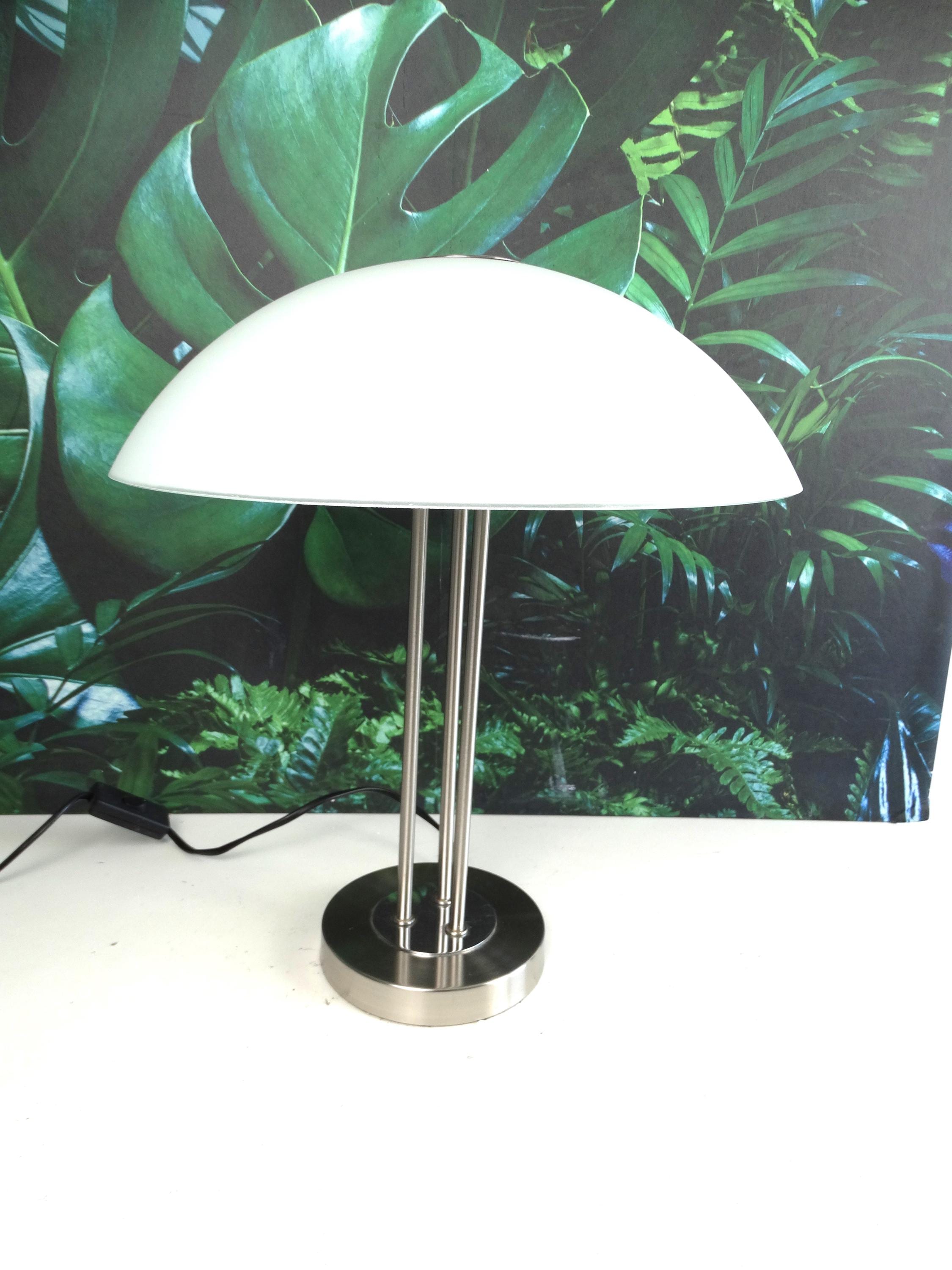 This lamp is made in the mushroom model, the stainless steel stem and the stainless steel base match the frosted glass shade perfectly.