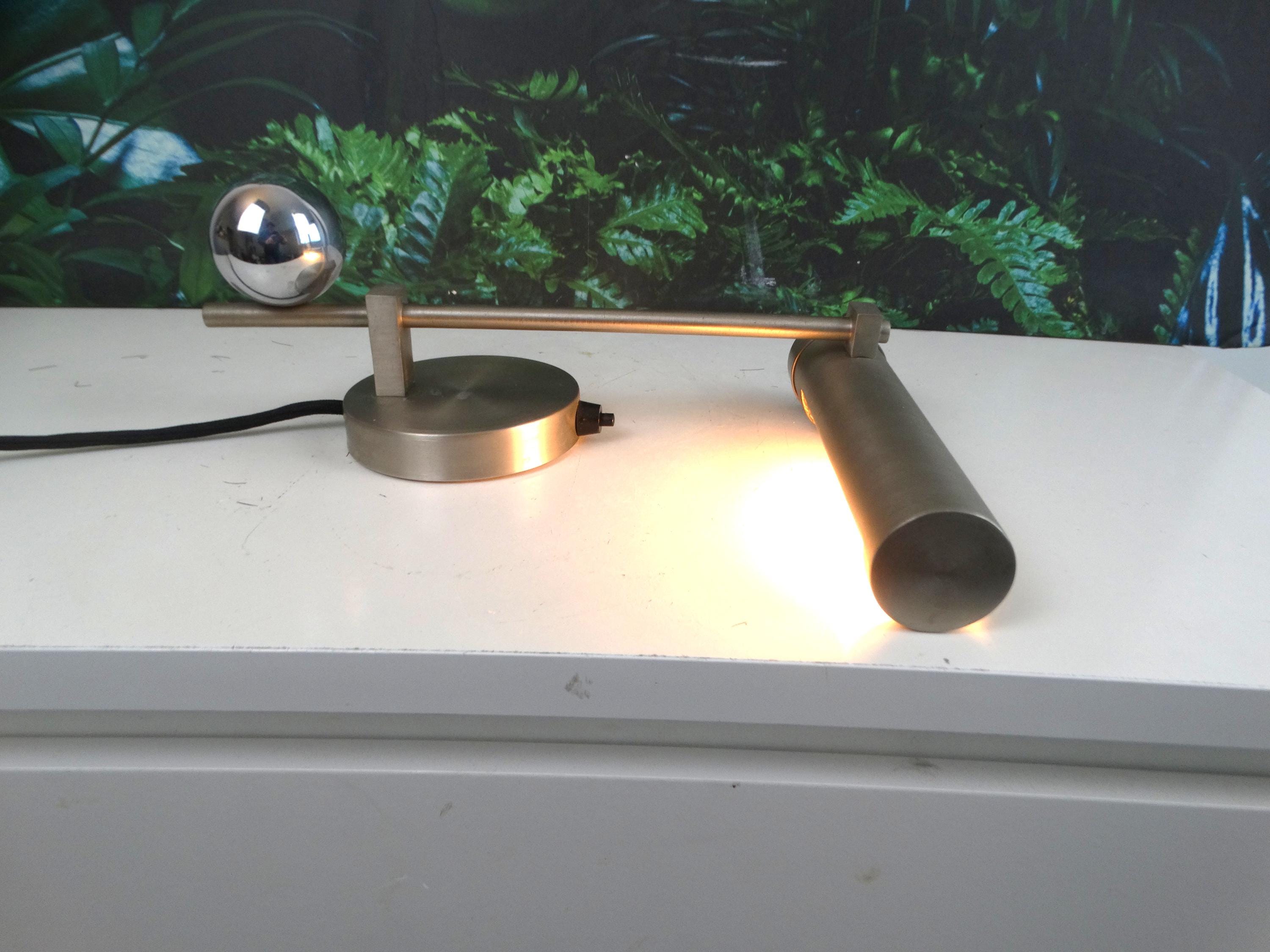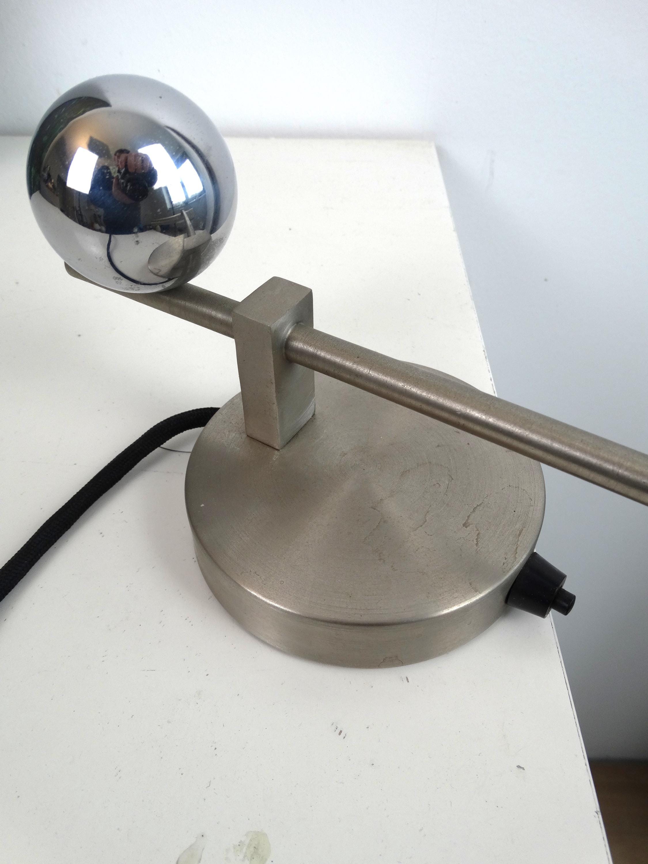 The light fixture was designed by J.J.P. Oud as a unique wedding gift for Dutch painter and ceramist Harm Kamerlingh Onnes and his wife Titia Easton.[1] Its asymmetrical, cantilevered design makes it suitable to be used on top of a piano, illuminating the keyboard and sheet music. The fixture consists of a cylindrical metal tube which contains the lamp, attached to a thin shaft mounted on a flat round base. A spherical counterweight on the other side of the shaft provides balance. The sphere is executed in shiny metal, while the rest of the lamp has a matte metal surface. The whole fixture is 10.6 cm high, 19.5 cm wide and 28.5 cm long.[2]