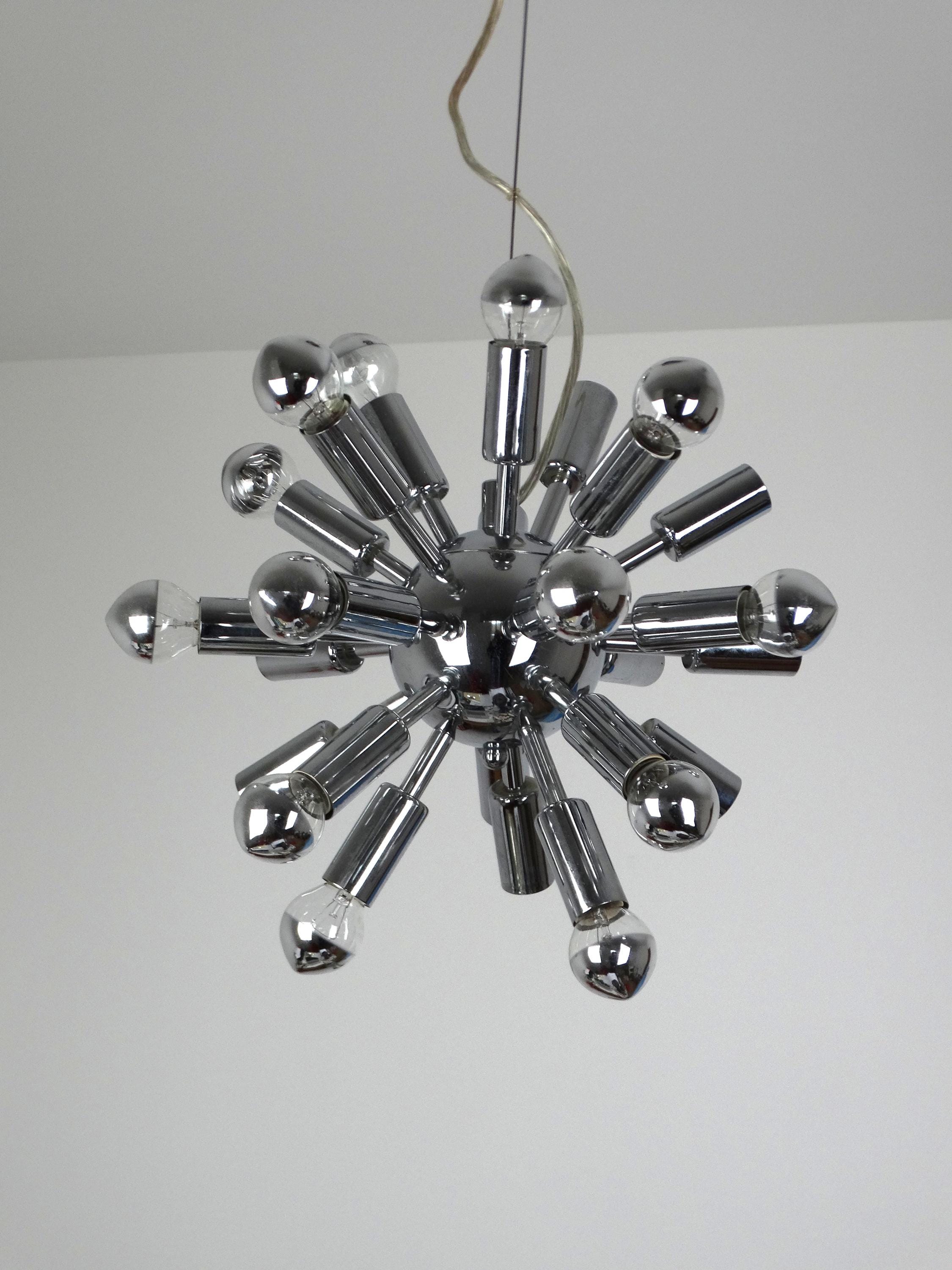 Impressive and heavy atomic or space-age chandelier finished in polished chrome. Designed in the 1960s and 1970s.