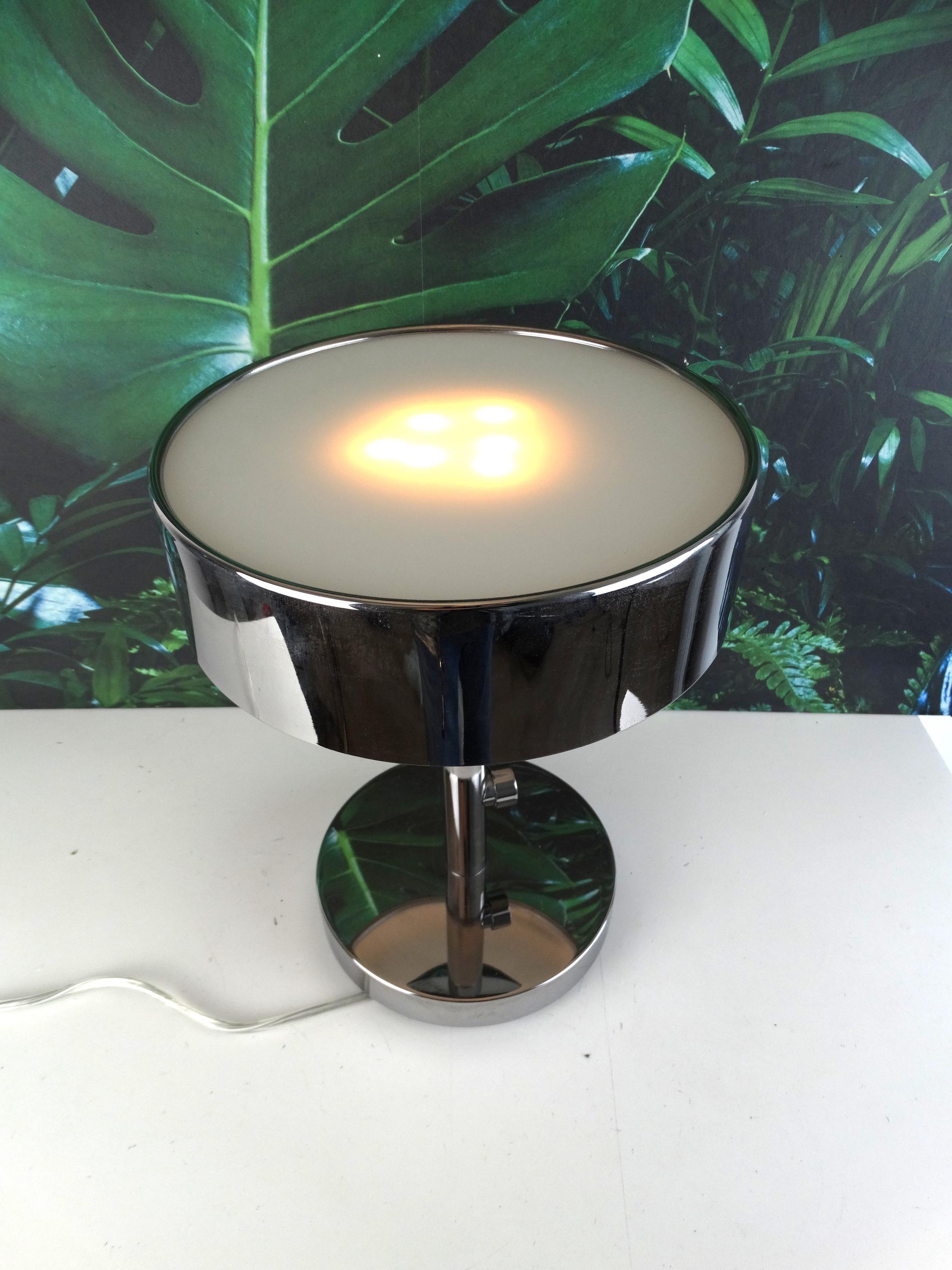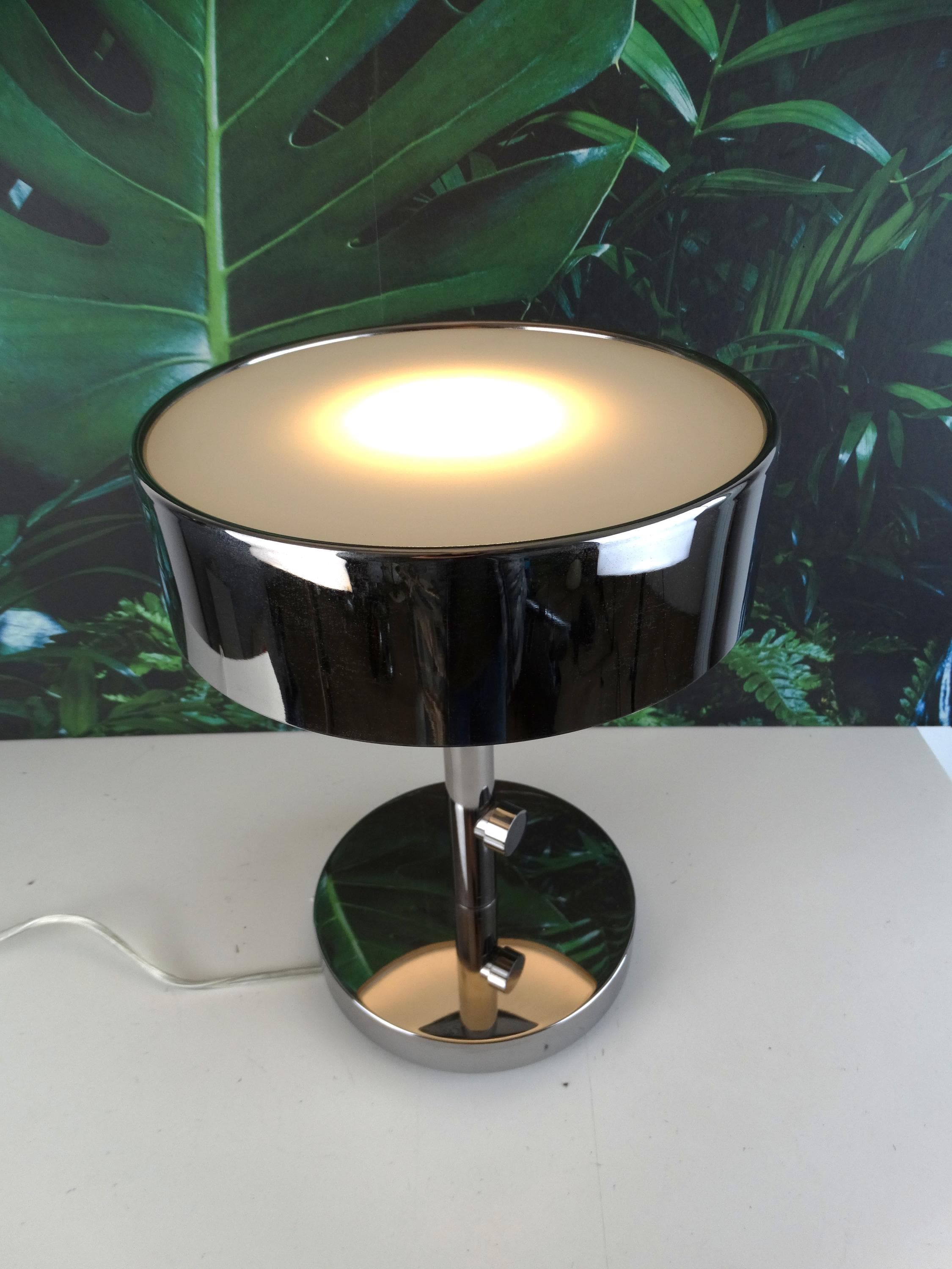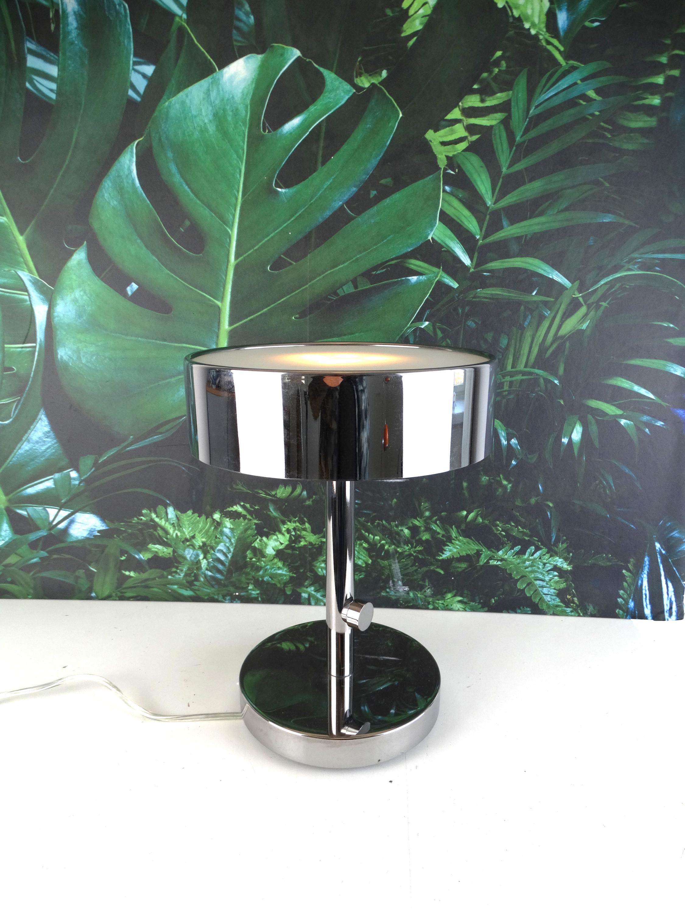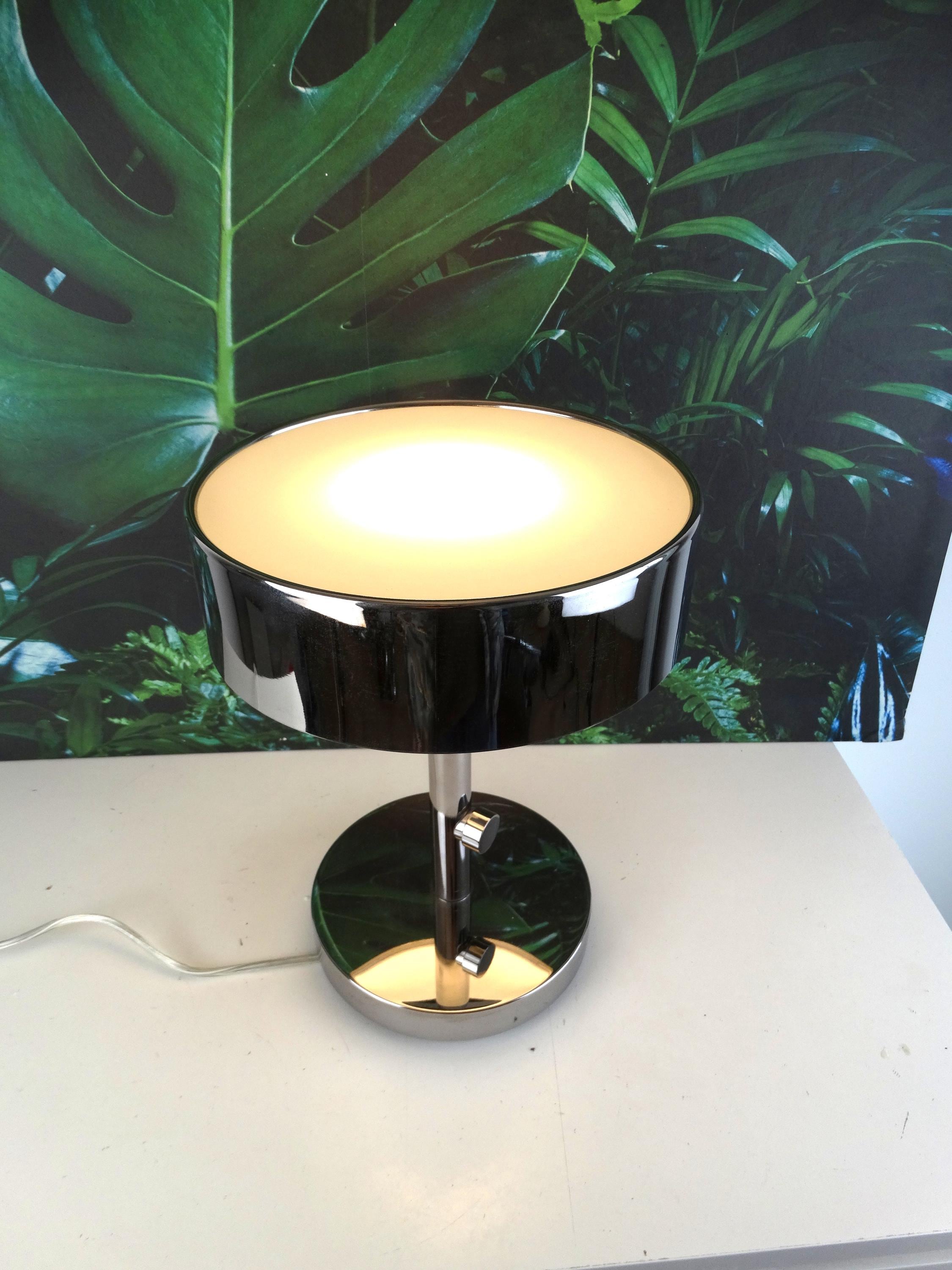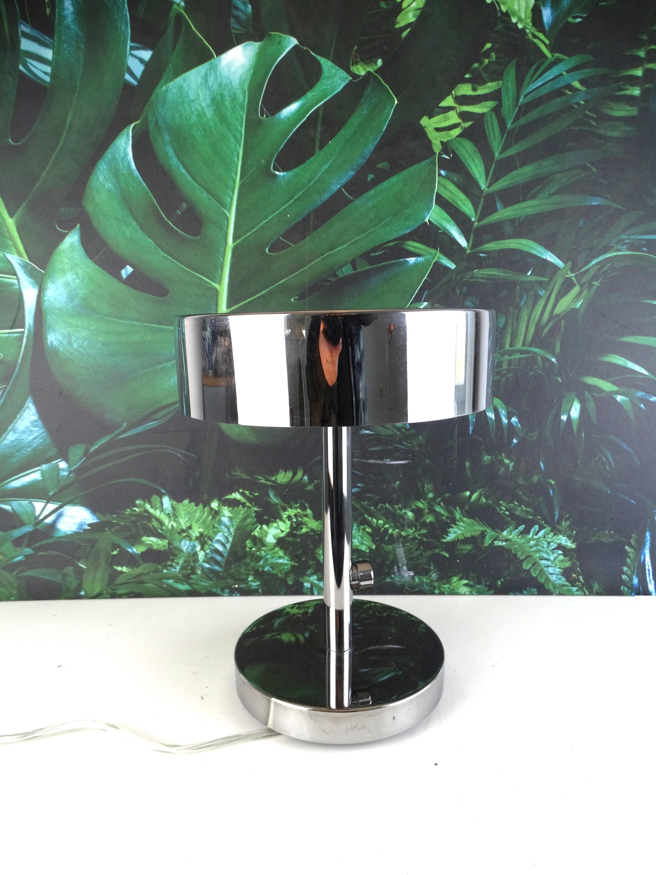 Finished in polished chrome, the lamp reflects its surroundings like a small sculptural object, adding depth and a subtle sheen to any interior. The wide shade softly diffuses the light, creating a warm and atmospheric glow – ideal for a bedside table, console, dresser, or modern office workspace.