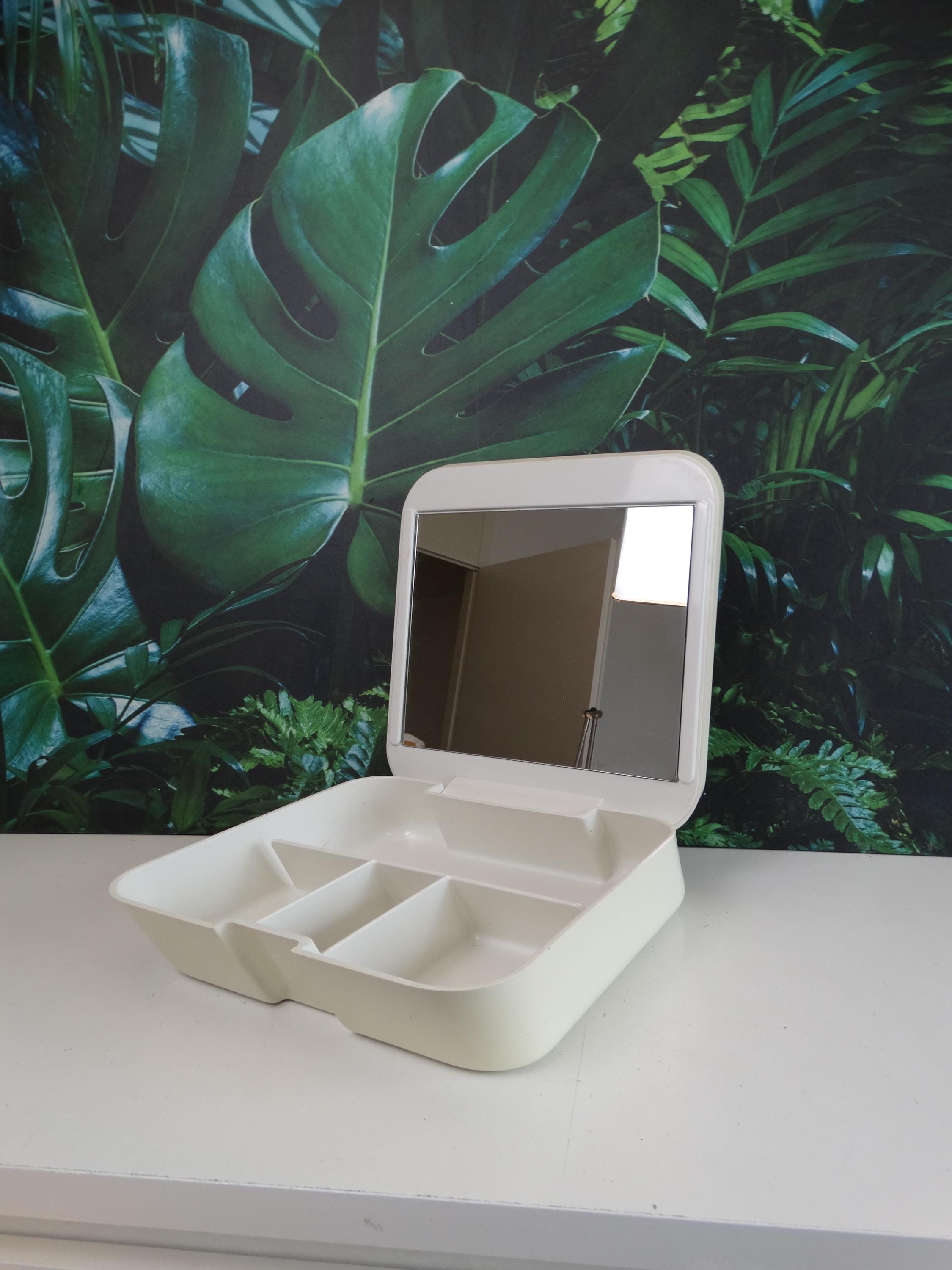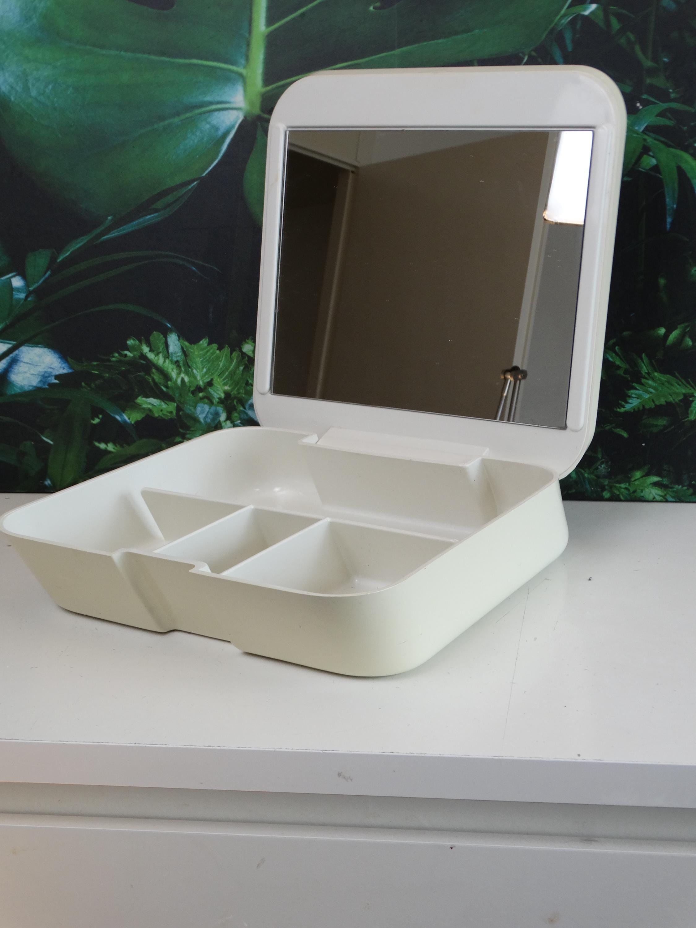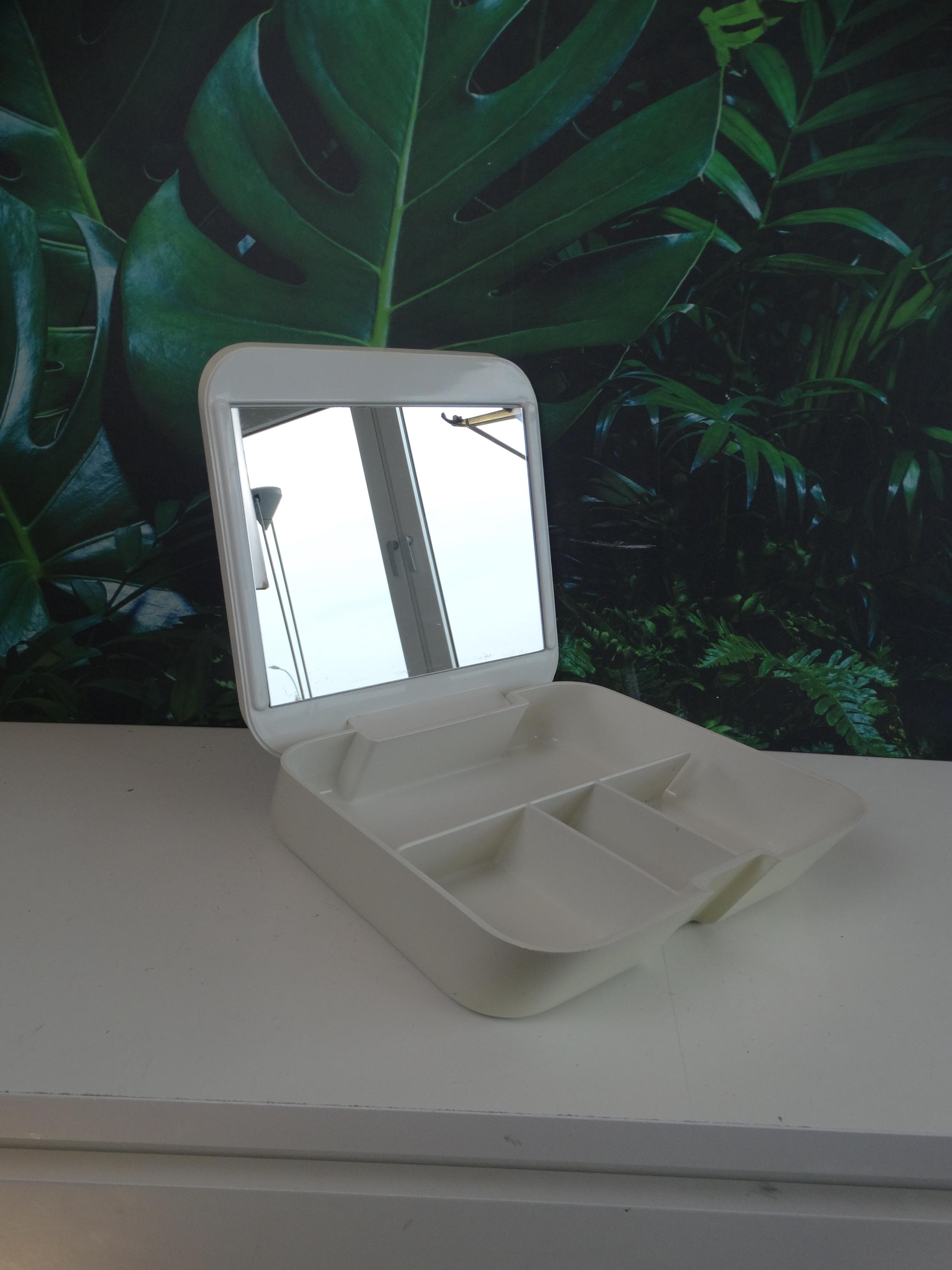 Makeup and jewelry organizer with mirror, manufactured by Gedy Italia and designed by Makio Hasuike. 1970s/80s. Material: plastic. Dimensions: width 25 cm, depth 29 cm, height 7 cm. In good aesthetic condition. Shows normal signs of wear and age. No cracks or breaks. Mirror in excellent condition.