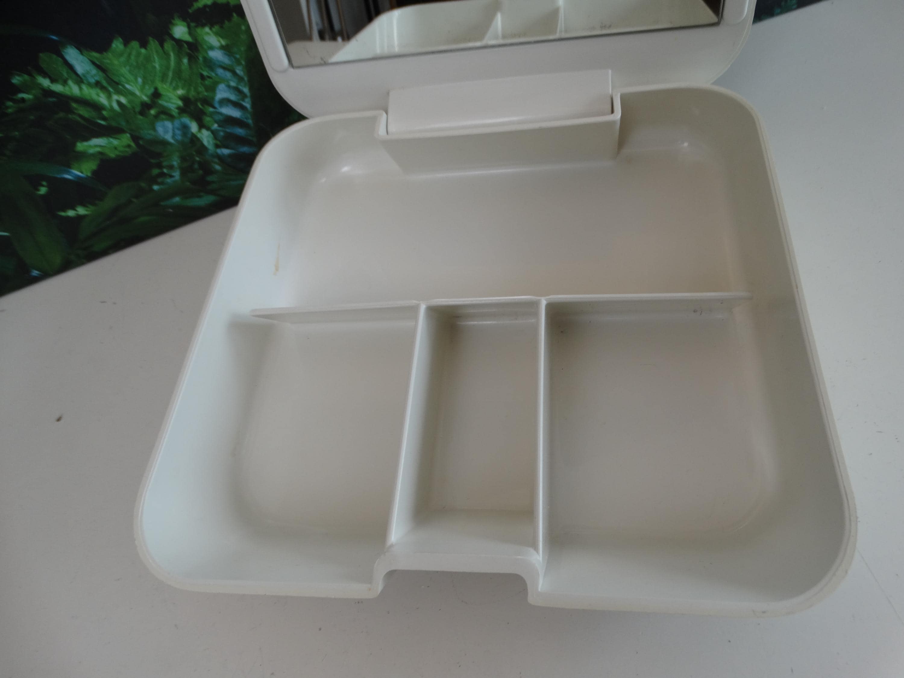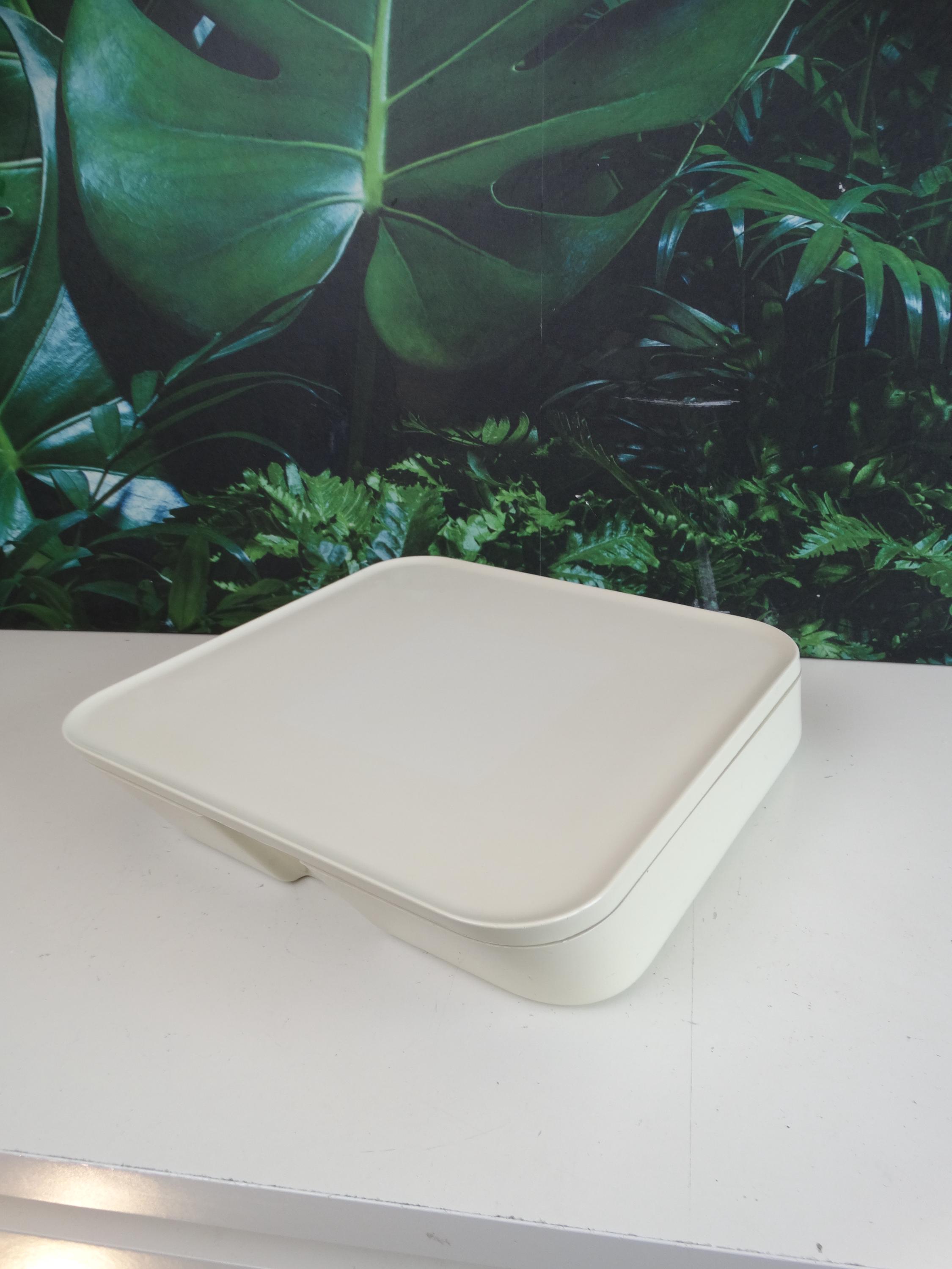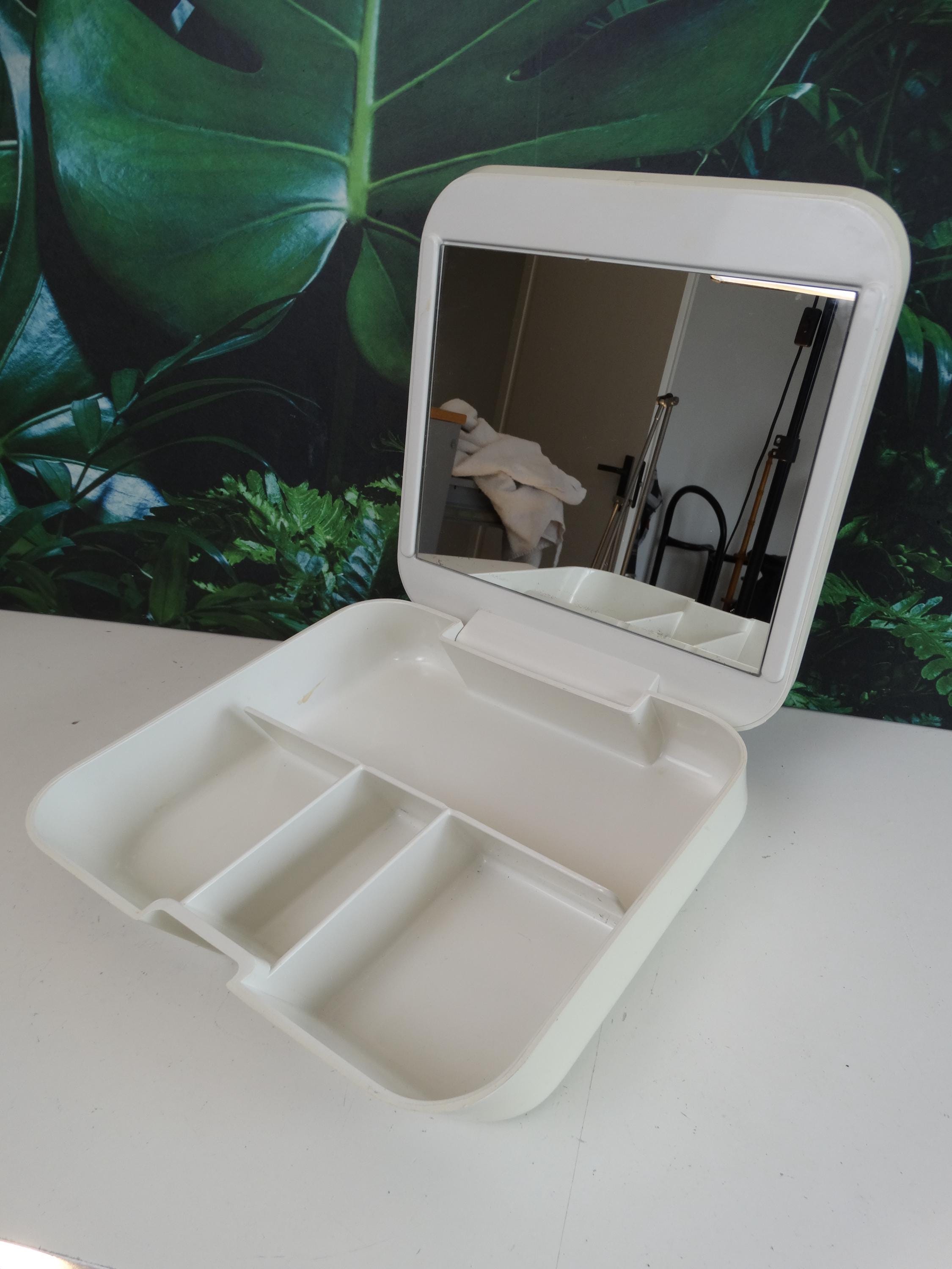 Makeup and jewelry organizer with mirror, manufactured by Gedy Italia and designed by Makio Hasuike. 1970s/80s. Material: plastic. Dimensions: width 25 cm, depth 29 cm, height 7 cm. In good aesthetic condition. Shows normal signs of wear and age. No cracks or breaks. Mirror in excellent condition.