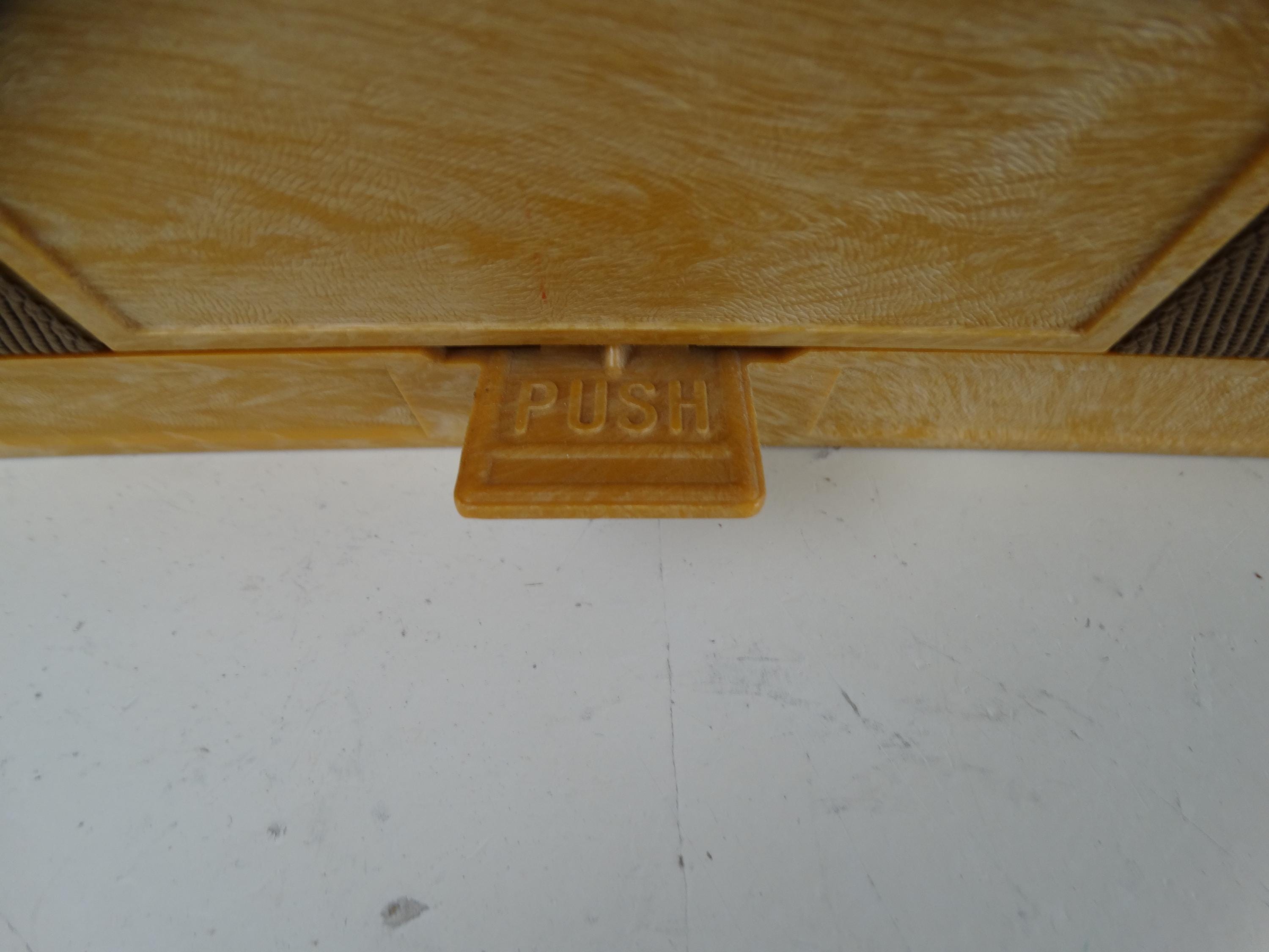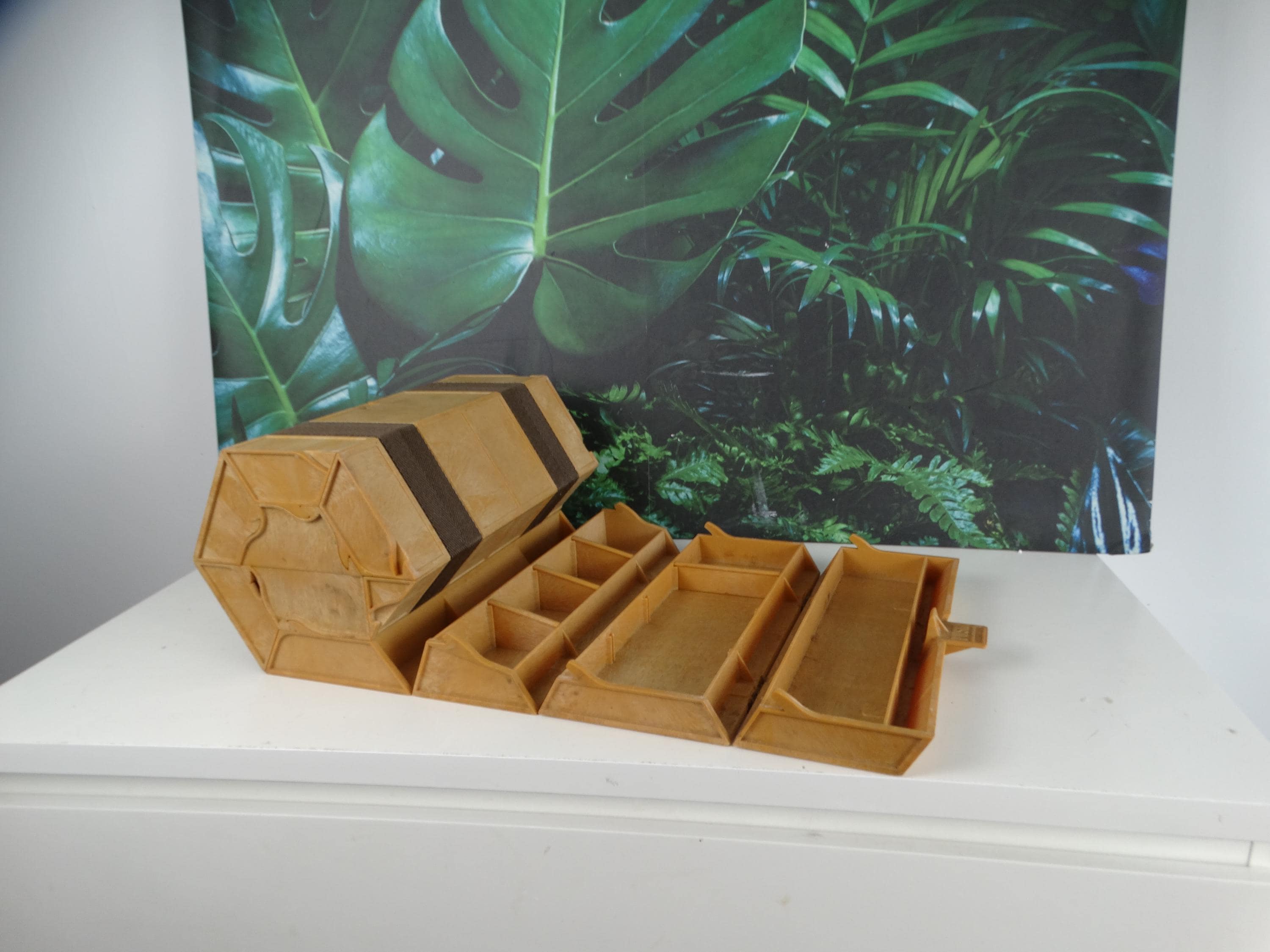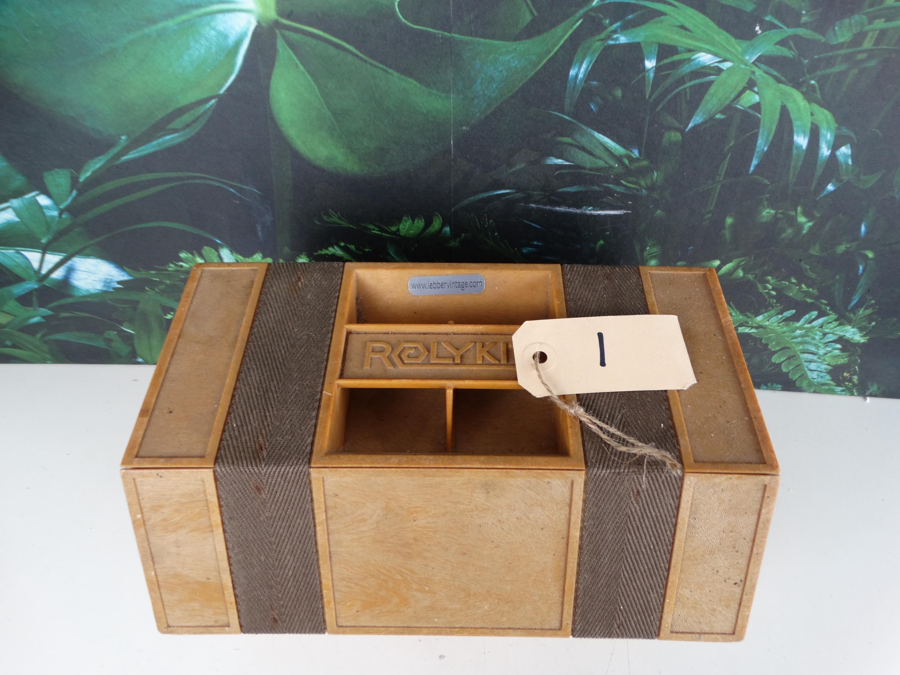 Here's a great Rolykit Roll-up Storage Box from the 1980s. It rolls out into this long strip of compartments. It's brown. Other than that, it's in good condition and has a handle for easy carrying. This piece would help keep all your goodies organized! In excellent condition!