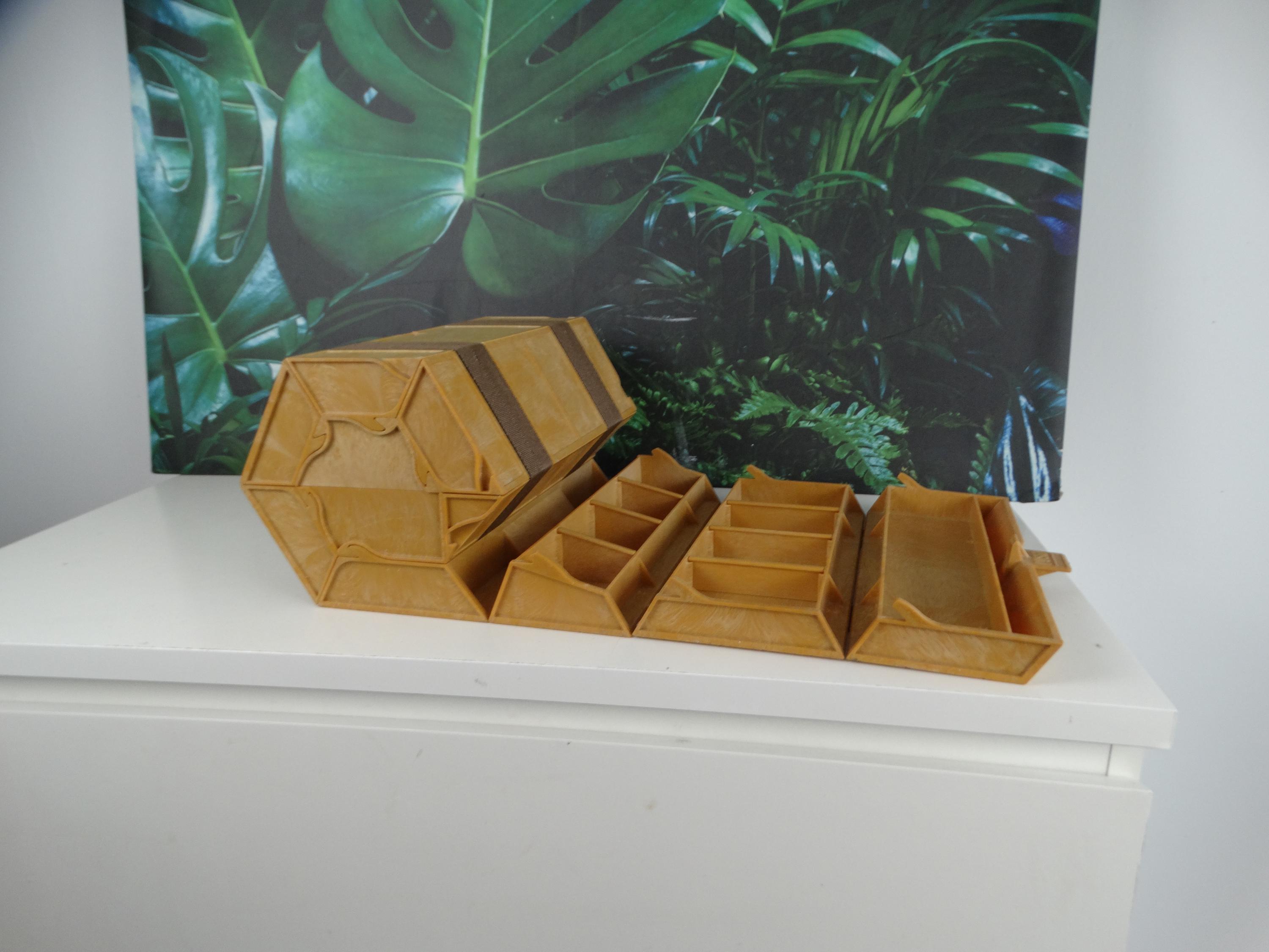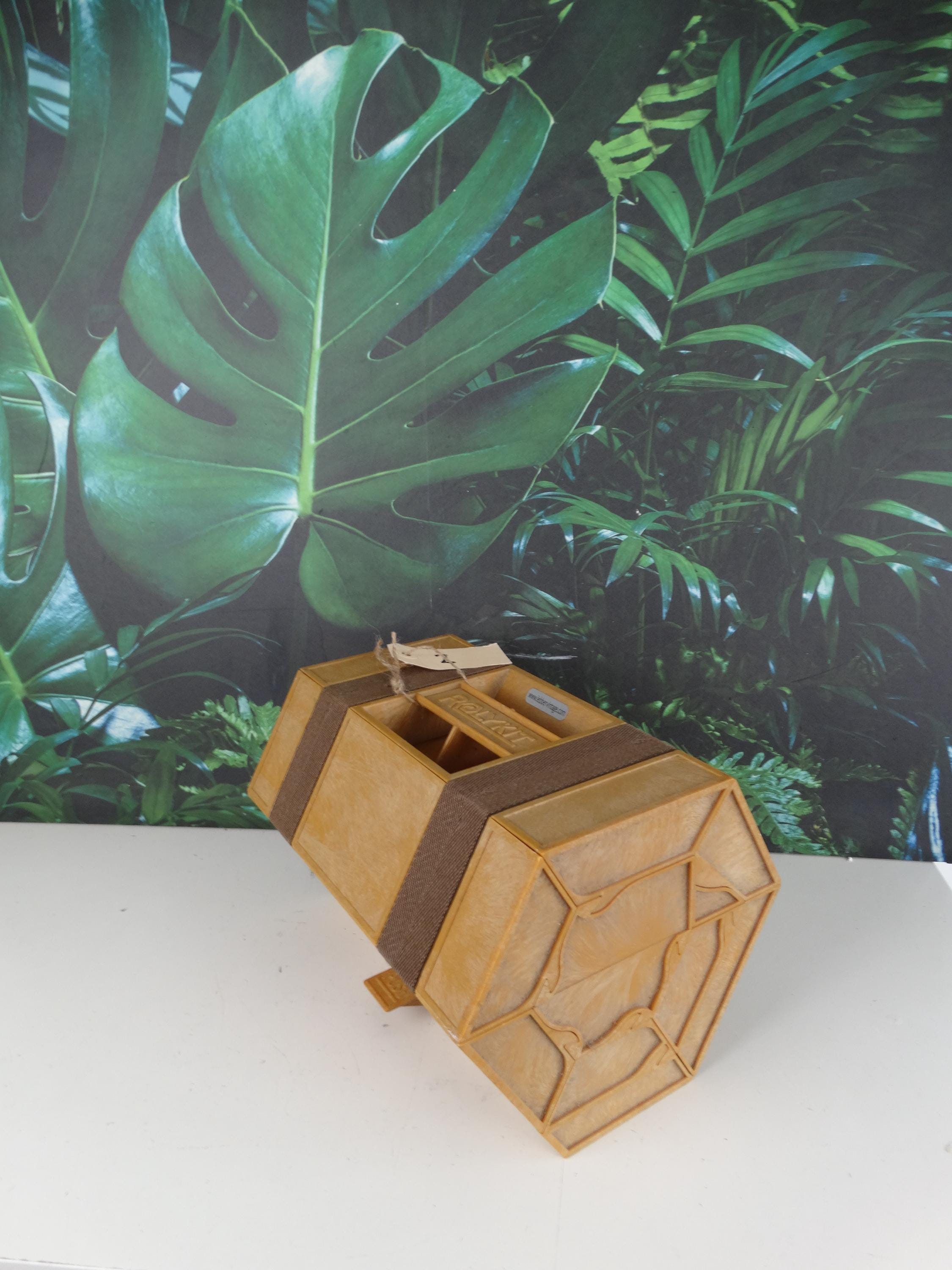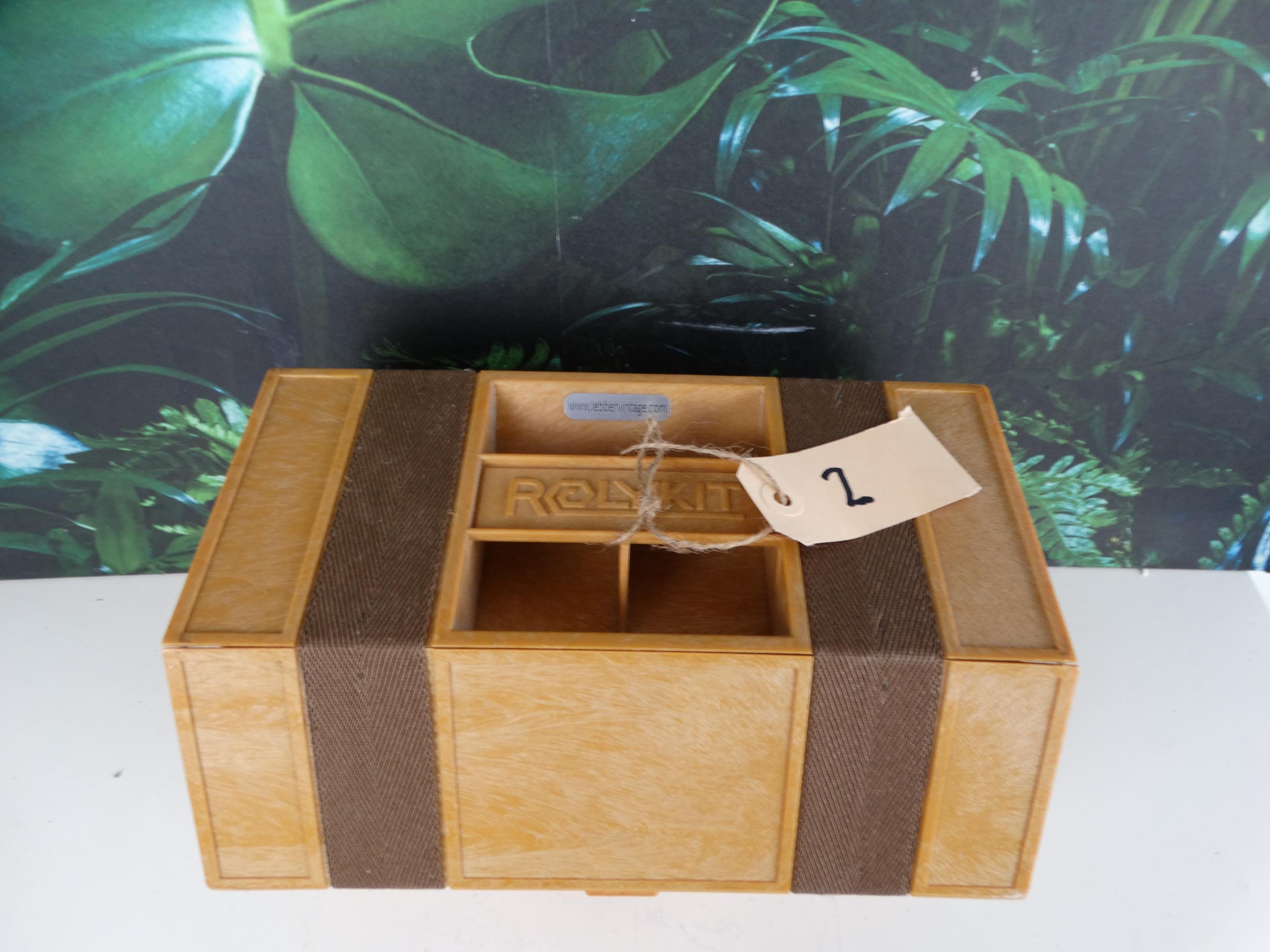 Here's a great Rolykit Roll-up Storage Box from the 1980s. It rolls out into this long strip of compartments. It's brown. Other than that, it's in good condition and has a handle for easy carrying. This piece would help keep all your goodies organized! In excellent condition!
