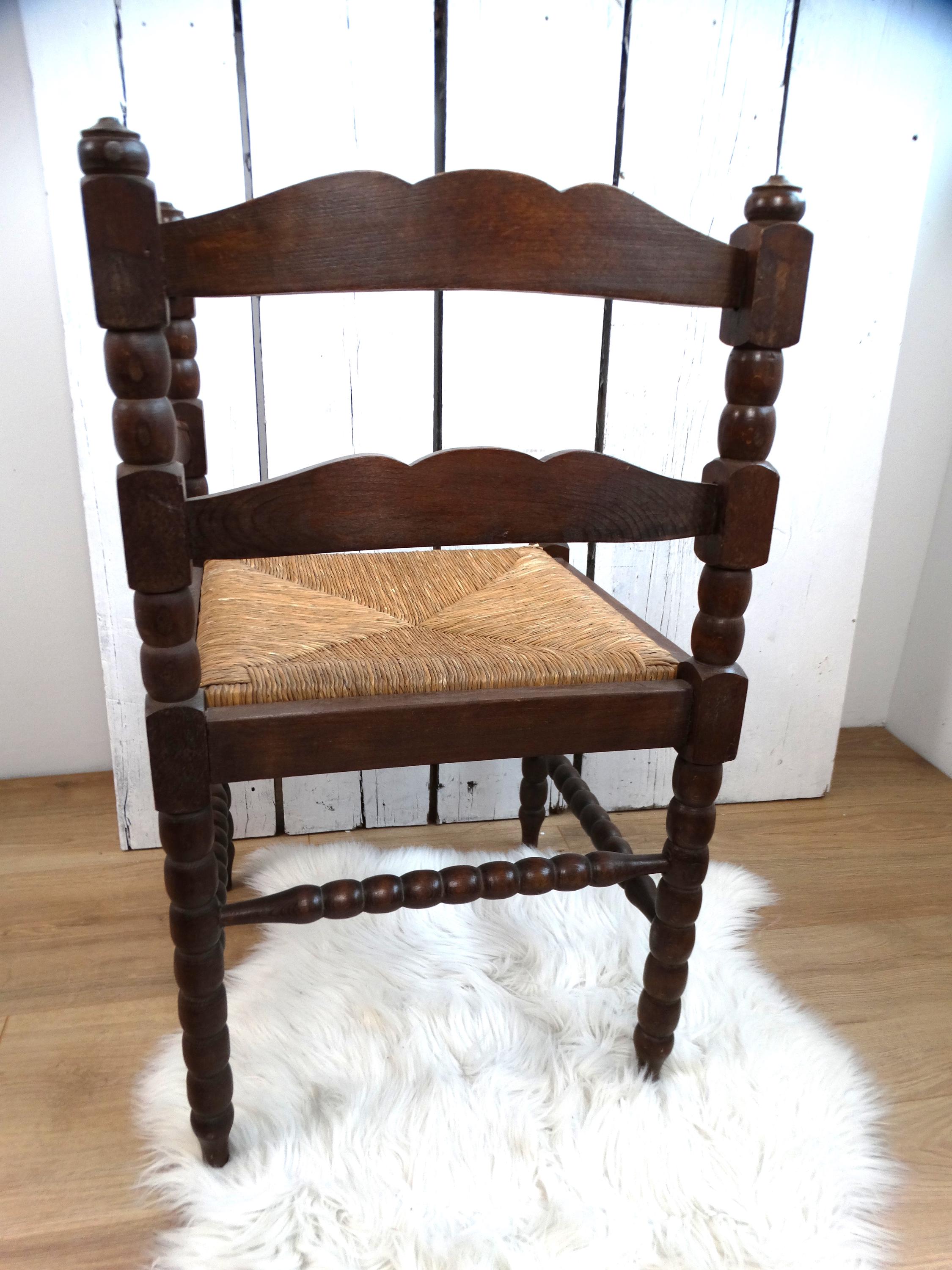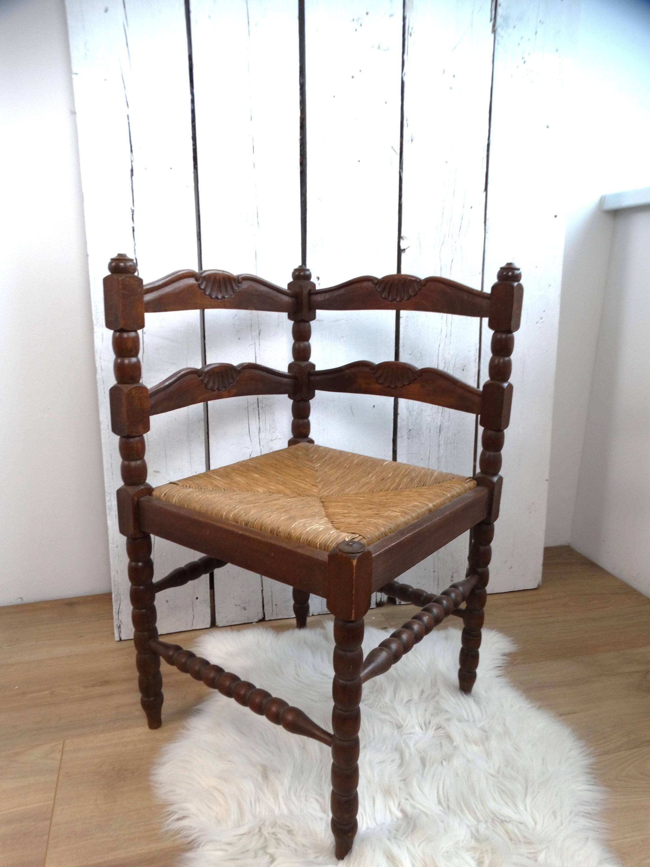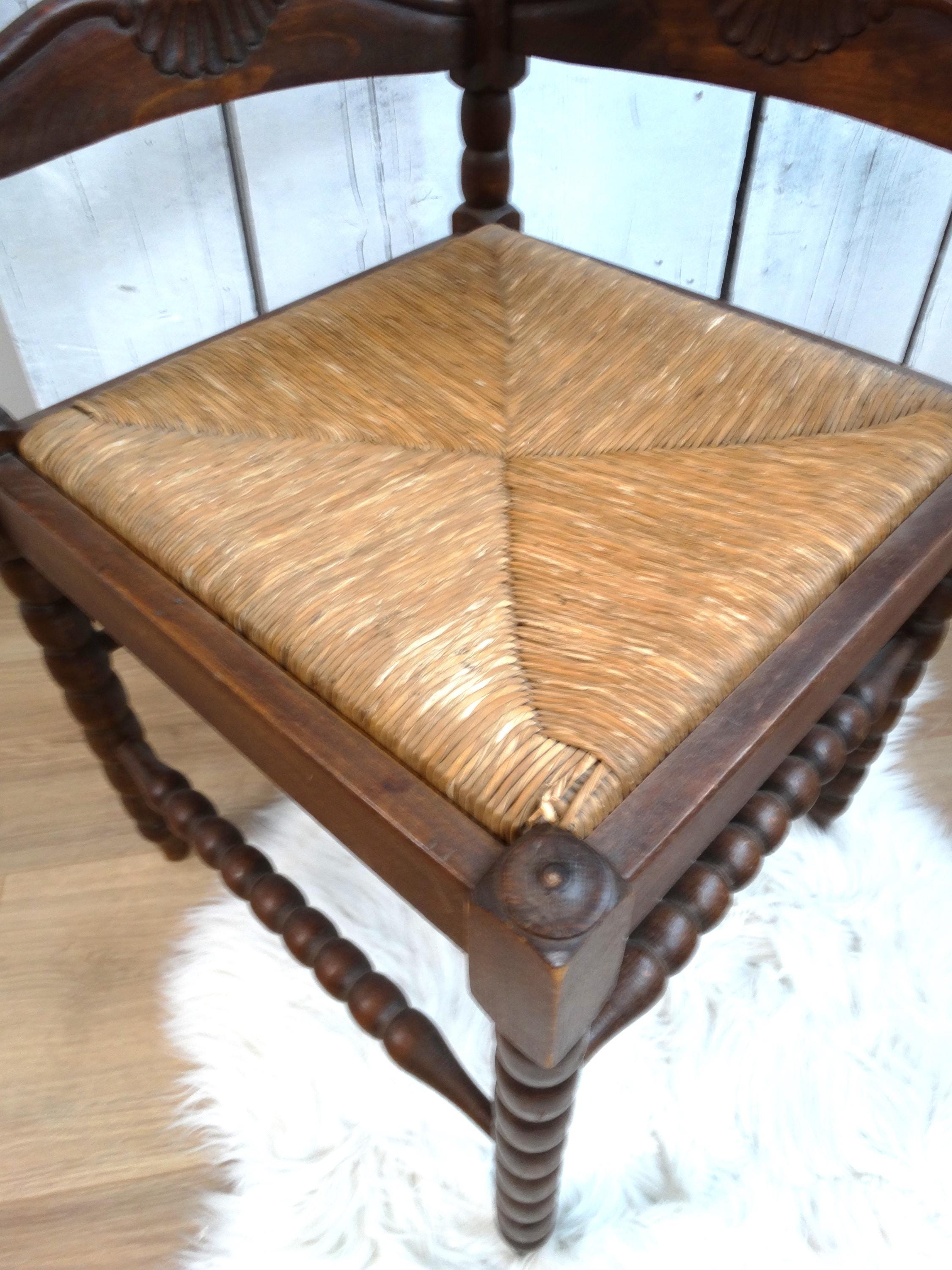 Bobbin Chair from the 1920s with a rush seat. At least 100 years old, this corner chair features a wicker seat and hand-turned legs. Also known as the Bobbin chair. In very good condition! Made in the Netherlands.