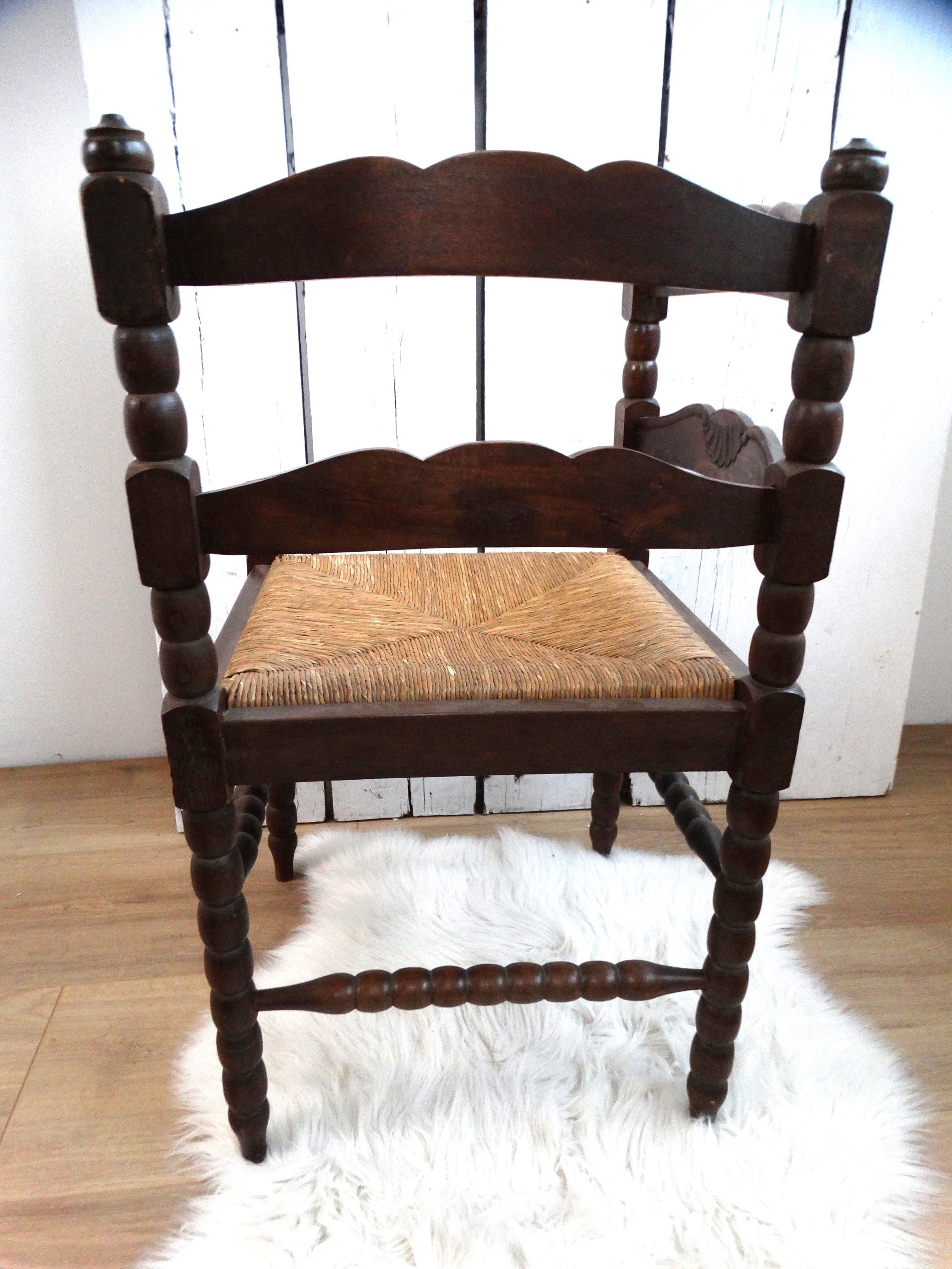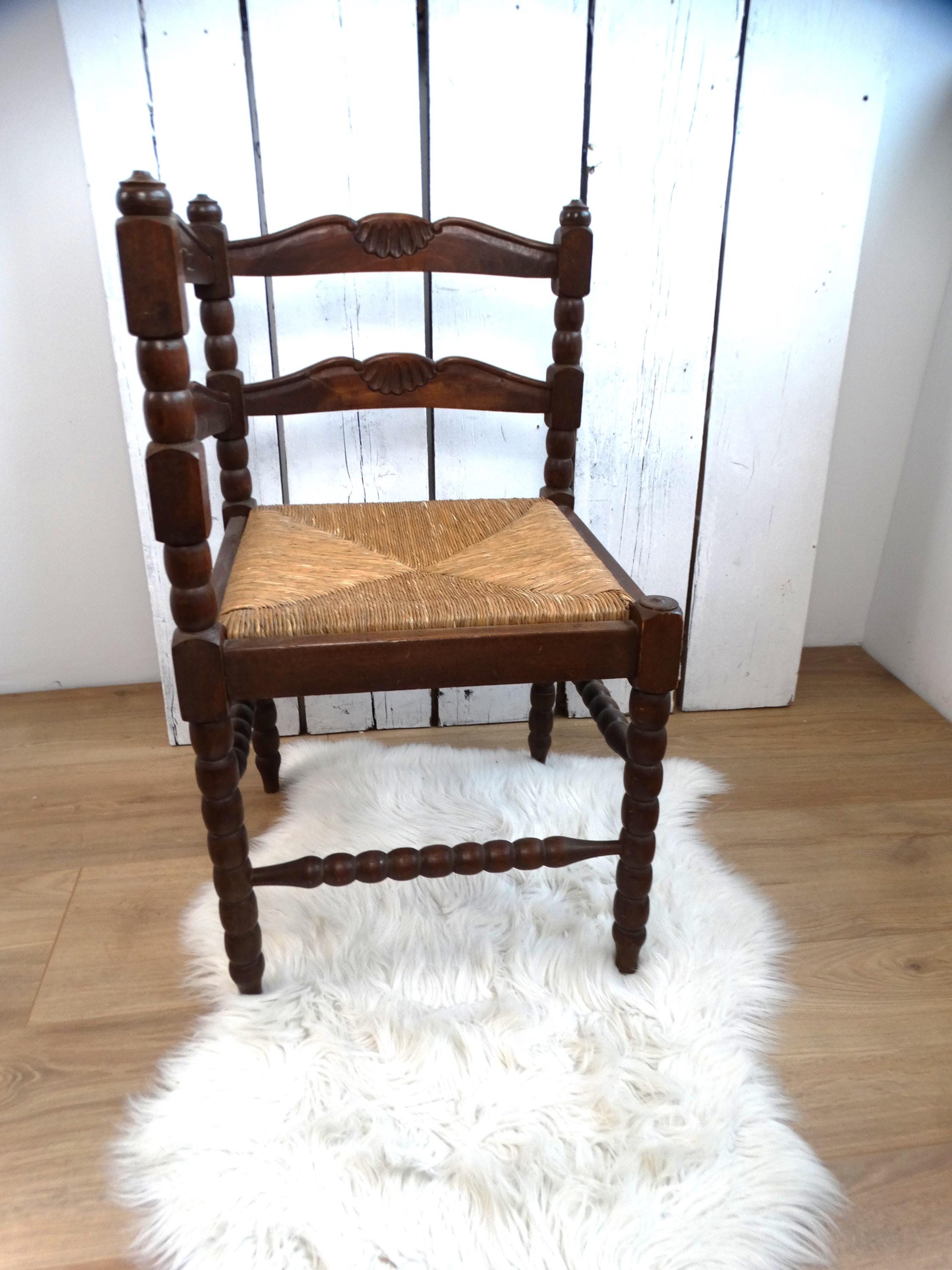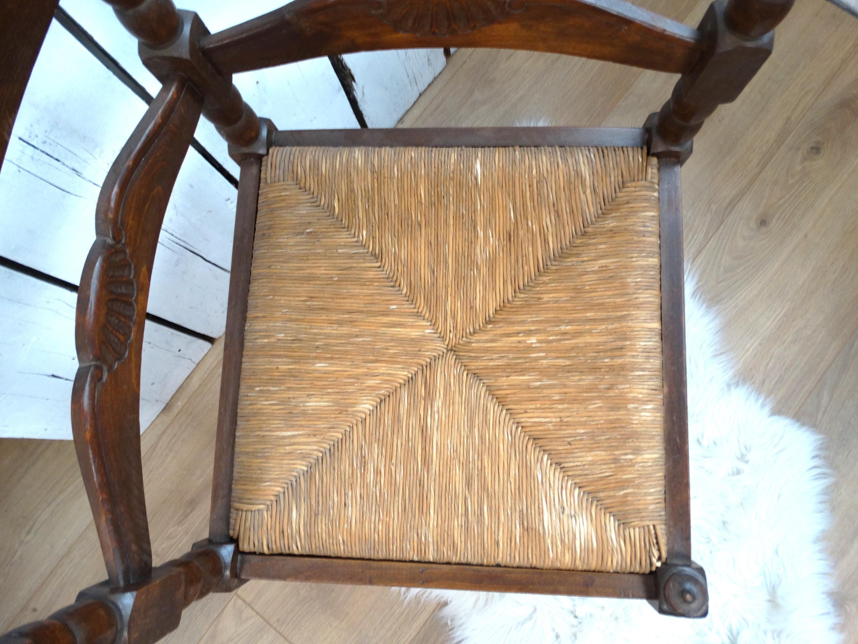Bobbin Chair from the 1920s with a rush seat. At least 100 years old, this corner chair features a wicker seat and hand-turned legs. Also known as the Bobbin chair. In very good condition! Made in the Netherlands.
