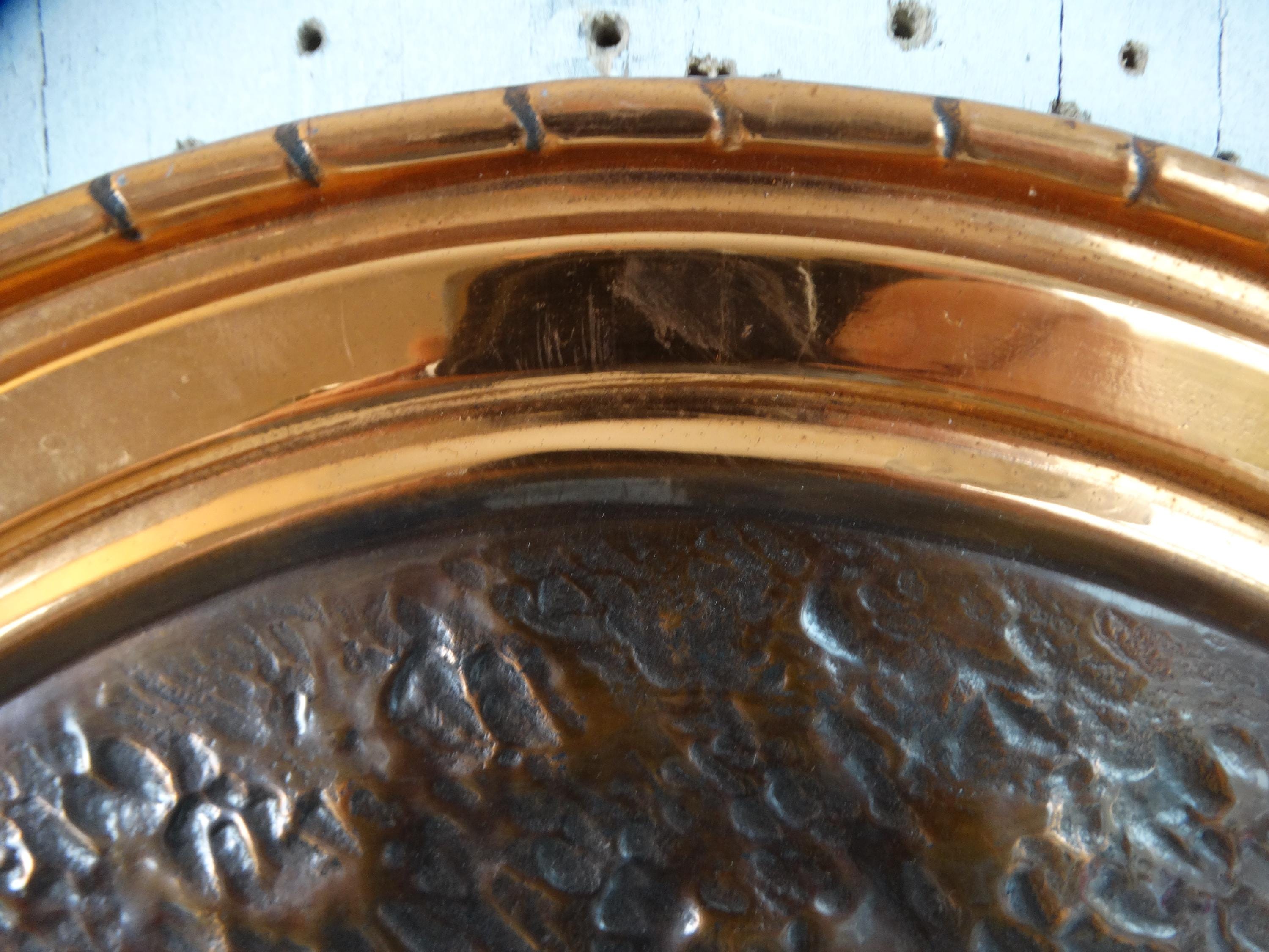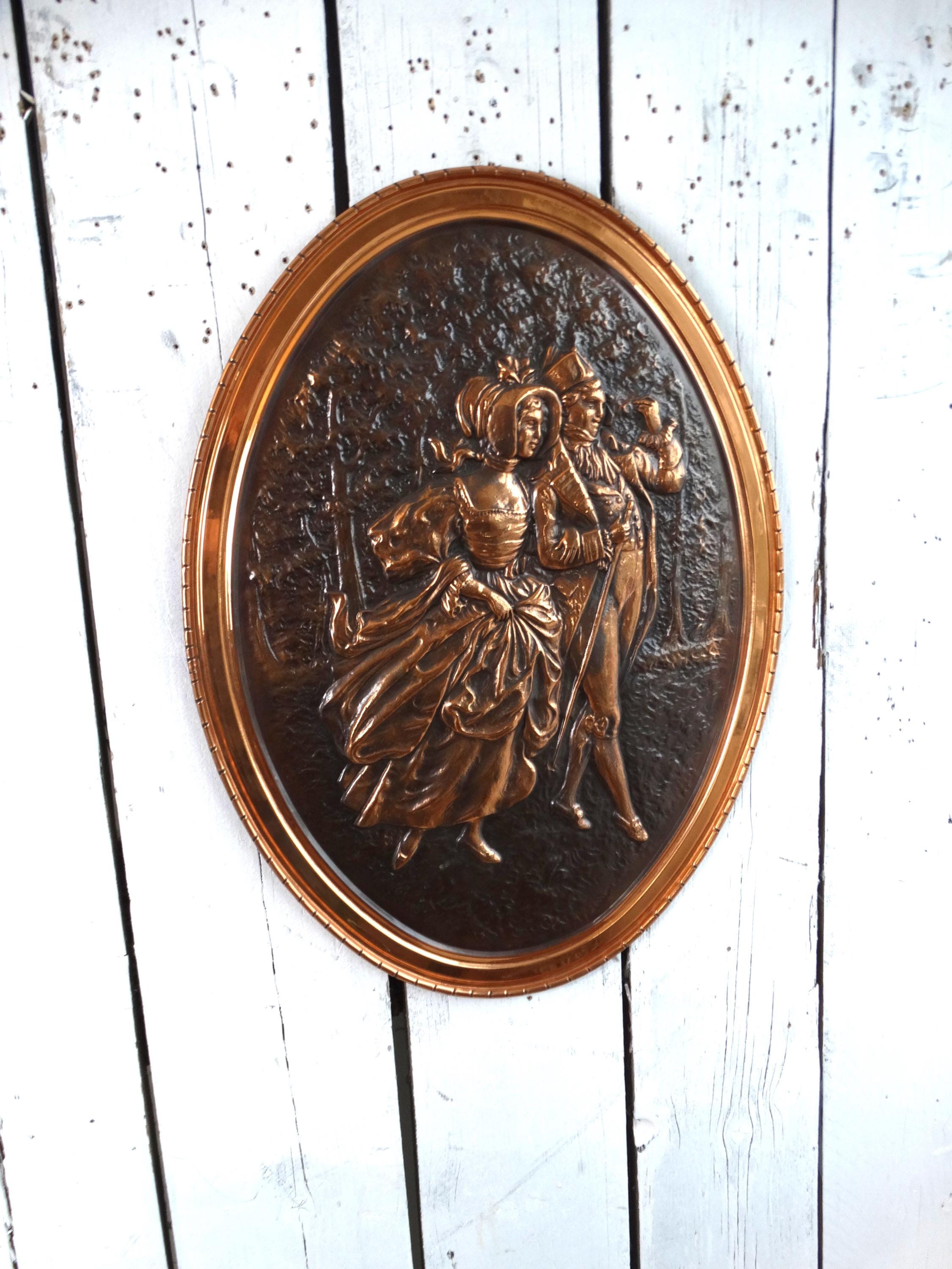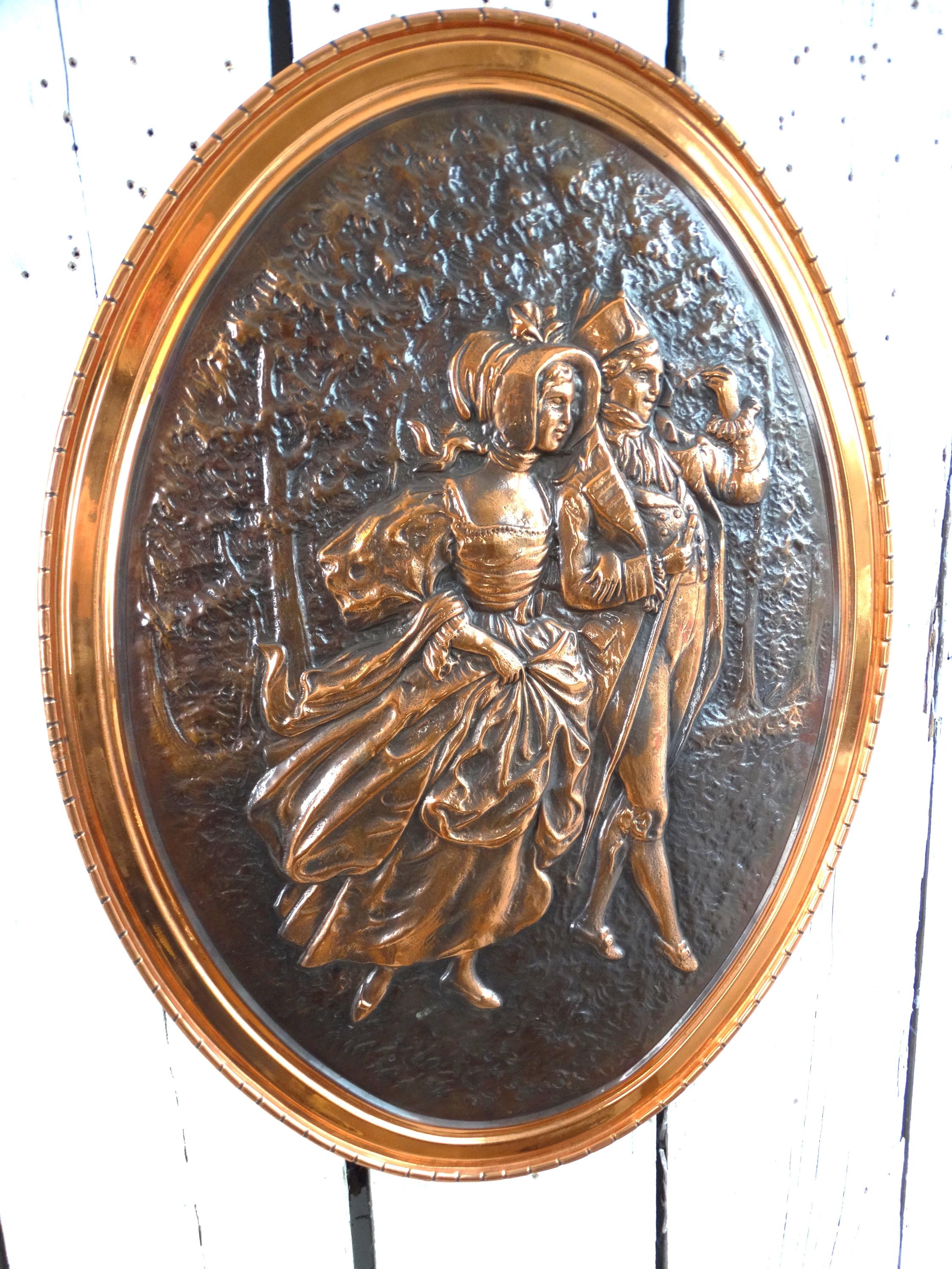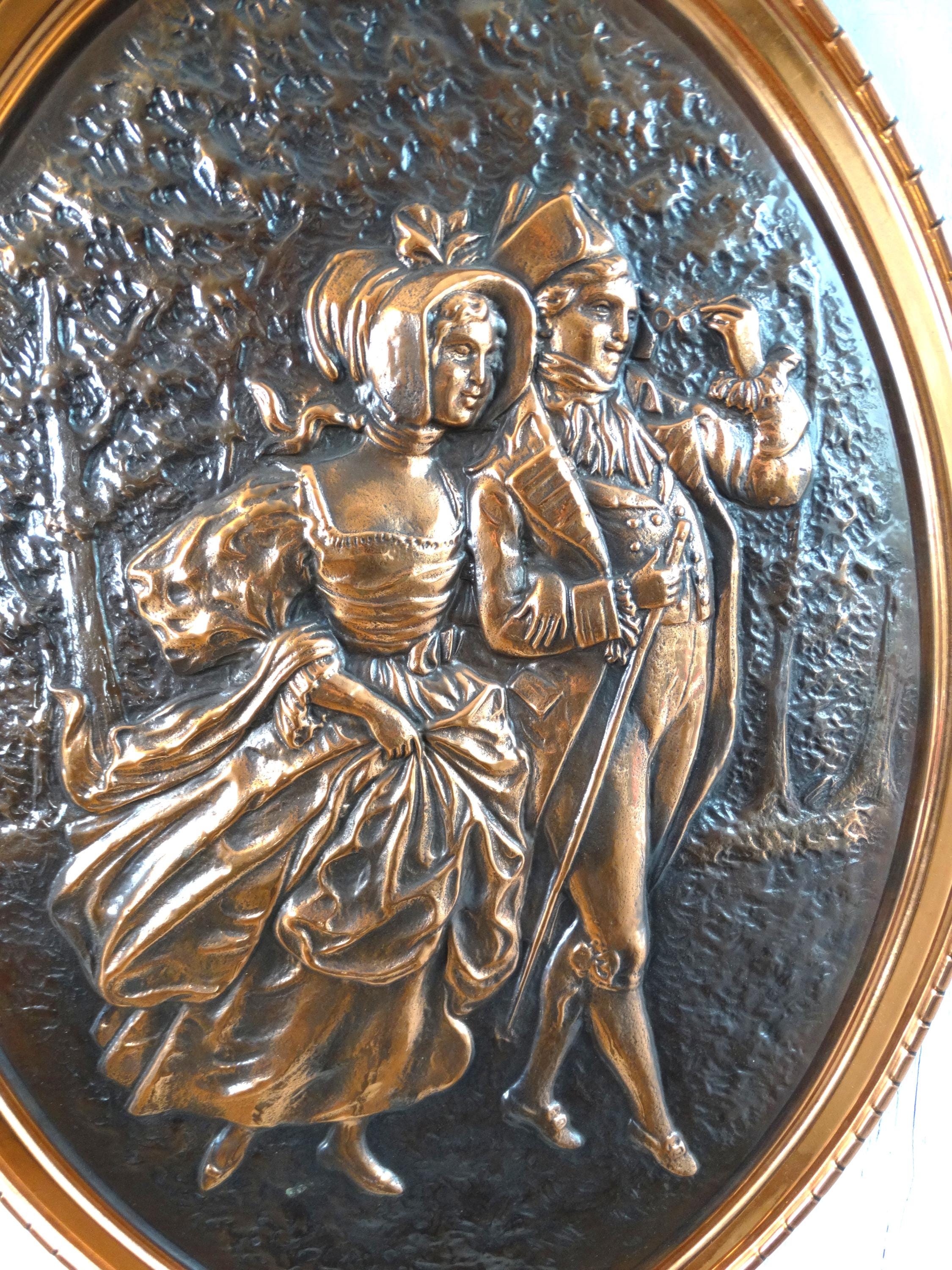 A beautiful antique French relief copper panel from the 19th century. The Victorian copperwork depicts a romantic scene of a wealthy couple strolling.