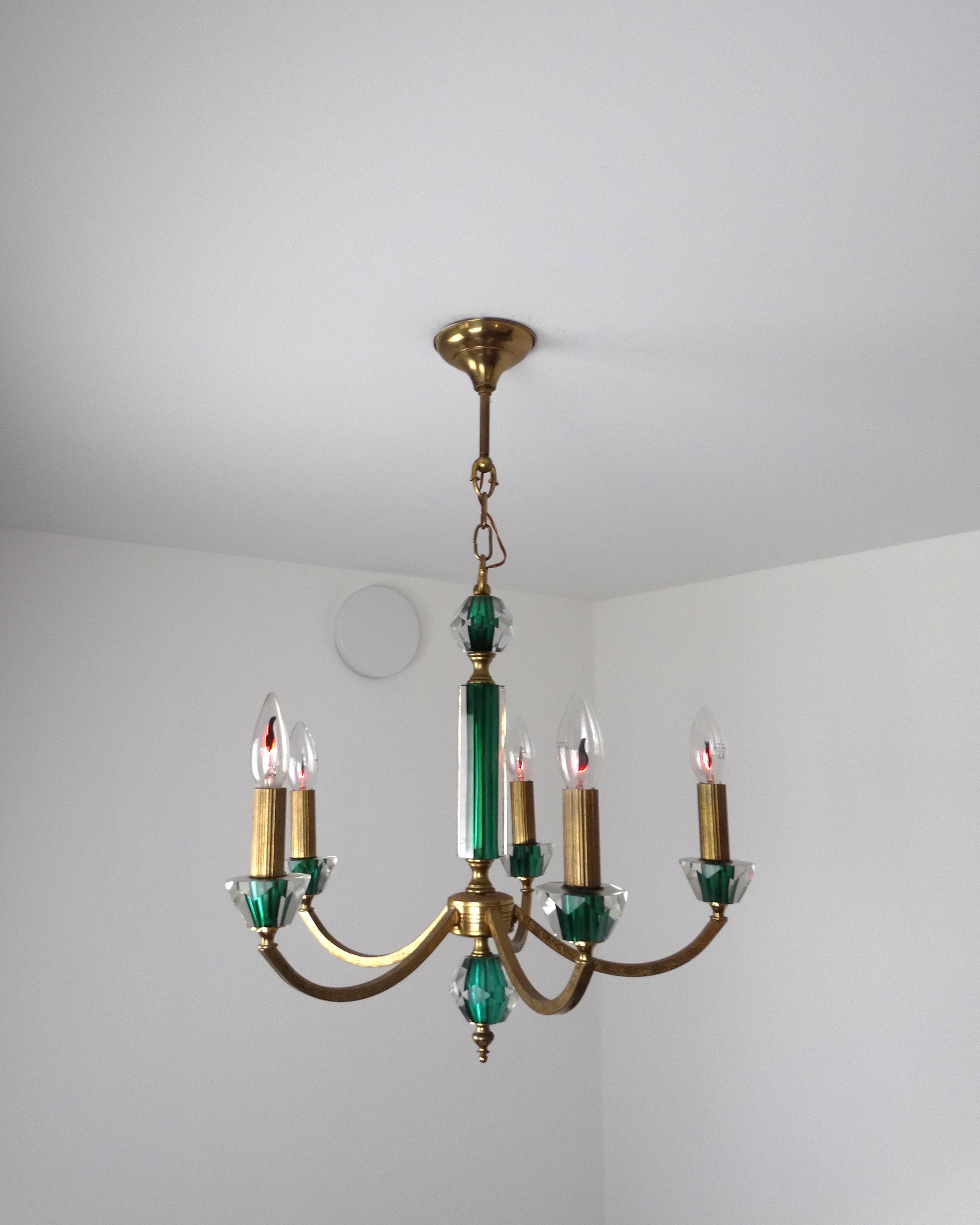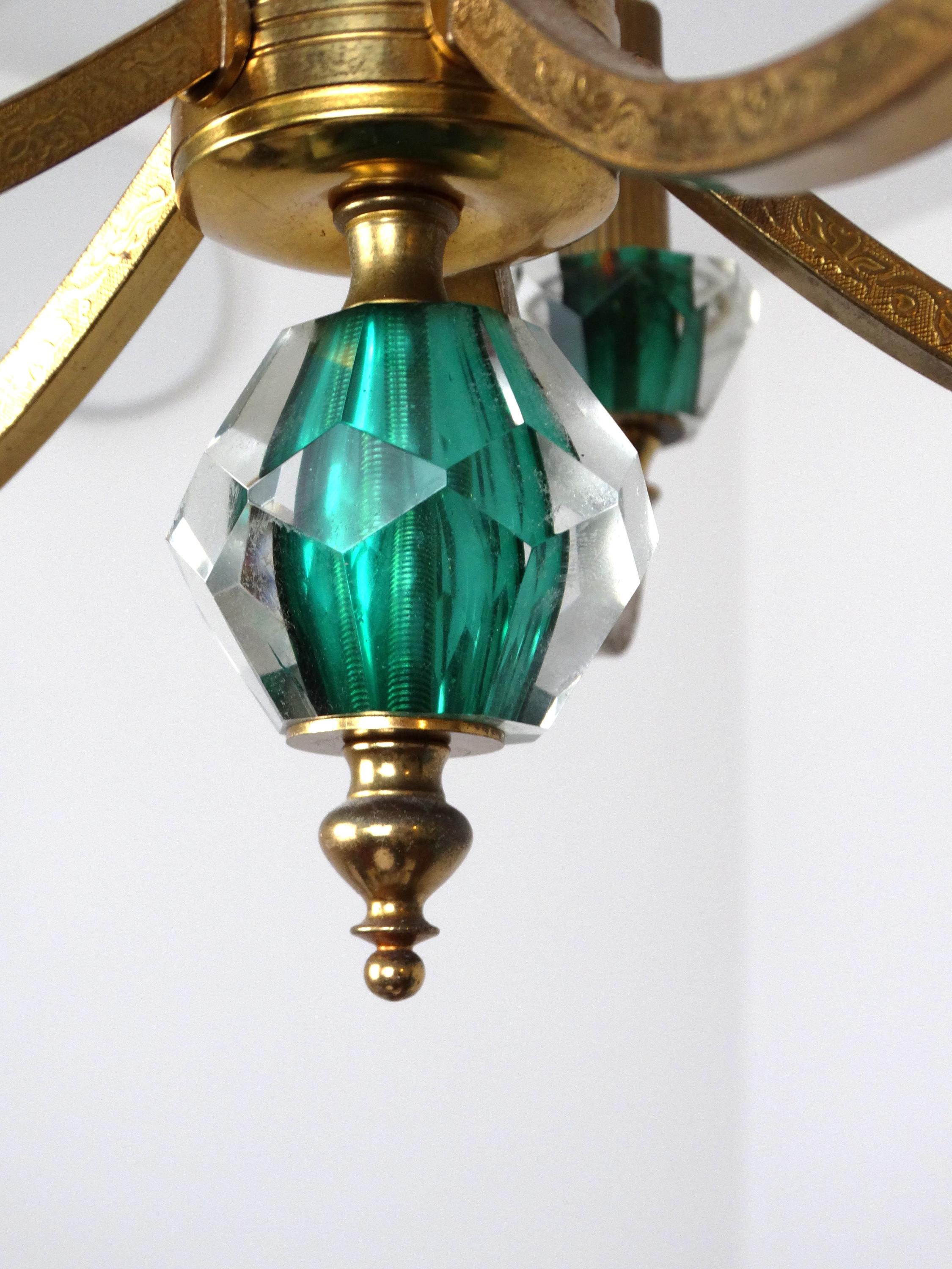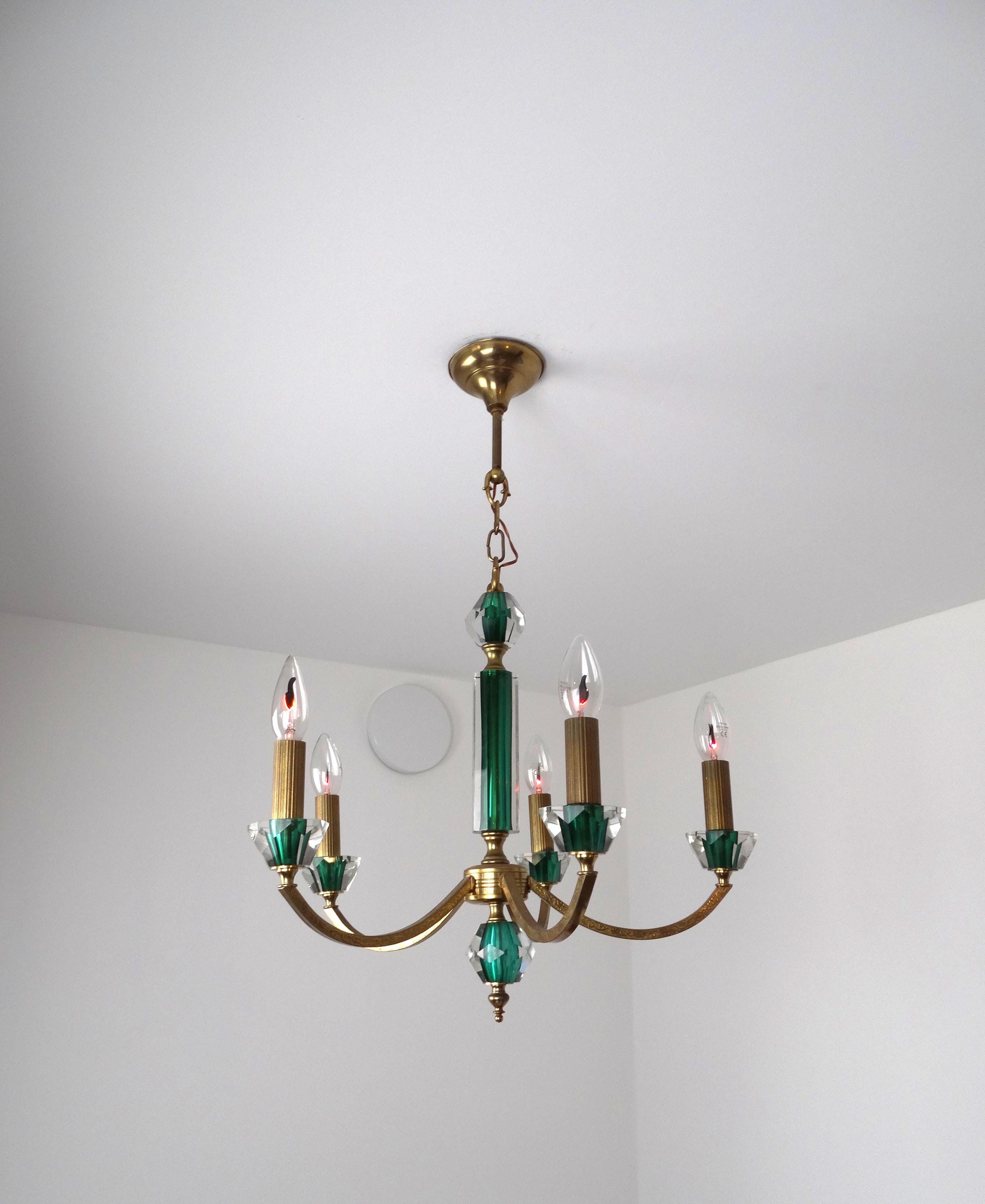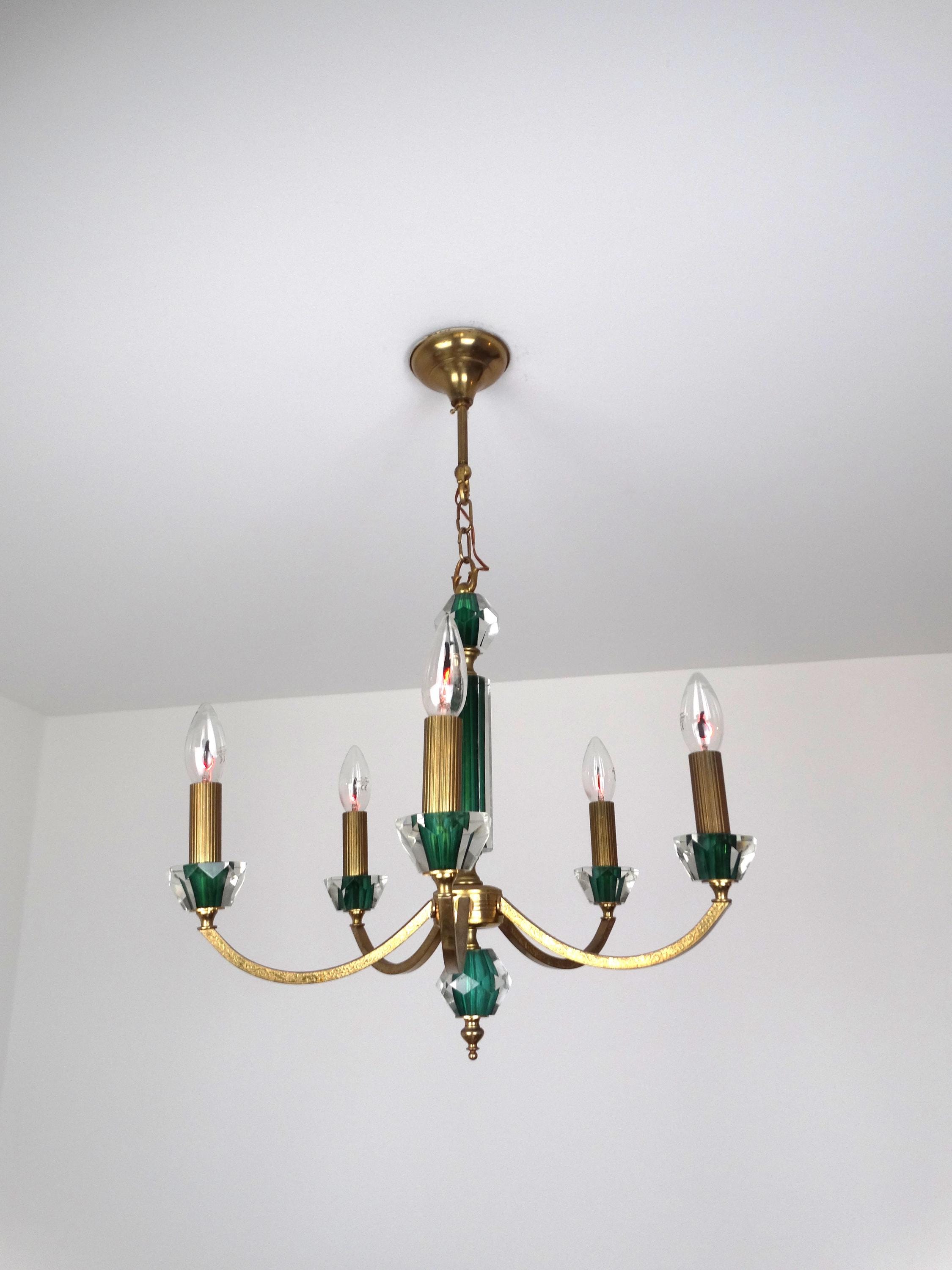 Mid-century chandelier with a gilded metal frame and green decorations incorporated into the glass. Elegant and decorative, this chandelier adds a touch of class to any room. The gold-green color scheme gives this neoclassical chandelier a modern touch. It is in excellent condition, fully functional, as shown in the photos, and has a light patina.