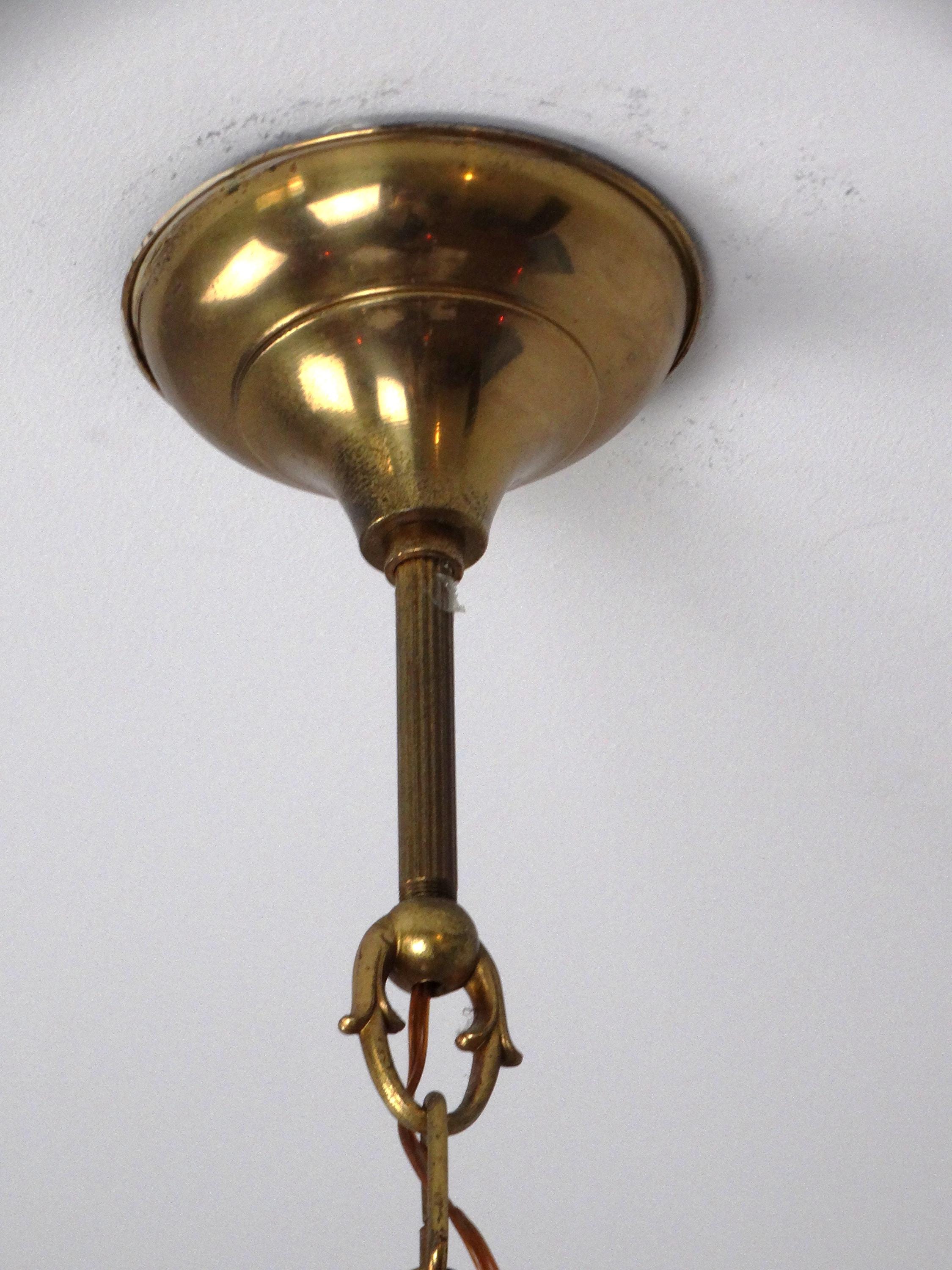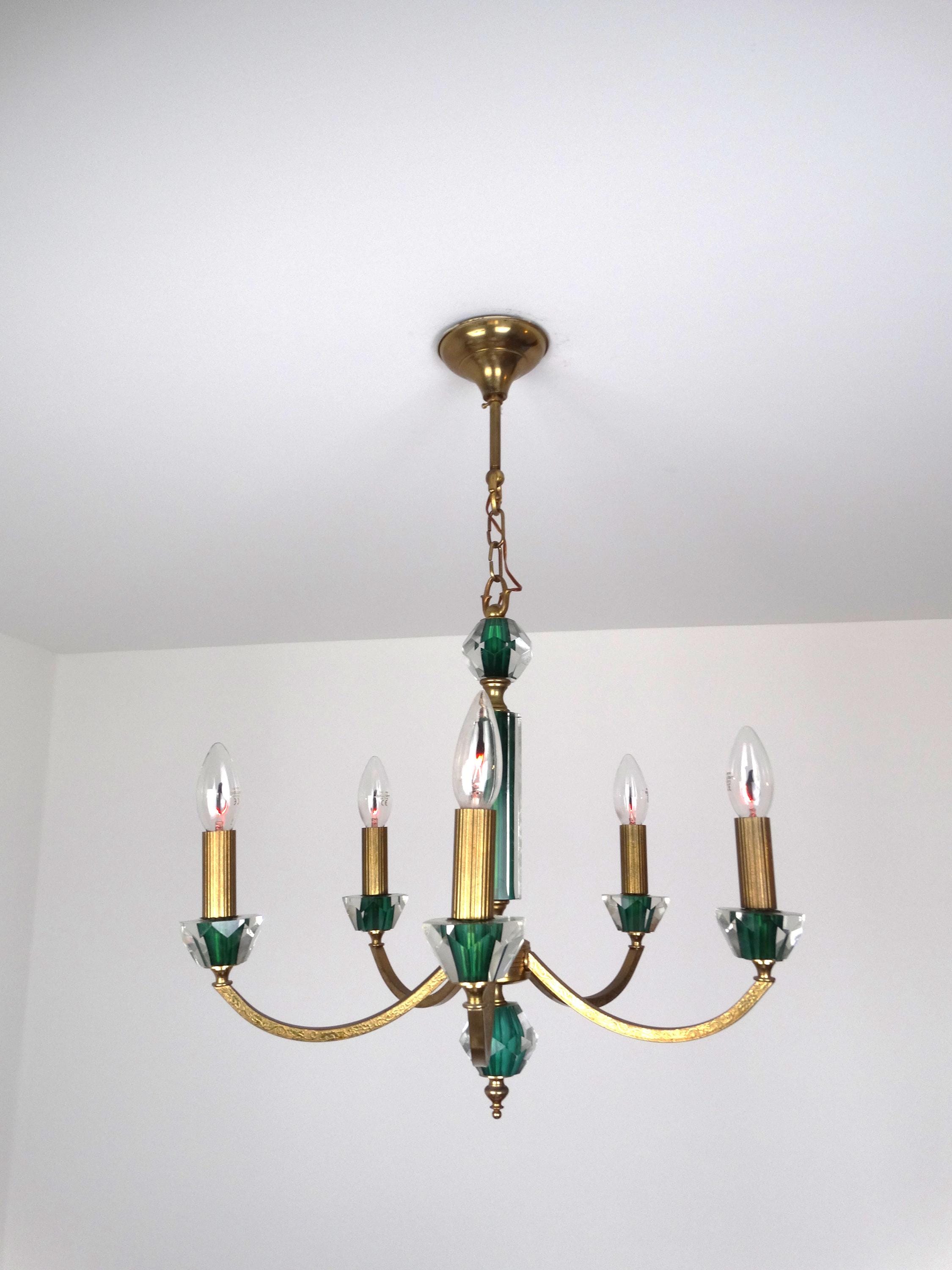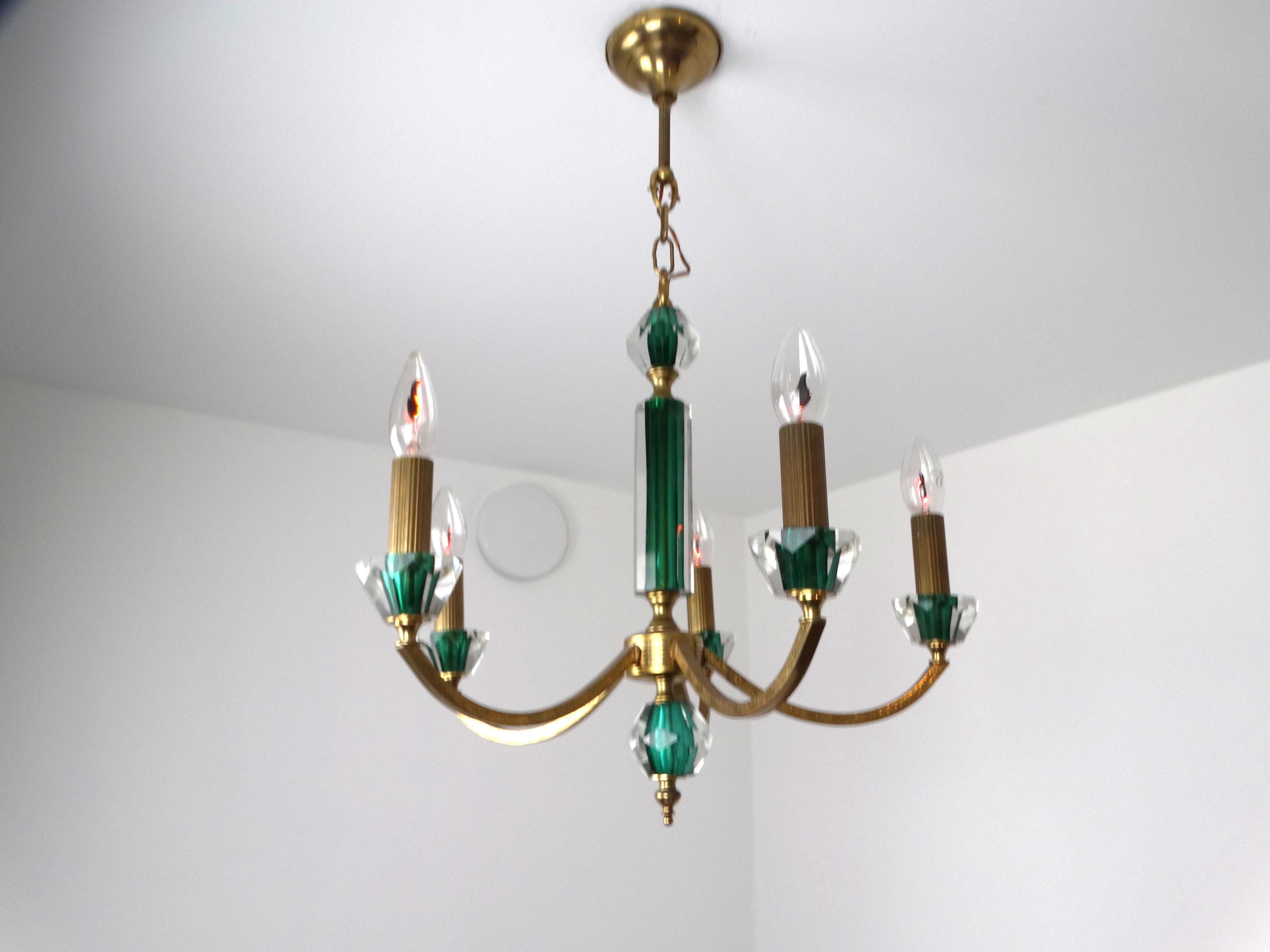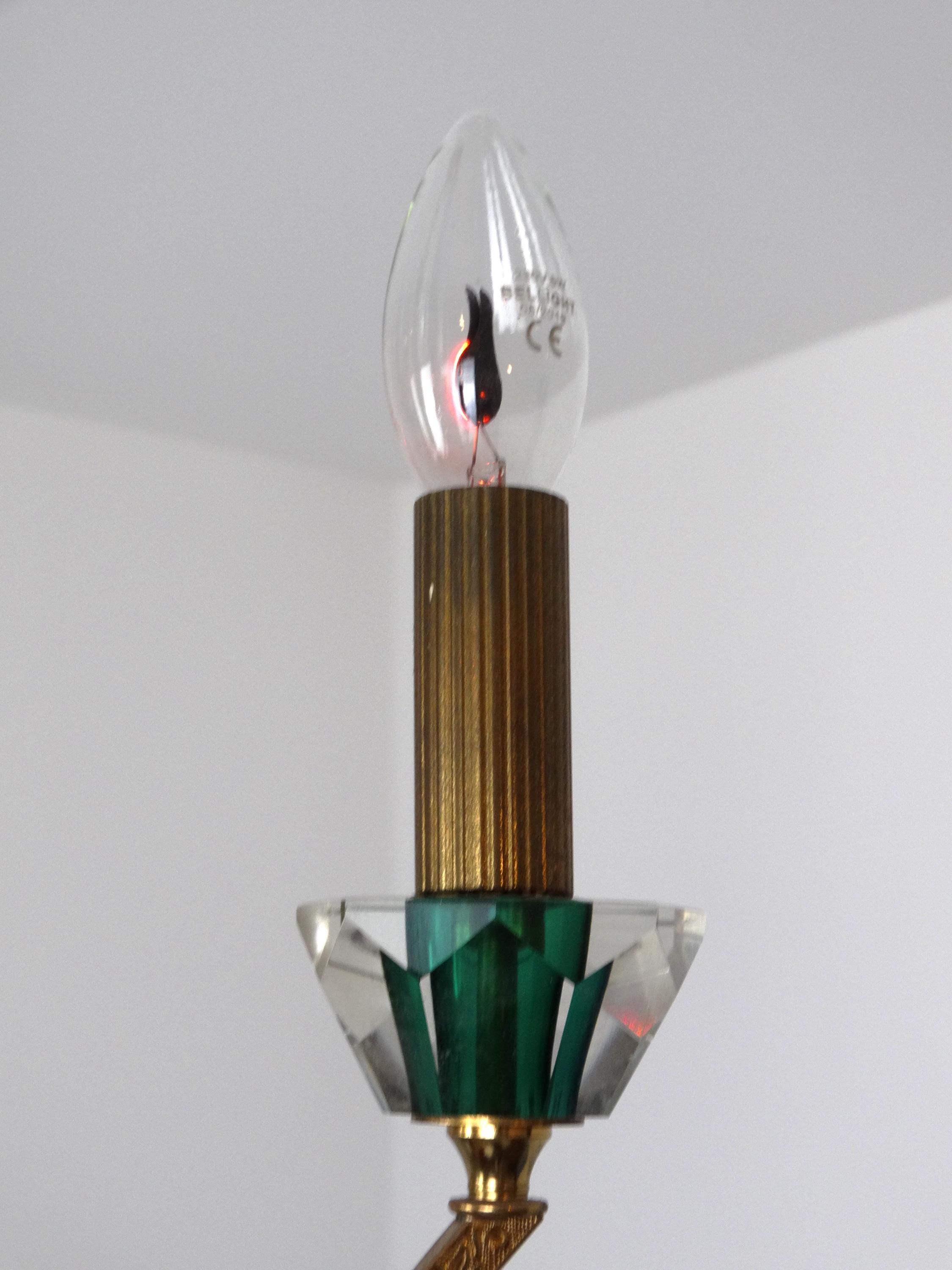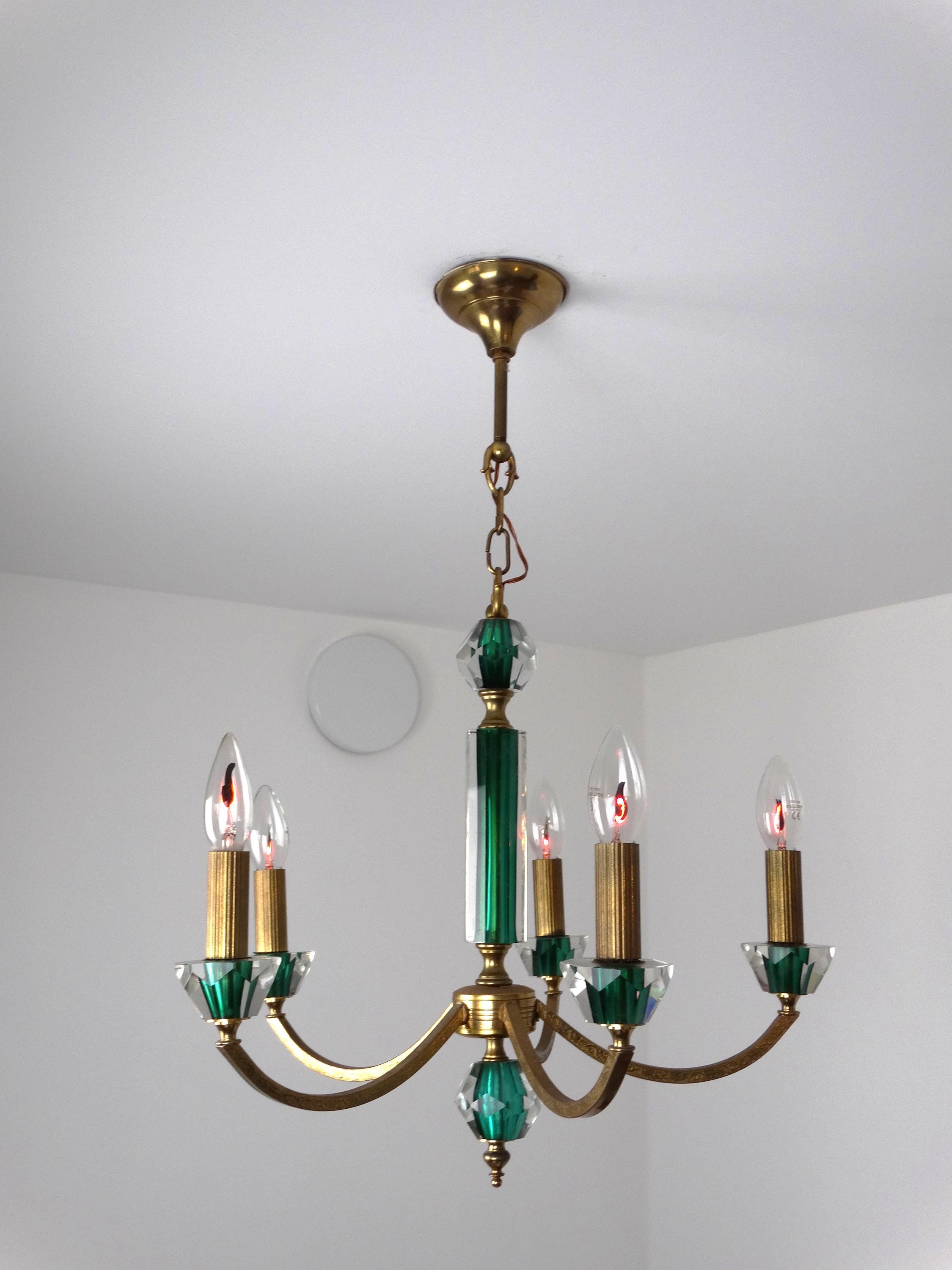 Mid-century chandelier with a gilded metal frame and green decorations incorporated into the glass. Elegant and decorative, this chandelier adds a touch of class to any room. The gold-green color scheme gives this neoclassical chandelier a modern touch. It is in excellent condition, fully functional, as shown in the photos, and has a light patina.