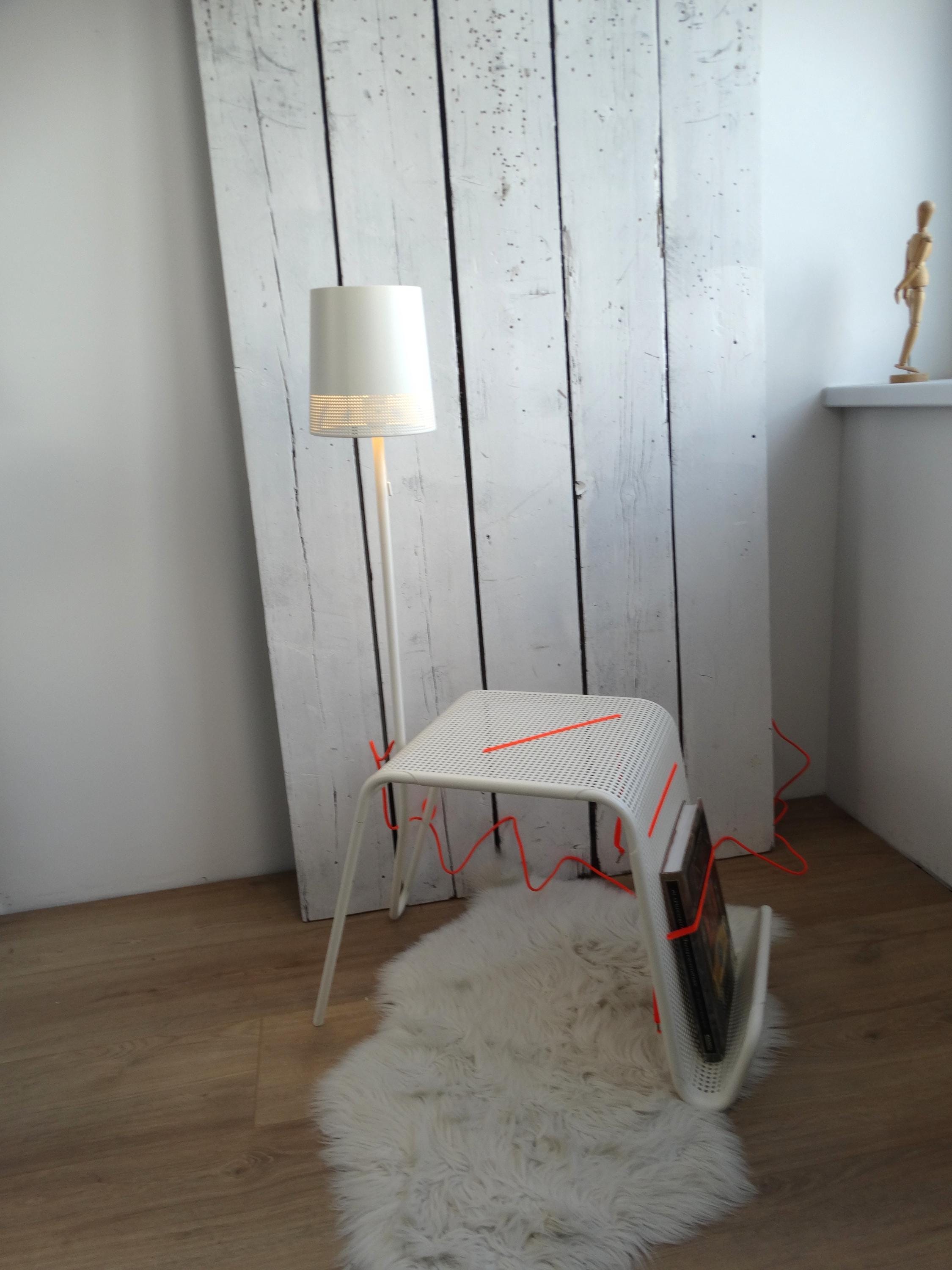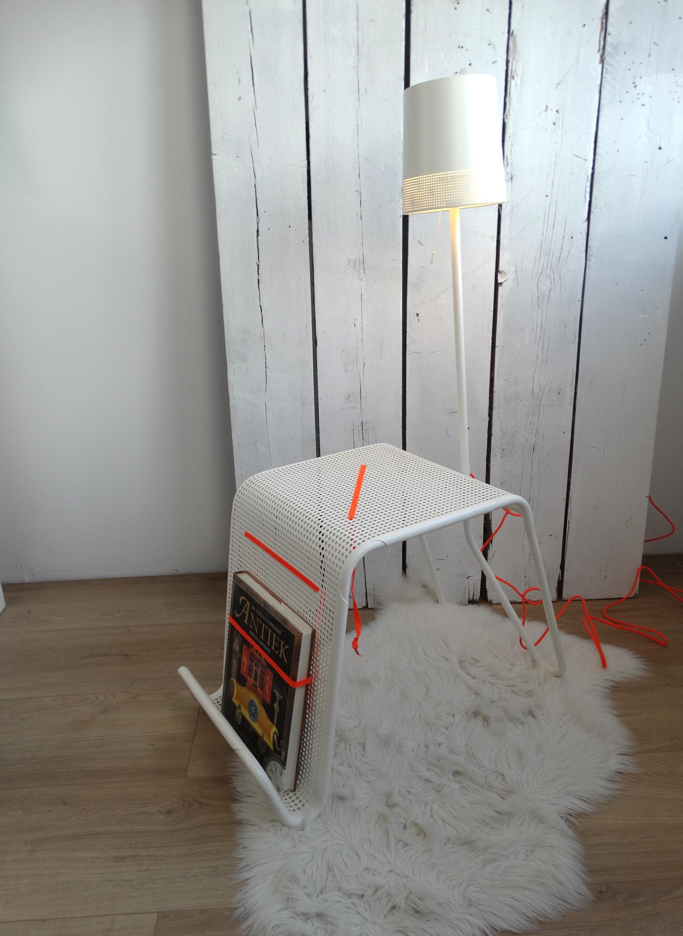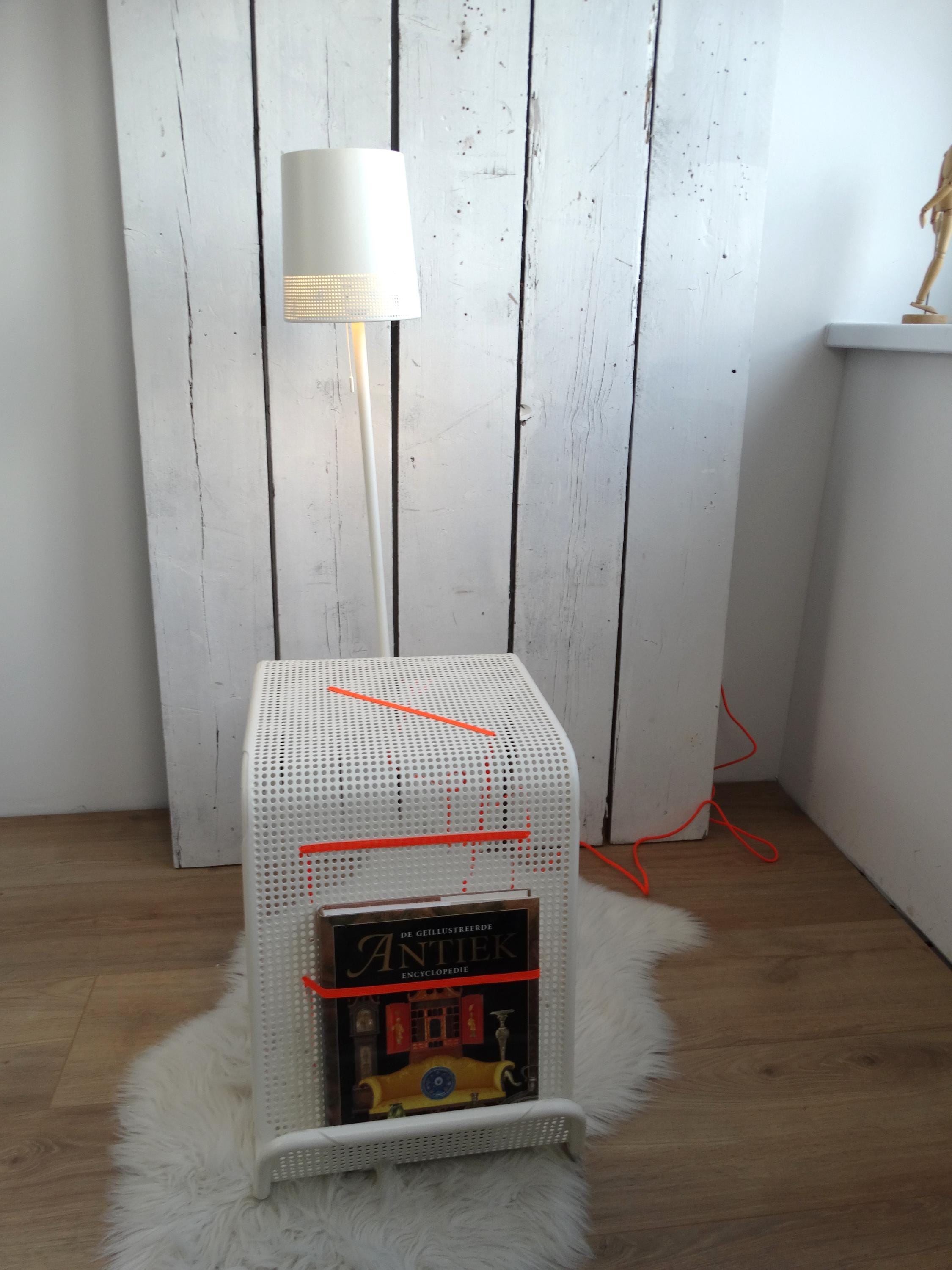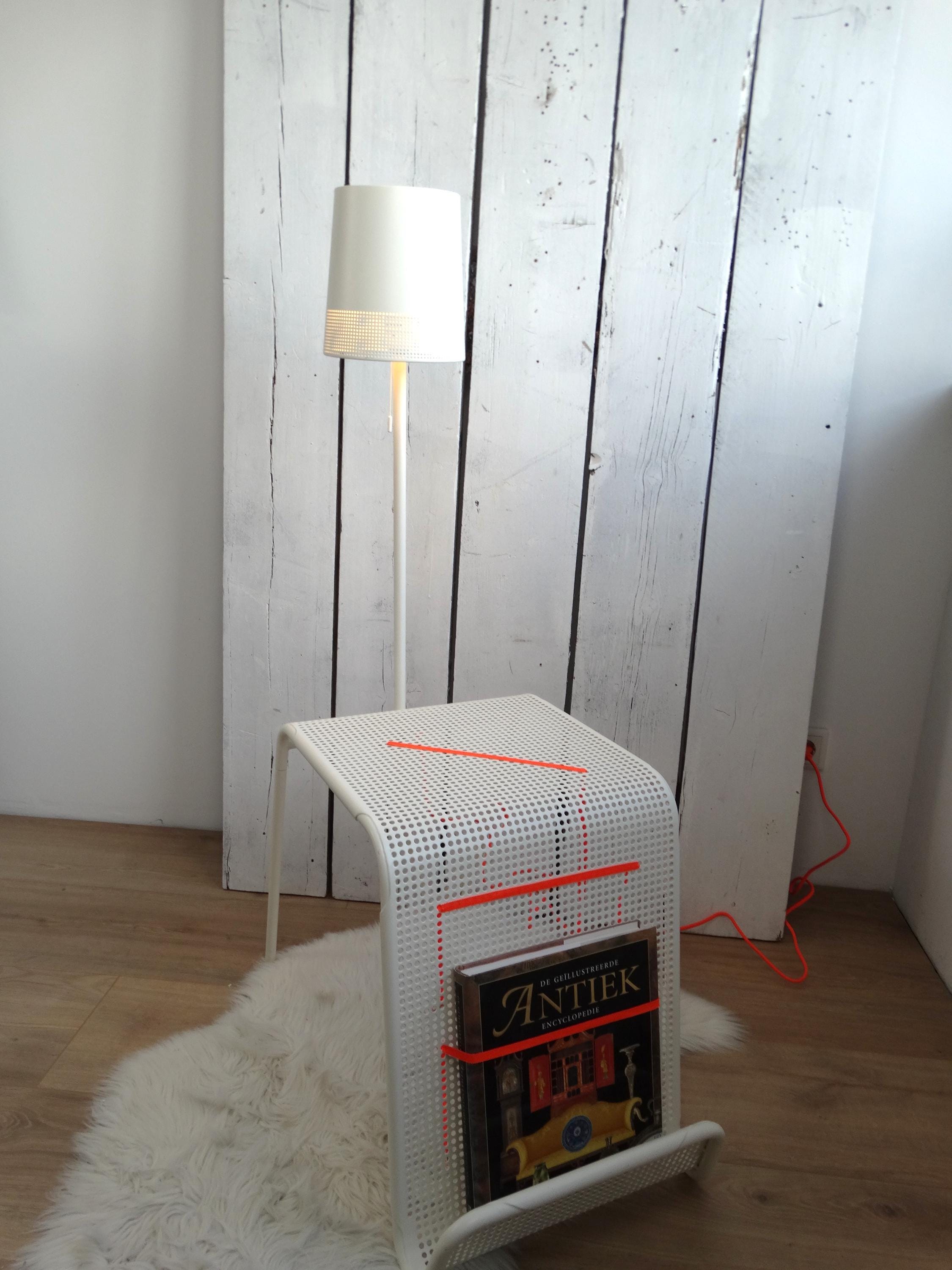 Side table with lighting, designed by Polish designer Tomek Rygalik exclusively for Ikea's PS collection. The table has three functions: a (side) table, a lamp, and a magazine compartment. The lamp has a pull-cord switch. Small holes in the lampshade create a playful lighting effect.