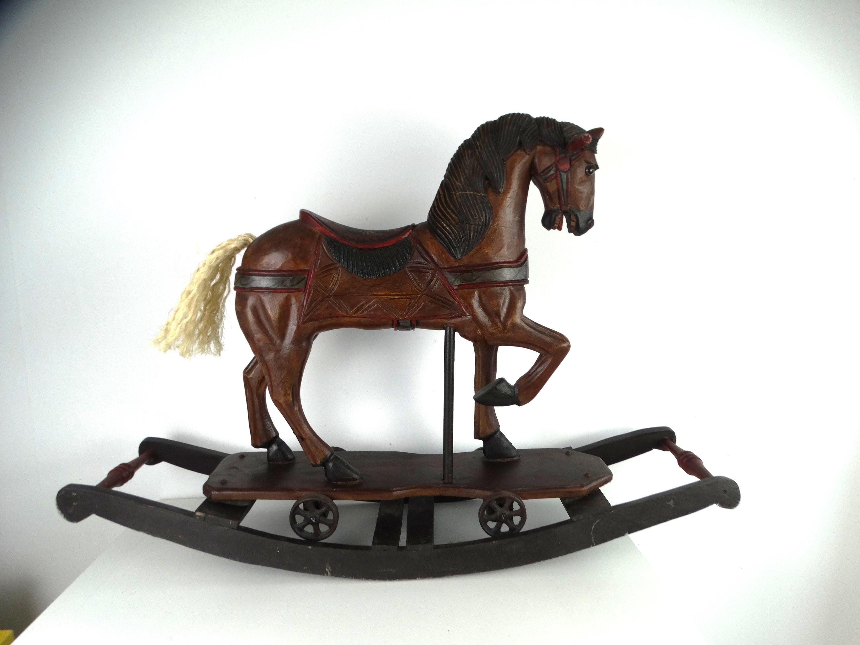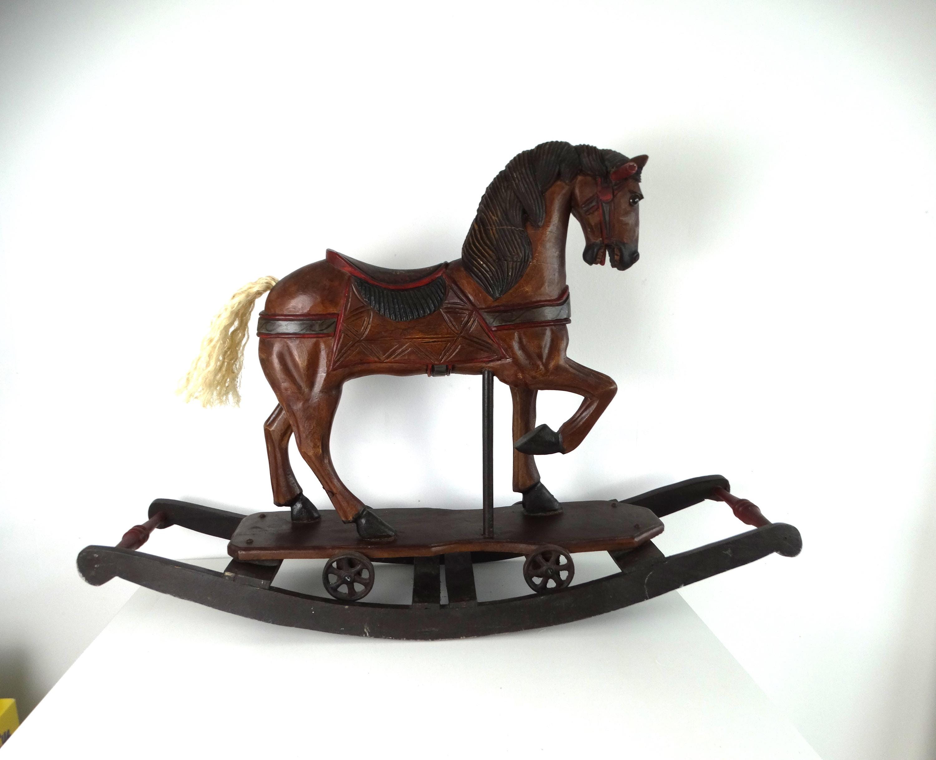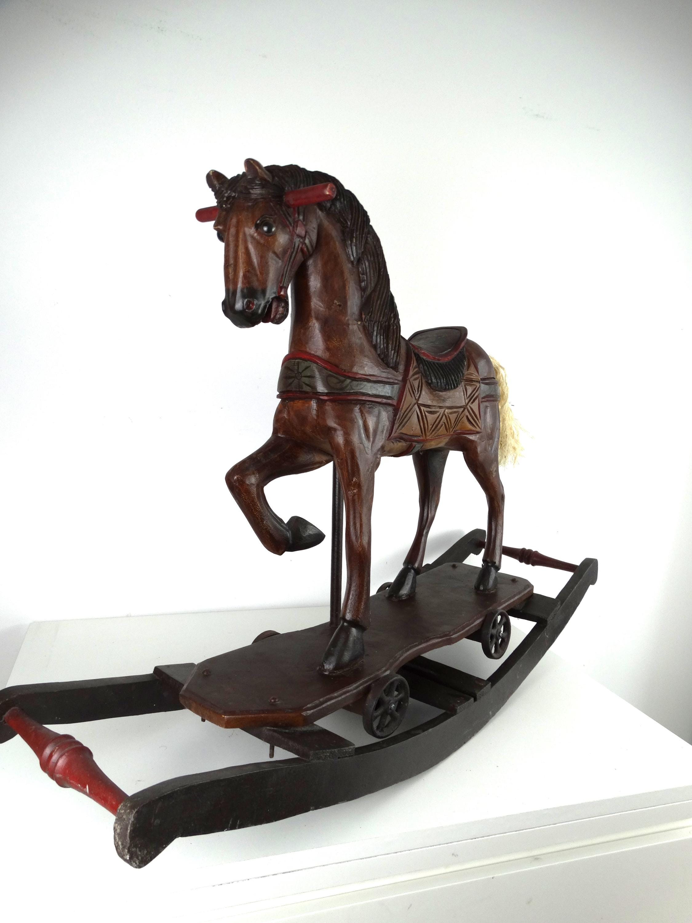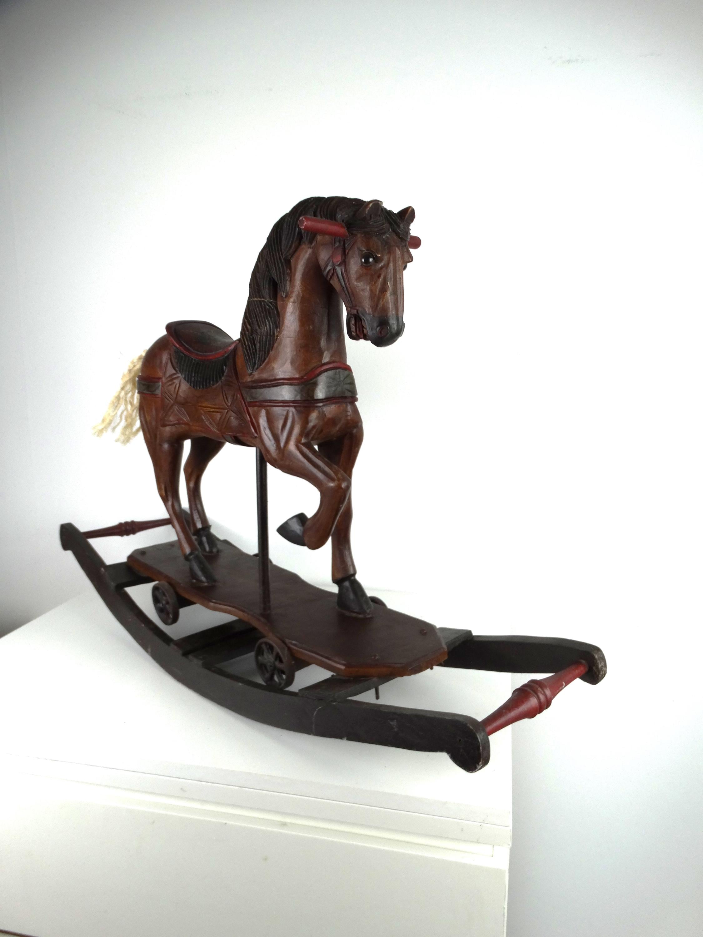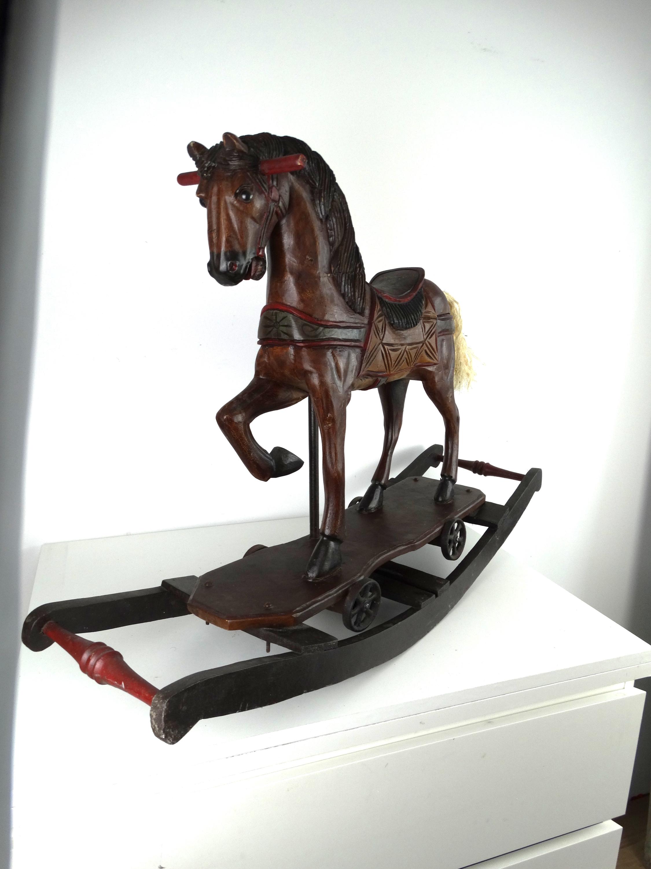 A large, colorful, vintage wooden rocking horse with wonderful details. The horse has glass eyes. The saddle is painted with floral details that give this piece a touch of folk art. It stands on a base with wheels and also has a rocking section.