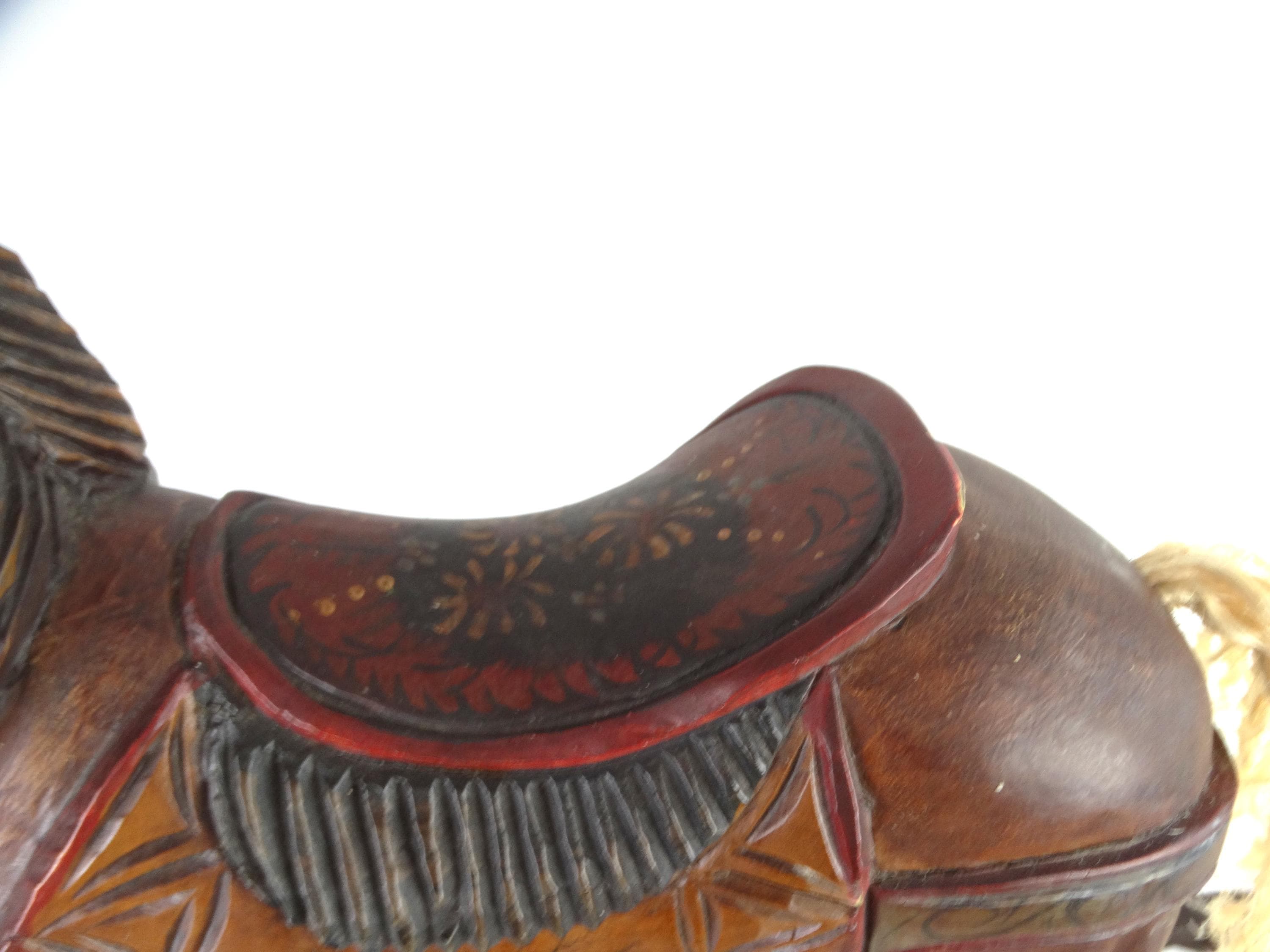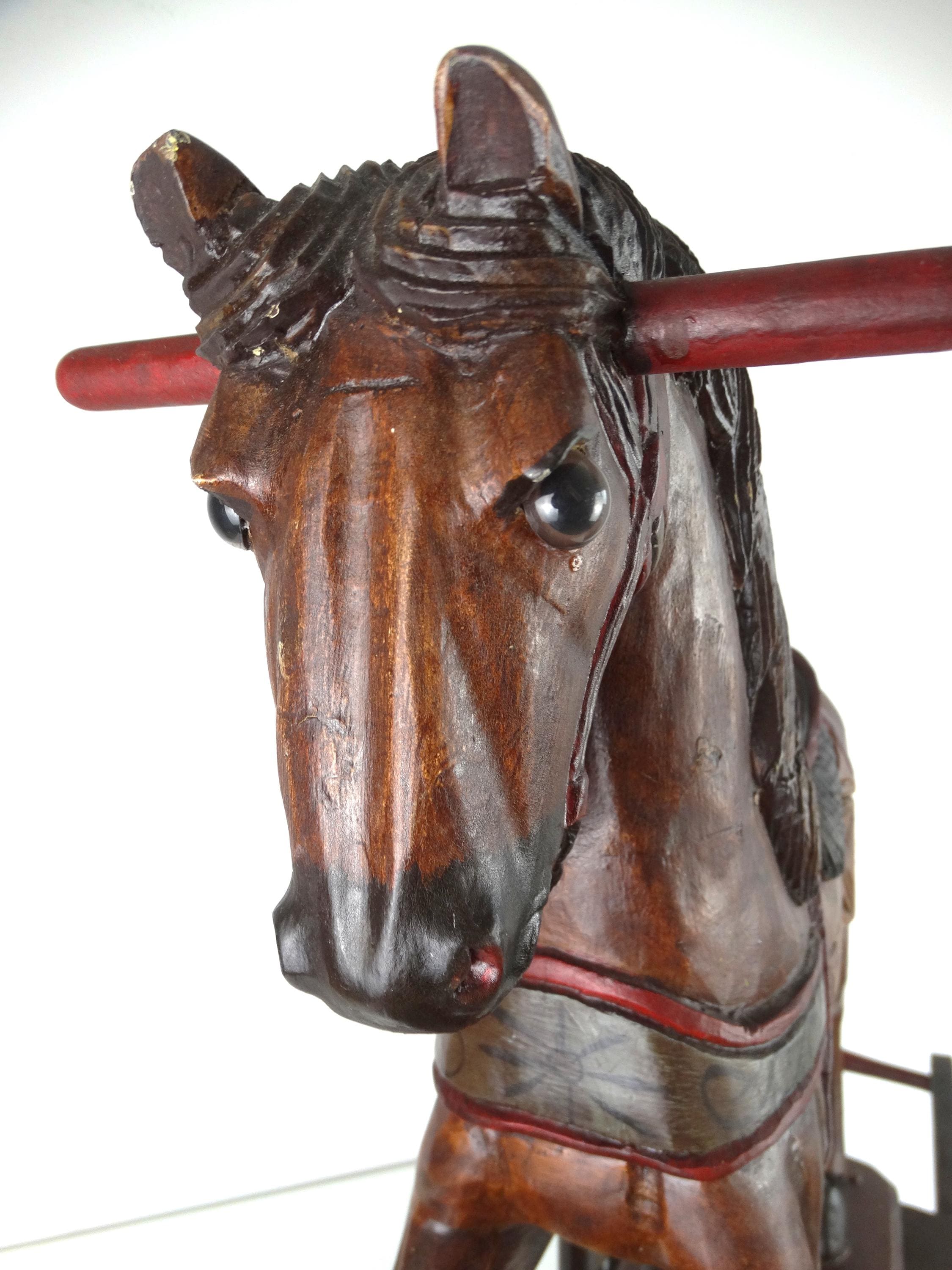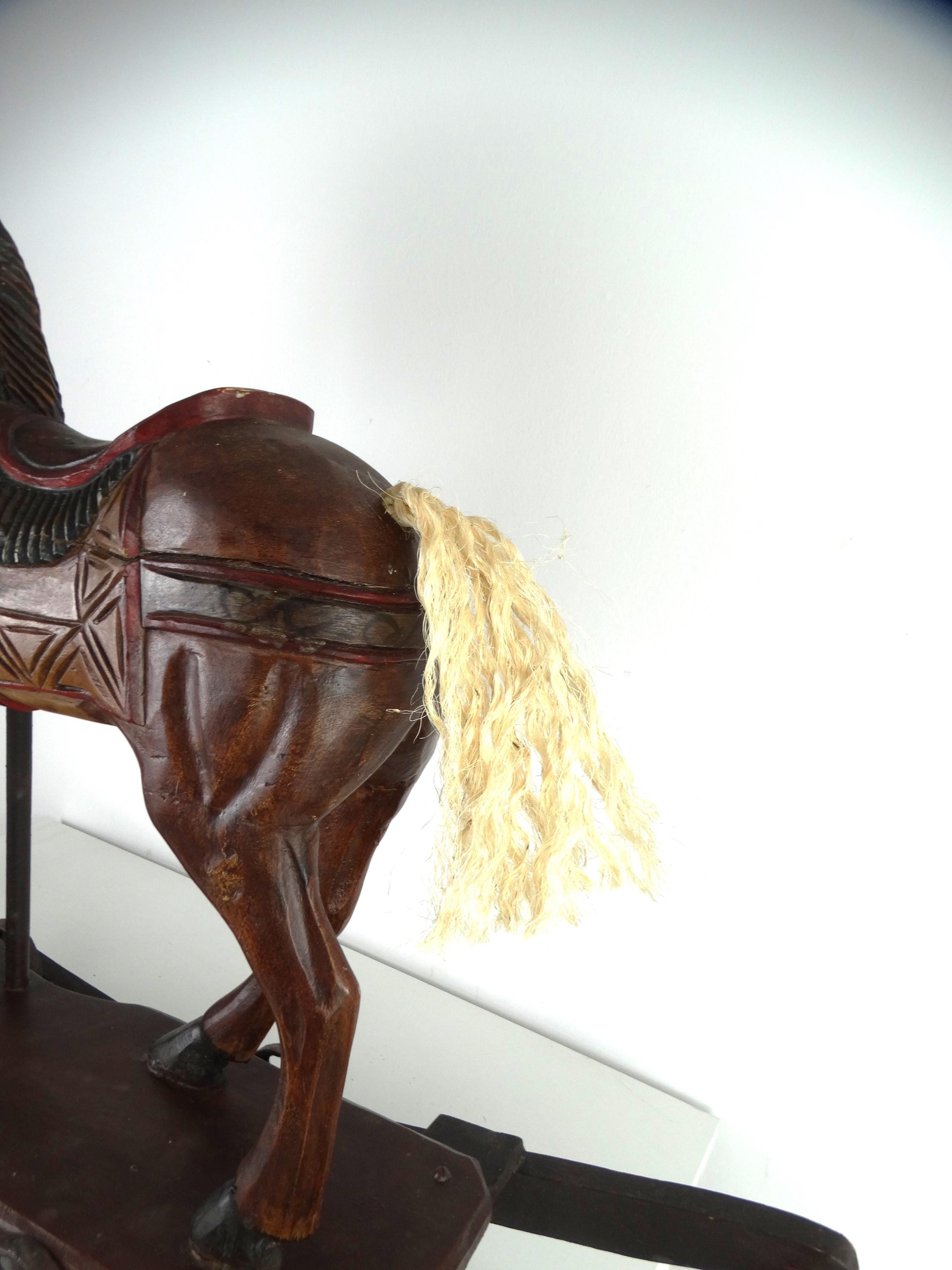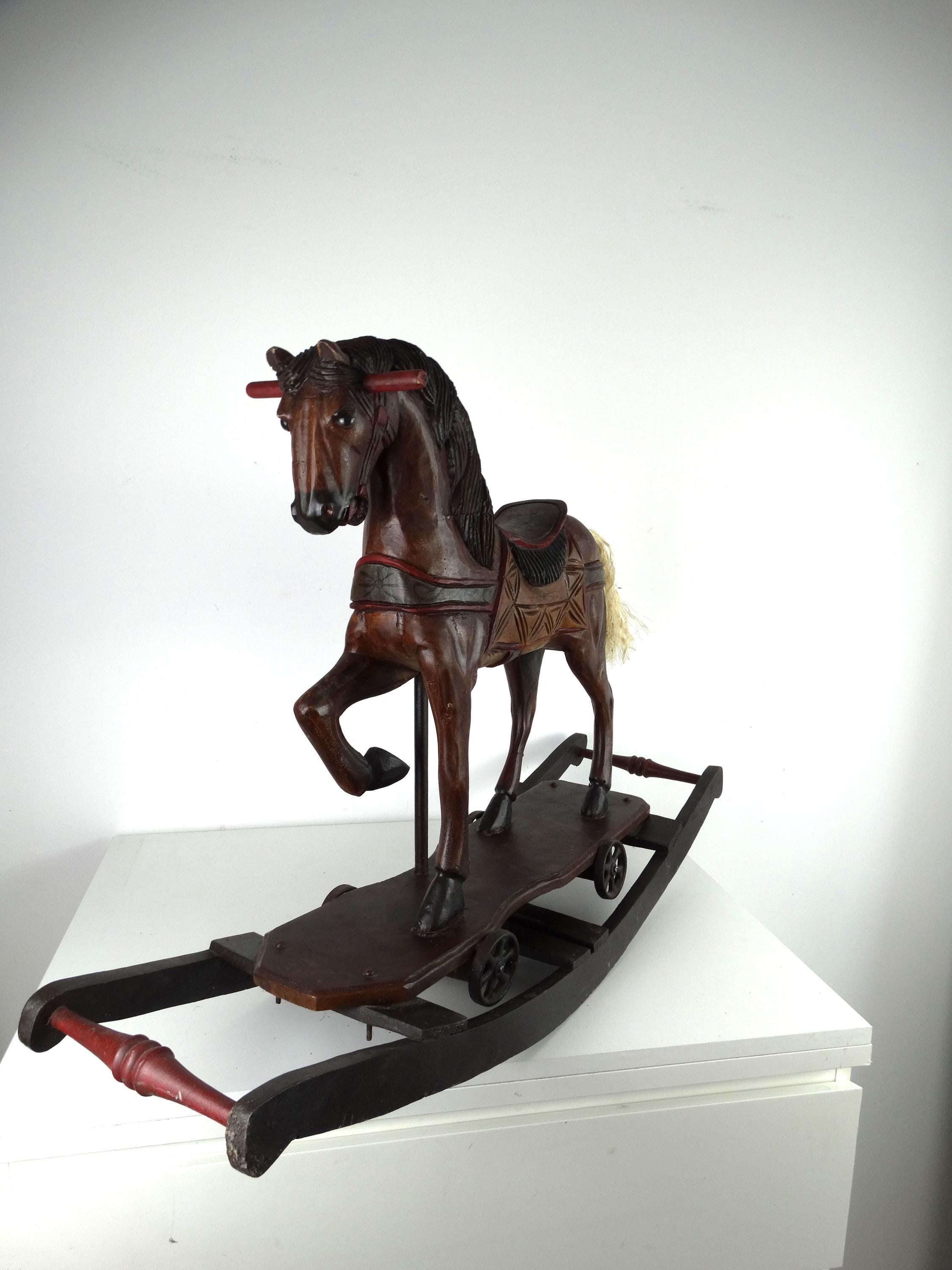 A large, colorful, vintage wooden rocking horse with wonderful details. The horse has glass eyes. The saddle is painted with floral details that give this piece a touch of folk art. It stands on a base with wheels and also has a rocking section.