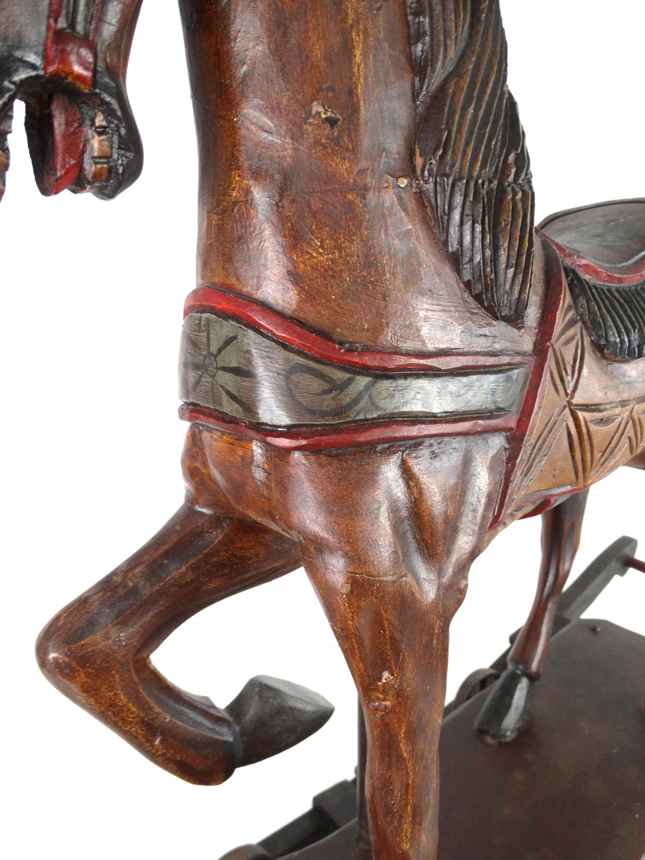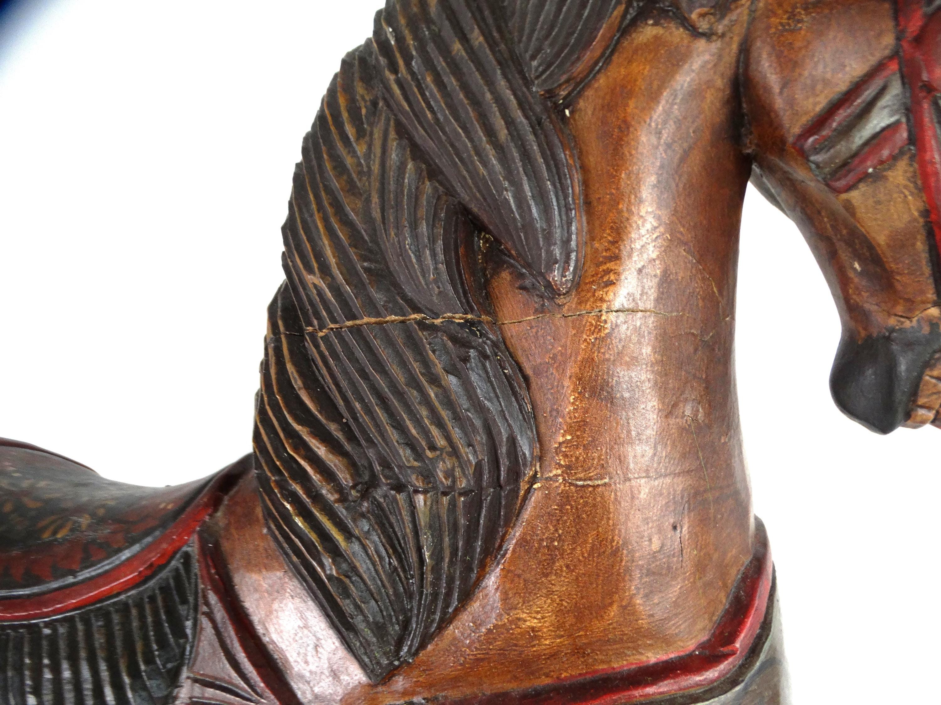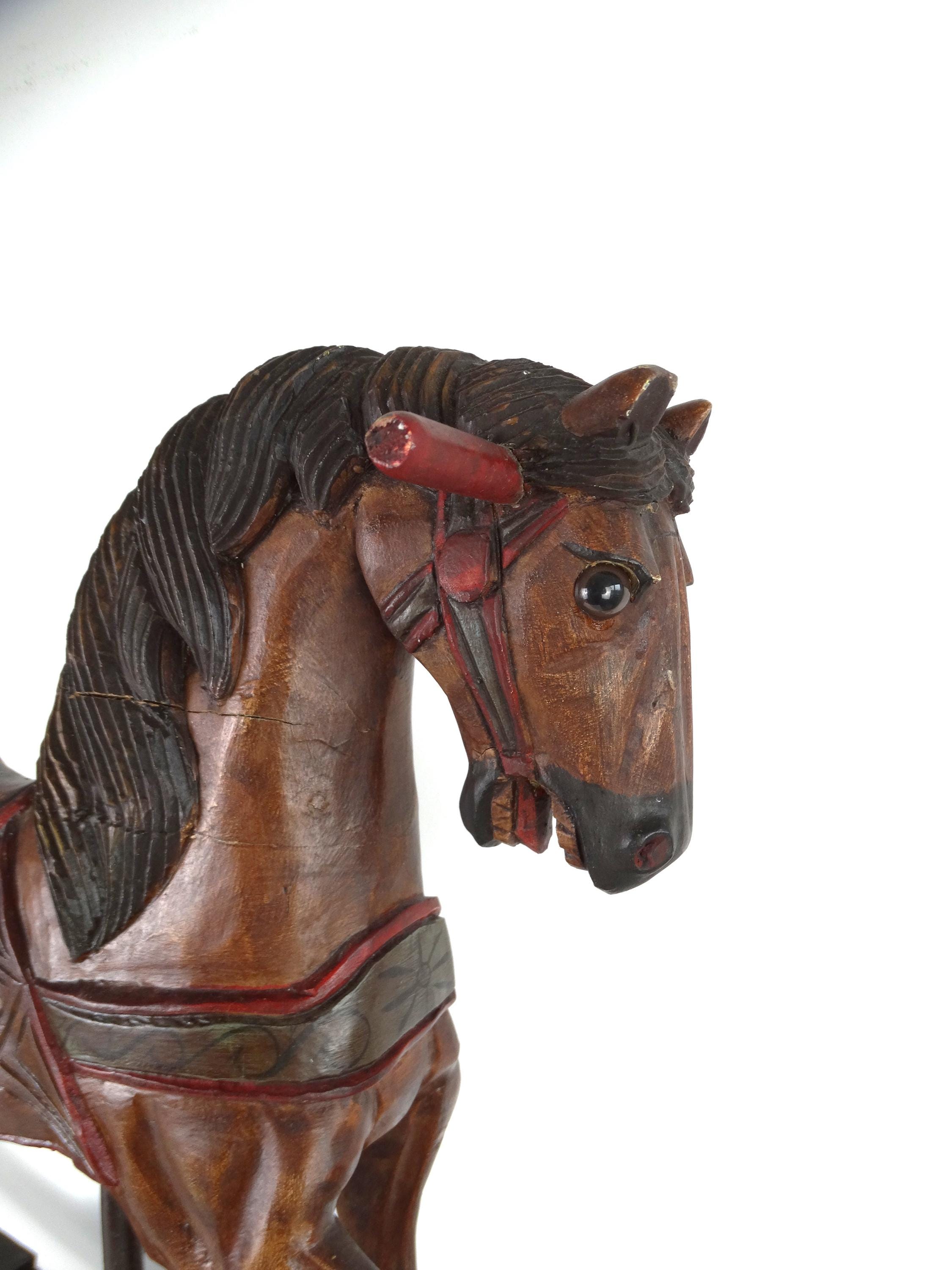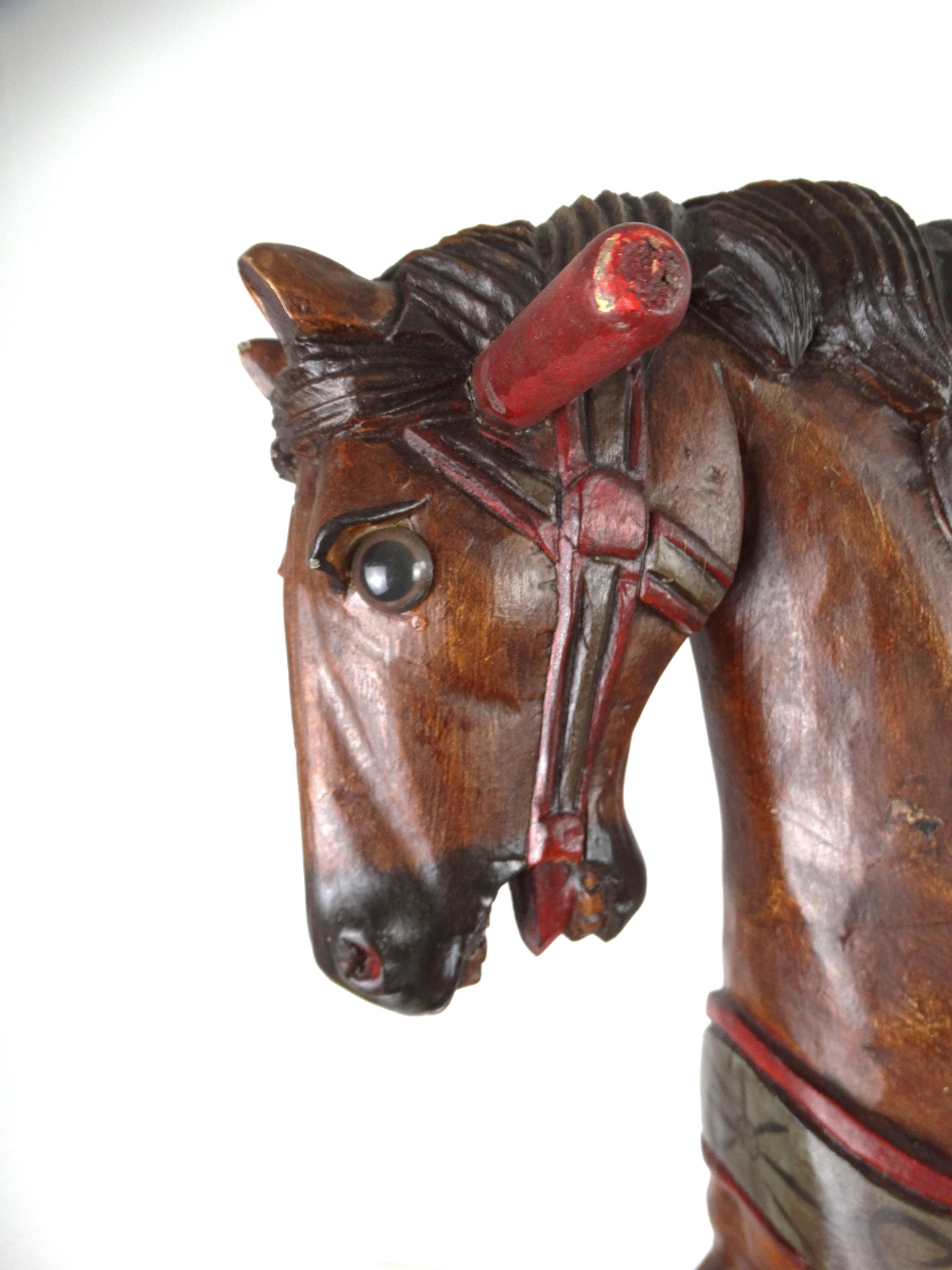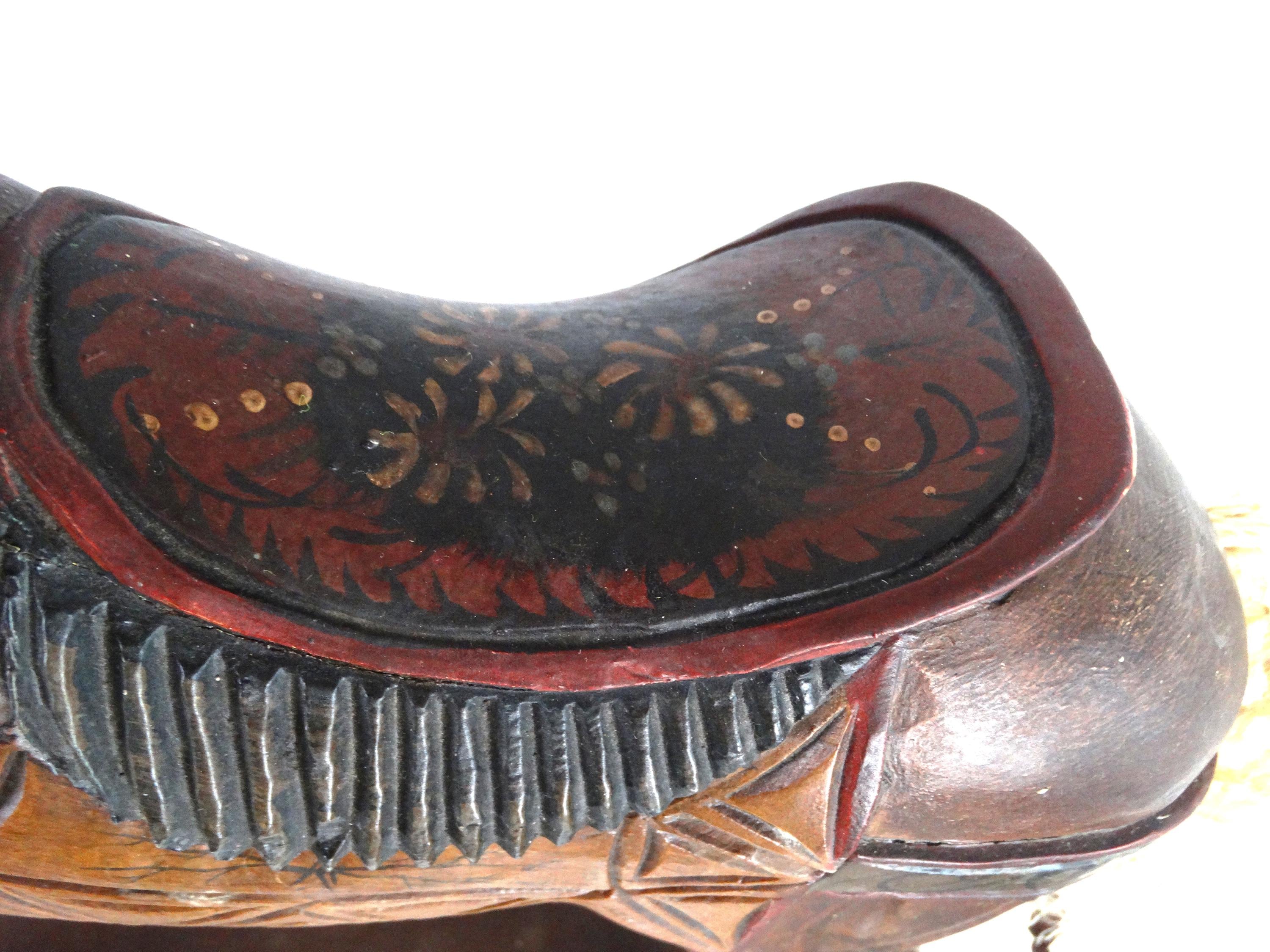 A large, colorful, vintage wooden rocking horse with wonderful details. The horse has glass eyes. The saddle is painted with floral details that give this piece a touch of folk art. It stands on a base with wheels and also has a rocking section.