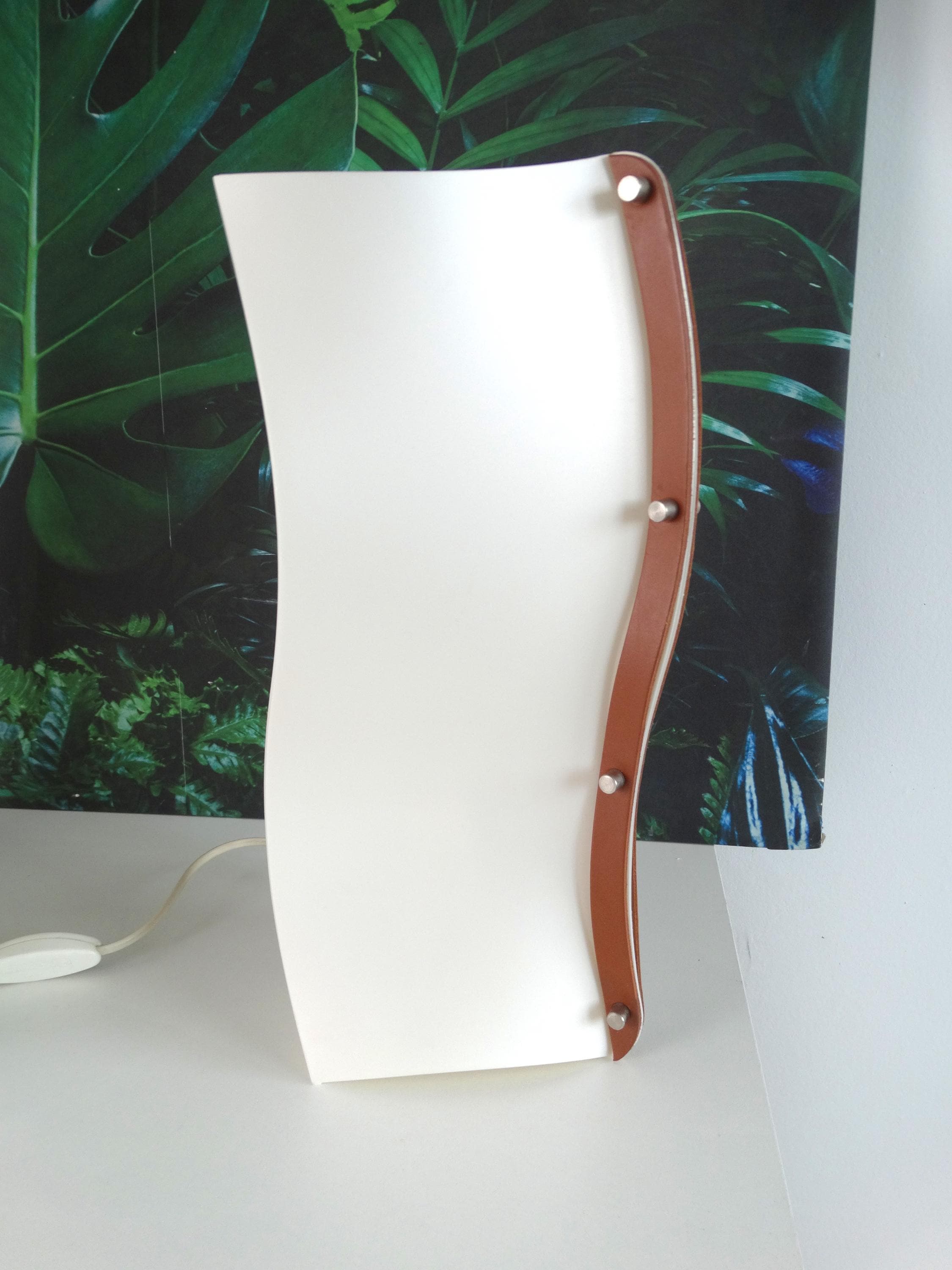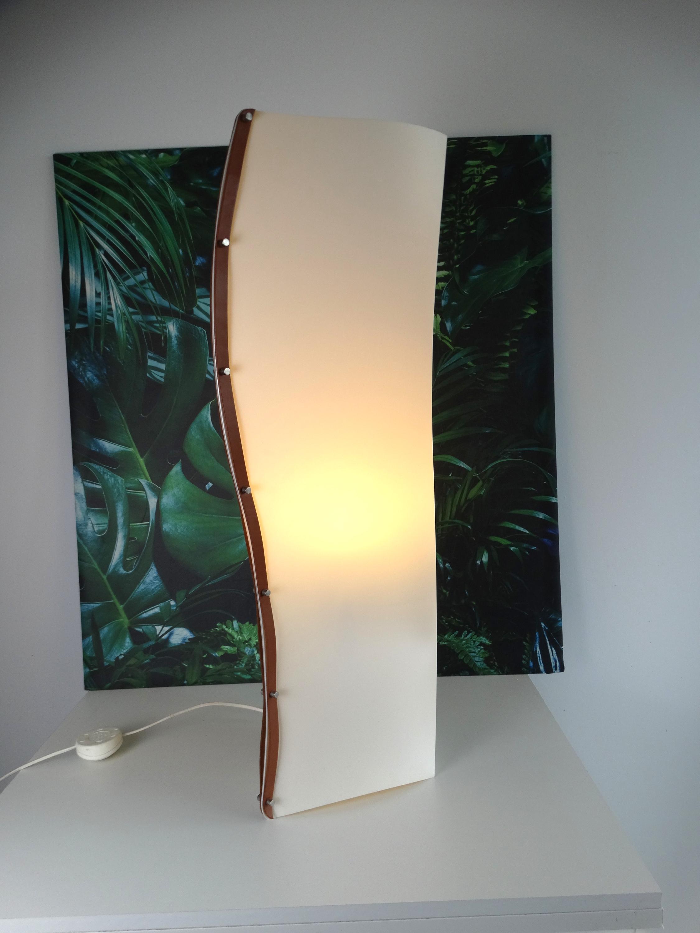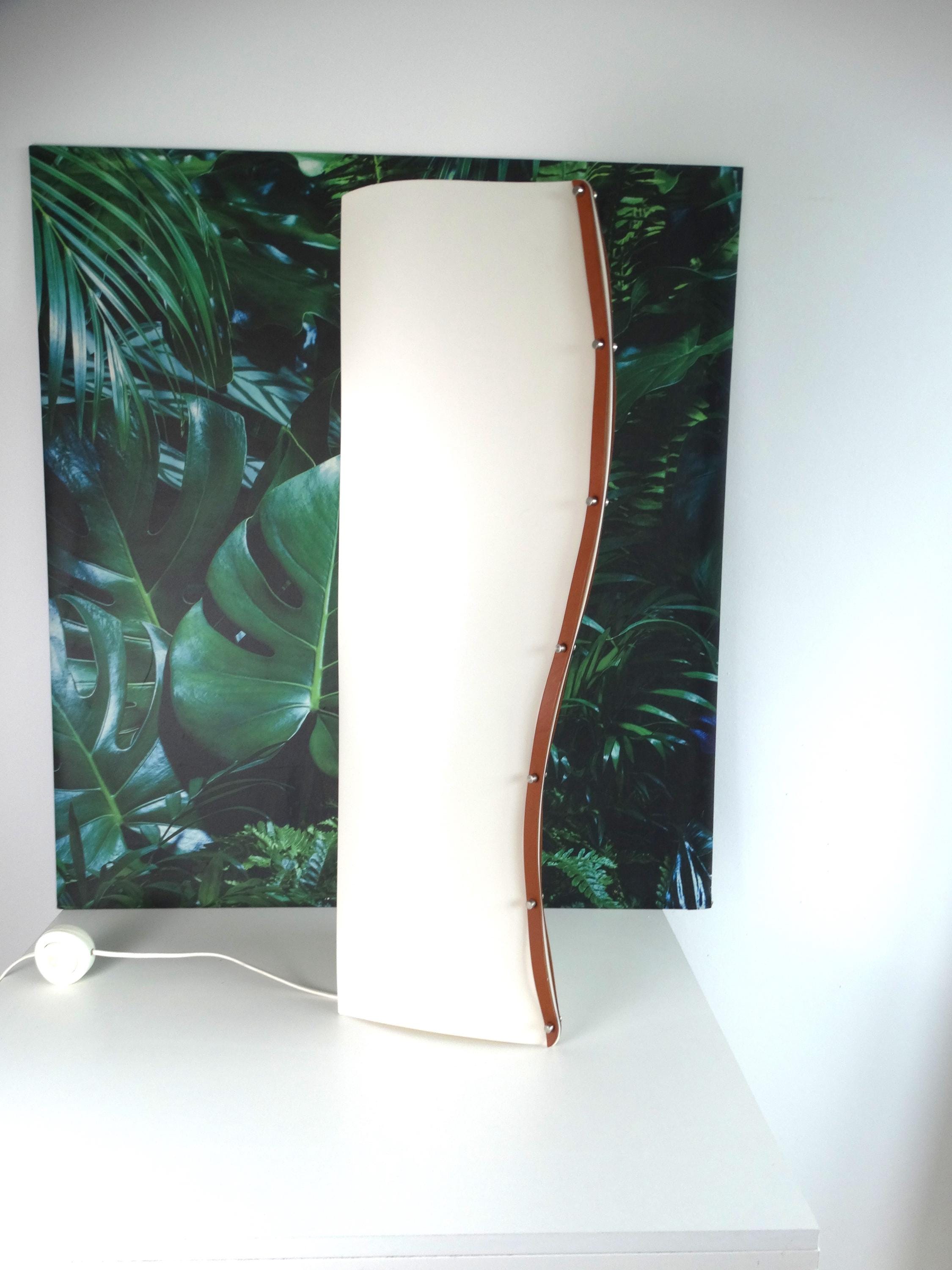 This striking vintage floor lamp and vintage table lamp bring a touch of retro charm to your interior. With its vibrant ecru color and a strip of leather with metal studs, it's a real eye-catcher that offers both style and functionality. Ideal for both living rooms and offices where a touch of vintage style is desired.