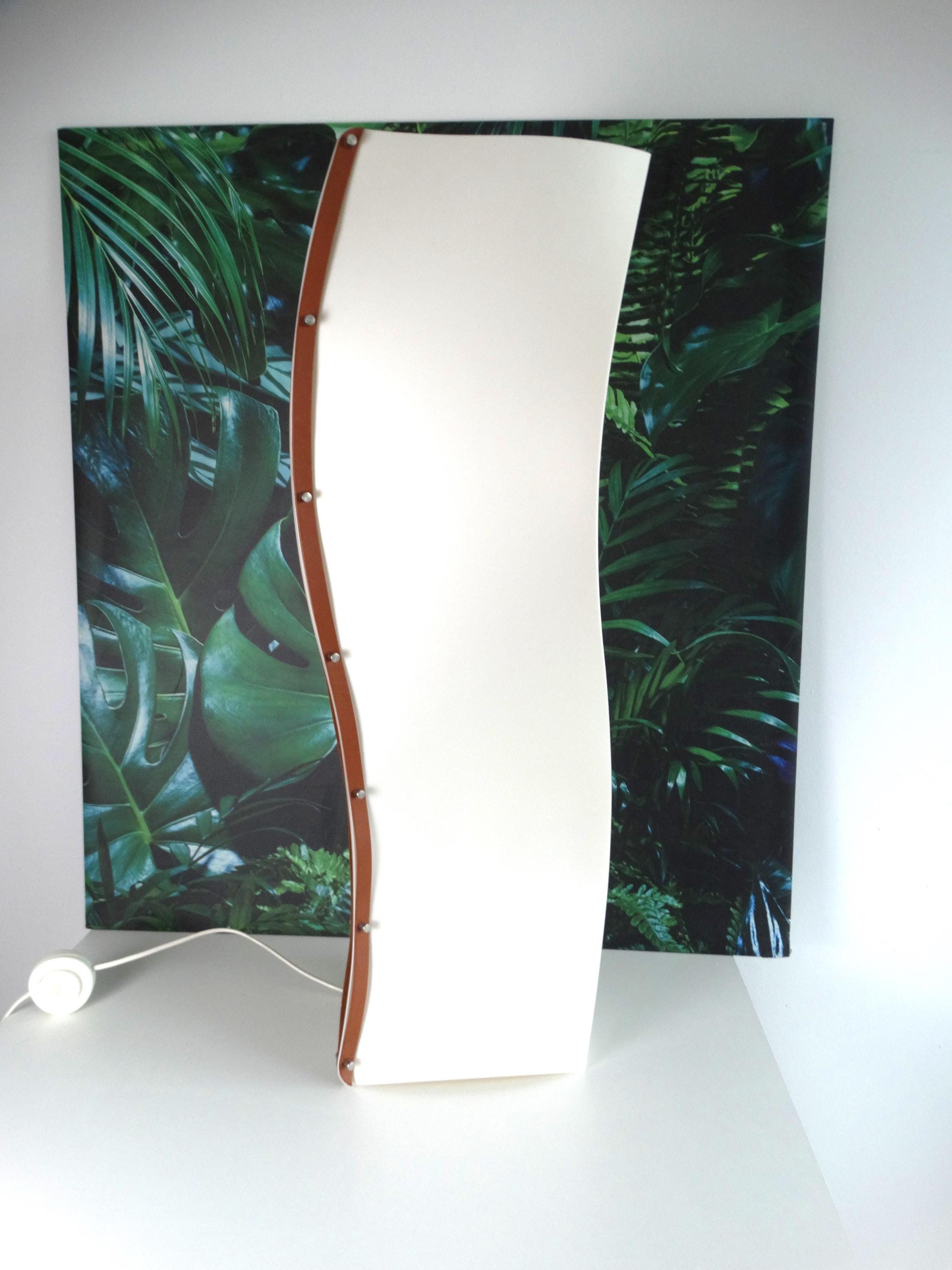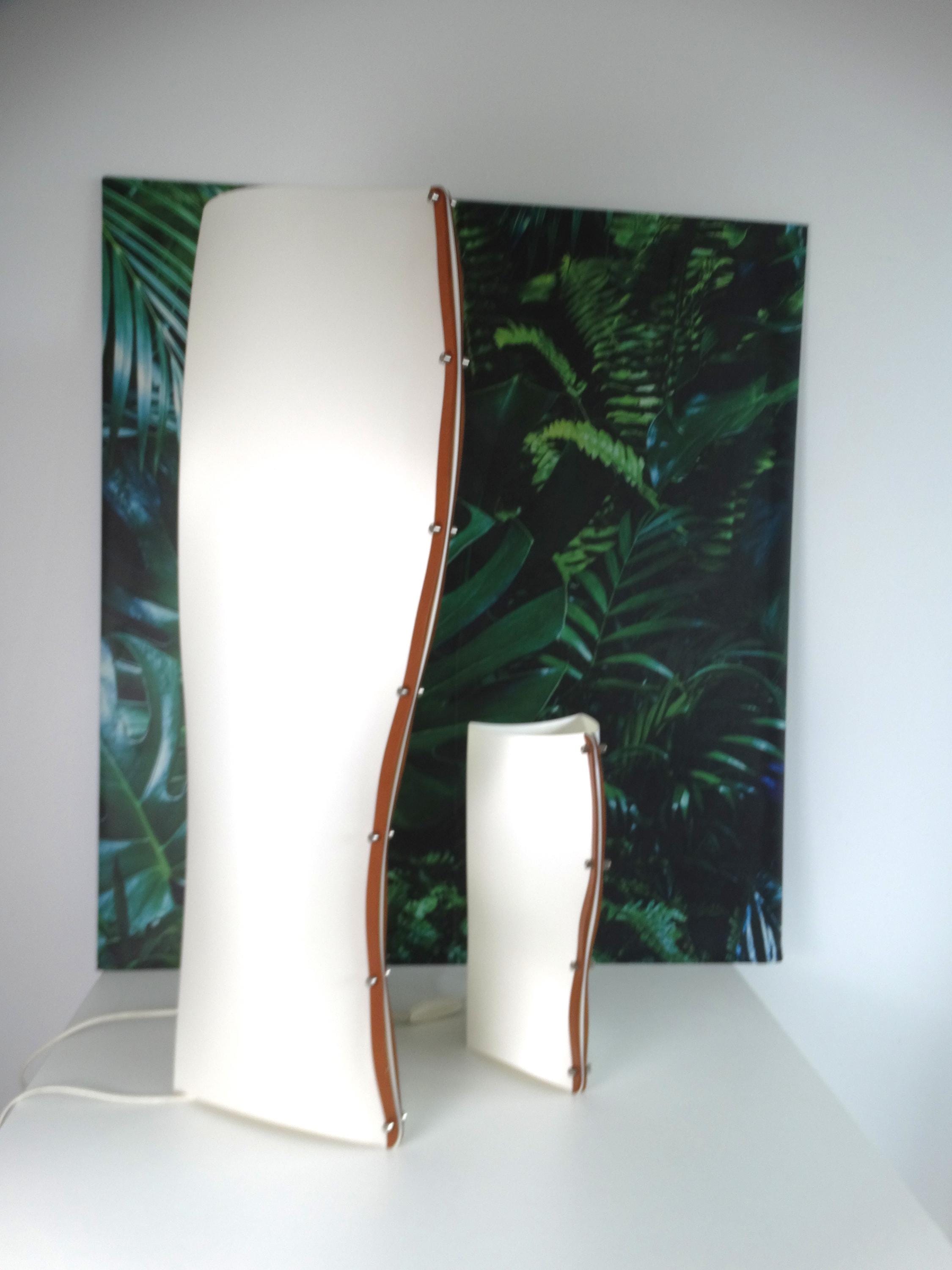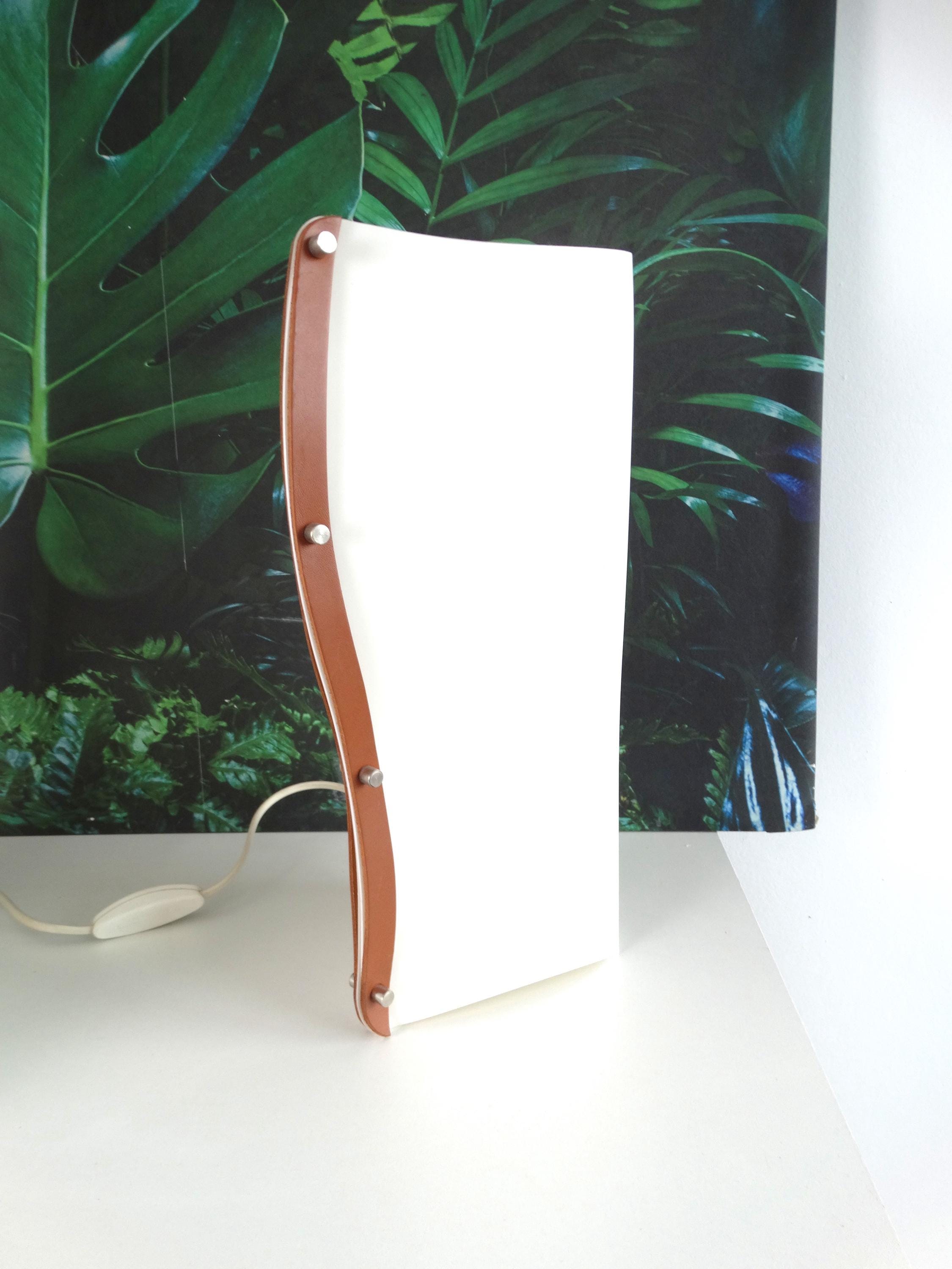 This striking vintage floor lamp and vintage table lamp bring a touch of retro charm to your interior. With its vibrant ecru color and a strip of leather with metal studs, it's a real eye-catcher that offers both style and functionality. Ideal for both living rooms and offices where a touch of vintage style is desired.