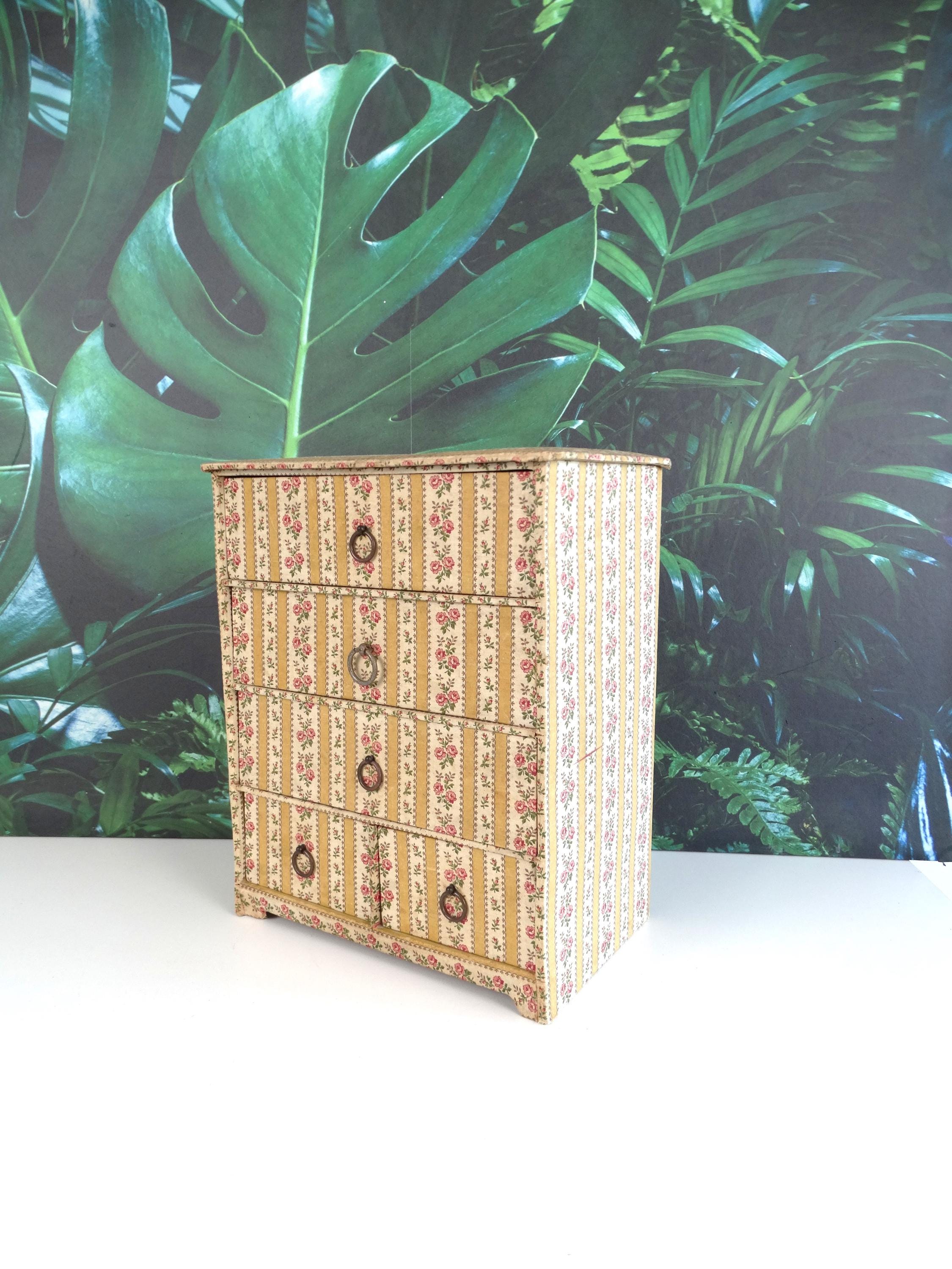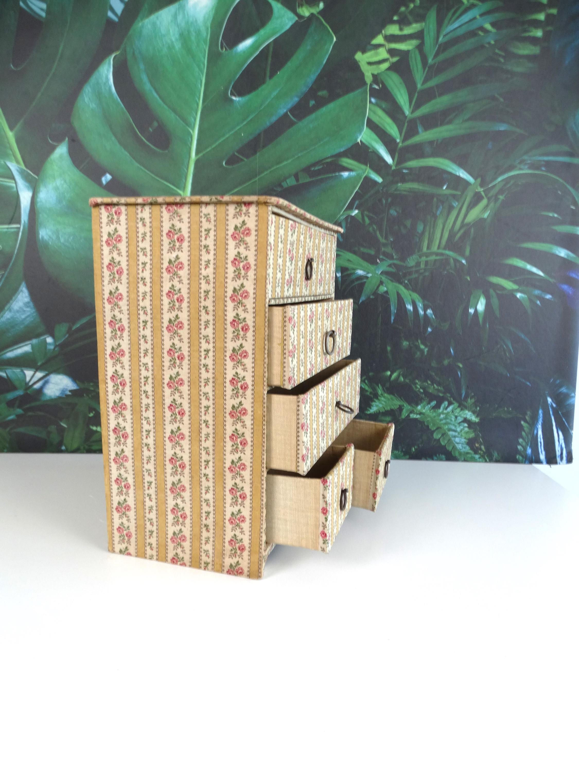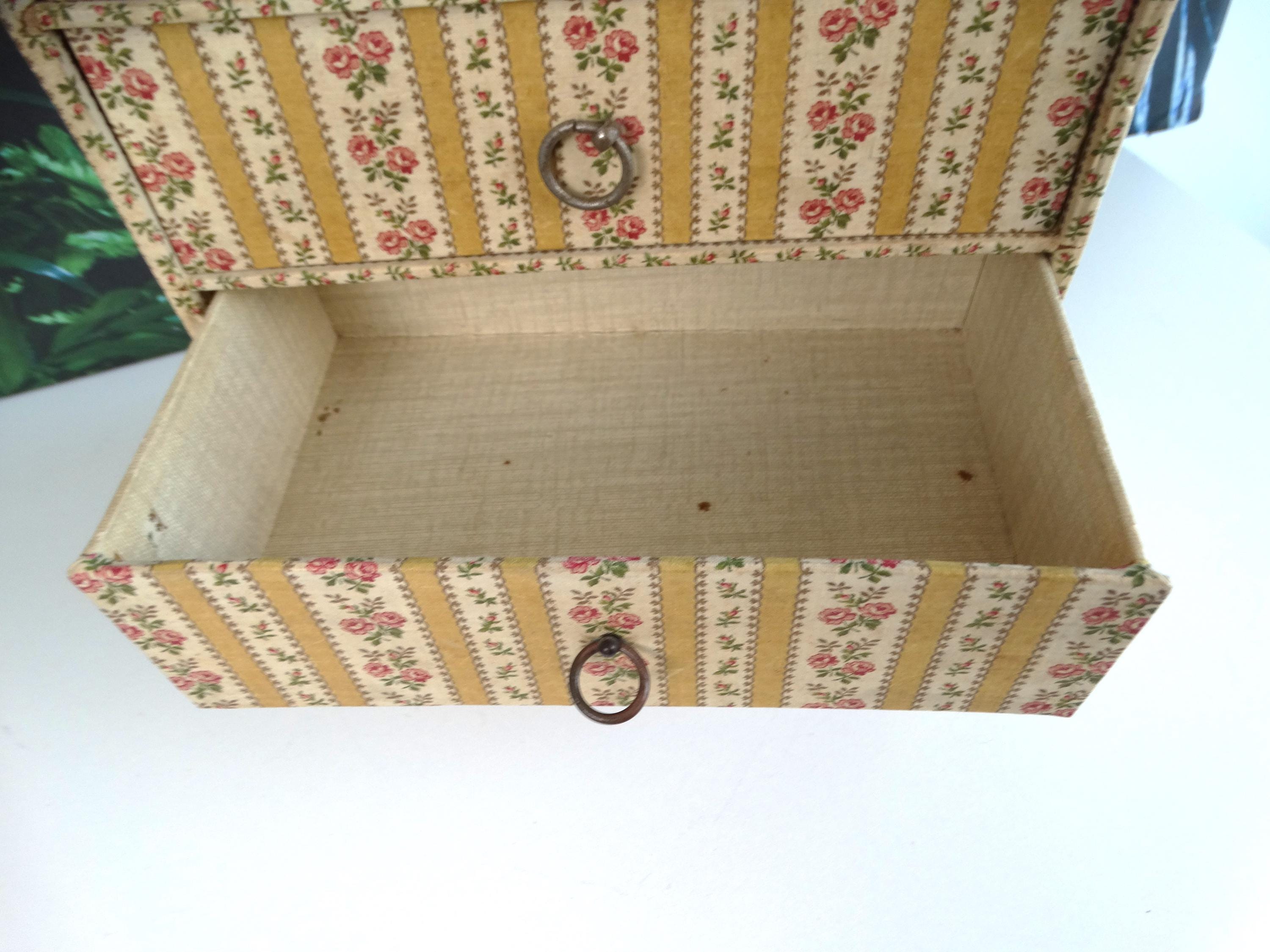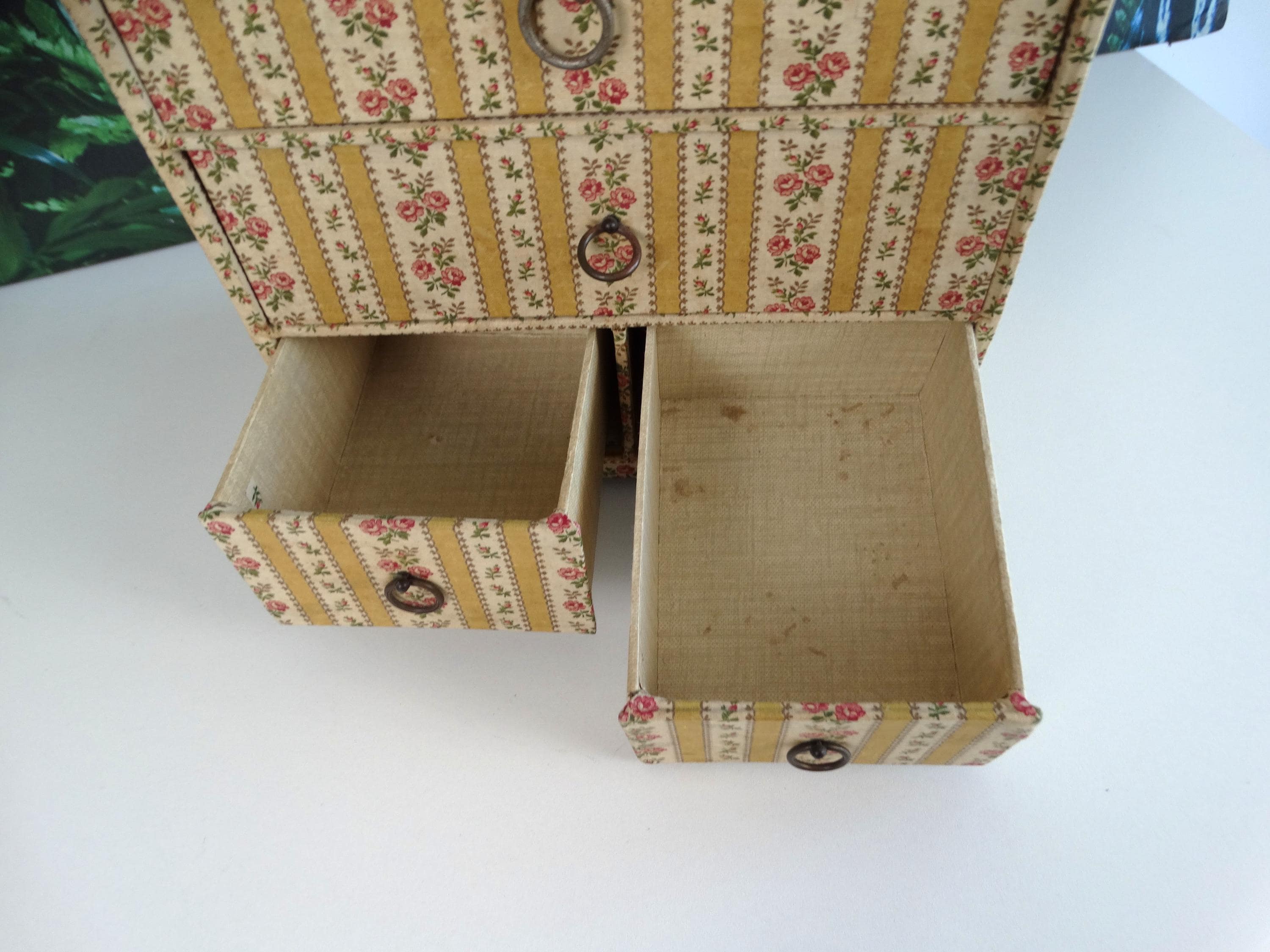 This fantastic jewelry box with 5 drawers was made in France in the 1950s. The jewelry box has a very beautiful patina. It is made of very strong cardboard and lined with rose paper; the inside of the drawers is also lined with paper.
