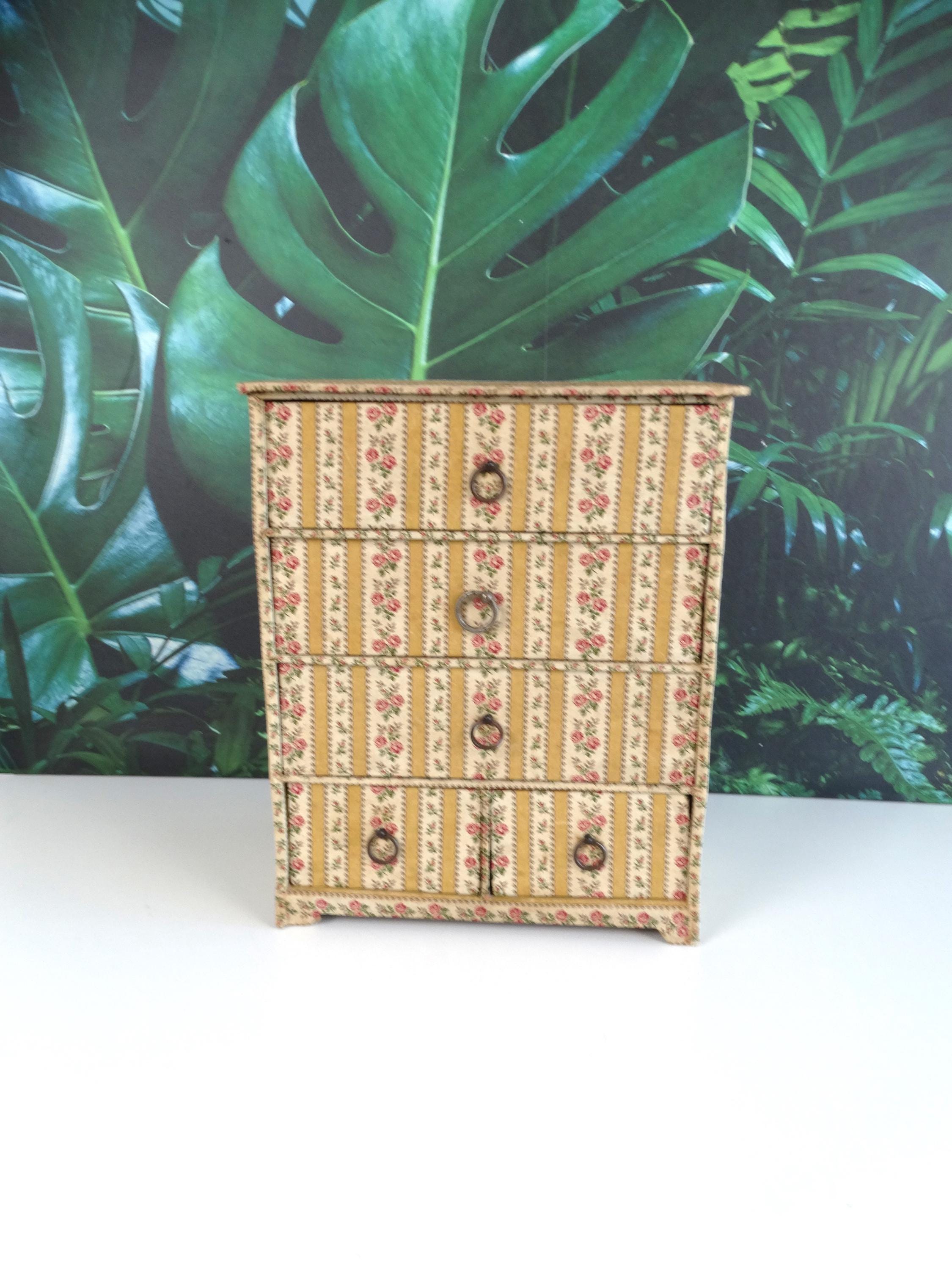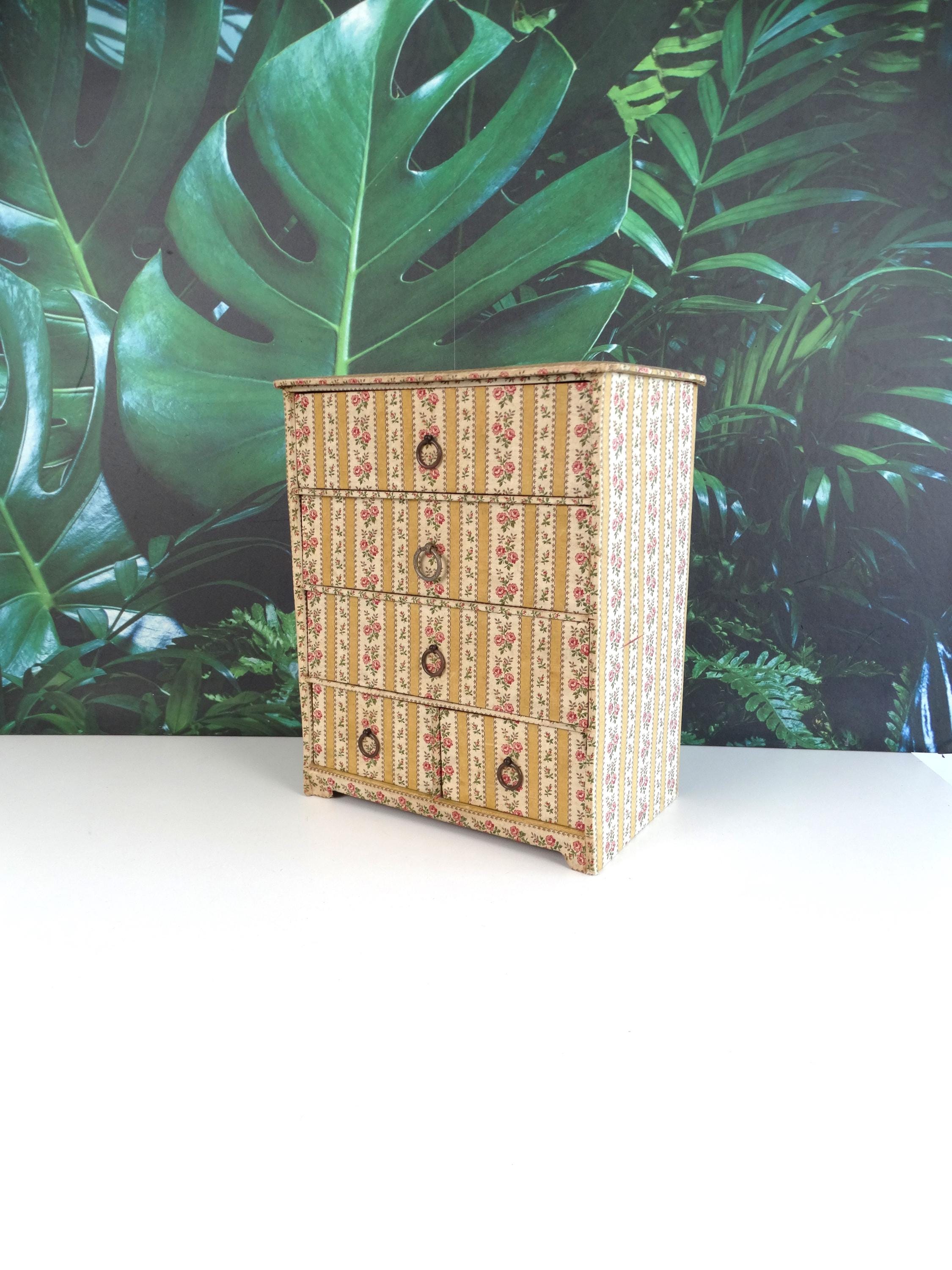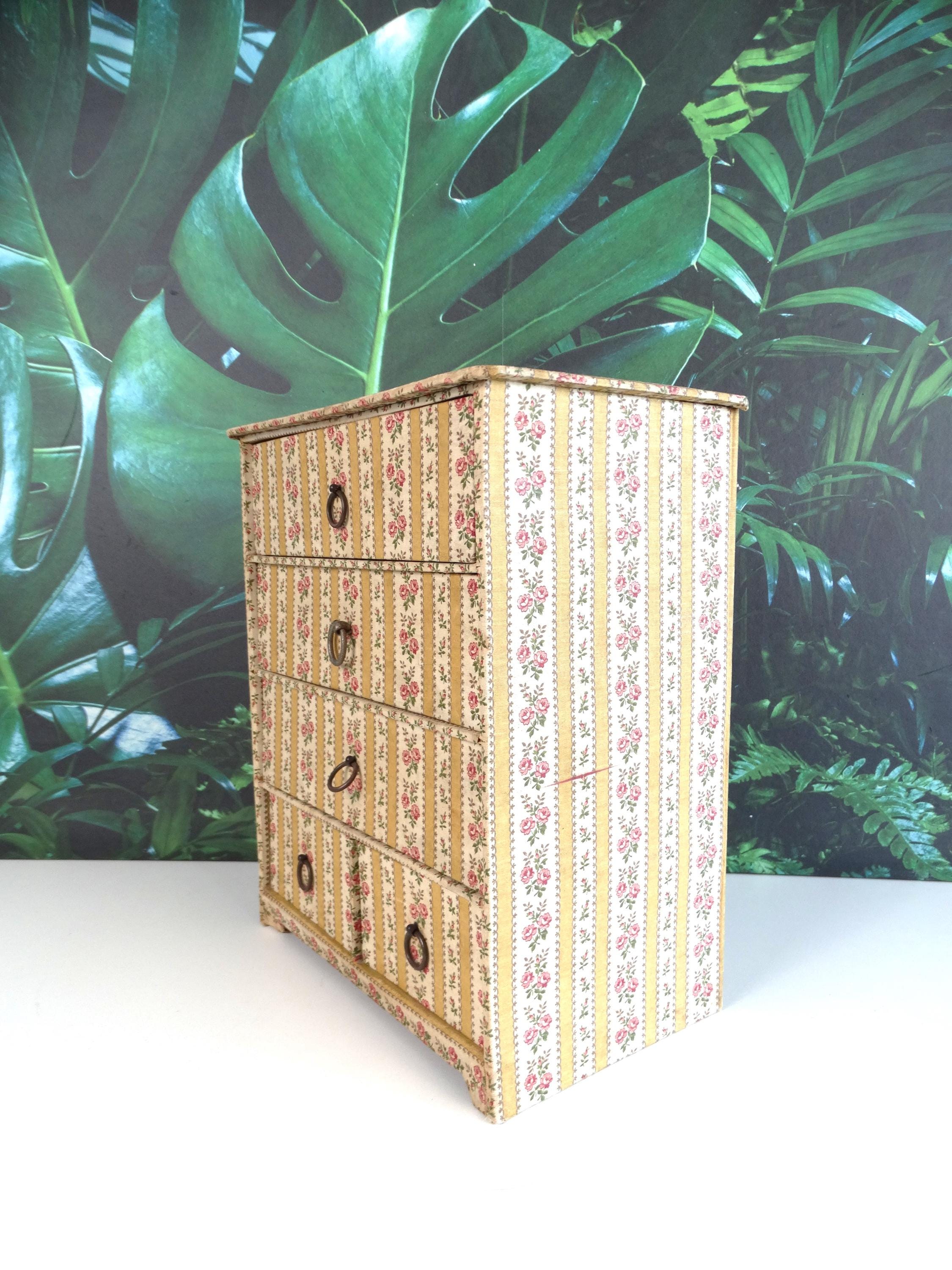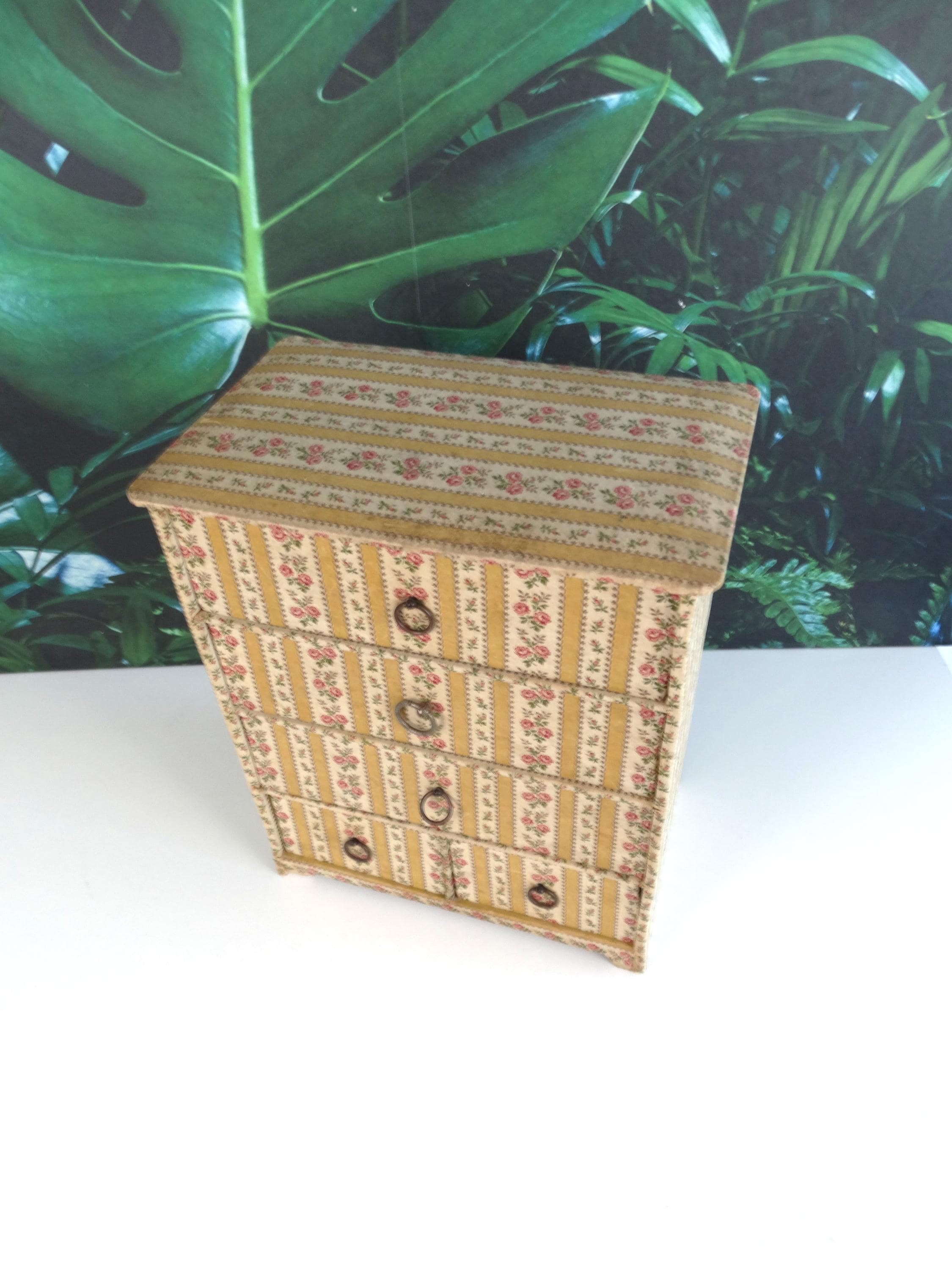 This fantastic jewelry box with 5 drawers was made in France in the 1950s. The jewelry box has a very beautiful patina. It is made of very strong cardboard and lined with rose paper; the inside of the drawers is also lined with paper.