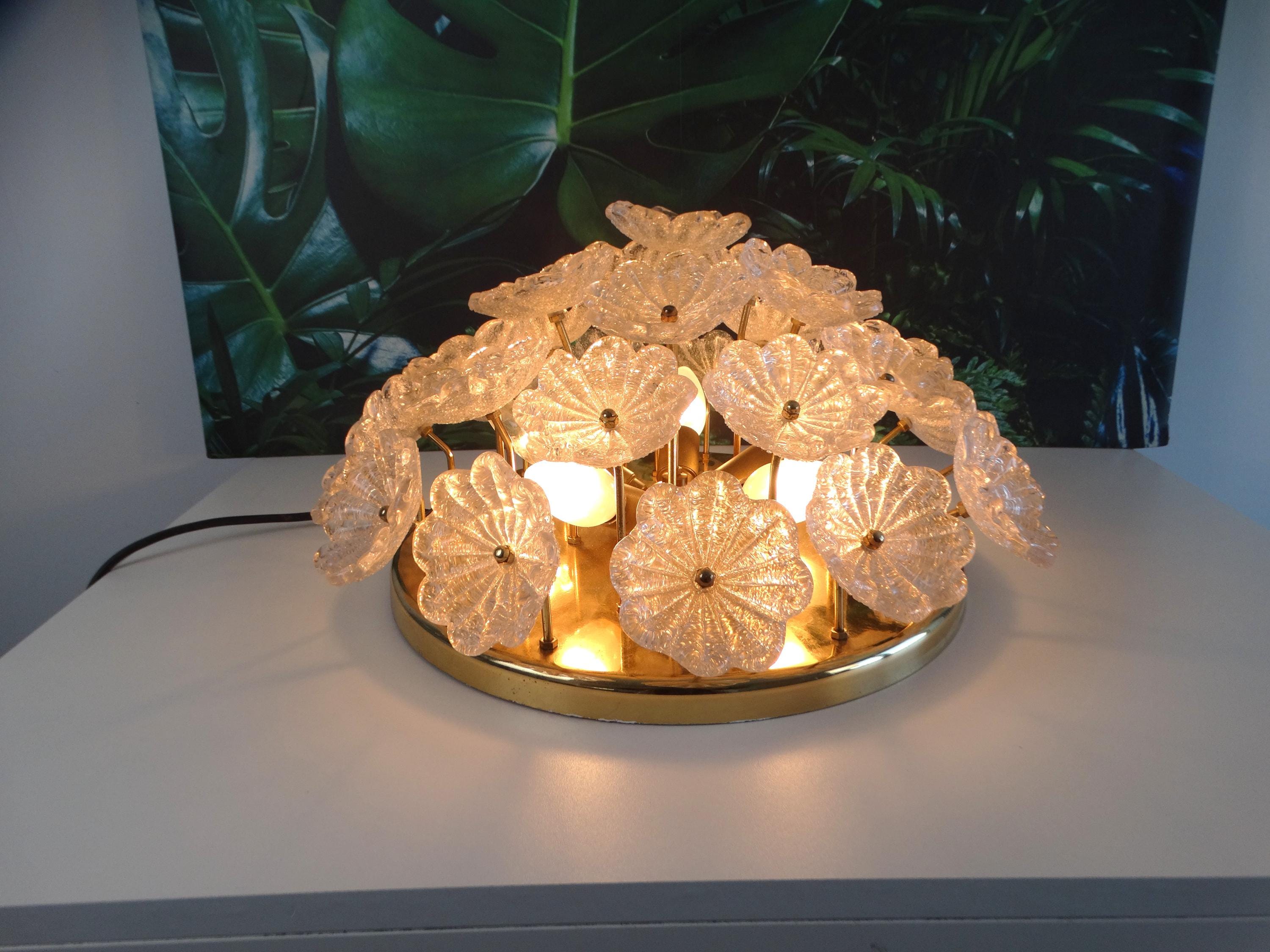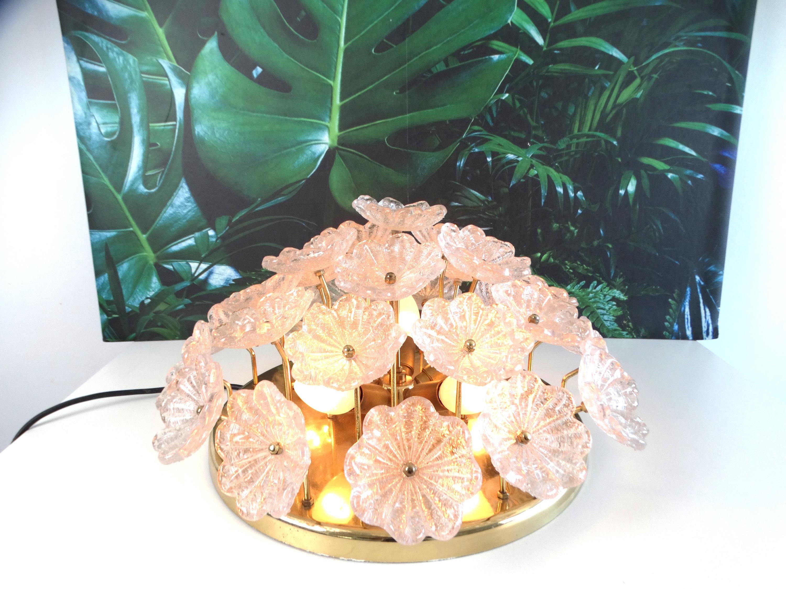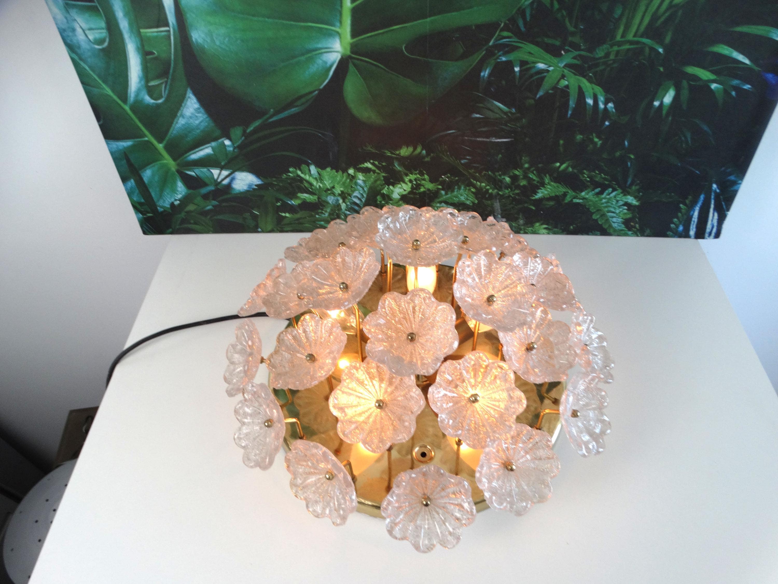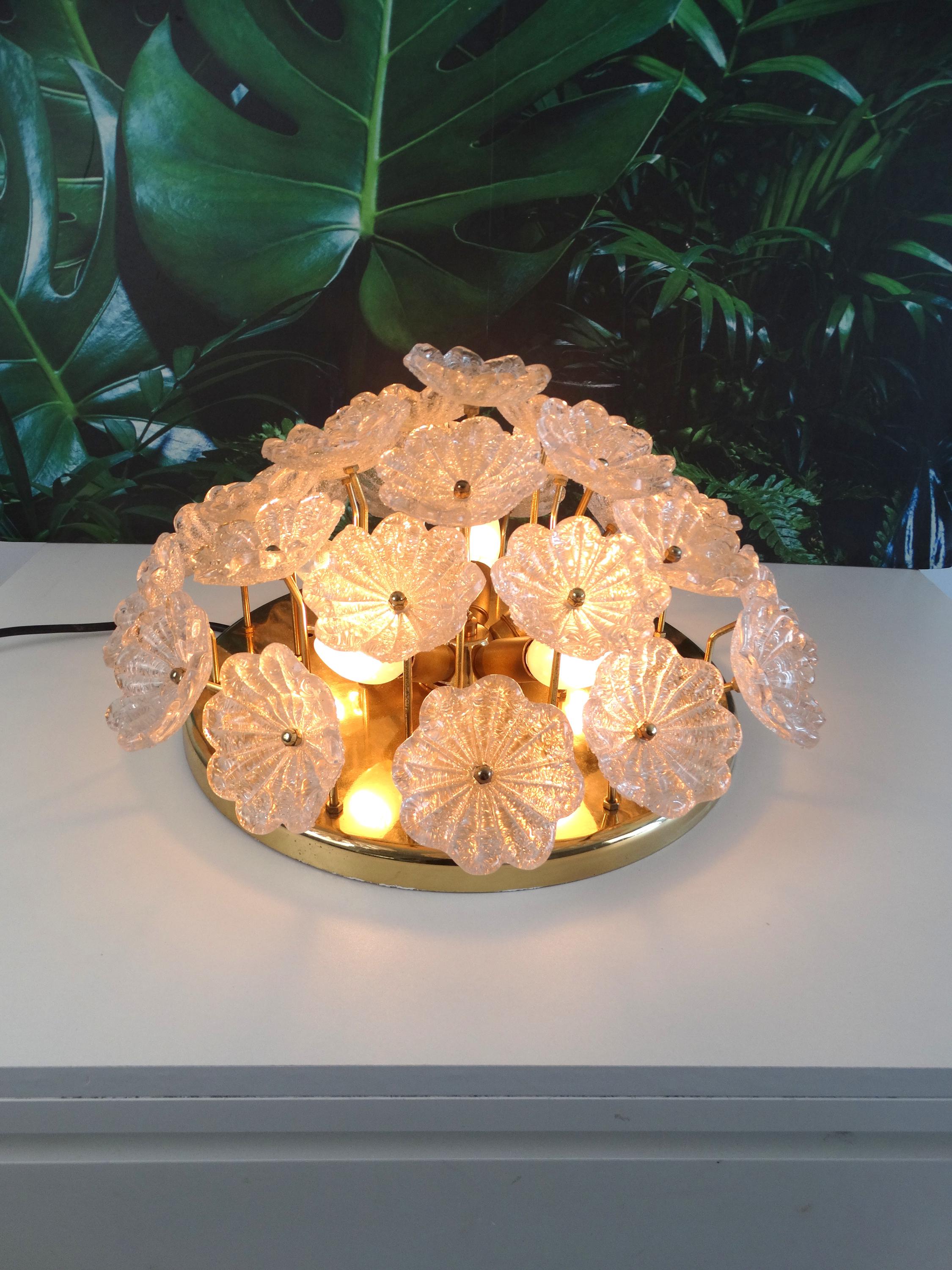 The base is made of brass, upon which 5 lamps with E14 fittings are situated and finished with 28 frosted glass flowers. Truly fantastic to behold.