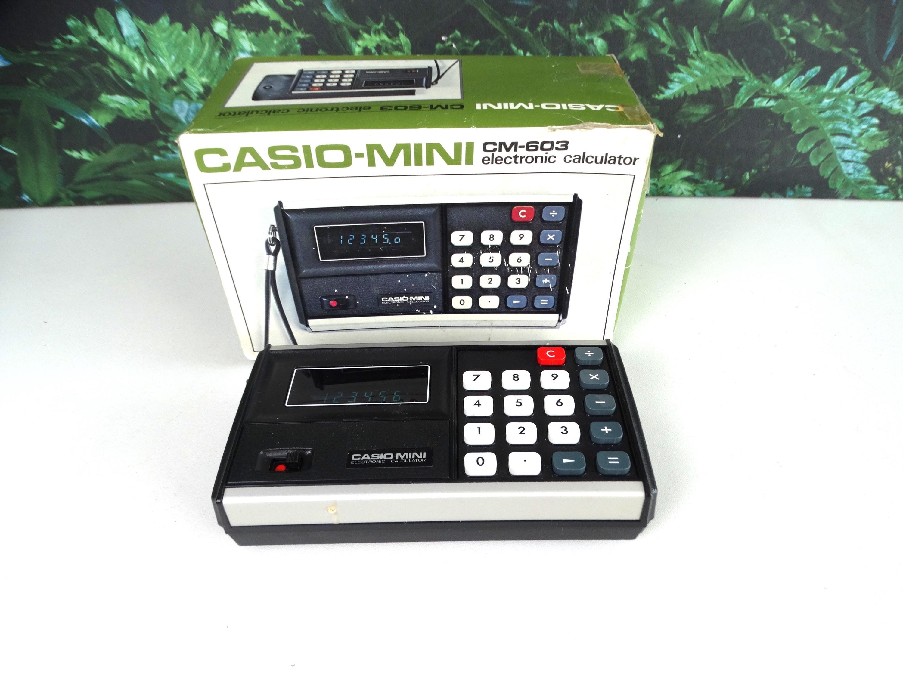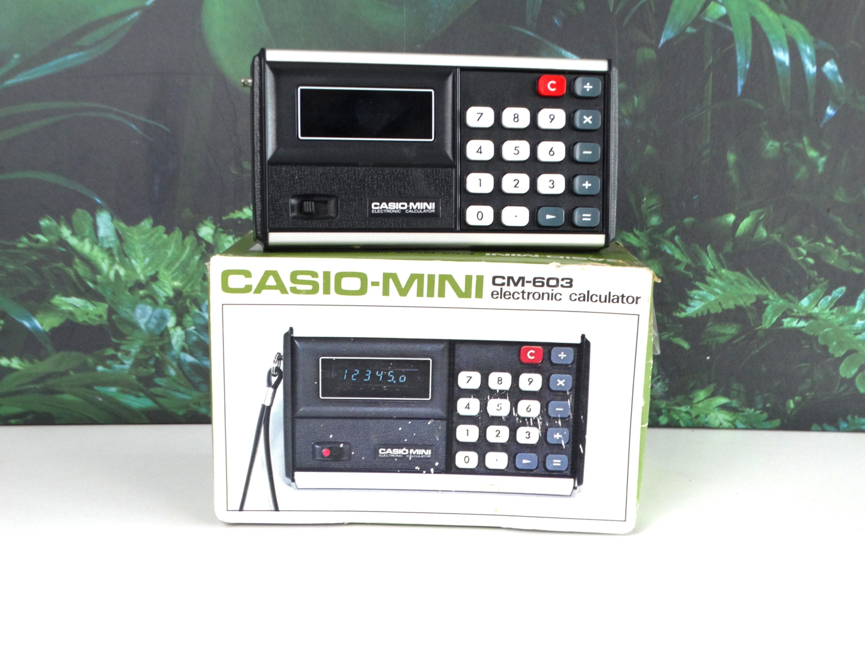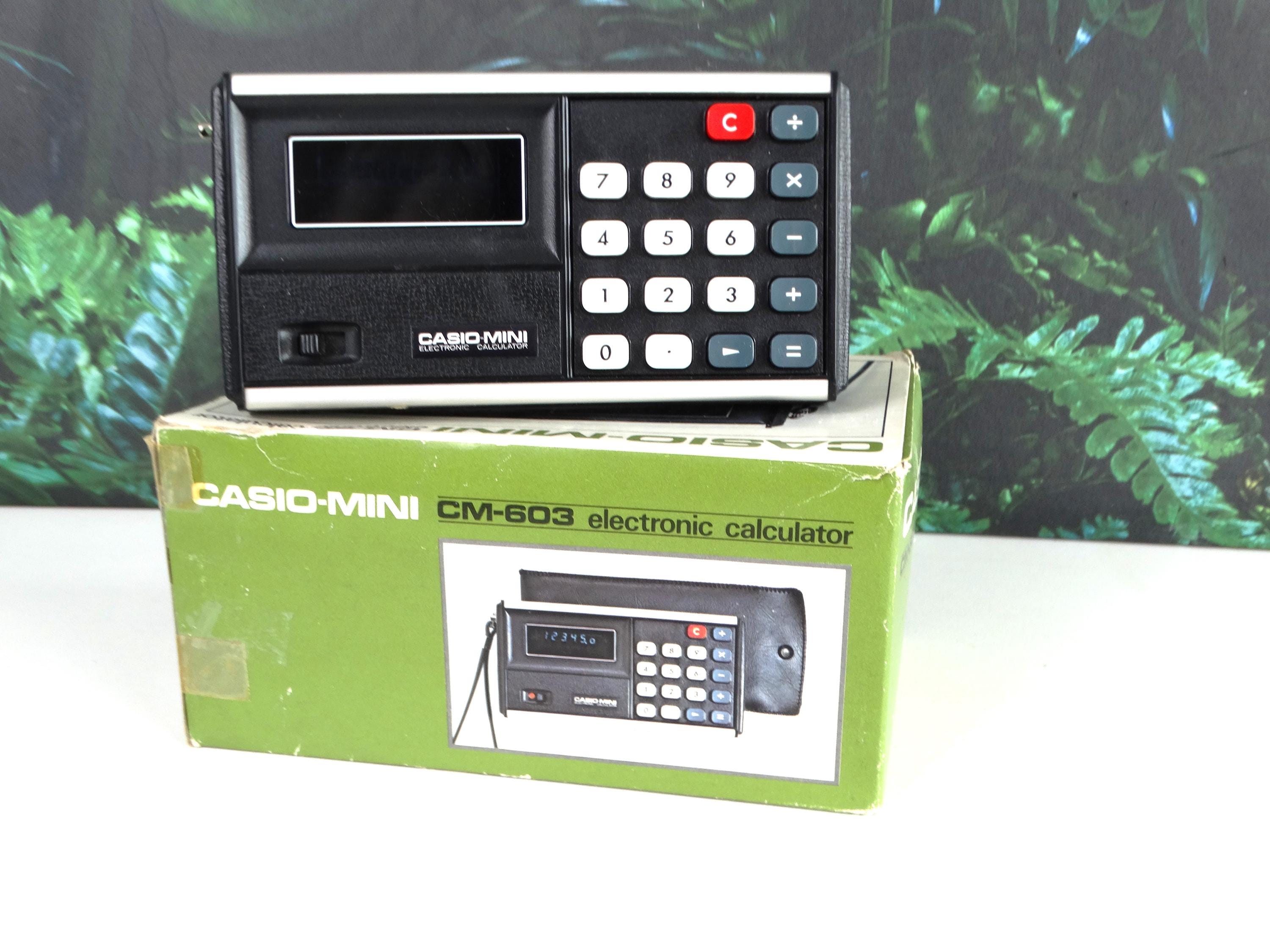 Vintage CASIO-MINI electronic calculator CM-602. Manufactured by CASIO Computer Co., Ltd. (Japan) in 1972. Operates on 4 x 1.5 V AA batteries and can also be used with an AC adapter AD-4145. This calculator was one of the first affordable, portable calculators and played a significant role in popularizing such devices for personal use. Batteries and a black leather case are included.